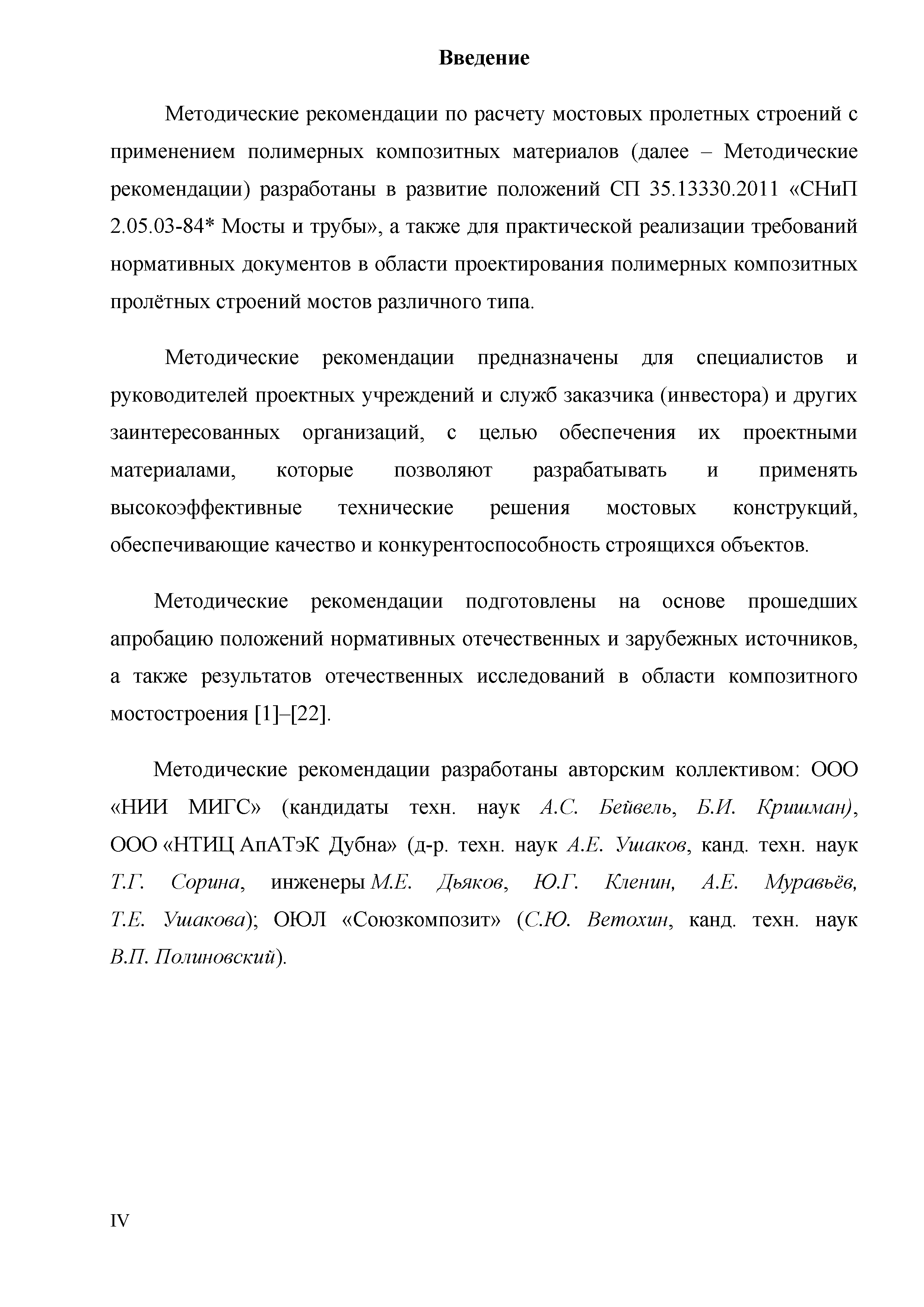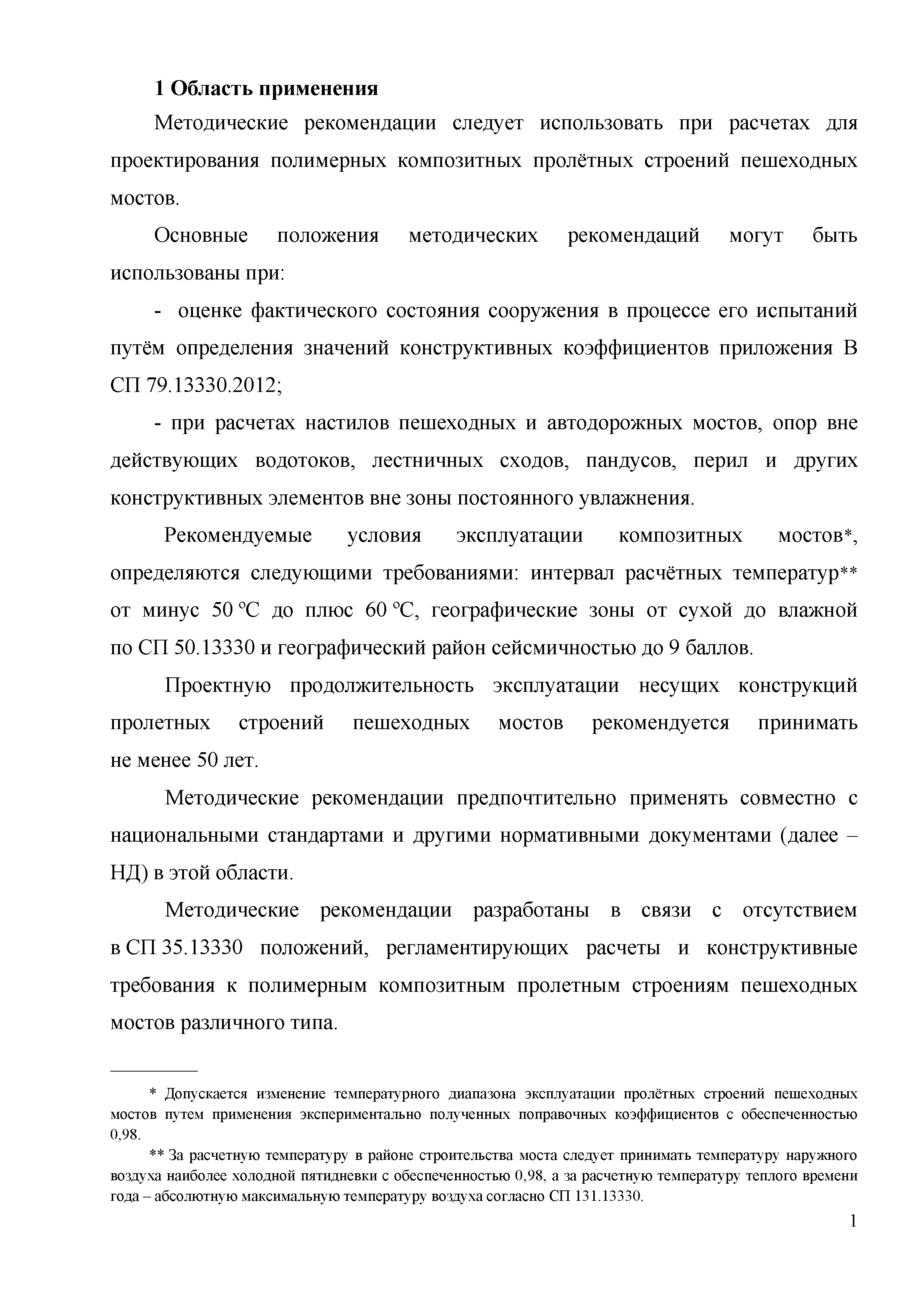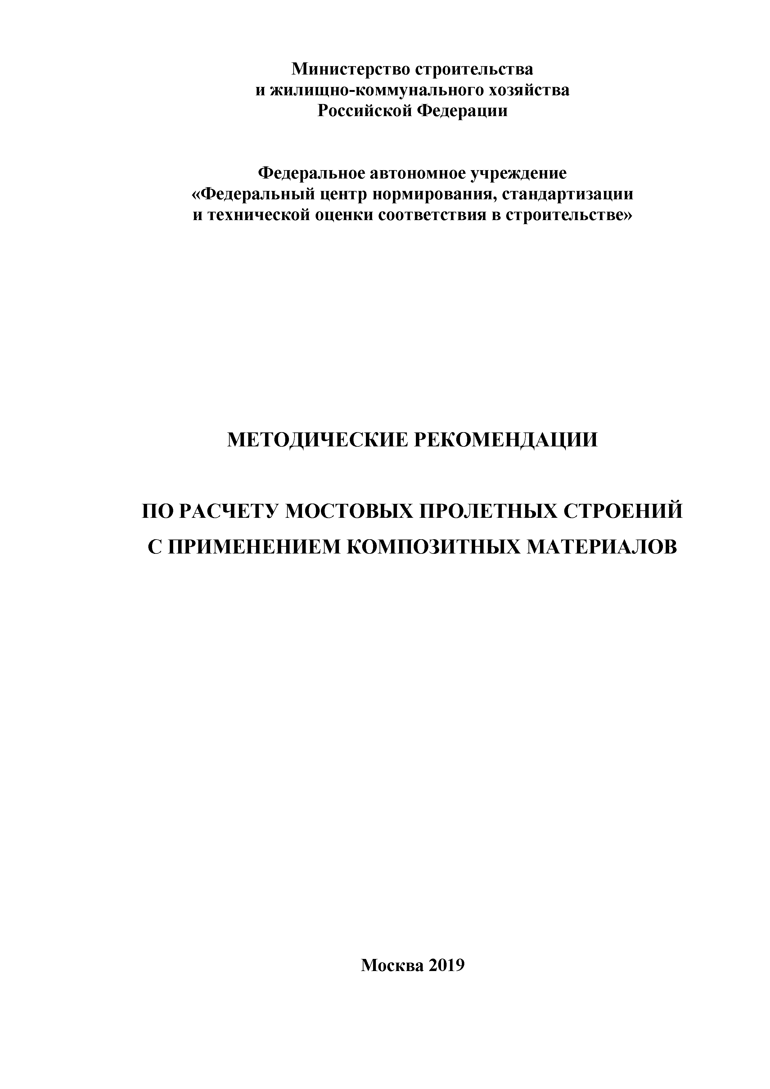 | Область применения: | Методические рекомендации предназначены для специалистов и руководителей проектных учреждений и служб заказчика (инвестора) и других заинтересованных организаций, с целью обеспечения их проектными материалами, которые позволяют разрабатывать и применять высокоэффективные технические решения мостовых конструкций, обеспечивающие качество и конкурентоспособность строящихся объектов. Методические рекомендации следует использовать при расчетах для проектирования полимерных композитных пролетных строений пешеходных мостов. |