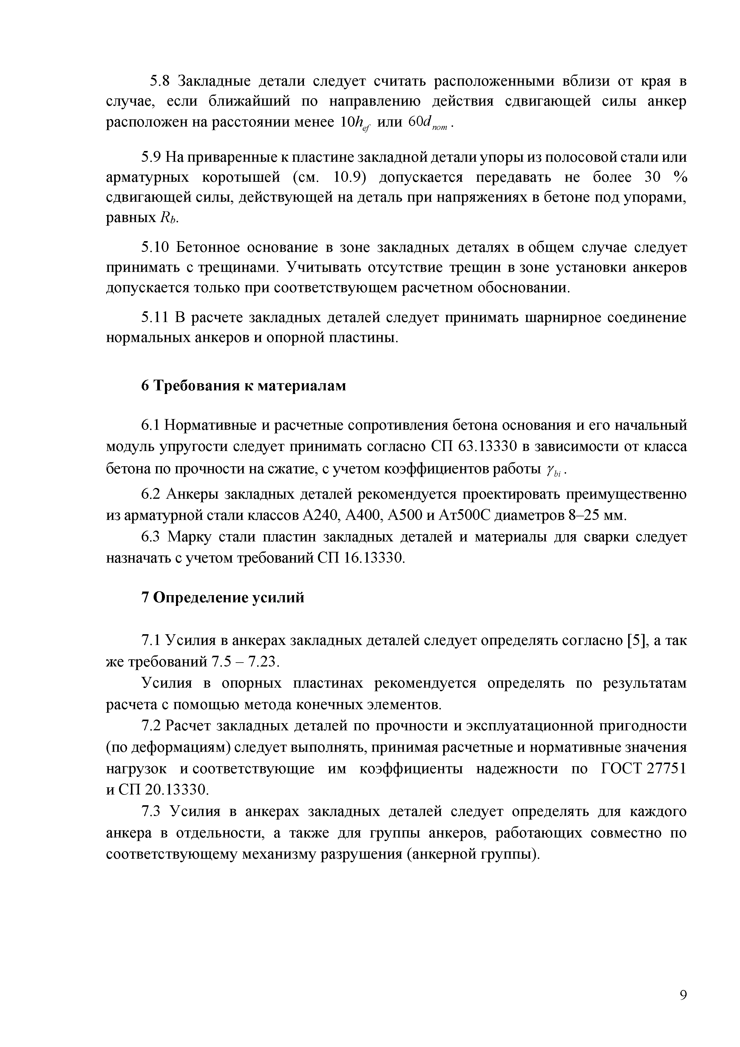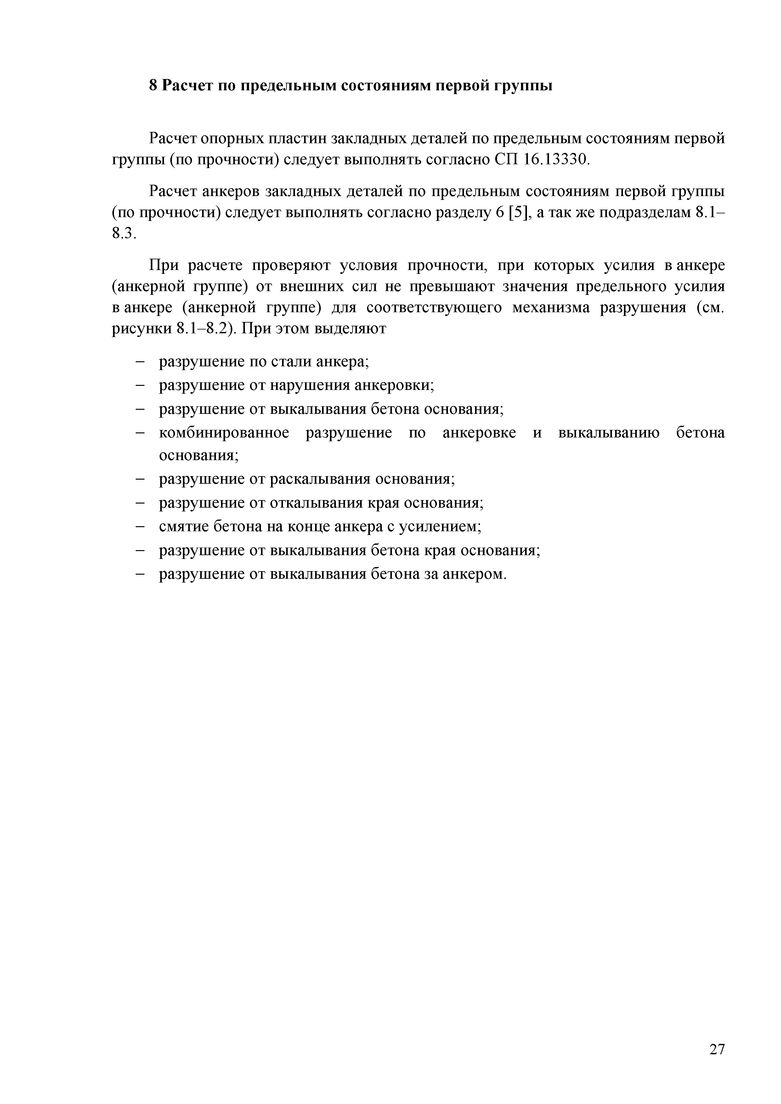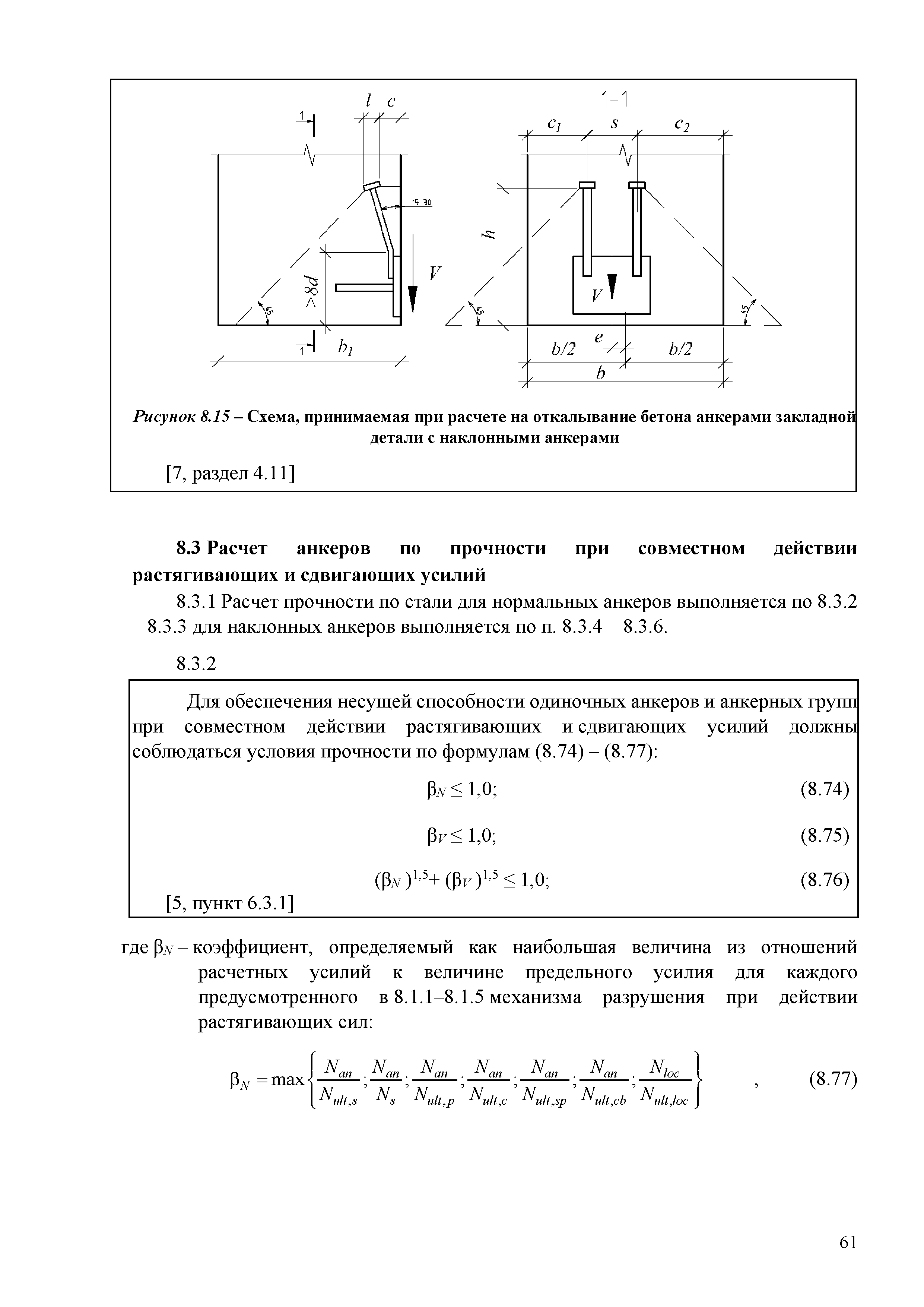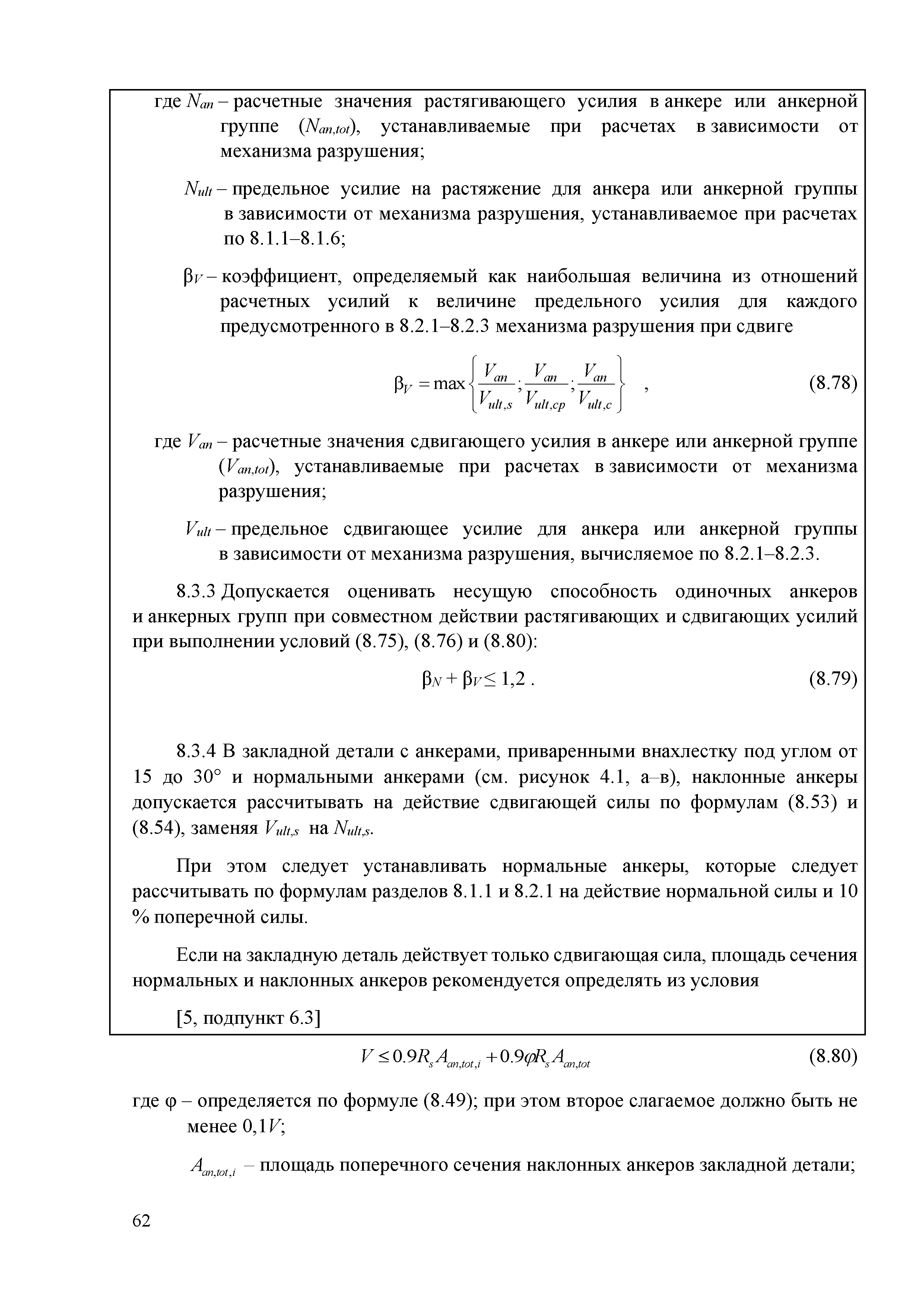 | Оглавление: | 1 Область применения 2 Нормативные ссылки 3 Термины, определения и обозначения 4 Классификация закладных деталей 5 Общие положения 6 Требования к материалам 7 Определение усилий 8 Расчет по предельным состояниям первой группы 9 Расчет по предельным состояниям второй группы 10 Конструктивные требования Приложение А Примеры расчетов Библиография |