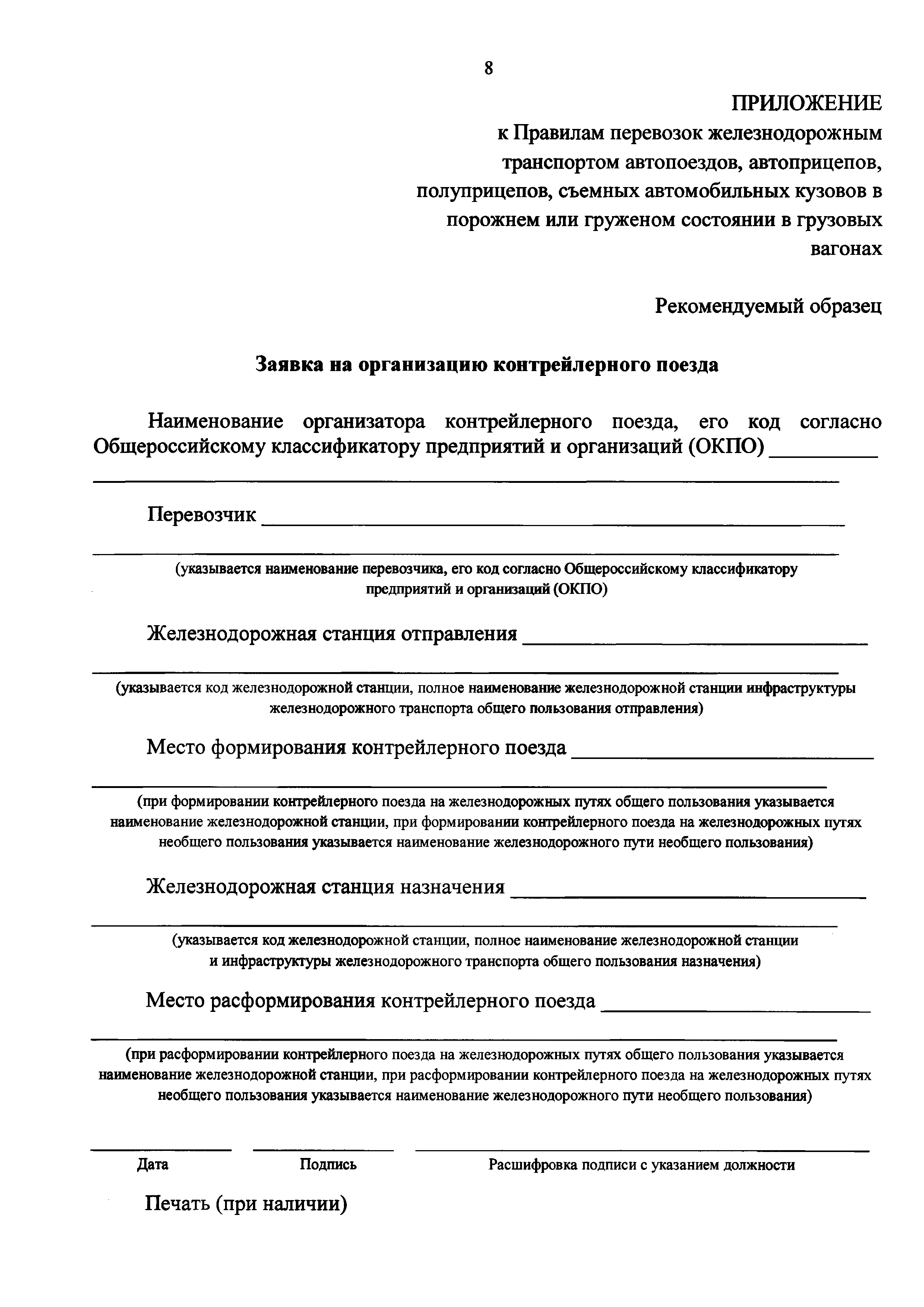 | Оглавление: | I. Общие положение II. Осуществление контрейлерной перевозки автопоездов, автоприцепов, полуприцепов, съемных автомобильных кузовов в порожнем или груженом состоянии III. Перевозка автопоездов, автоприцепов, полуприцепов, съемных автомобильных кузовов контрейлерным поездом IV. Выдача автопоездов, автоприцепов, полуприцепов, съемных автомобильных кузовов после завершения контрейлерной перевозки Приложение. Рекомендуемый образец заявки на организацию контрейлерного поезда |