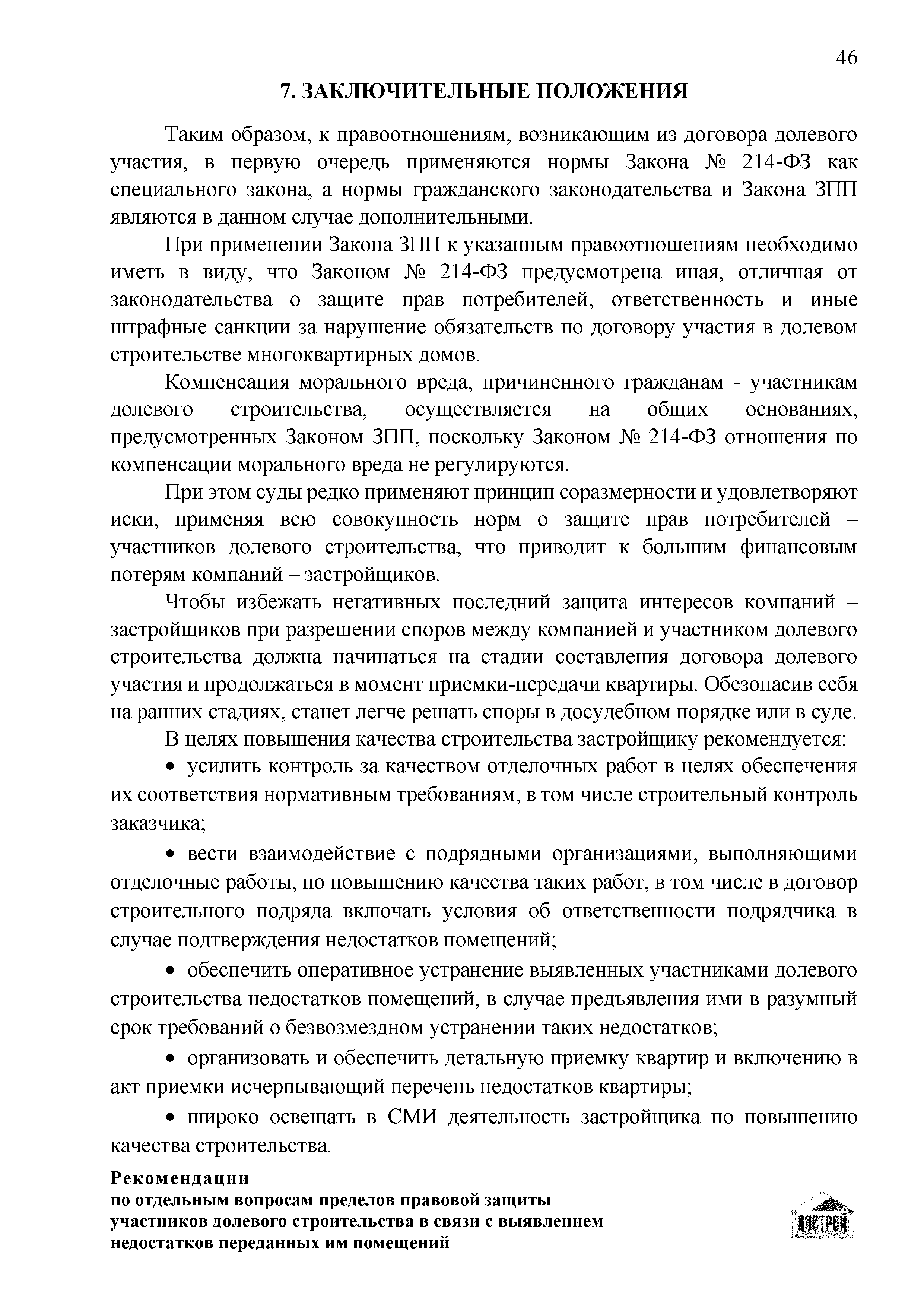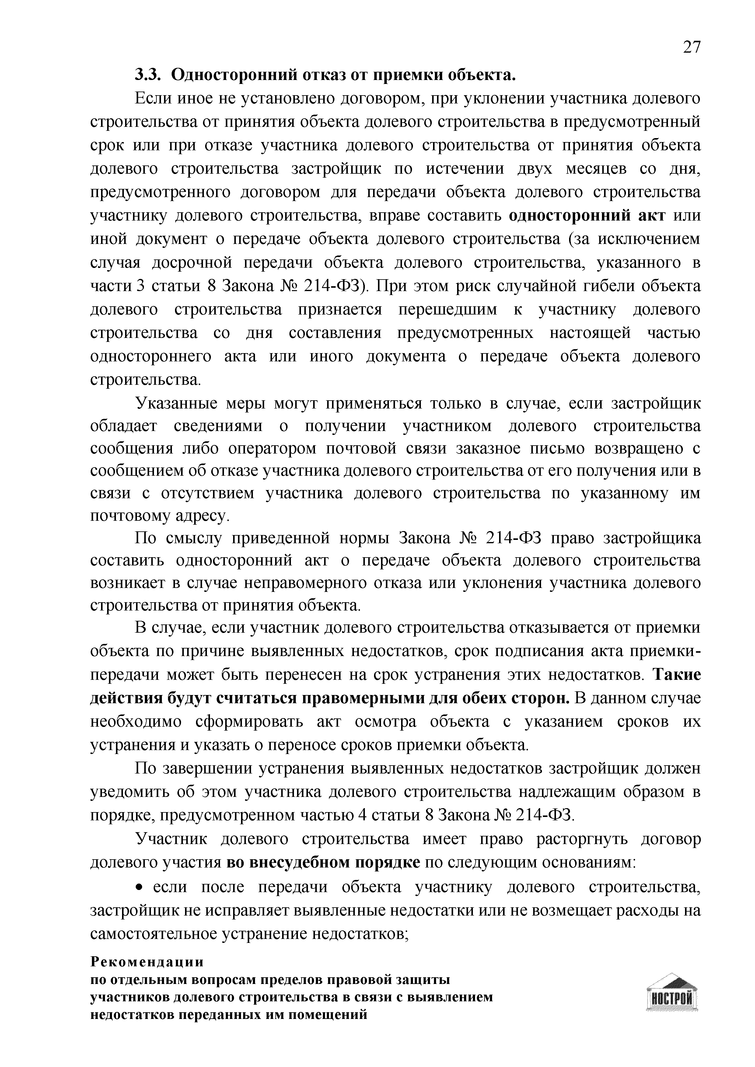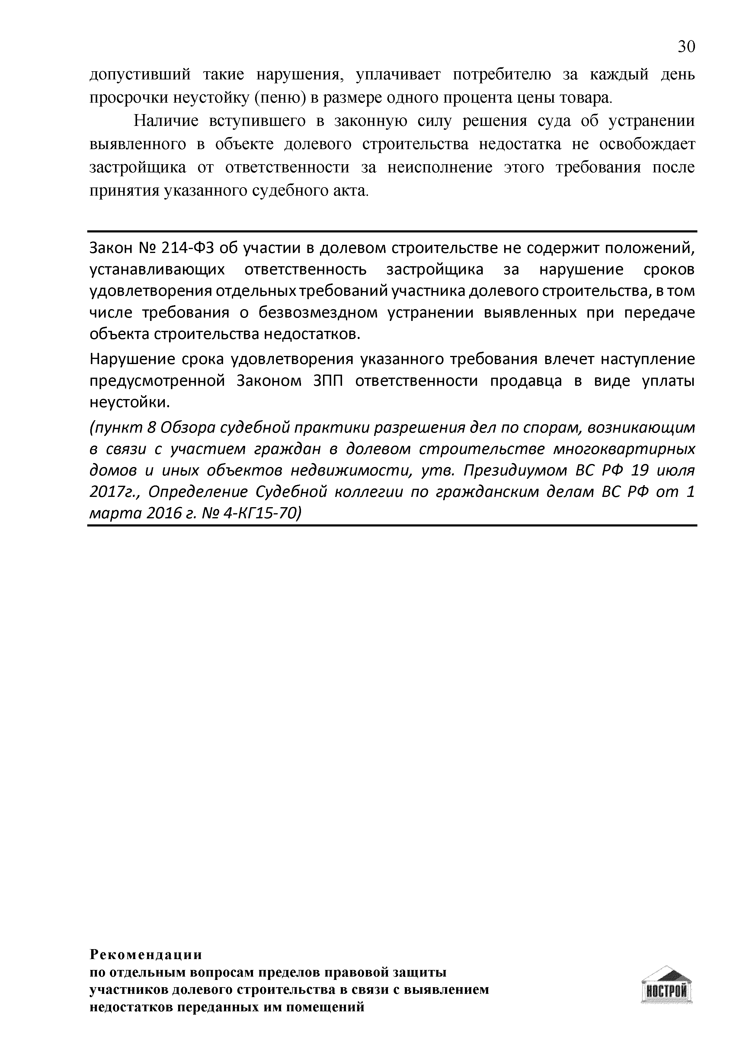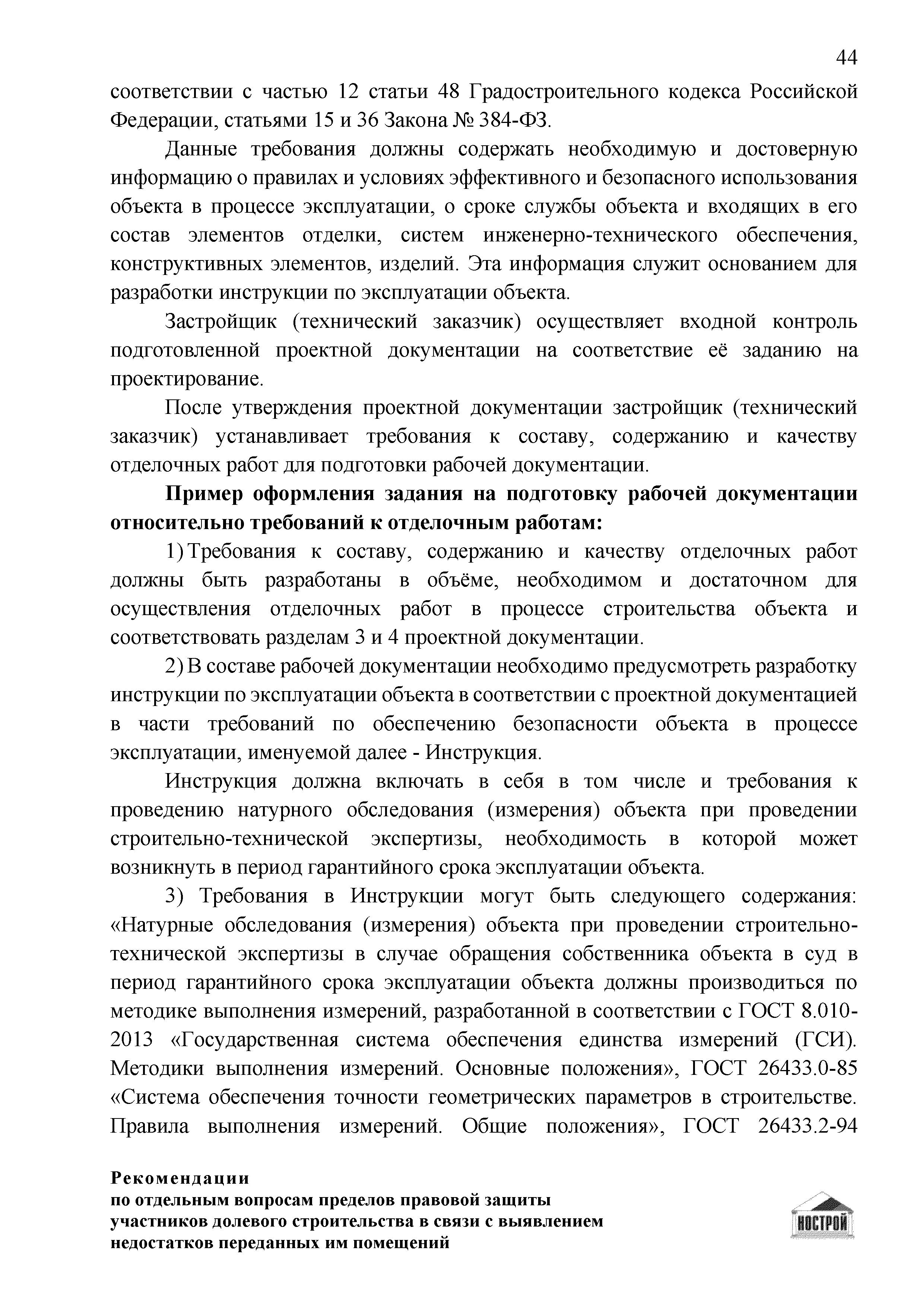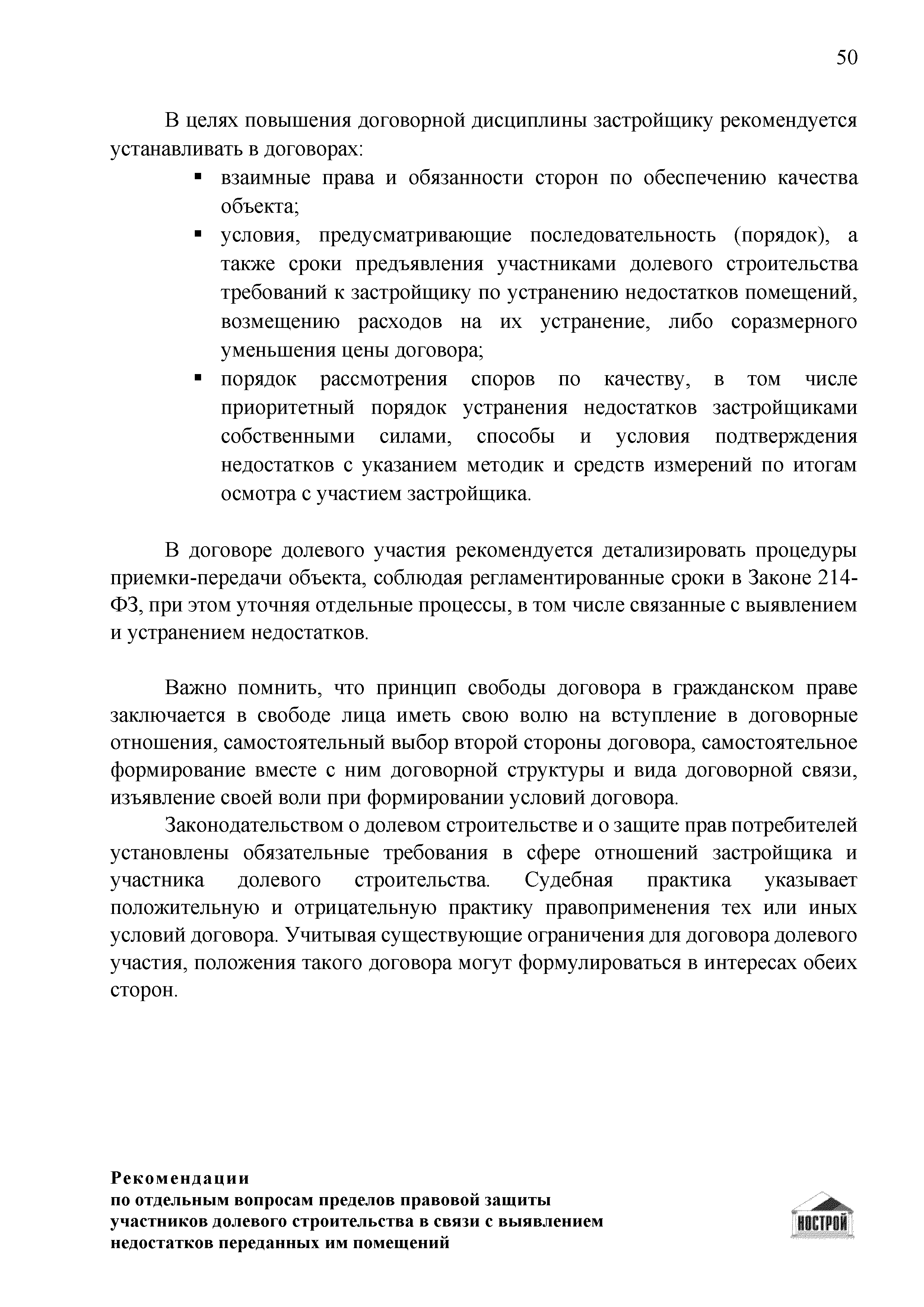 | Оглавление: | Введение 1 Правовая основа регулирования общественных отношений в сфере защиты прав участников долевого строительства 1.1 В части применения ГК РФ 1.2 В части применения Закона № 214-ФЗ 1.3 В части применения Закона ЗПП 2 Существенные и иные недостатки объекта долевого строительства 2.1 Обязательные и добровольные требования нормативной технической документации 2.2 Виды недостатков объекта 2.3 Гарантия качества. Взаимодействие застройщика с собственниками квартир в период гарантийного срока эксплуатации 2.4 Права требования участников долевого строительства в связи с выявленными недостатками 2.5 Субъекты установления (выявления) недостатков объекта долевого строительства 3 Приемка-передача объекта участнику долевого строительства 3.1 Регламентированные сроки приемки-передачи объекта 3.2 Осмотр объекта при приемке-передаче, выявление и фиксация недостатков 3.3 Односторонний отказ от приемки объекта 3.4 Особенности условий договора об устранении недостатков объекта 4 Санкции в отношении застройщика при выявлении недостатков объекта 4.1 Виды санкций. Правовые основания применения 4.2 Совокупность требований к застройщику. Применение принципа соразмерности 4.3 Признаки злоупотребления правом и особенности обоснования 5 Уступка права требования. Особенности споров 6 Особенности организации деятельности застройщика при производстве отделочных работ 6.1 Формирование технического задания, разработка рабочей документации, производство работ 6.2 Осуществление строительного контроля. Рекомендации застройщикам 7 Заключительные положения Приложение 1 Долевого участия. Обязательные положения для защиты интересов застройщика Приложение 2. Акт осмотра объекта. Рекомендации Приложение 3. Инструкция по эксплуатации объекта. Рекомендации Приложение 4. Акт приемки-передачи. Рекомендации |