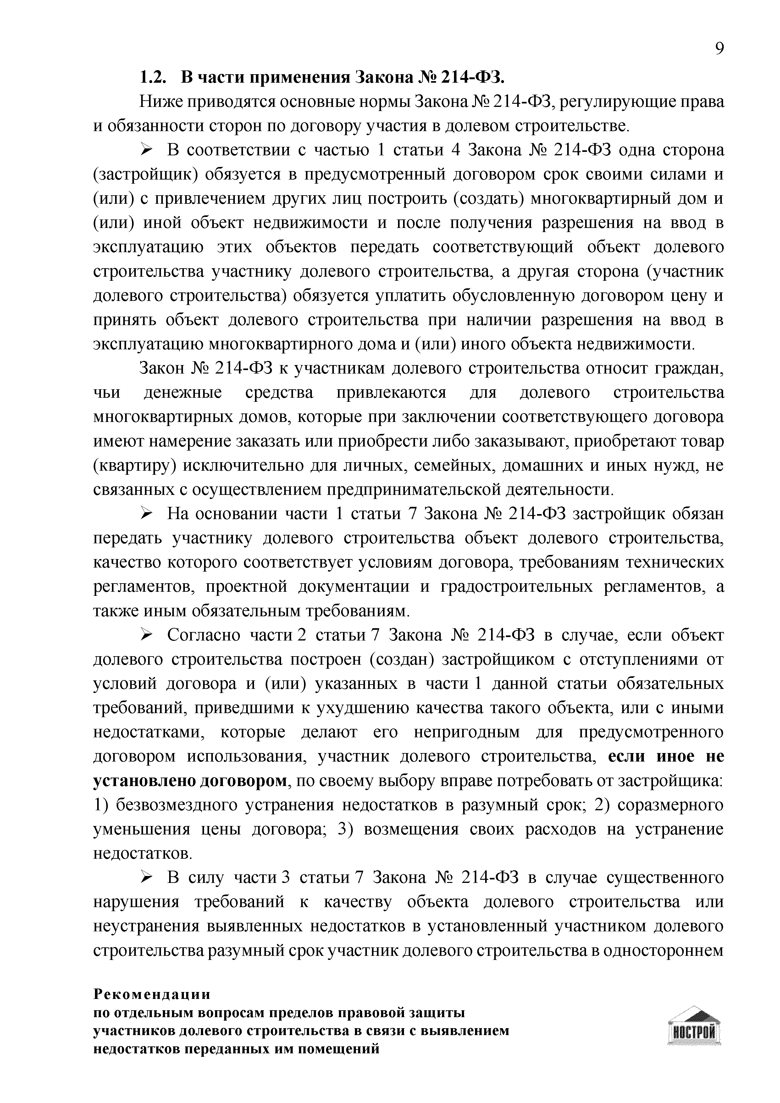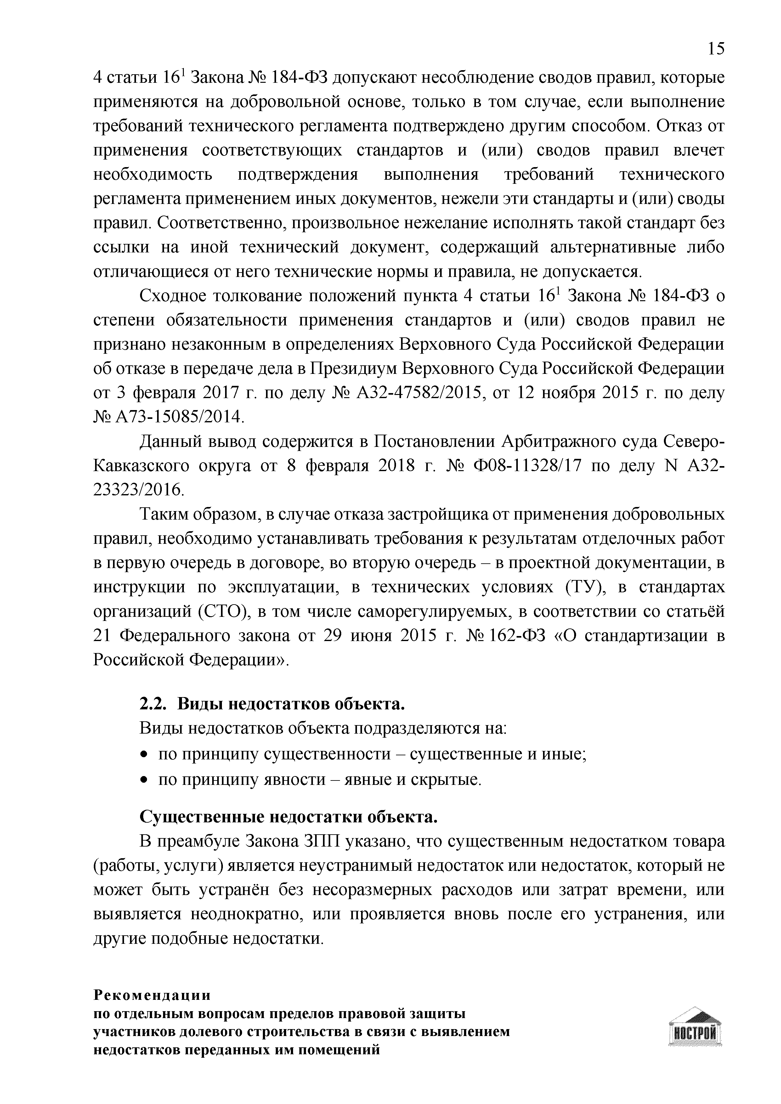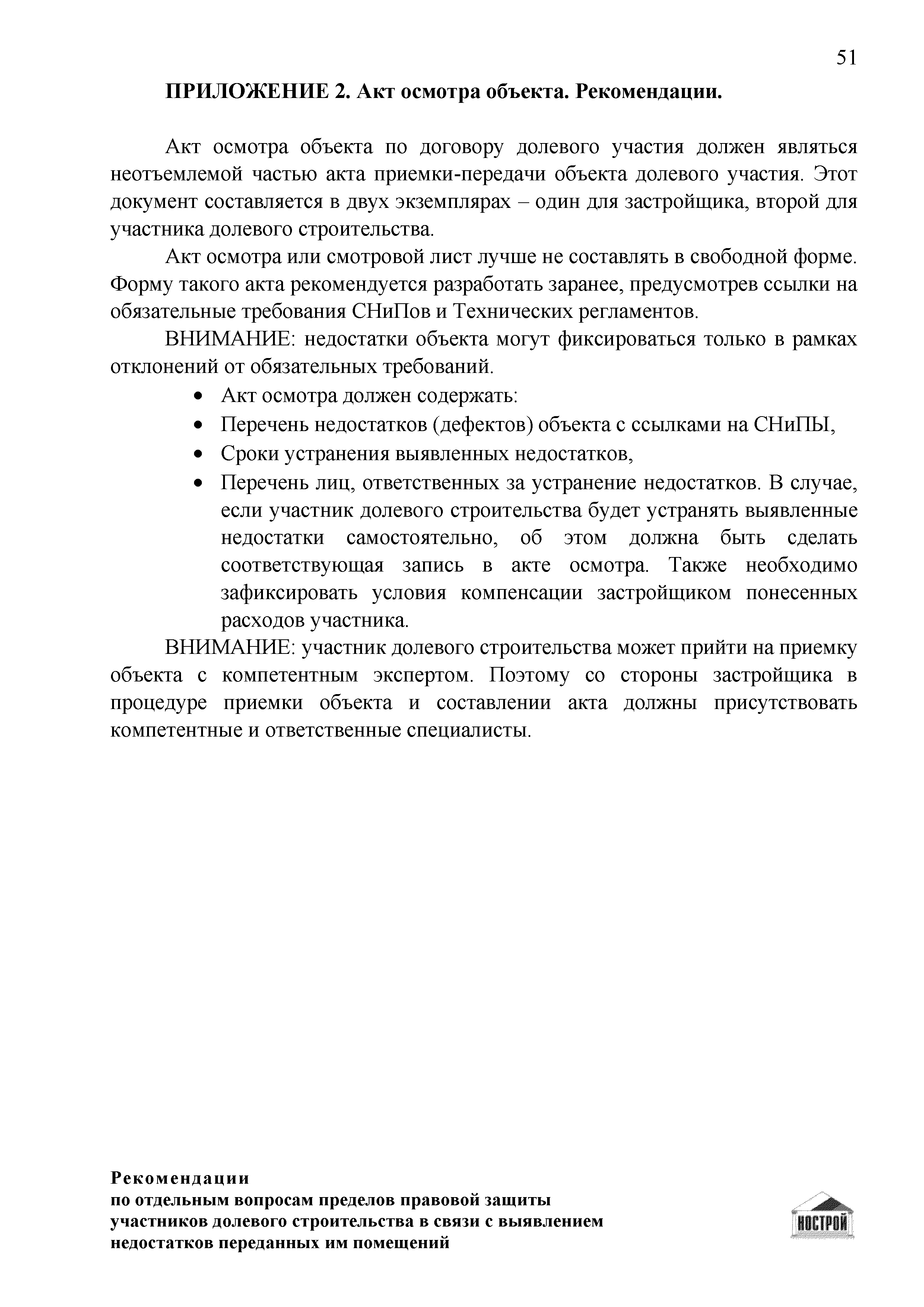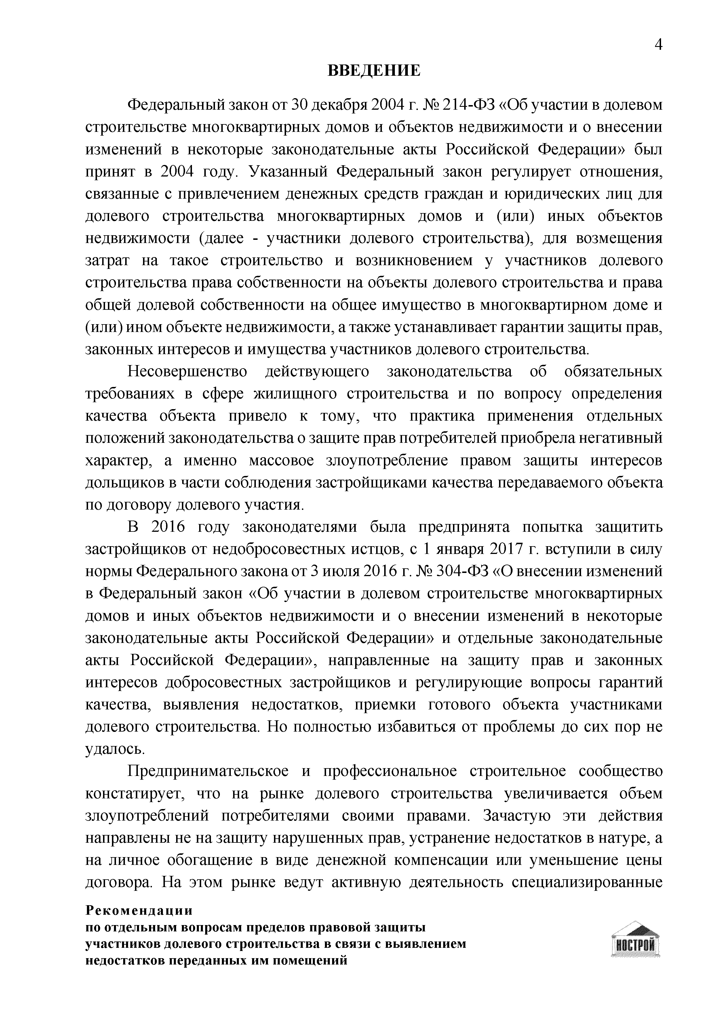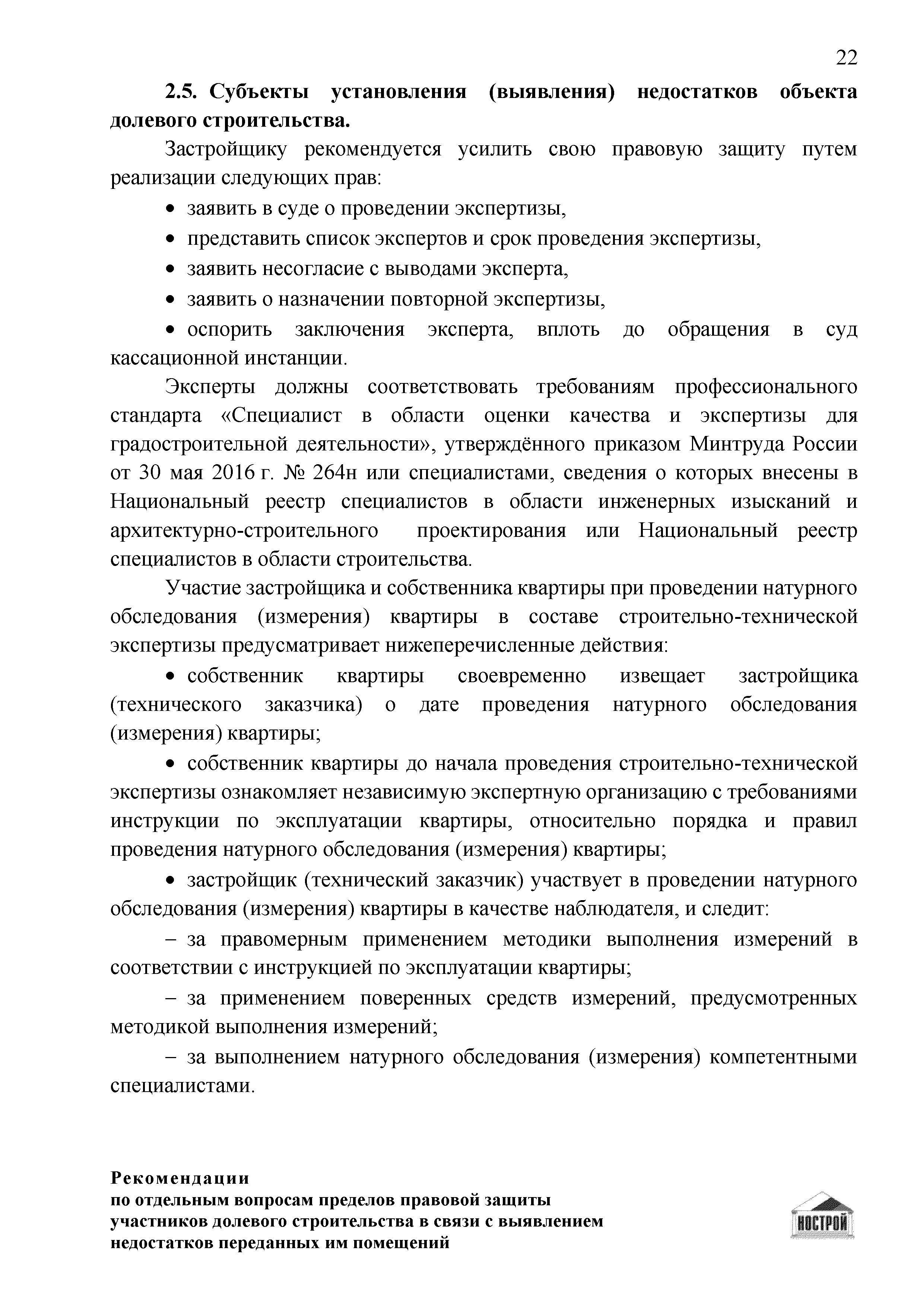 | Оглавление: | Введение 1 Правовая основа регулирования общественных отношений в сфере защиты прав участников долевого строительства 1.1 В части применения ГК РФ 1.2 В части применения Закона № 214-ФЗ 1.3 В части применения Закона ЗПП 2 Существенные и иные недостатки объекта долевого строительства 2.1 Обязательные и добровольные требования нормативной технической документации 2.2 Виды недостатков объекта 2.3 Гарантия качества. Взаимодействие застройщика с собственниками квартир в период гарантийного срока эксплуатации 2.4 Права требования участников долевого строительства в связи с выявленными недостатками 2.5 Субъекты установления (выявления) недостатков объекта долевого строительства 3 Приемка-передача объекта участнику долевого строительства 3.1 Регламентированные сроки приемки-передачи объекта 3.2 Осмотр объекта при приемке-передаче, выявление и фиксация недостатков 3.3 Односторонний отказ от приемки объекта 3.4 Особенности условий договора об устранении недостатков объекта 4 Санкции в отношении застройщика при выявлении недостатков объекта 4.1 Виды санкций. Правовые основания применения 4.2 Совокупность требований к застройщику. Применение принципа соразмерности 4.3 Признаки злоупотребления правом и особенности обоснования 5 Уступка права требования. Особенности споров 6 Особенности организации деятельности застройщика при производстве отделочных работ 6.1 Формирование технического задания, разработка рабочей документации, производство работ 6.2 Осуществление строительного контроля. Рекомендации застройщикам 7 Заключительные положения Приложение 1 Долевого участия. Обязательные положения для защиты интересов застройщика Приложение 2. Акт осмотра объекта. Рекомендации Приложение 3. Инструкция по эксплуатации объекта. Рекомендации Приложение 4. Акт приемки-передачи. Рекомендации |