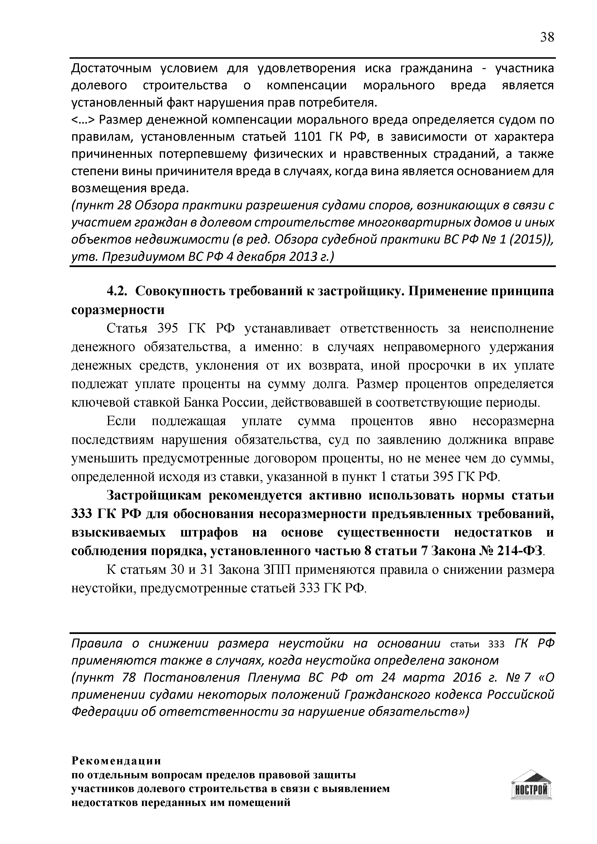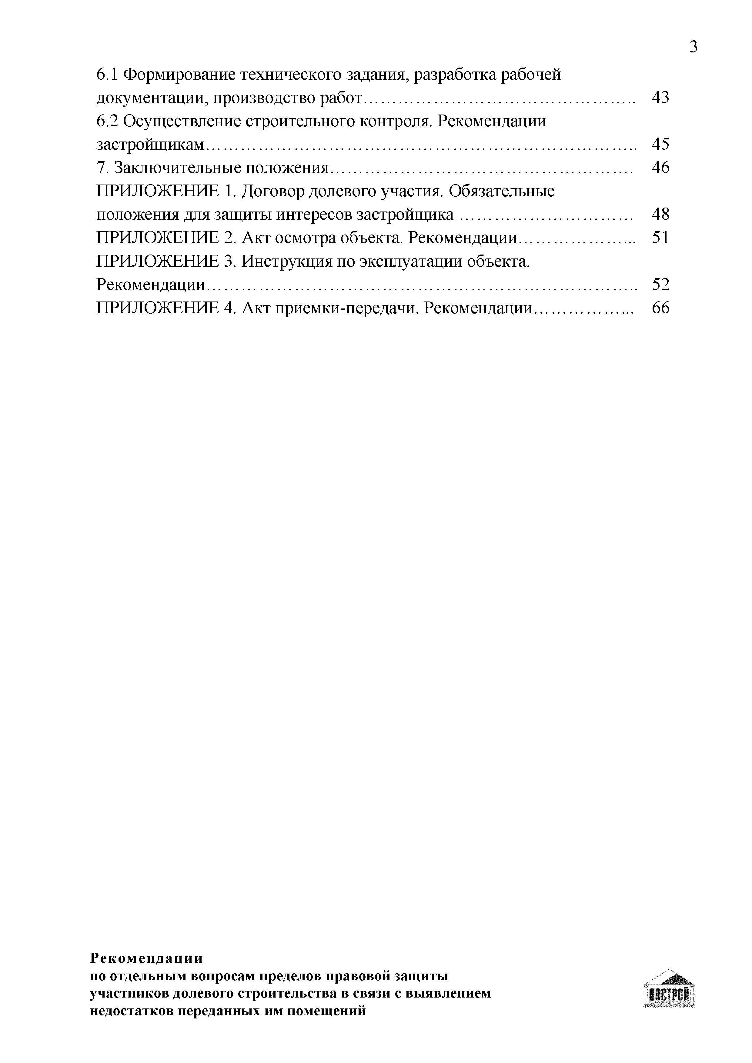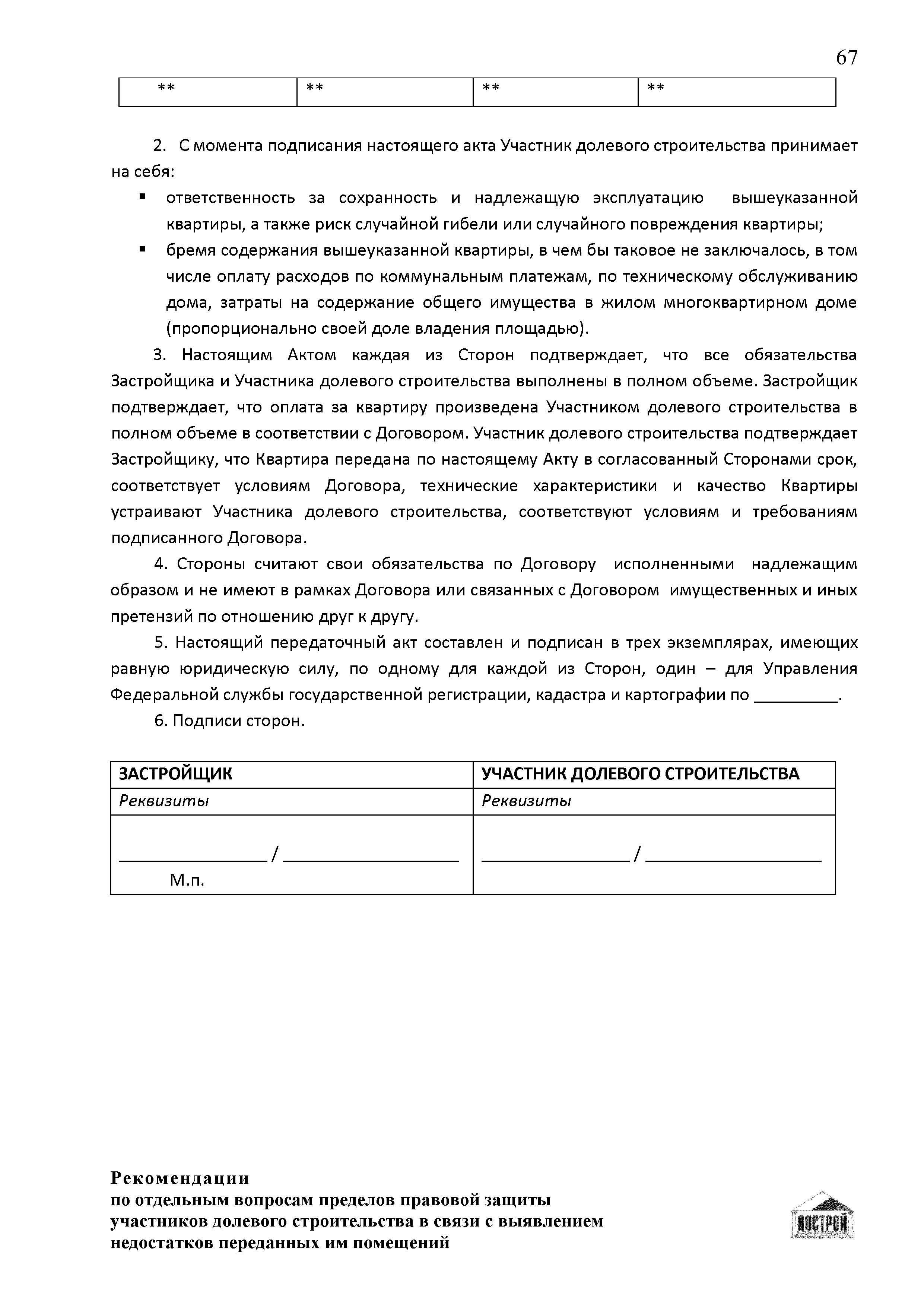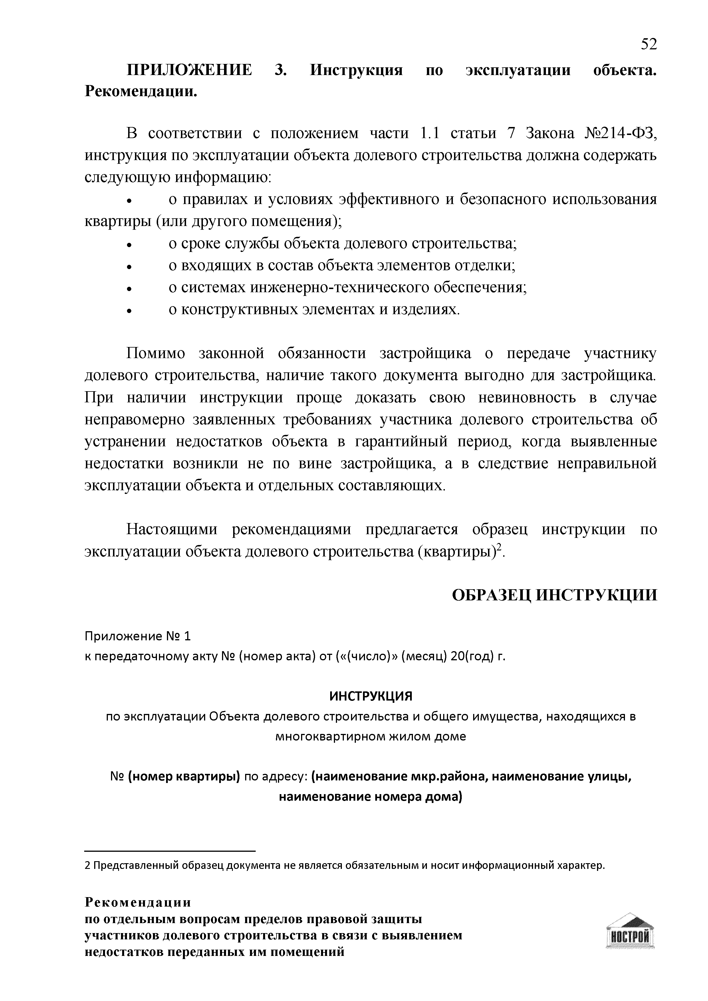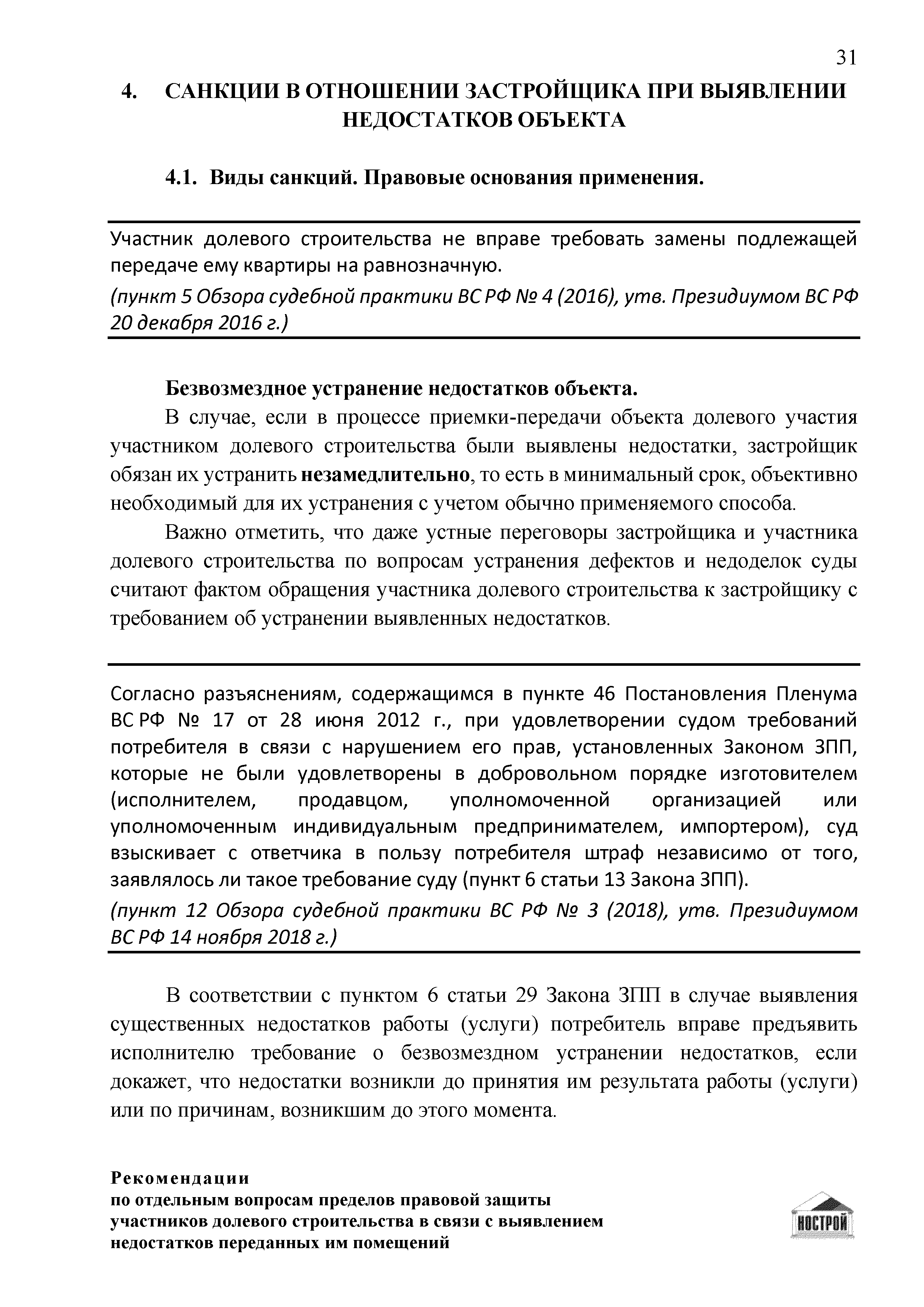 | Оглавление: | Введение 1 Правовая основа регулирования общественных отношений в сфере защиты прав участников долевого строительства 1.1 В части применения ГК РФ 1.2 В части применения Закона № 214-ФЗ 1.3 В части применения Закона ЗПП 2 Существенные и иные недостатки объекта долевого строительства 2.1 Обязательные и добровольные требования нормативной технической документации 2.2 Виды недостатков объекта 2.3 Гарантия качества. Взаимодействие застройщика с собственниками квартир в период гарантийного срока эксплуатации 2.4 Права требования участников долевого строительства в связи с выявленными недостатками 2.5 Субъекты установления (выявления) недостатков объекта долевого строительства 3 Приемка-передача объекта участнику долевого строительства 3.1 Регламентированные сроки приемки-передачи объекта 3.2 Осмотр объекта при приемке-передаче, выявление и фиксация недостатков 3.3 Односторонний отказ от приемки объекта 3.4 Особенности условий договора об устранении недостатков объекта 4 Санкции в отношении застройщика при выявлении недостатков объекта 4.1 Виды санкций. Правовые основания применения 4.2 Совокупность требований к застройщику. Применение принципа соразмерности 4.3 Признаки злоупотребления правом и особенности обоснования 5 Уступка права требования. Особенности споров 6 Особенности организации деятельности застройщика при производстве отделочных работ 6.1 Формирование технического задания, разработка рабочей документации, производство работ 6.2 Осуществление строительного контроля. Рекомендации застройщикам 7 Заключительные положения Приложение 1 Долевого участия. Обязательные положения для защиты интересов застройщика Приложение 2. Акт осмотра объекта. Рекомендации Приложение 3. Инструкция по эксплуатации объекта. Рекомендации Приложение 4. Акт приемки-передачи. Рекомендации |