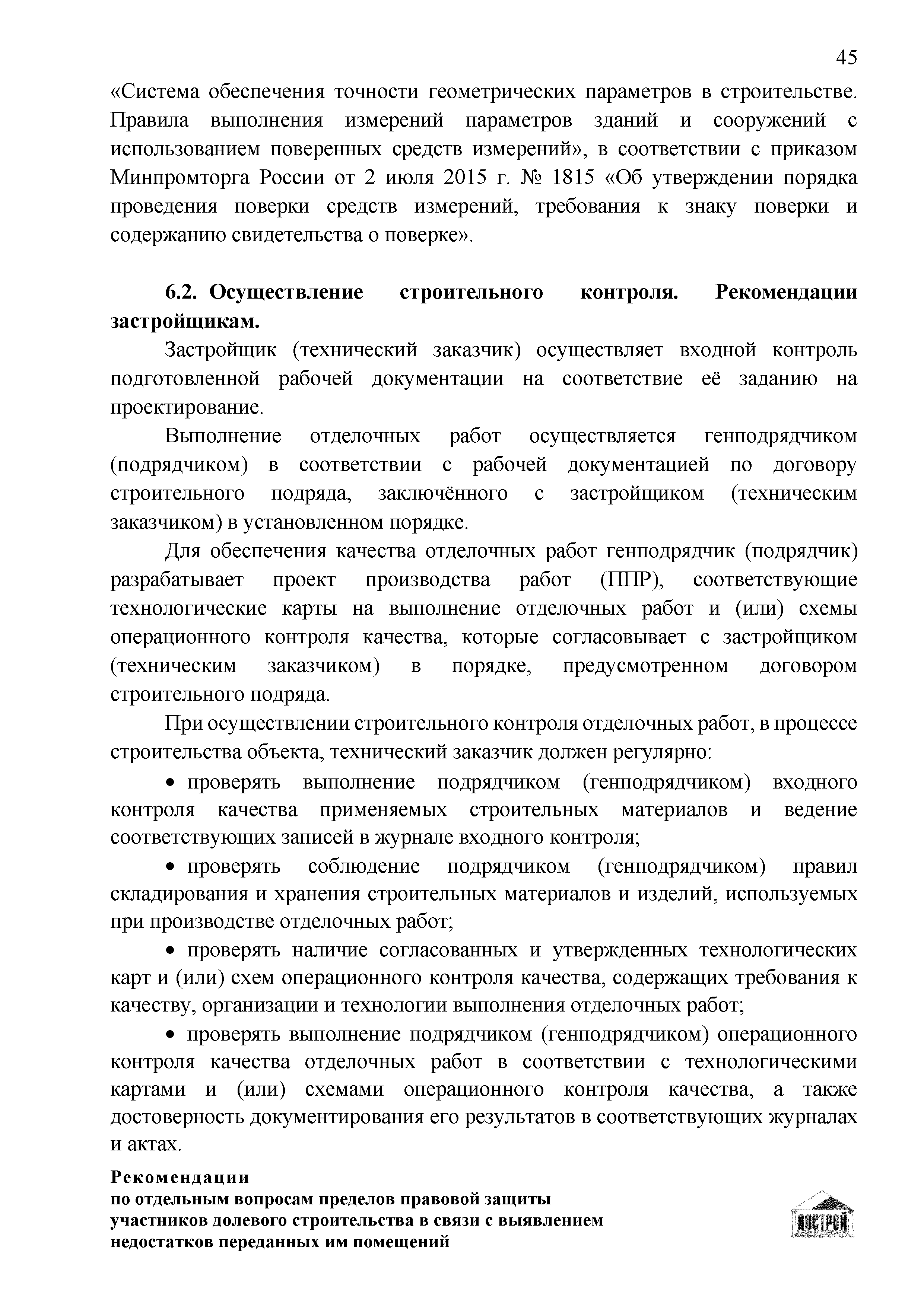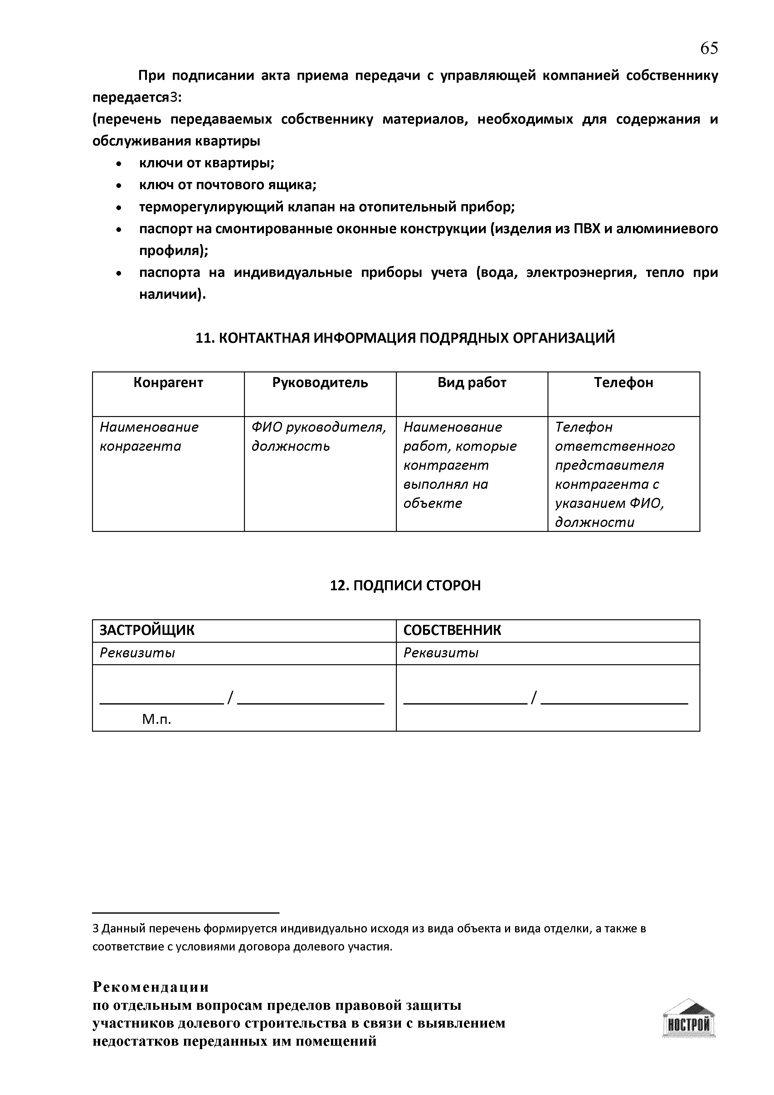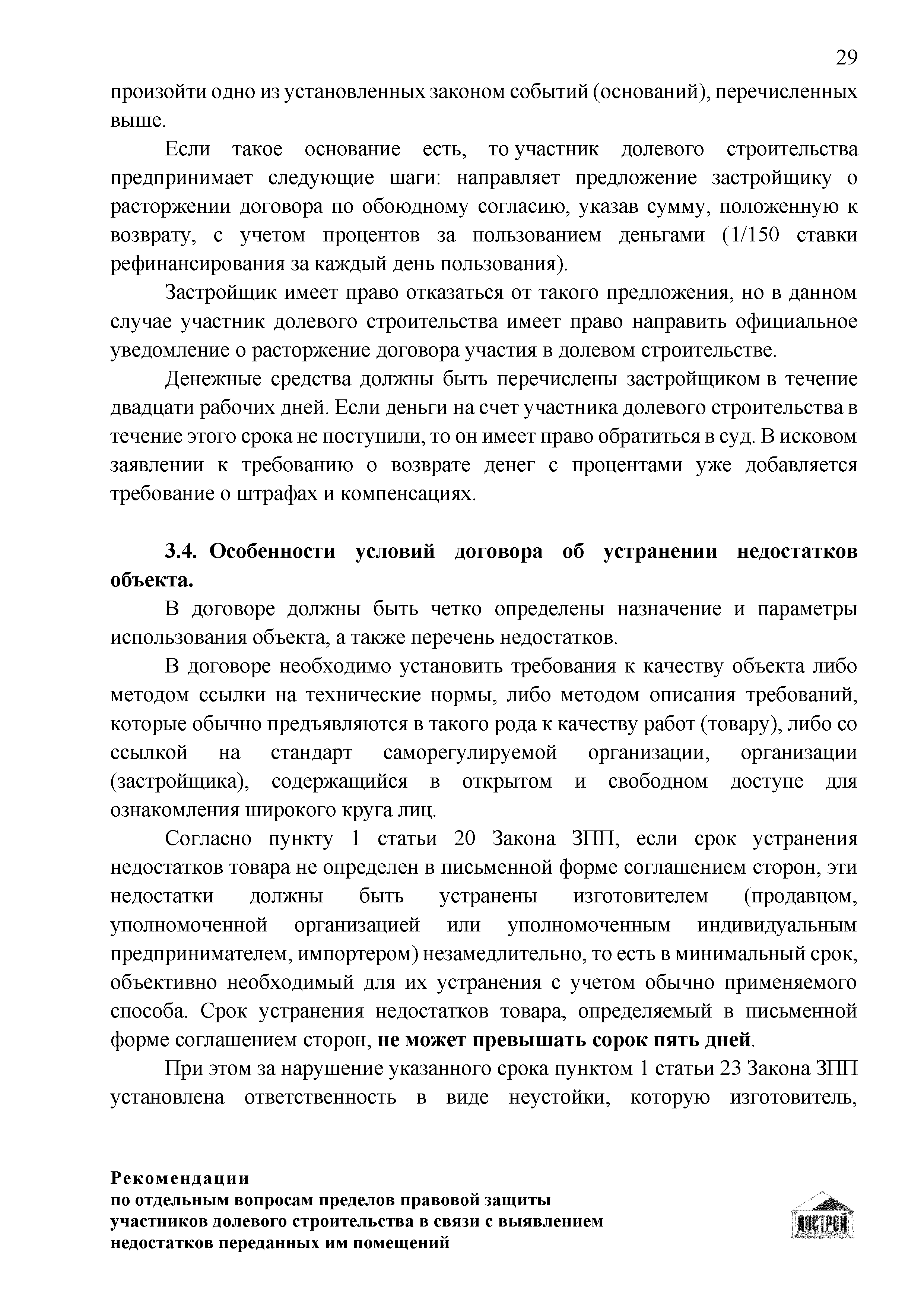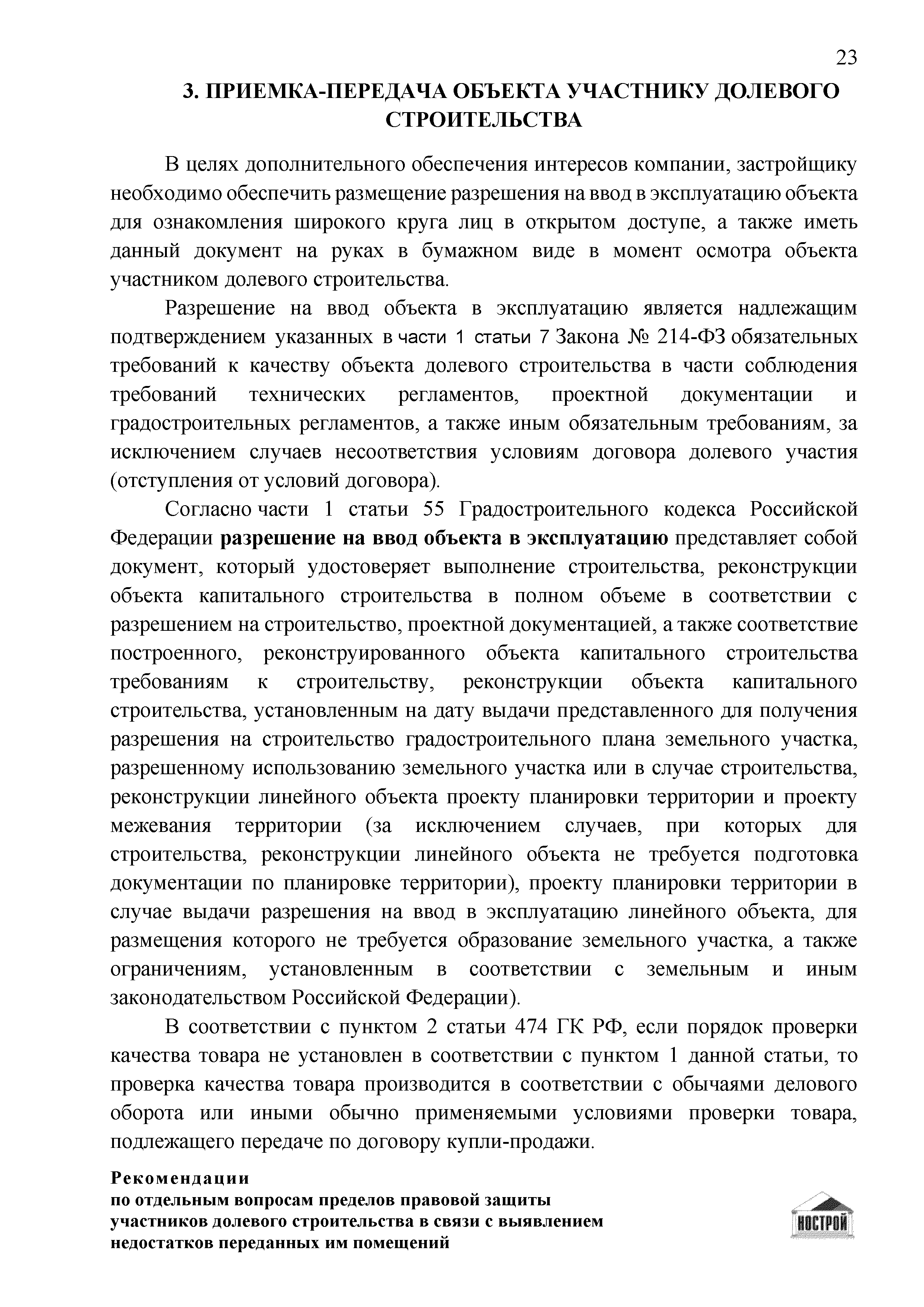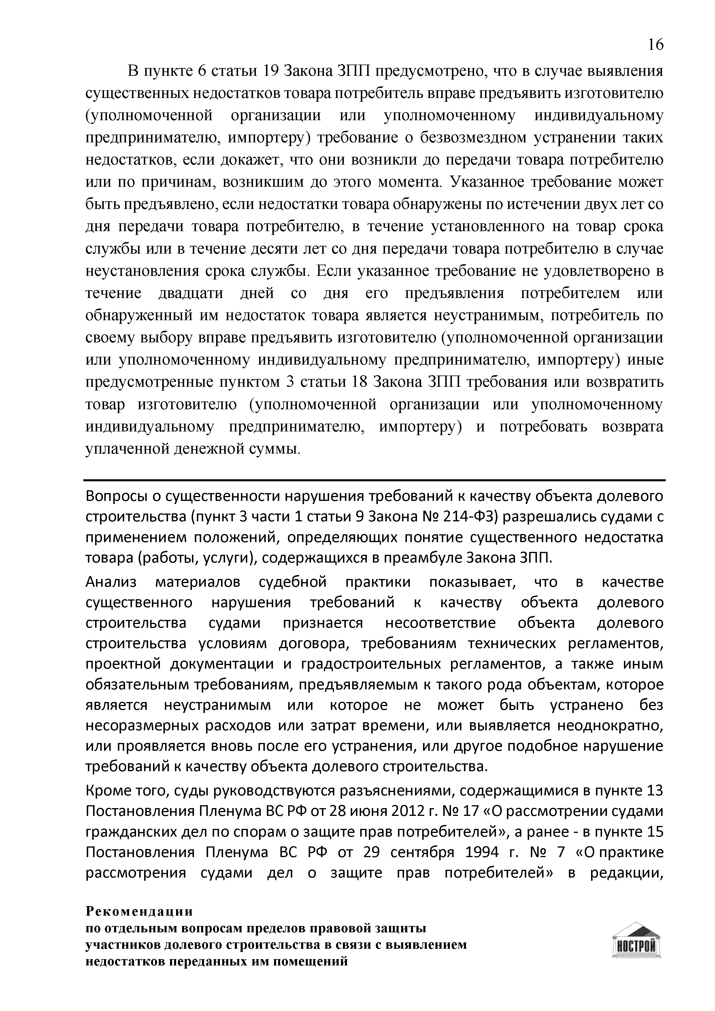 | Оглавление: | Введение 1 Правовая основа регулирования общественных отношений в сфере защиты прав участников долевого строительства 1.1 В части применения ГК РФ 1.2 В части применения Закона № 214-ФЗ 1.3 В части применения Закона ЗПП 2 Существенные и иные недостатки объекта долевого строительства 2.1 Обязательные и добровольные требования нормативной технической документации 2.2 Виды недостатков объекта 2.3 Гарантия качества. Взаимодействие застройщика с собственниками квартир в период гарантийного срока эксплуатации 2.4 Права требования участников долевого строительства в связи с выявленными недостатками 2.5 Субъекты установления (выявления) недостатков объекта долевого строительства 3 Приемка-передача объекта участнику долевого строительства 3.1 Регламентированные сроки приемки-передачи объекта 3.2 Осмотр объекта при приемке-передаче, выявление и фиксация недостатков 3.3 Односторонний отказ от приемки объекта 3.4 Особенности условий договора об устранении недостатков объекта 4 Санкции в отношении застройщика при выявлении недостатков объекта 4.1 Виды санкций. Правовые основания применения 4.2 Совокупность требований к застройщику. Применение принципа соразмерности 4.3 Признаки злоупотребления правом и особенности обоснования 5 Уступка права требования. Особенности споров 6 Особенности организации деятельности застройщика при производстве отделочных работ 6.1 Формирование технического задания, разработка рабочей документации, производство работ 6.2 Осуществление строительного контроля. Рекомендации застройщикам 7 Заключительные положения Приложение 1 Долевого участия. Обязательные положения для защиты интересов застройщика Приложение 2. Акт осмотра объекта. Рекомендации Приложение 3. Инструкция по эксплуатации объекта. Рекомендации Приложение 4. Акт приемки-передачи. Рекомендации |