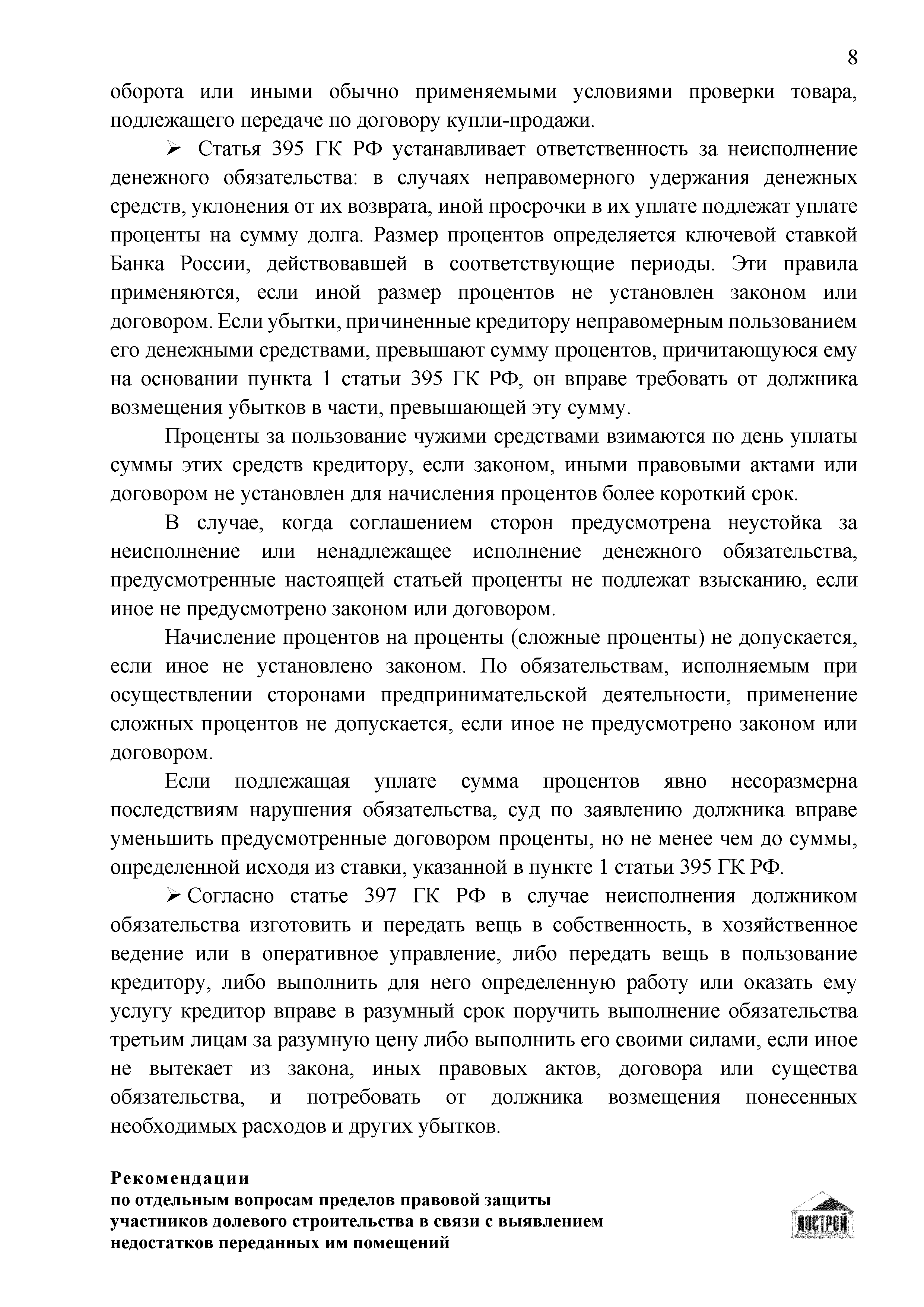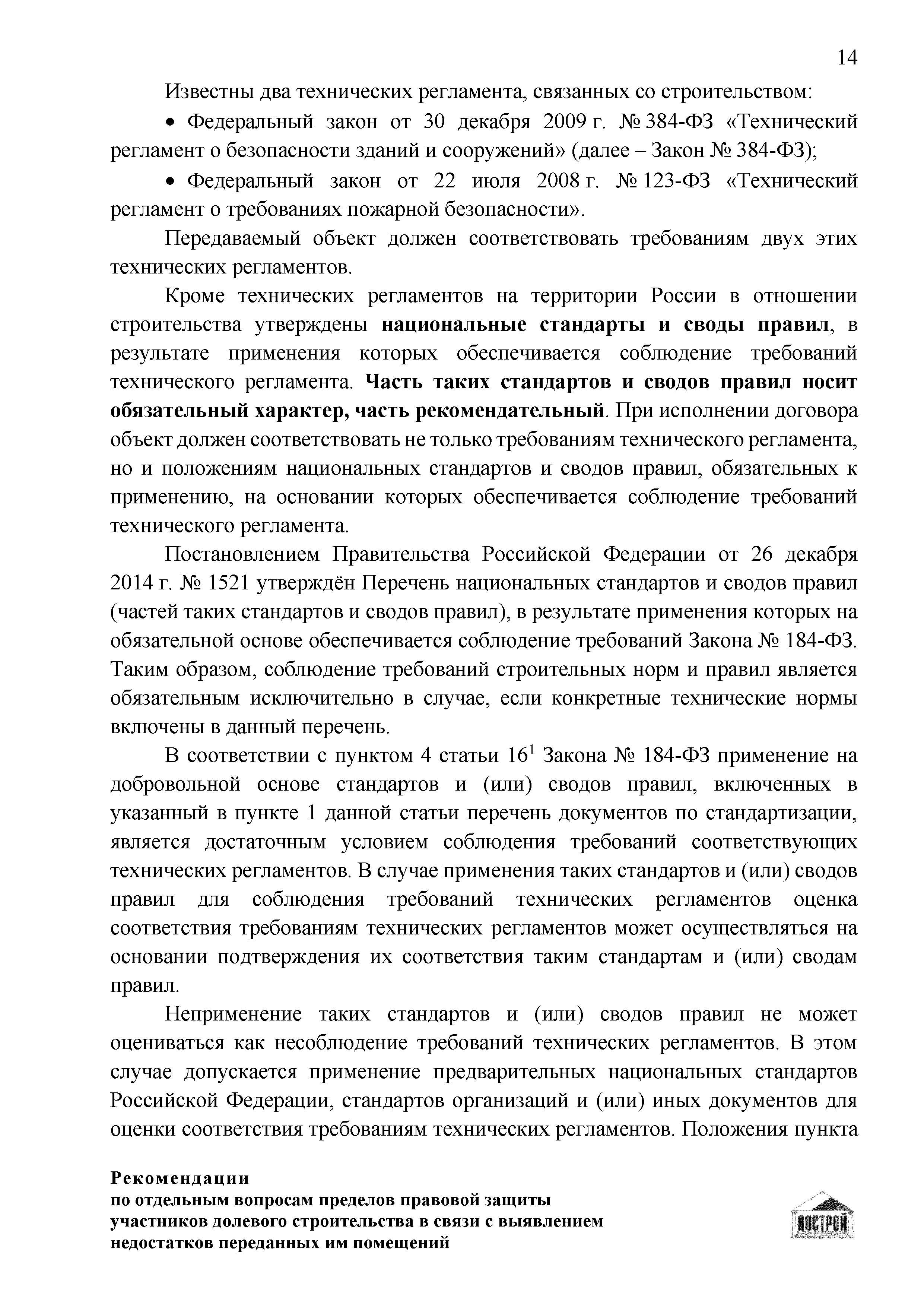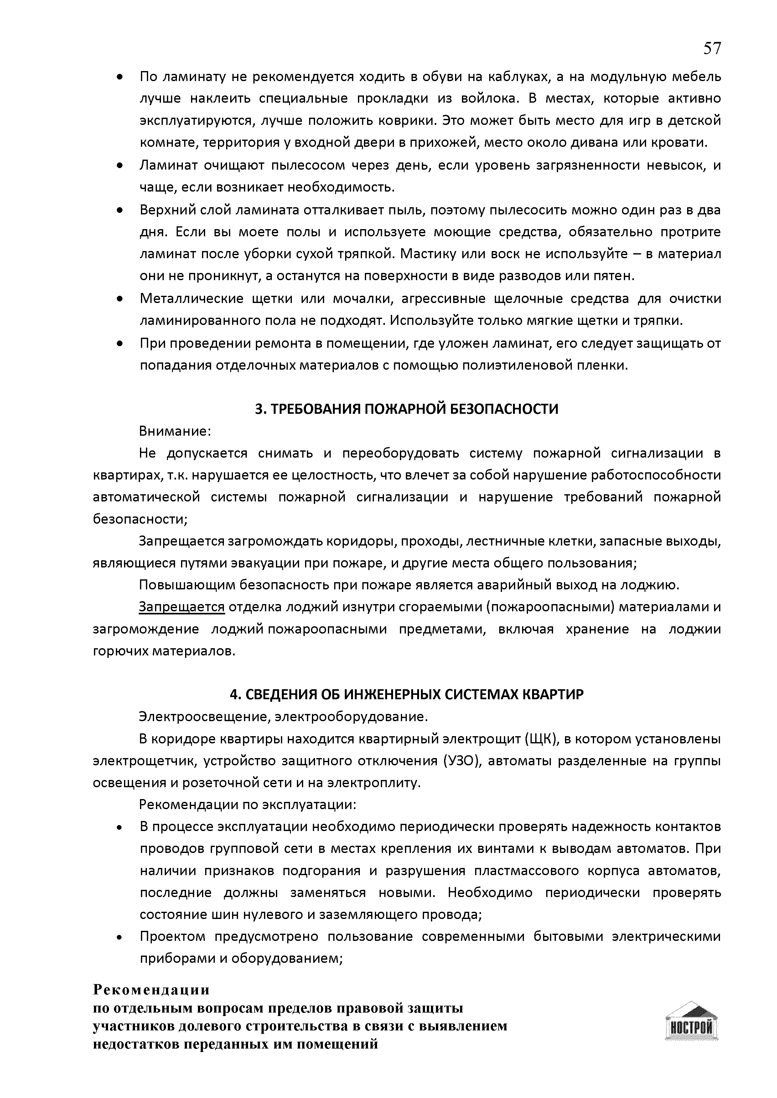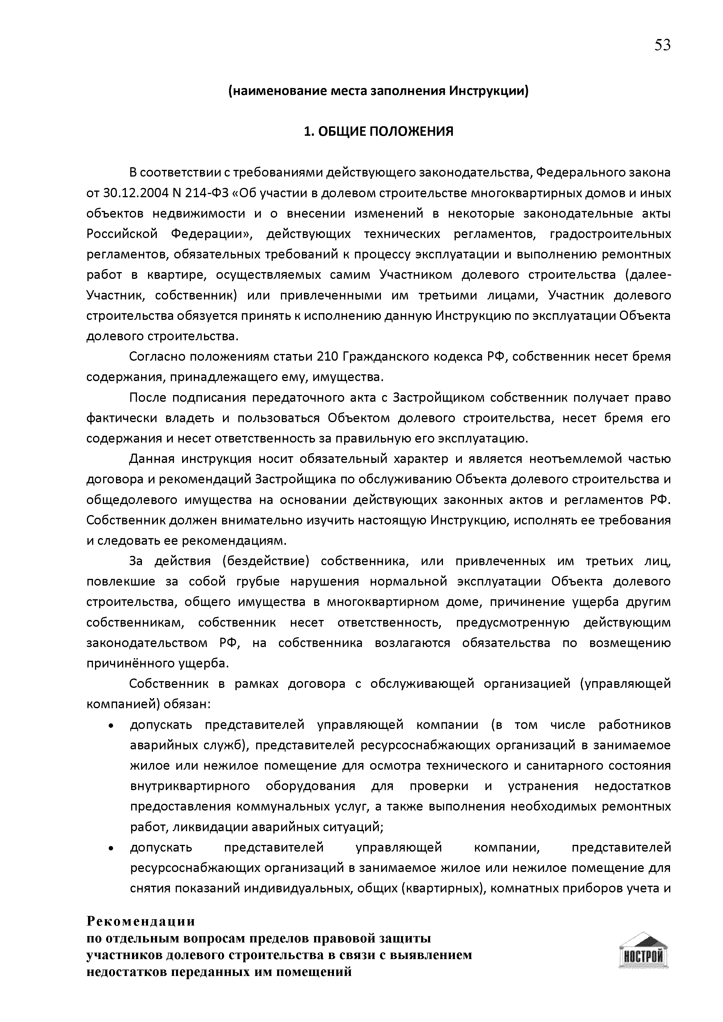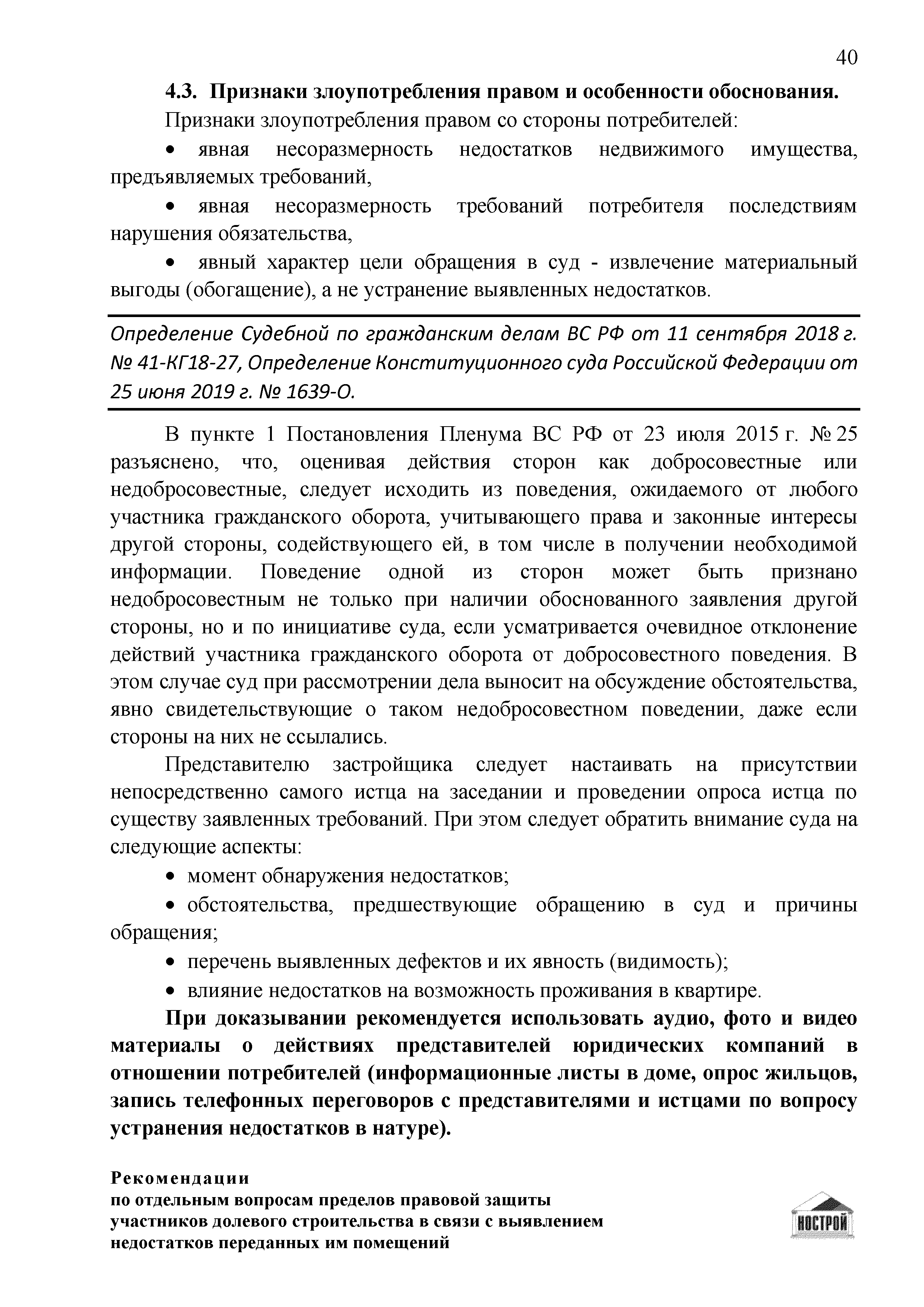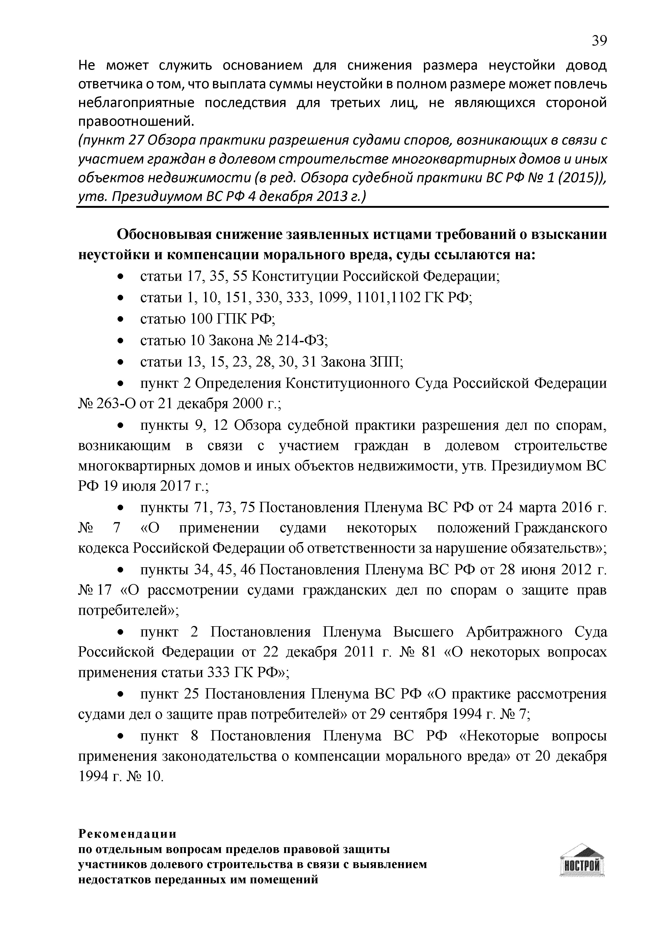 | Оглавление: | Введение 1 Правовая основа регулирования общественных отношений в сфере защиты прав участников долевого строительства 1.1 В части применения ГК РФ 1.2 В части применения Закона № 214-ФЗ 1.3 В части применения Закона ЗПП 2 Существенные и иные недостатки объекта долевого строительства 2.1 Обязательные и добровольные требования нормативной технической документации 2.2 Виды недостатков объекта 2.3 Гарантия качества. Взаимодействие застройщика с собственниками квартир в период гарантийного срока эксплуатации 2.4 Права требования участников долевого строительства в связи с выявленными недостатками 2.5 Субъекты установления (выявления) недостатков объекта долевого строительства 3 Приемка-передача объекта участнику долевого строительства 3.1 Регламентированные сроки приемки-передачи объекта 3.2 Осмотр объекта при приемке-передаче, выявление и фиксация недостатков 3.3 Односторонний отказ от приемки объекта 3.4 Особенности условий договора об устранении недостатков объекта 4 Санкции в отношении застройщика при выявлении недостатков объекта 4.1 Виды санкций. Правовые основания применения 4.2 Совокупность требований к застройщику. Применение принципа соразмерности 4.3 Признаки злоупотребления правом и особенности обоснования 5 Уступка права требования. Особенности споров 6 Особенности организации деятельности застройщика при производстве отделочных работ 6.1 Формирование технического задания, разработка рабочей документации, производство работ 6.2 Осуществление строительного контроля. Рекомендации застройщикам 7 Заключительные положения Приложение 1 Долевого участия. Обязательные положения для защиты интересов застройщика Приложение 2. Акт осмотра объекта. Рекомендации Приложение 3. Инструкция по эксплуатации объекта. Рекомендации Приложение 4. Акт приемки-передачи. Рекомендации |