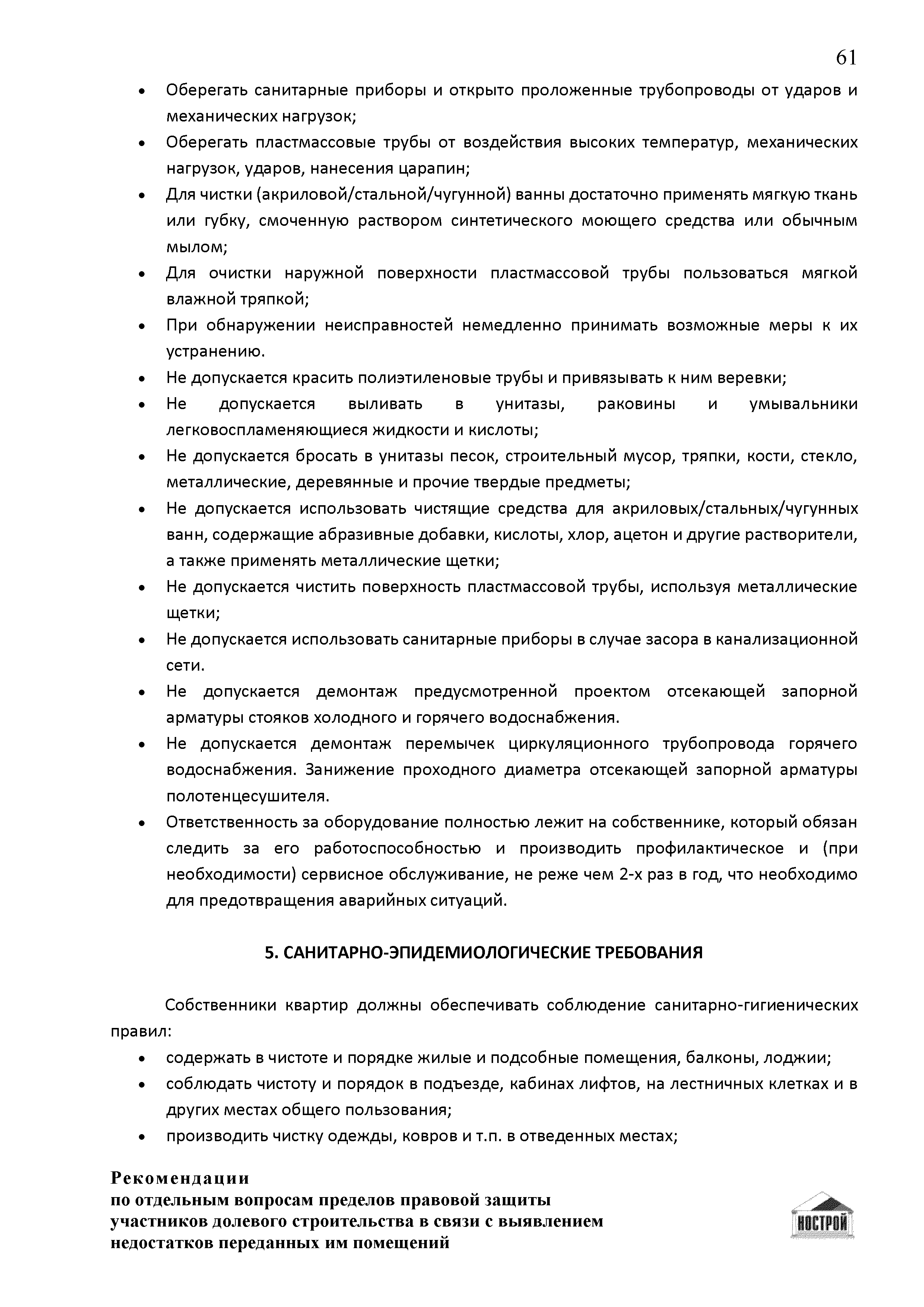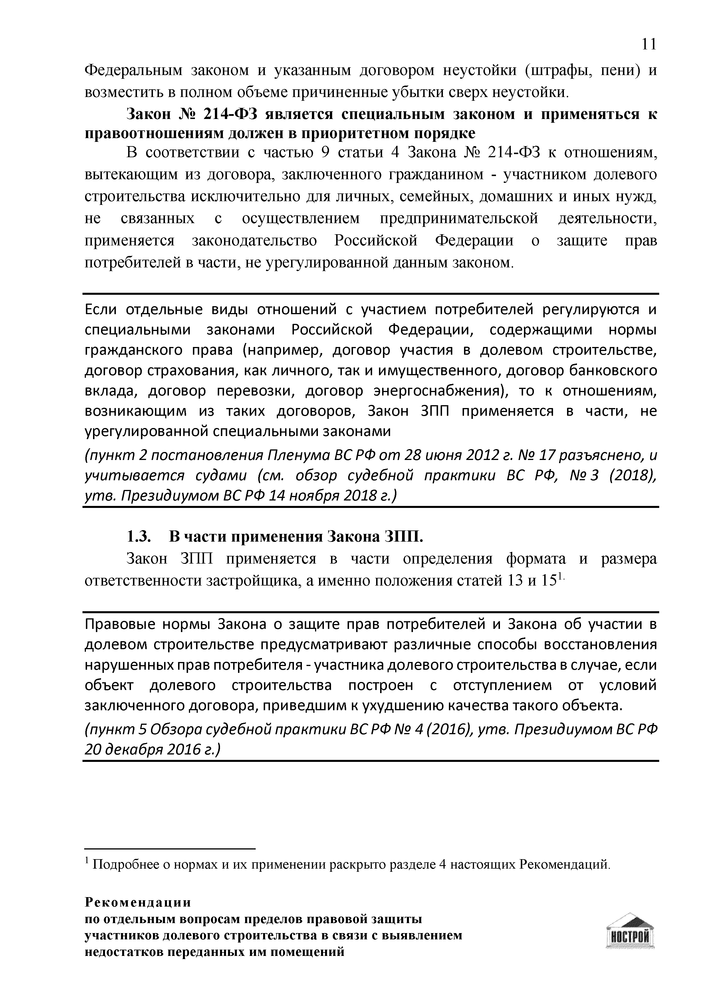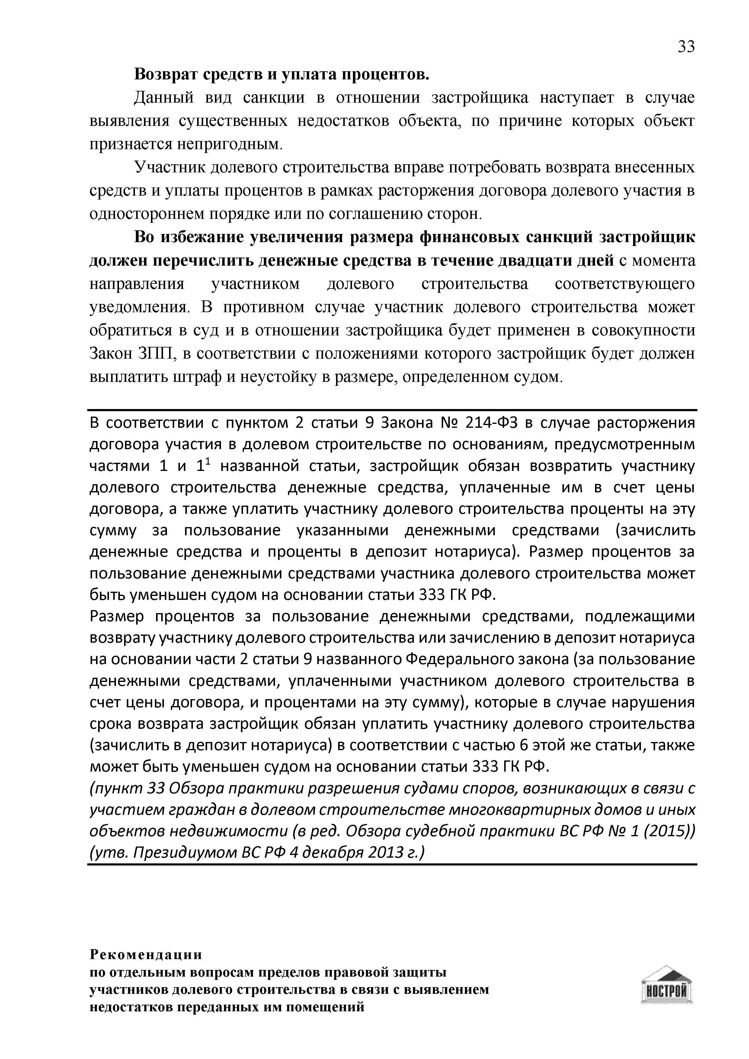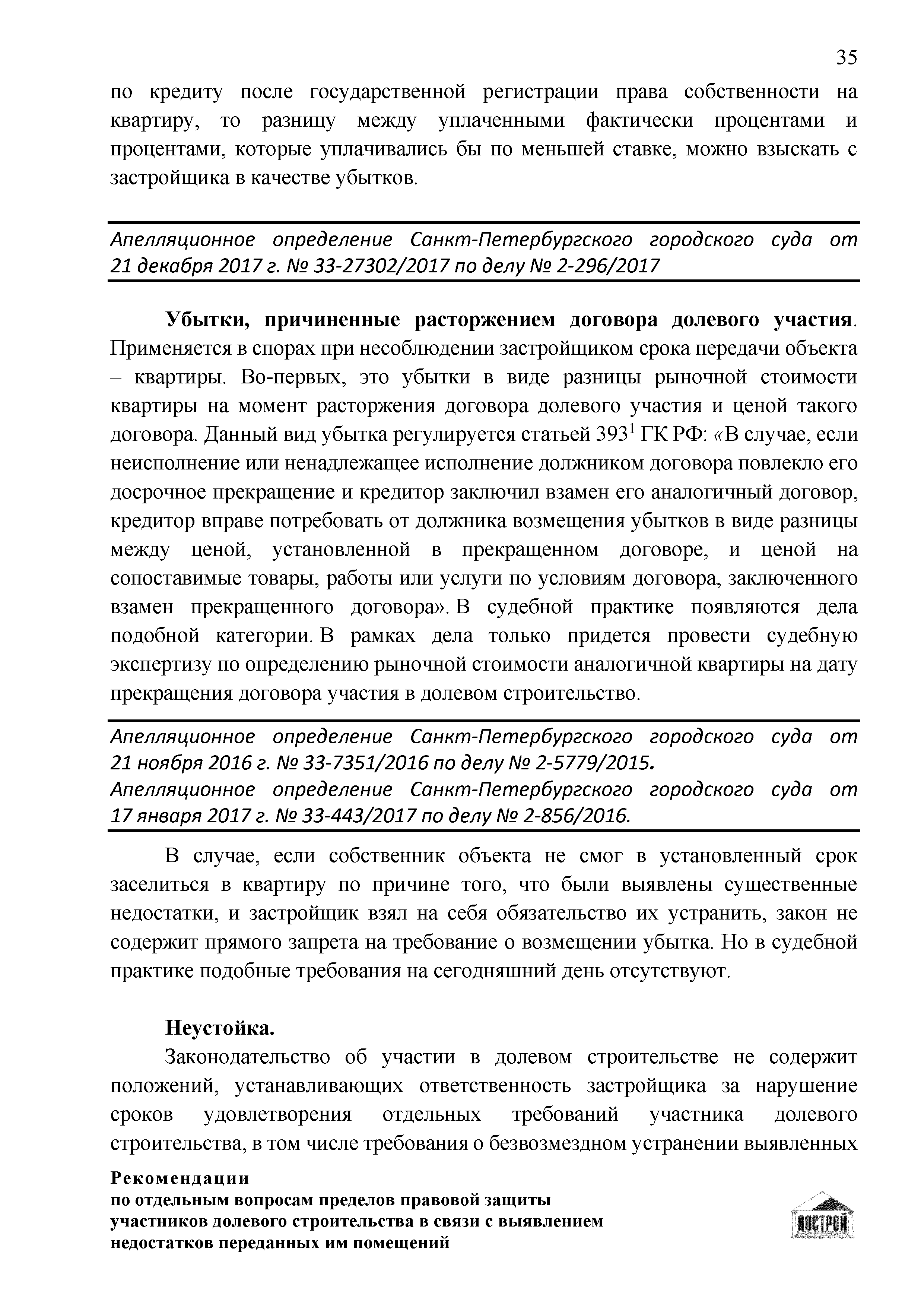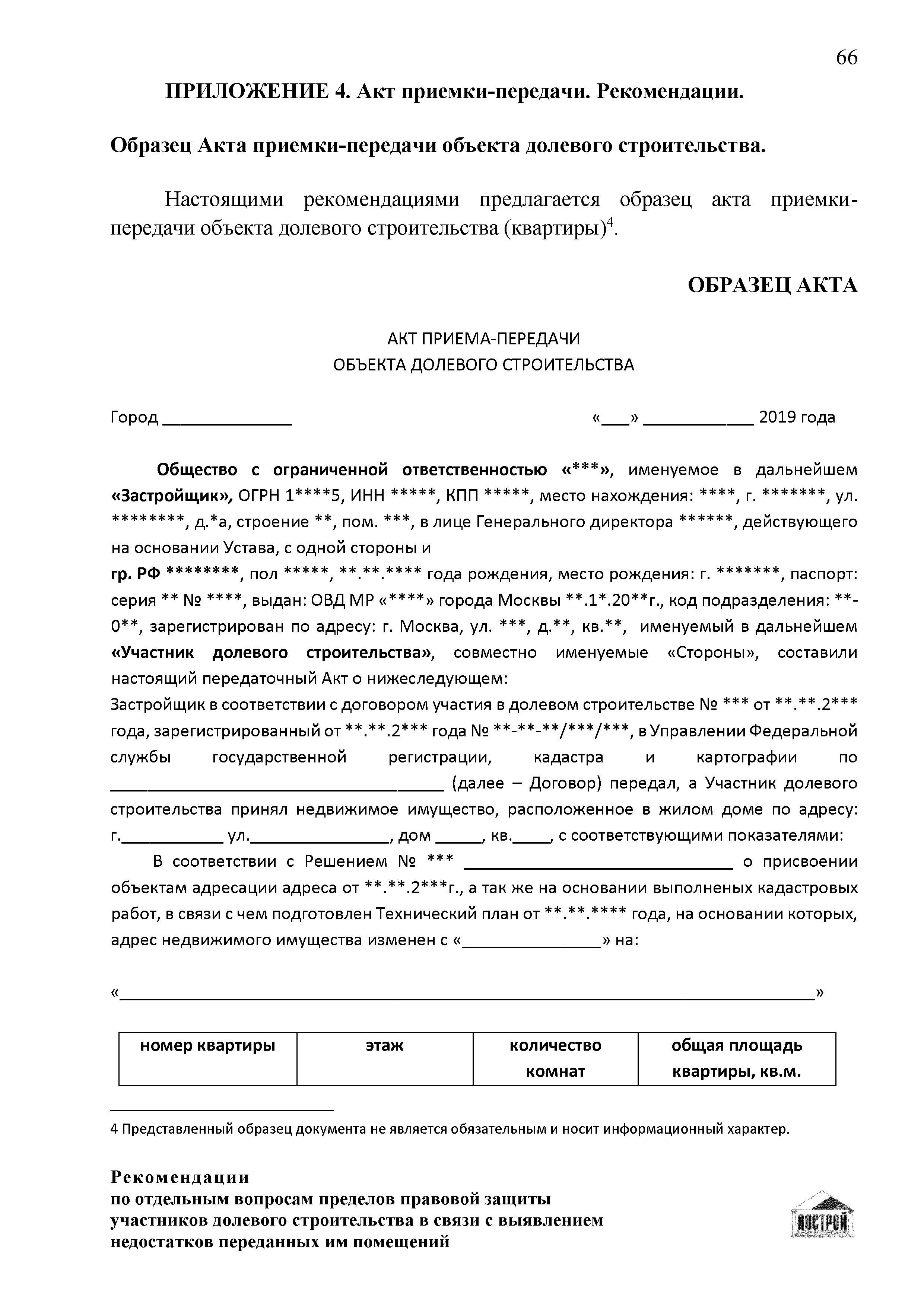 | Оглавление: | Введение 1 Правовая основа регулирования общественных отношений в сфере защиты прав участников долевого строительства 1.1 В части применения ГК РФ 1.2 В части применения Закона № 214-ФЗ 1.3 В части применения Закона ЗПП 2 Существенные и иные недостатки объекта долевого строительства 2.1 Обязательные и добровольные требования нормативной технической документации 2.2 Виды недостатков объекта 2.3 Гарантия качества. Взаимодействие застройщика с собственниками квартир в период гарантийного срока эксплуатации 2.4 Права требования участников долевого строительства в связи с выявленными недостатками 2.5 Субъекты установления (выявления) недостатков объекта долевого строительства 3 Приемка-передача объекта участнику долевого строительства 3.1 Регламентированные сроки приемки-передачи объекта 3.2 Осмотр объекта при приемке-передаче, выявление и фиксация недостатков 3.3 Односторонний отказ от приемки объекта 3.4 Особенности условий договора об устранении недостатков объекта 4 Санкции в отношении застройщика при выявлении недостатков объекта 4.1 Виды санкций. Правовые основания применения 4.2 Совокупность требований к застройщику. Применение принципа соразмерности 4.3 Признаки злоупотребления правом и особенности обоснования 5 Уступка права требования. Особенности споров 6 Особенности организации деятельности застройщика при производстве отделочных работ 6.1 Формирование технического задания, разработка рабочей документации, производство работ 6.2 Осуществление строительного контроля. Рекомендации застройщикам 7 Заключительные положения Приложение 1 Долевого участия. Обязательные положения для защиты интересов застройщика Приложение 2. Акт осмотра объекта. Рекомендации Приложение 3. Инструкция по эксплуатации объекта. Рекомендации Приложение 4. Акт приемки-передачи. Рекомендации |