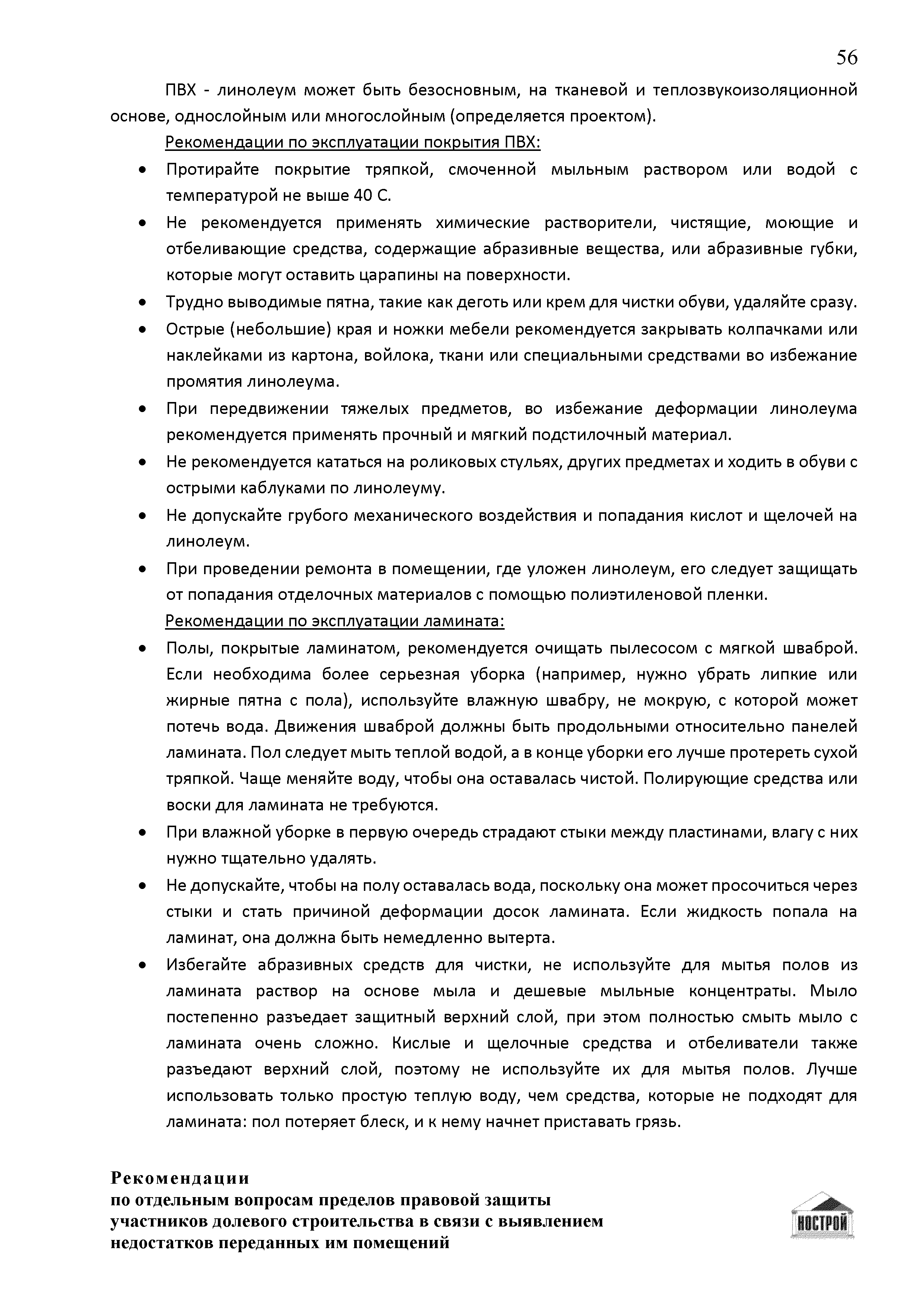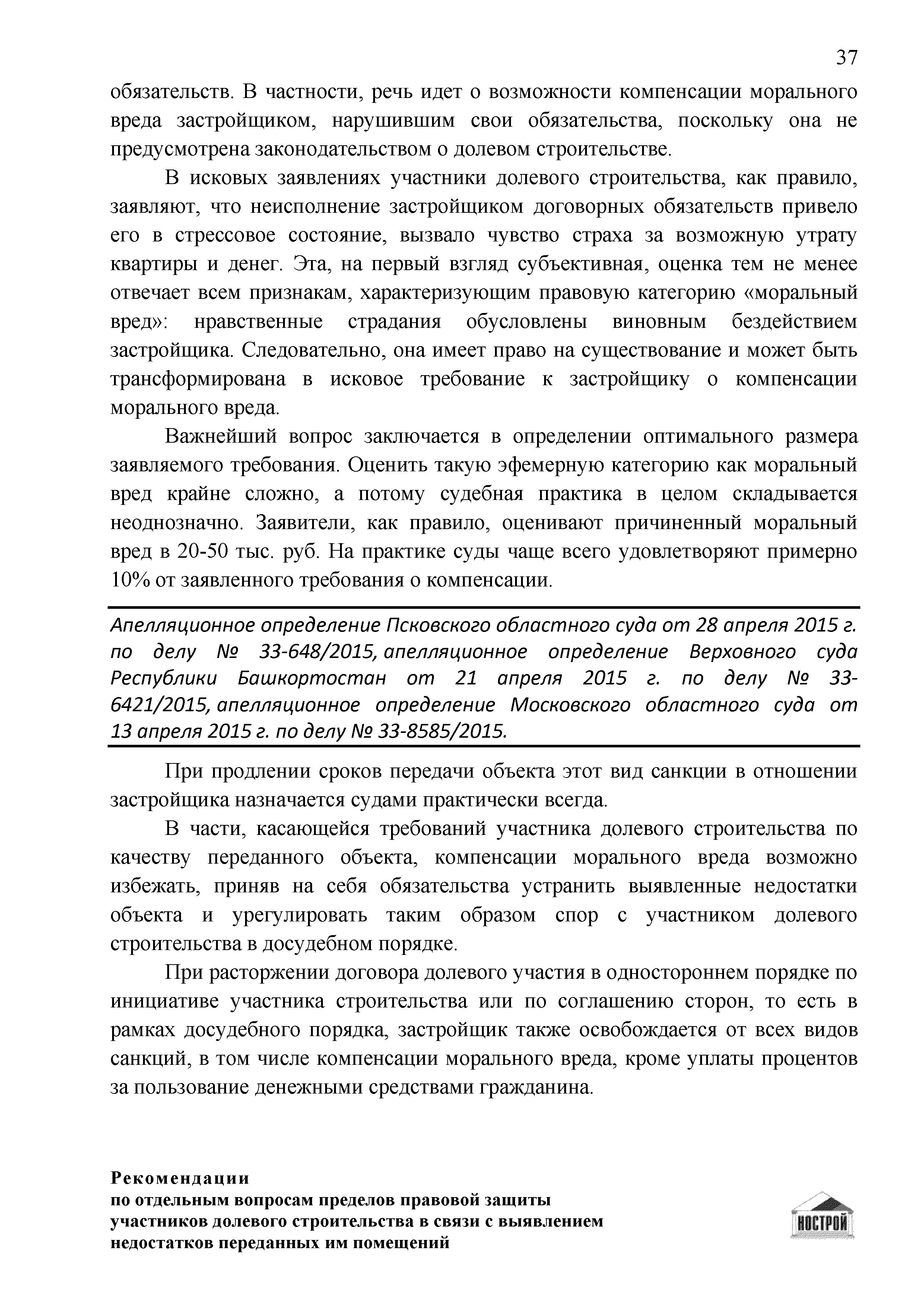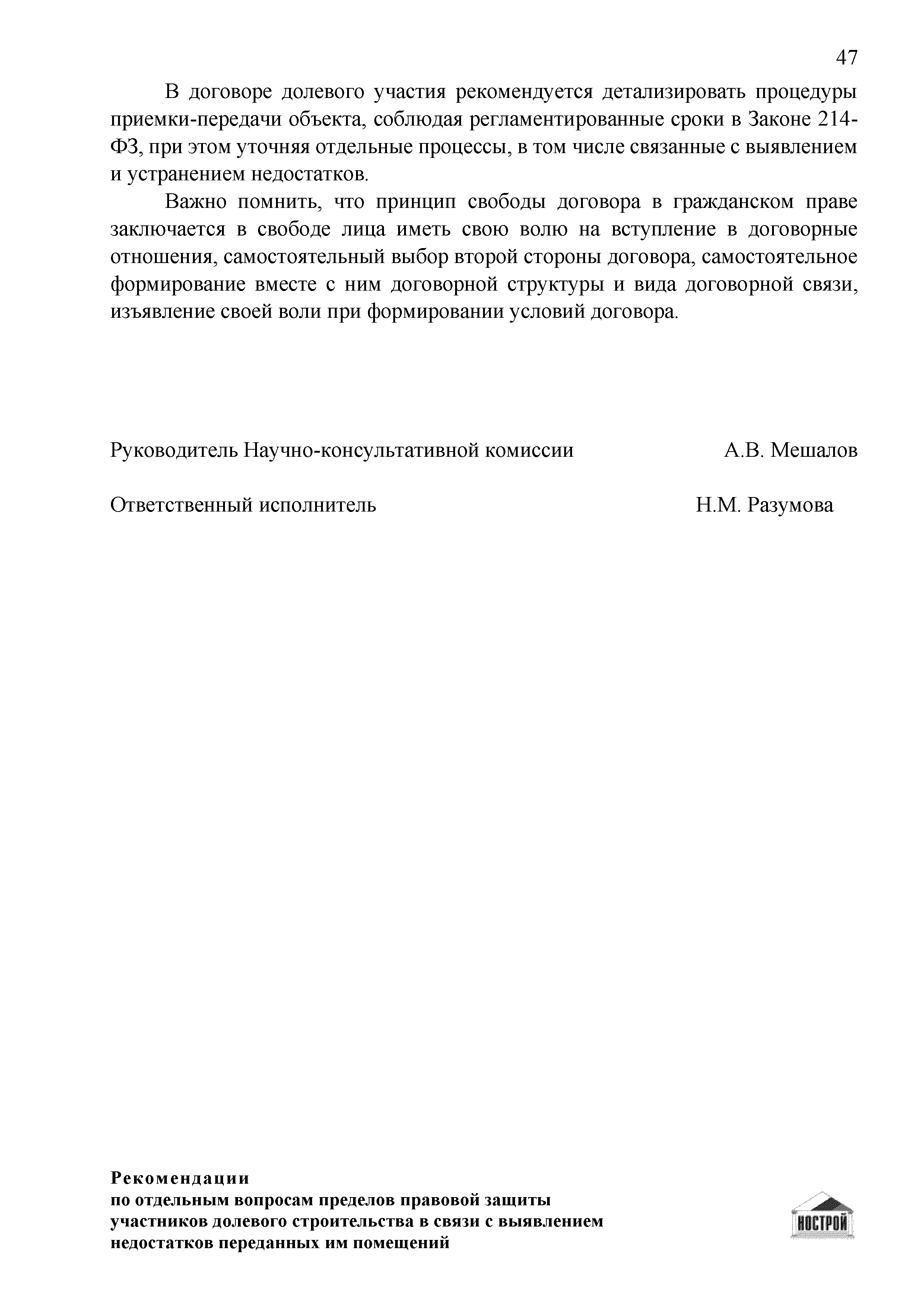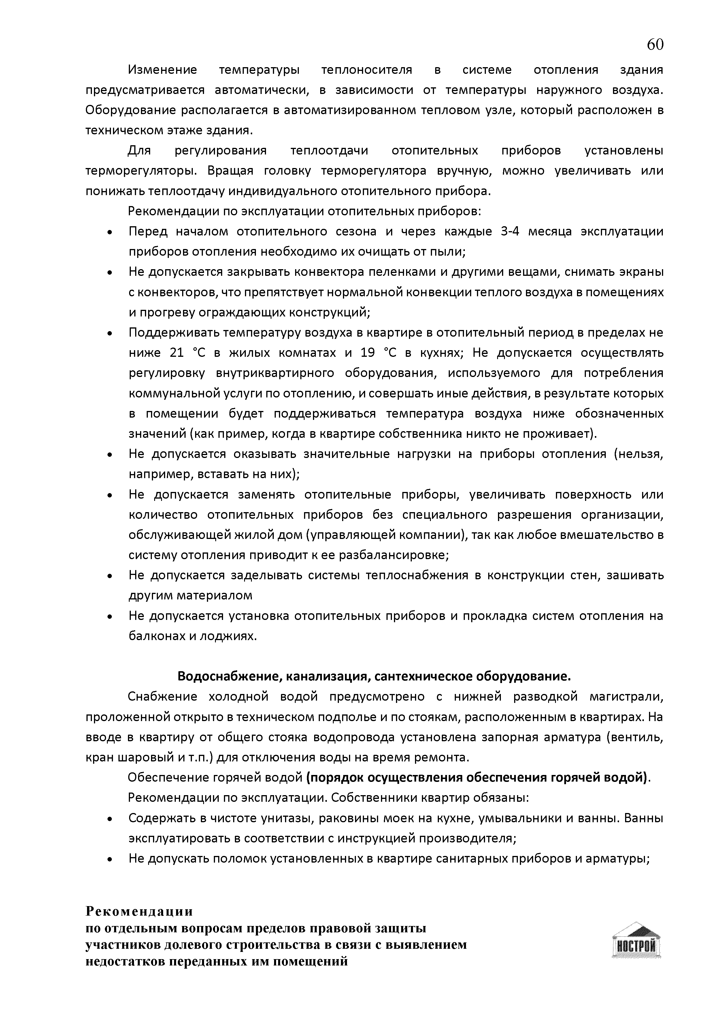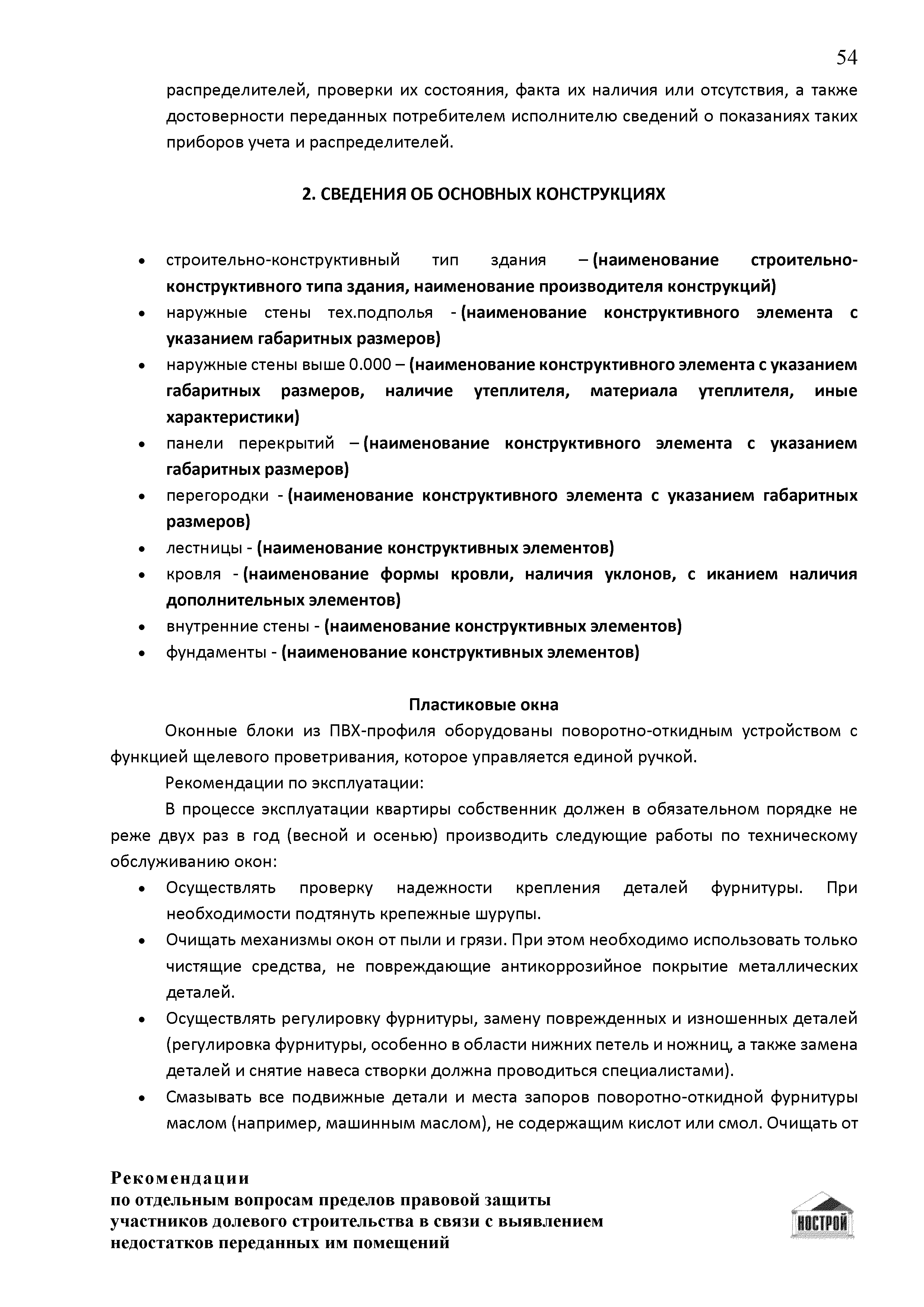 | Оглавление: | Введение 1 Правовая основа регулирования общественных отношений в сфере защиты прав участников долевого строительства 1.1 В части применения ГК РФ 1.2 В части применения Закона № 214-ФЗ 1.3 В части применения Закона ЗПП 2 Существенные и иные недостатки объекта долевого строительства 2.1 Обязательные и добровольные требования нормативной технической документации 2.2 Виды недостатков объекта 2.3 Гарантия качества. Взаимодействие застройщика с собственниками квартир в период гарантийного срока эксплуатации 2.4 Права требования участников долевого строительства в связи с выявленными недостатками 2.5 Субъекты установления (выявления) недостатков объекта долевого строительства 3 Приемка-передача объекта участнику долевого строительства 3.1 Регламентированные сроки приемки-передачи объекта 3.2 Осмотр объекта при приемке-передаче, выявление и фиксация недостатков 3.3 Односторонний отказ от приемки объекта 3.4 Особенности условий договора об устранении недостатков объекта 4 Санкции в отношении застройщика при выявлении недостатков объекта 4.1 Виды санкций. Правовые основания применения 4.2 Совокупность требований к застройщику. Применение принципа соразмерности 4.3 Признаки злоупотребления правом и особенности обоснования 5 Уступка права требования. Особенности споров 6 Особенности организации деятельности застройщика при производстве отделочных работ 6.1 Формирование технического задания, разработка рабочей документации, производство работ 6.2 Осуществление строительного контроля. Рекомендации застройщикам 7 Заключительные положения Приложение 1 Долевого участия. Обязательные положения для защиты интересов застройщика Приложение 2. Акт осмотра объекта. Рекомендации Приложение 3. Инструкция по эксплуатации объекта. Рекомендации Приложение 4. Акт приемки-передачи. Рекомендации |