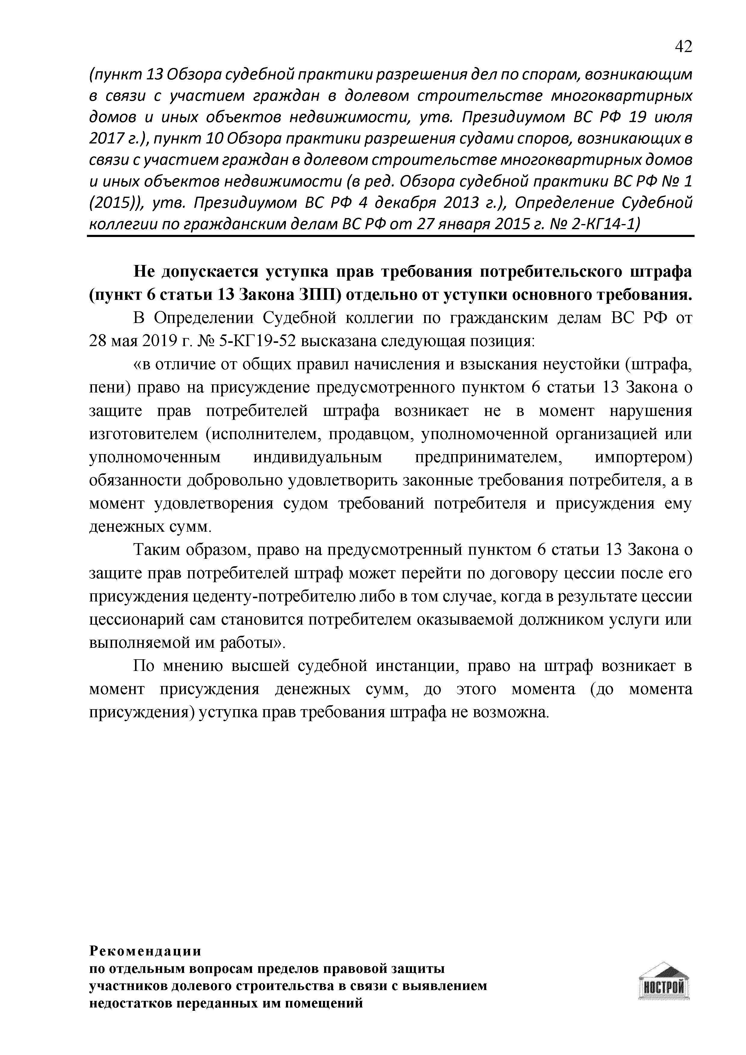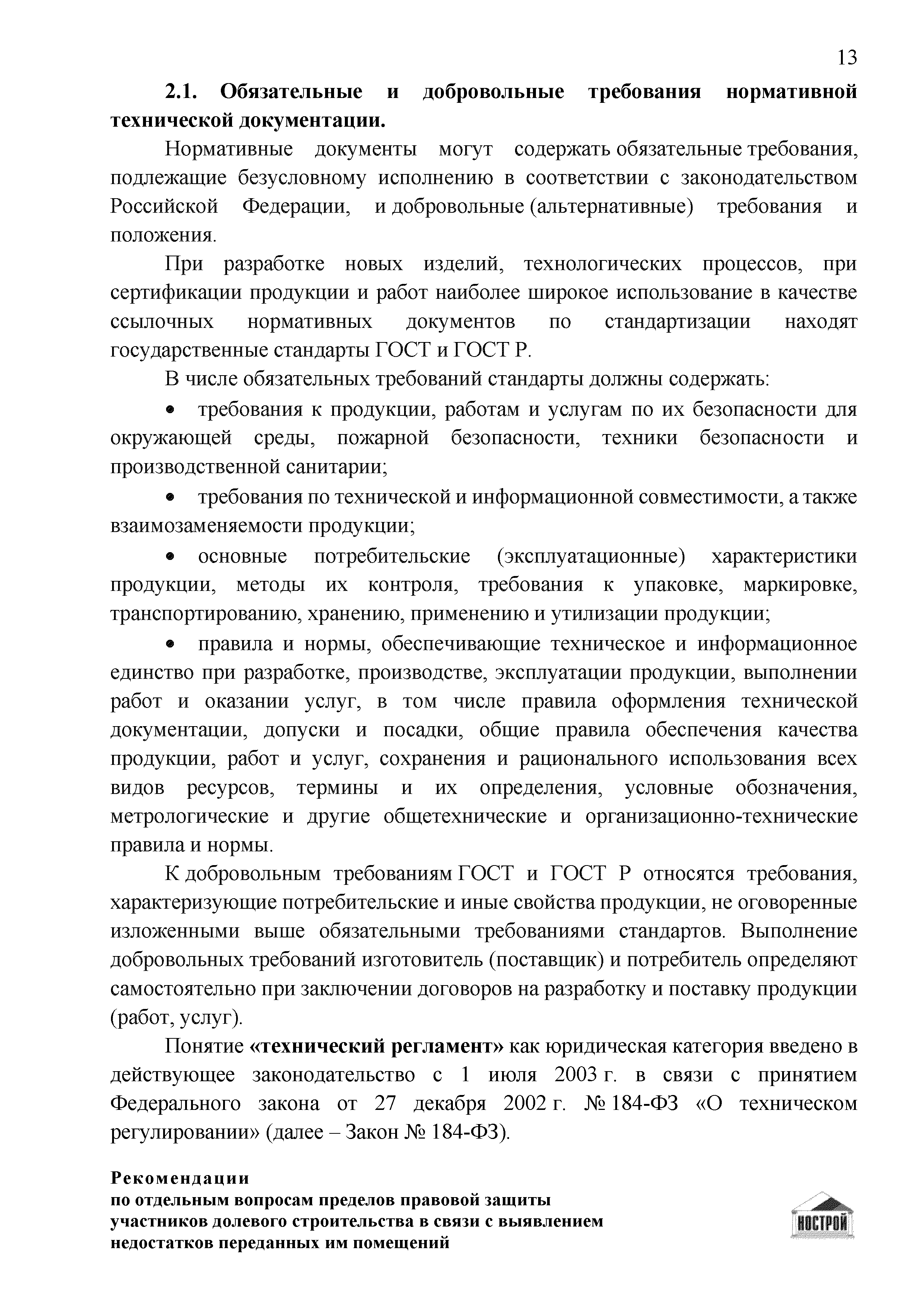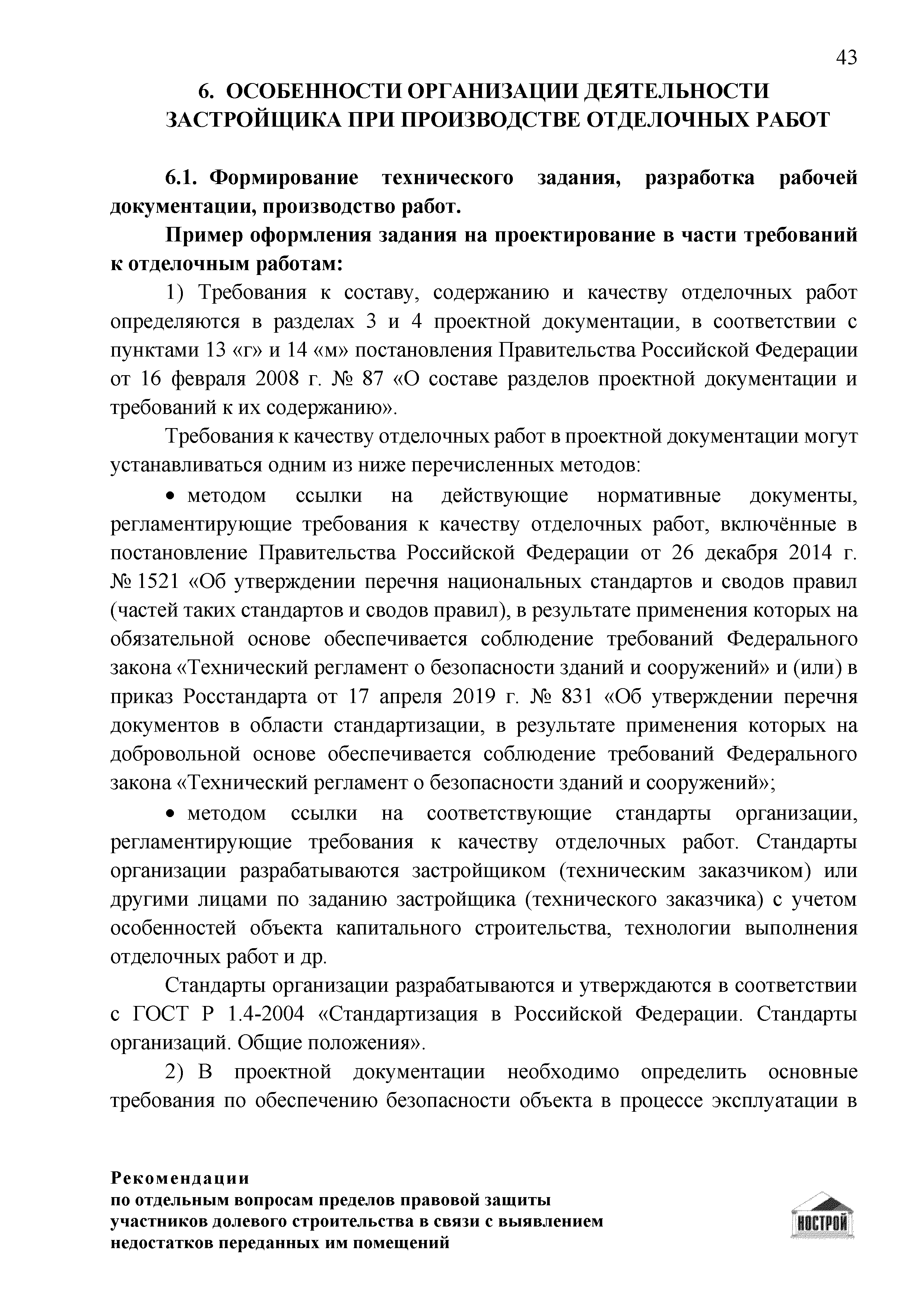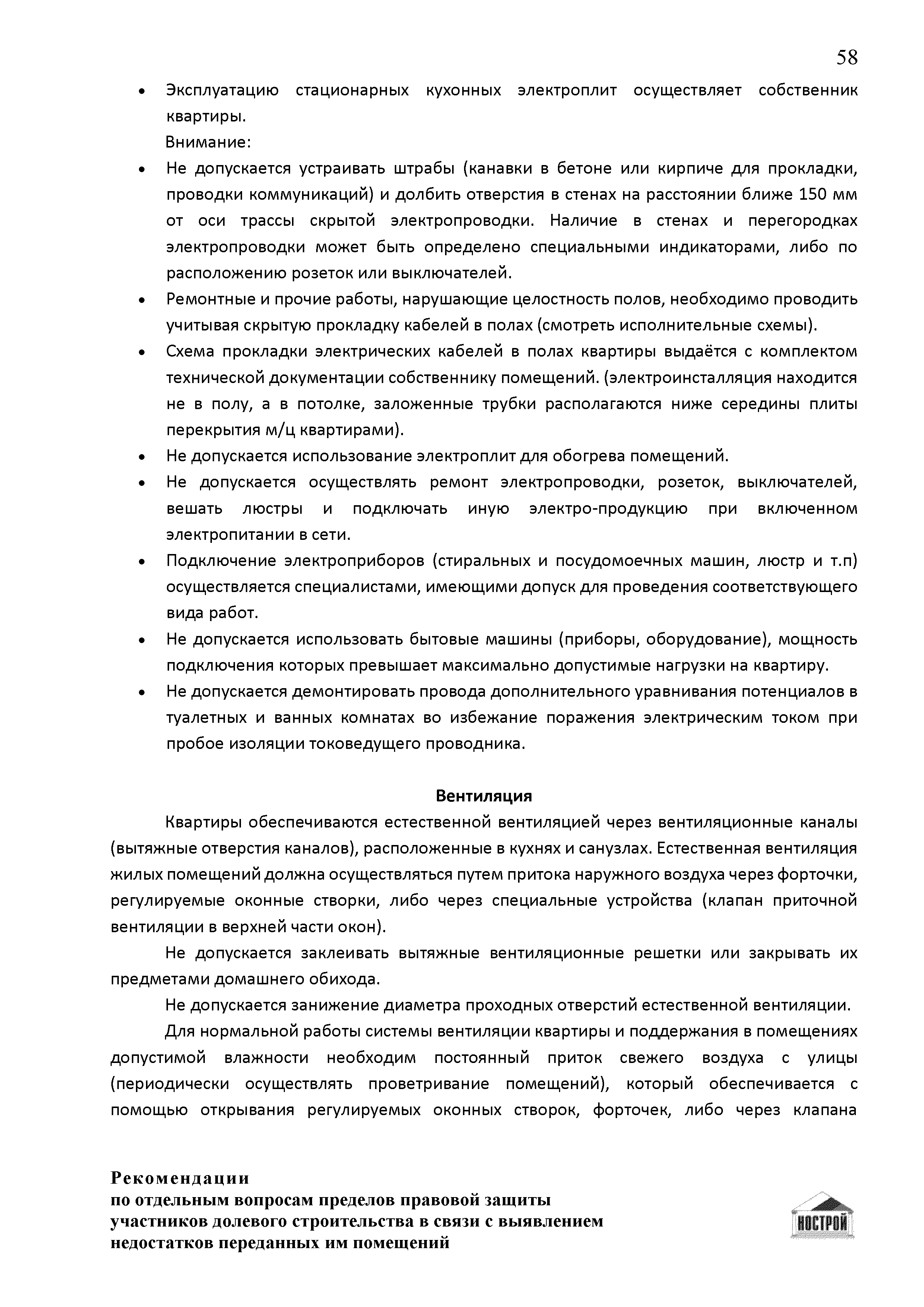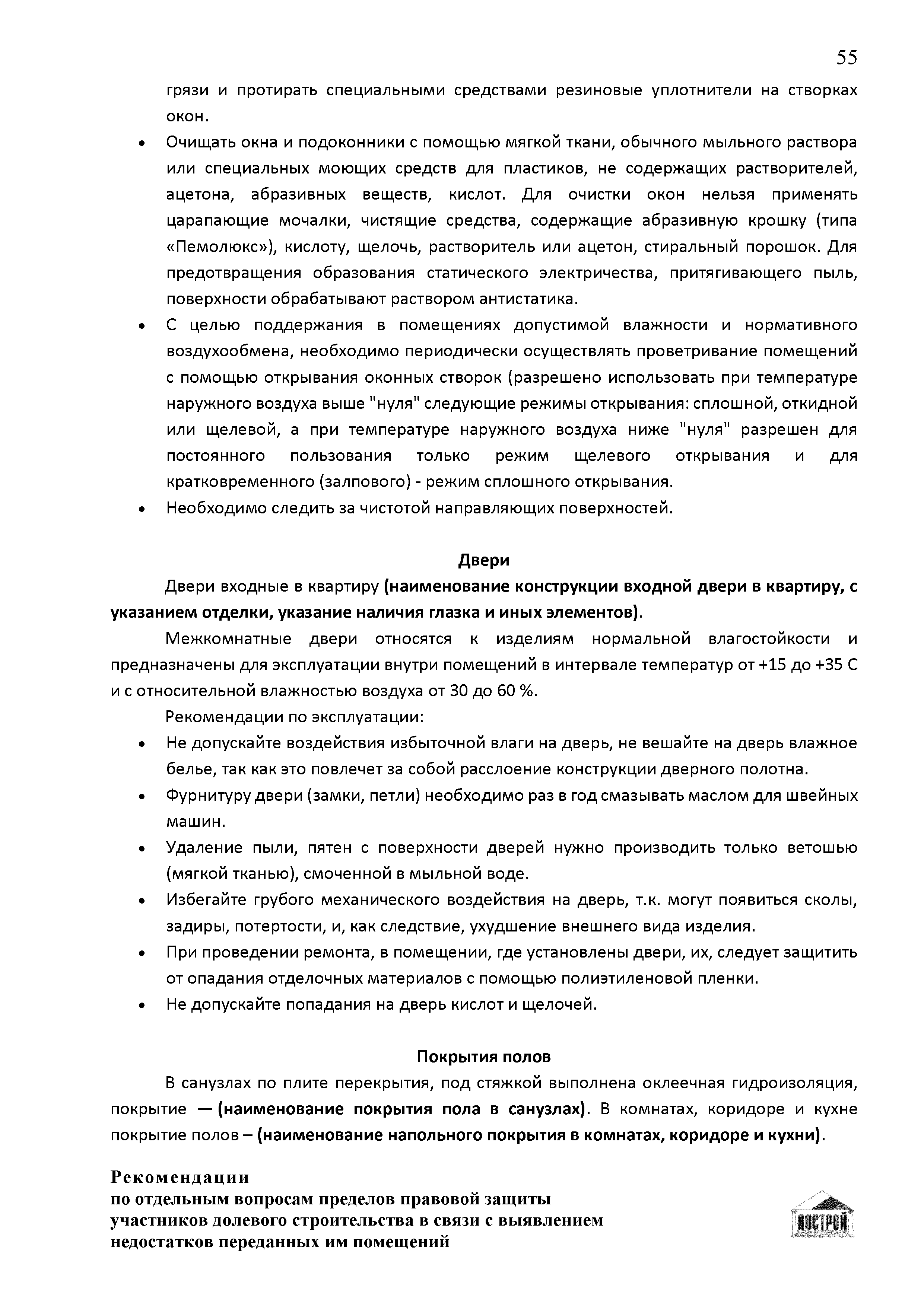 | Оглавление: | Введение 1 Правовая основа регулирования общественных отношений в сфере защиты прав участников долевого строительства 1.1 В части применения ГК РФ 1.2 В части применения Закона № 214-ФЗ 1.3 В части применения Закона ЗПП 2 Существенные и иные недостатки объекта долевого строительства 2.1 Обязательные и добровольные требования нормативной технической документации 2.2 Виды недостатков объекта 2.3 Гарантия качества. Взаимодействие застройщика с собственниками квартир в период гарантийного срока эксплуатации 2.4 Права требования участников долевого строительства в связи с выявленными недостатками 2.5 Субъекты установления (выявления) недостатков объекта долевого строительства 3 Приемка-передача объекта участнику долевого строительства 3.1 Регламентированные сроки приемки-передачи объекта 3.2 Осмотр объекта при приемке-передаче, выявление и фиксация недостатков 3.3 Односторонний отказ от приемки объекта 3.4 Особенности условий договора об устранении недостатков объекта 4 Санкции в отношении застройщика при выявлении недостатков объекта 4.1 Виды санкций. Правовые основания применения 4.2 Совокупность требований к застройщику. Применение принципа соразмерности 4.3 Признаки злоупотребления правом и особенности обоснования 5 Уступка права требования. Особенности споров 6 Особенности организации деятельности застройщика при производстве отделочных работ 6.1 Формирование технического задания, разработка рабочей документации, производство работ 6.2 Осуществление строительного контроля. Рекомендации застройщикам 7 Заключительные положения Приложение 1 Долевого участия. Обязательные положения для защиты интересов застройщика Приложение 2. Акт осмотра объекта. Рекомендации Приложение 3. Инструкция по эксплуатации объекта. Рекомендации Приложение 4. Акт приемки-передачи. Рекомендации |