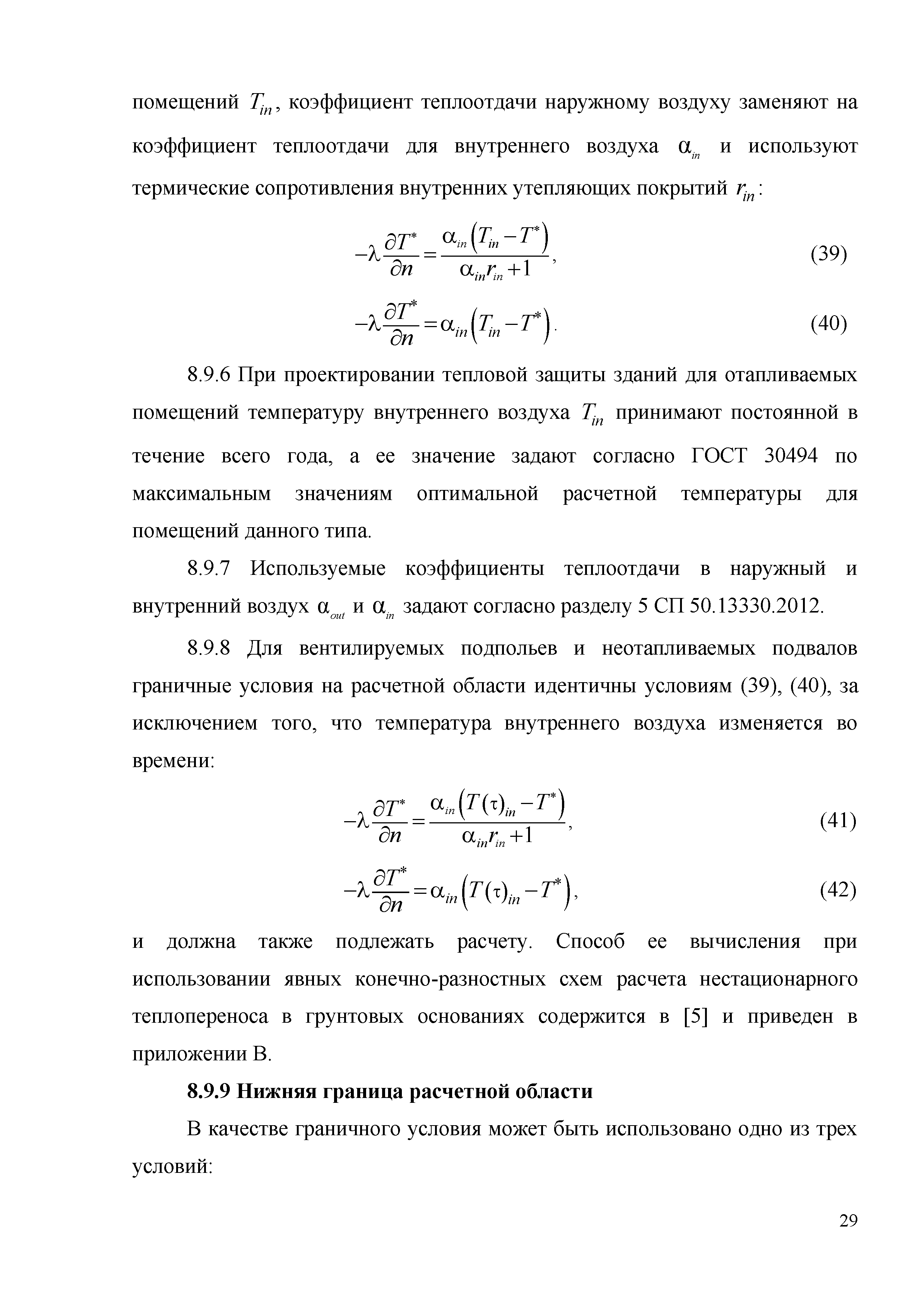 | Оглавление: | 1 Область применения 2 Нормативные ссылки 3 Термины и определения 4 Общие положения 5 Исходные данные 6 Методика расчета теплопотерь и приведенного сопротивления теплопередаче в грунтовое основание методом однородных зон (МОЗ) 7 Аналитическая методика расчета теплопотерь и приведенного сопротивления теплопередаче в грунтовое основание (АМР) 8 Численный расчет теплопотерь и приведенного сопротивления теплопередаче методом нестационарных температурных полей (МНТП) Приложение А Примеры расчета теплопотерь для отапливаемого подвала здания с использованием трех методик Приложение Б Пример расчет начальных условий и оценки температуры грунтовых вод для методики МНТП Приложение В Порядок расчета теплопотерь в неотапливаемых помещениях, контактирующих с основанием, с использованием методики МНТП Приложение Г Примеры расчетов с использованием методики МНТП теплопотерь и приведенных сопротивлений теплопередаче различных конструкций зданий, контактирующих с основанием Библиография |