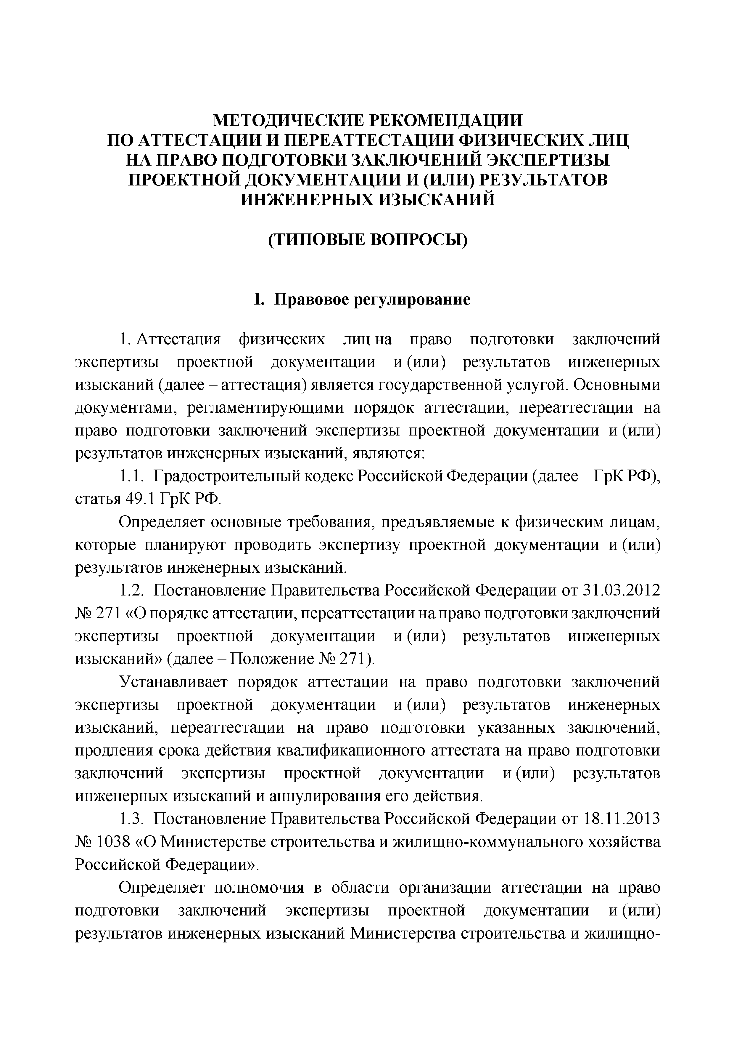 Методические рекомендации по аттестации и переаттестации физических лиц на право подготовки заключений экспертизы проектной документации и (или) результатов инженерных изысканий (типовые вопросы)