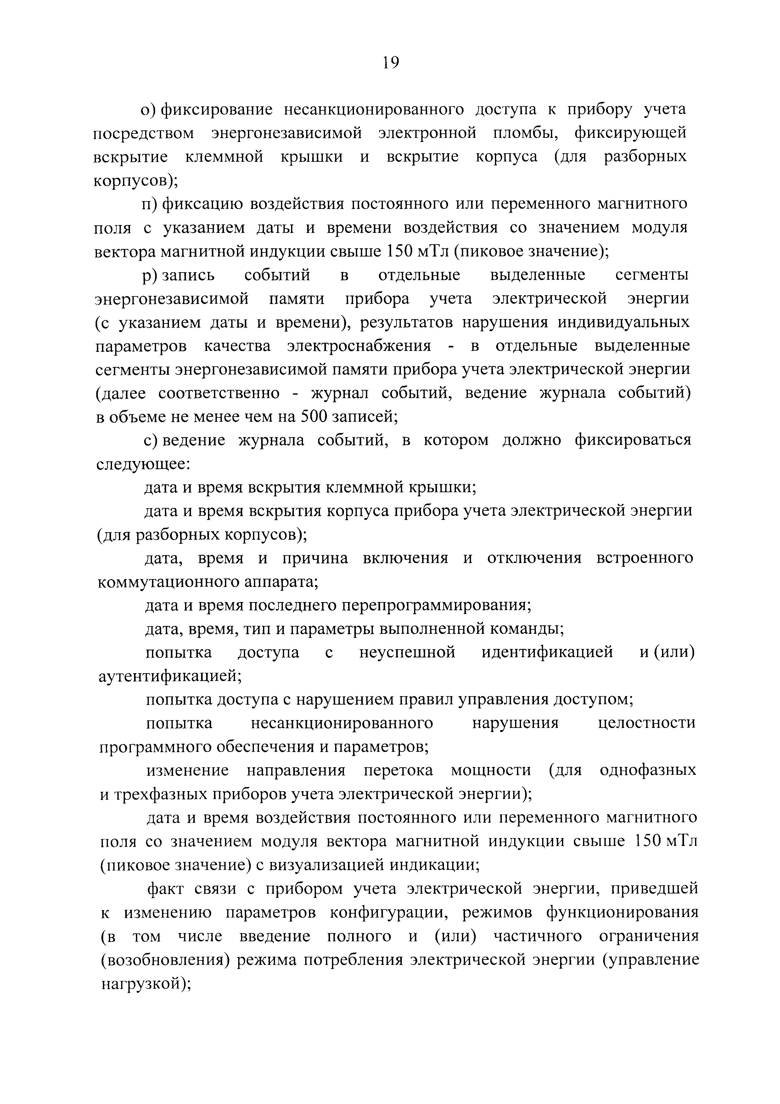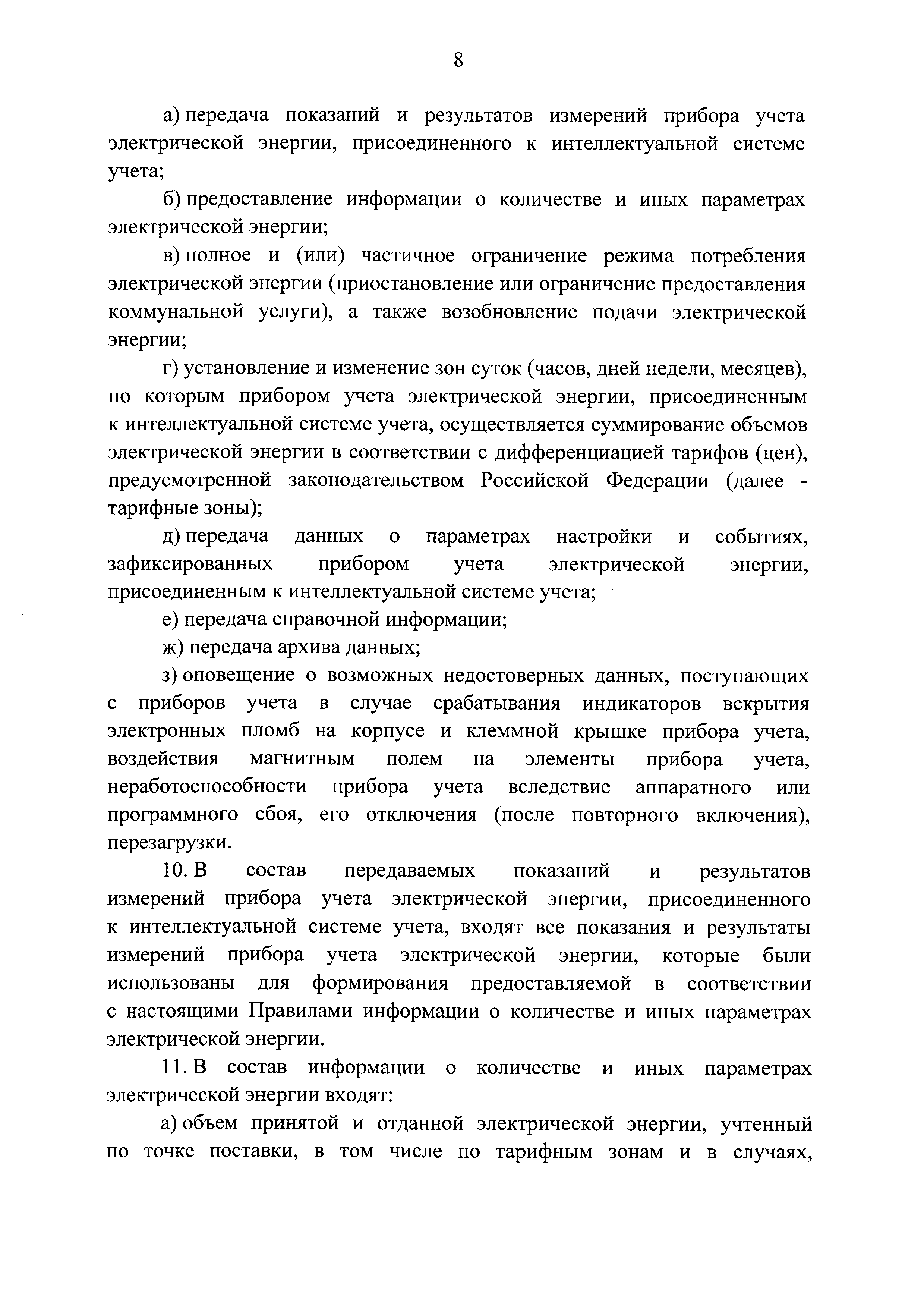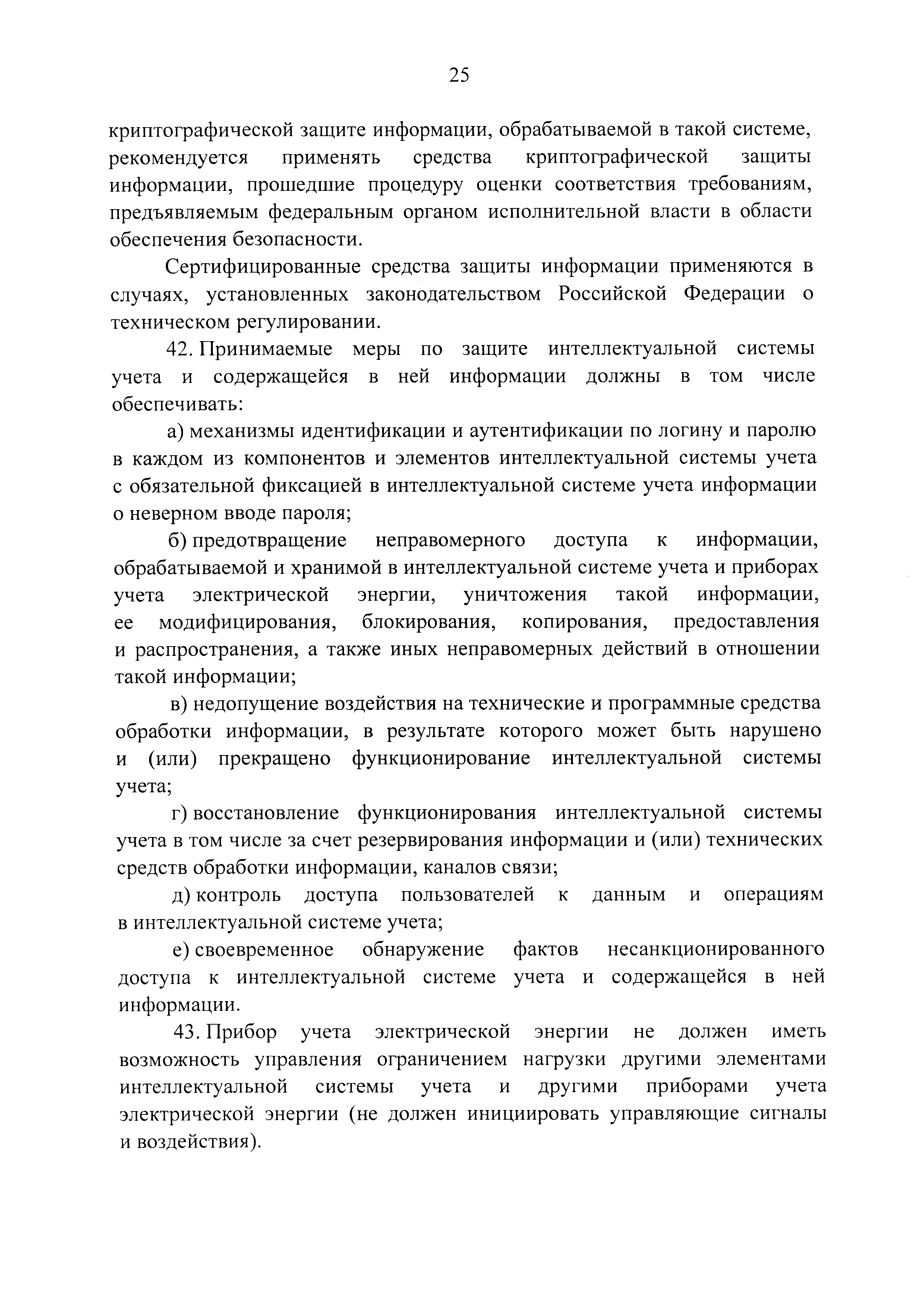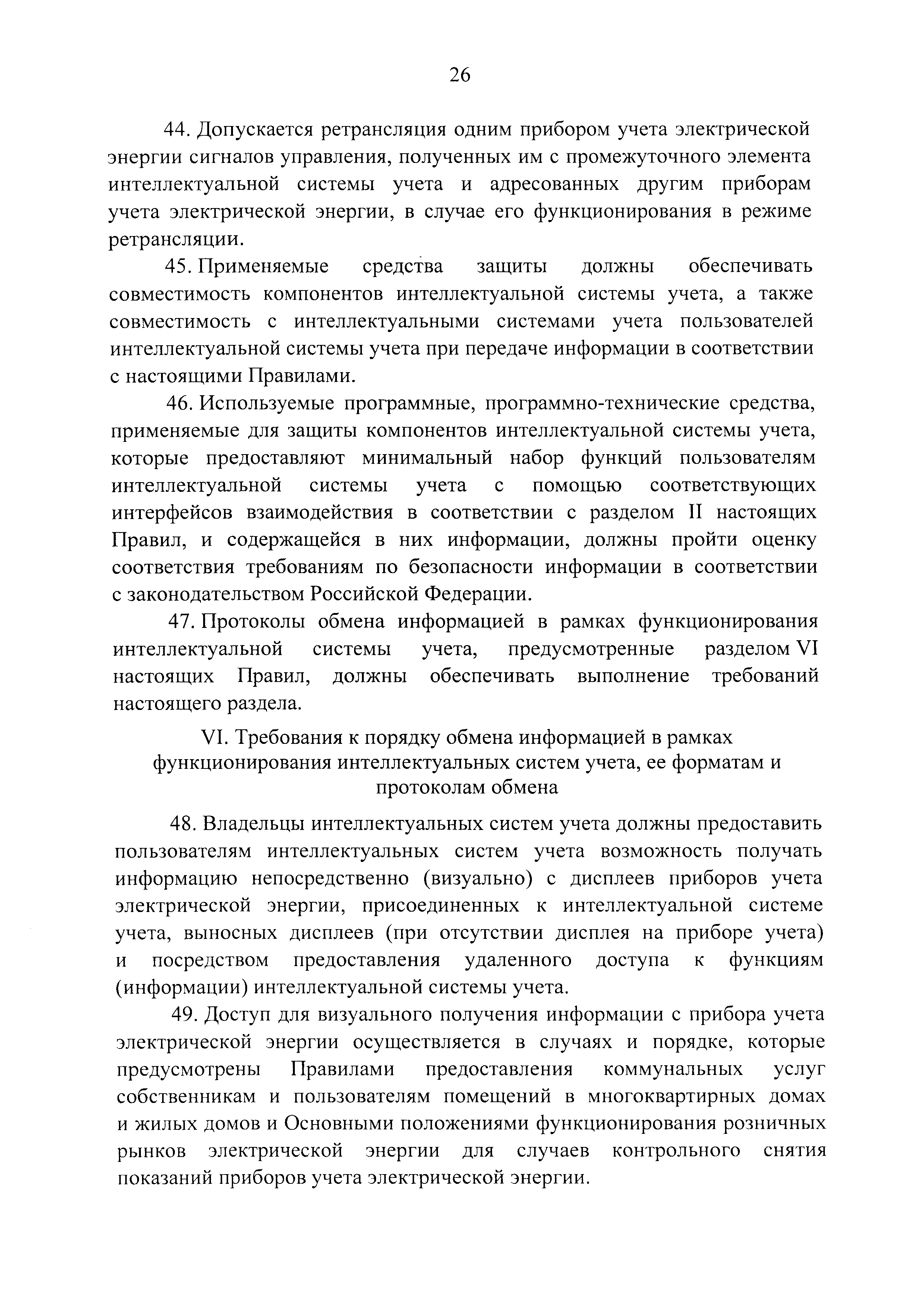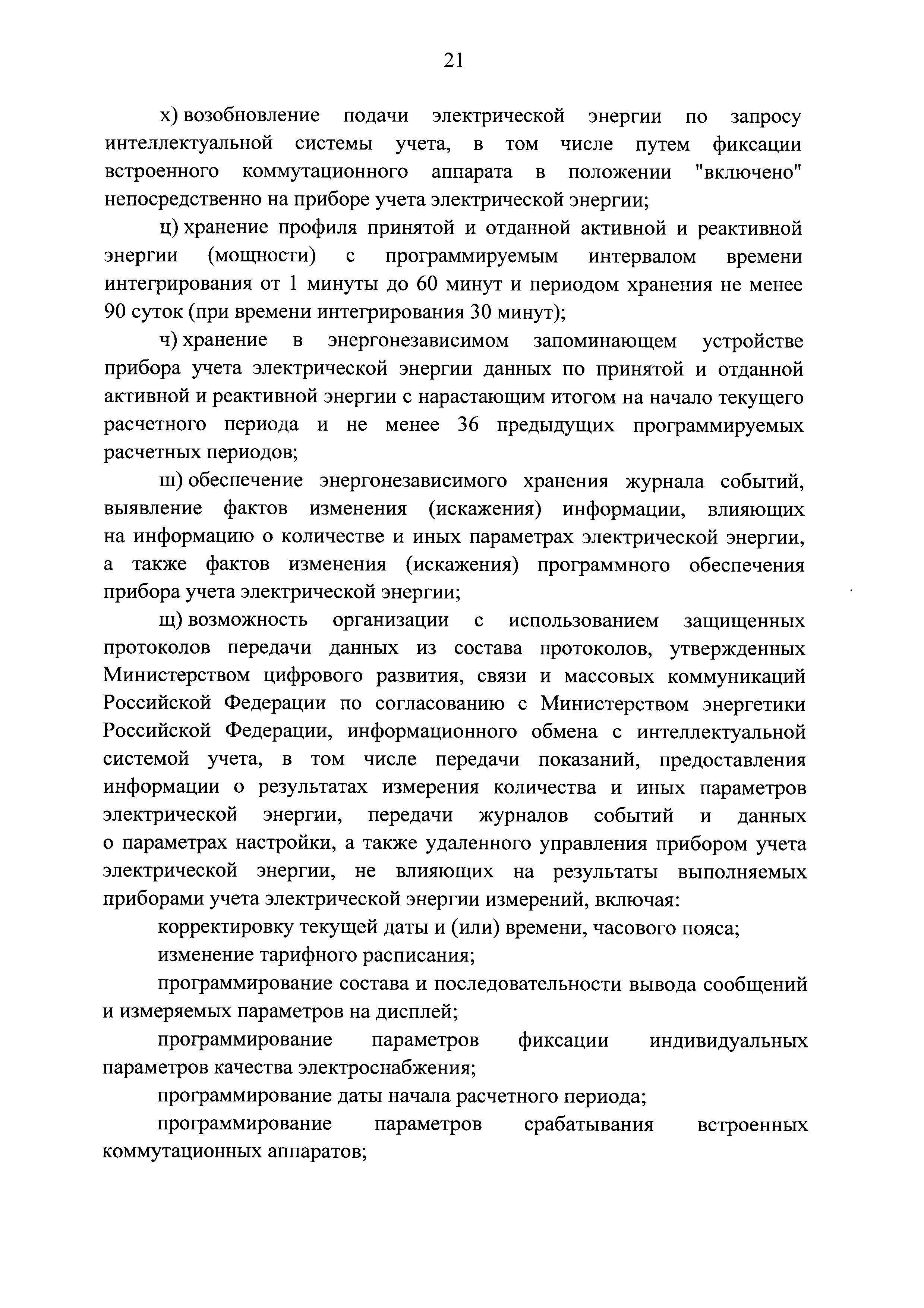 | Оглавление: | I. Общие принципы предоставления минимального набора функций интеллектуальной системы учета электрической энергии (мощности) II. Перечень функций интеллектуальной системы учета и требования к ним III. Перечень функций приборов учета электрической энергии, которые могут быть присоединены к интеллектуальной системе учета, и требования к ним IV. Правила присоединения приборов учета электрической энергии к интеллектуальной системе учета и предоставления доступа к функциям такой системы V. Требования по защите информации, размещаемой в интеллектуальной системе учета, от несанкционированного доступа к ней при ее сборе, передаче и хранении VI. Требования к порядку обмена информацией в рамках функционирования интеллектуальных систем учета, ее форматам и протоколам обмена |