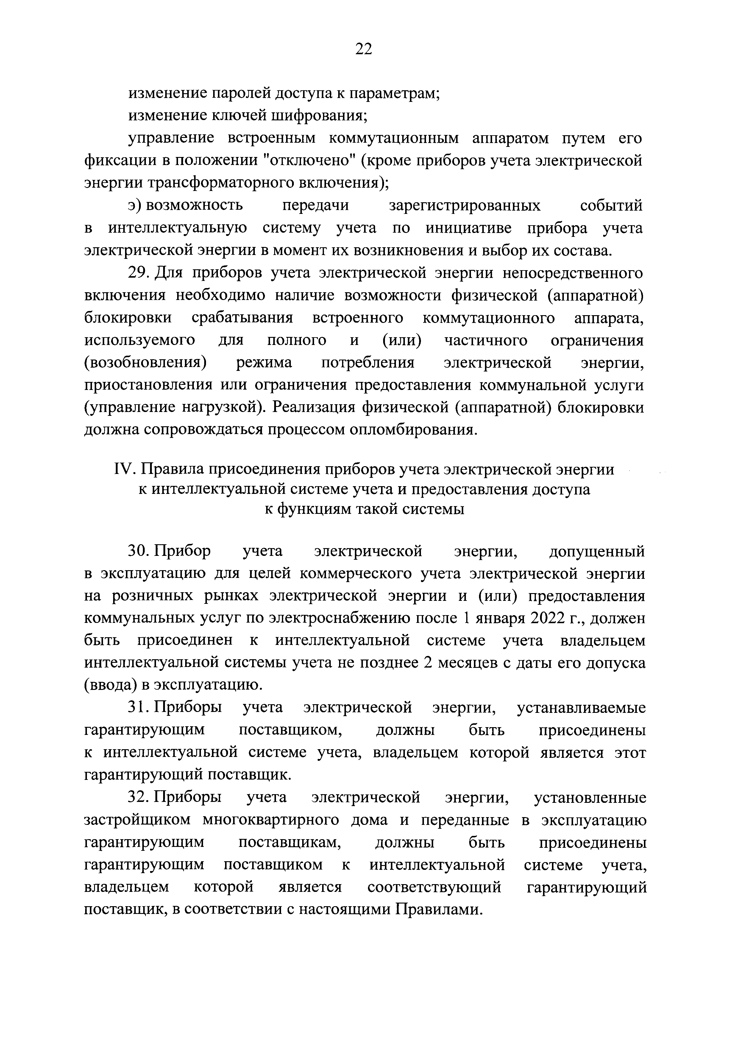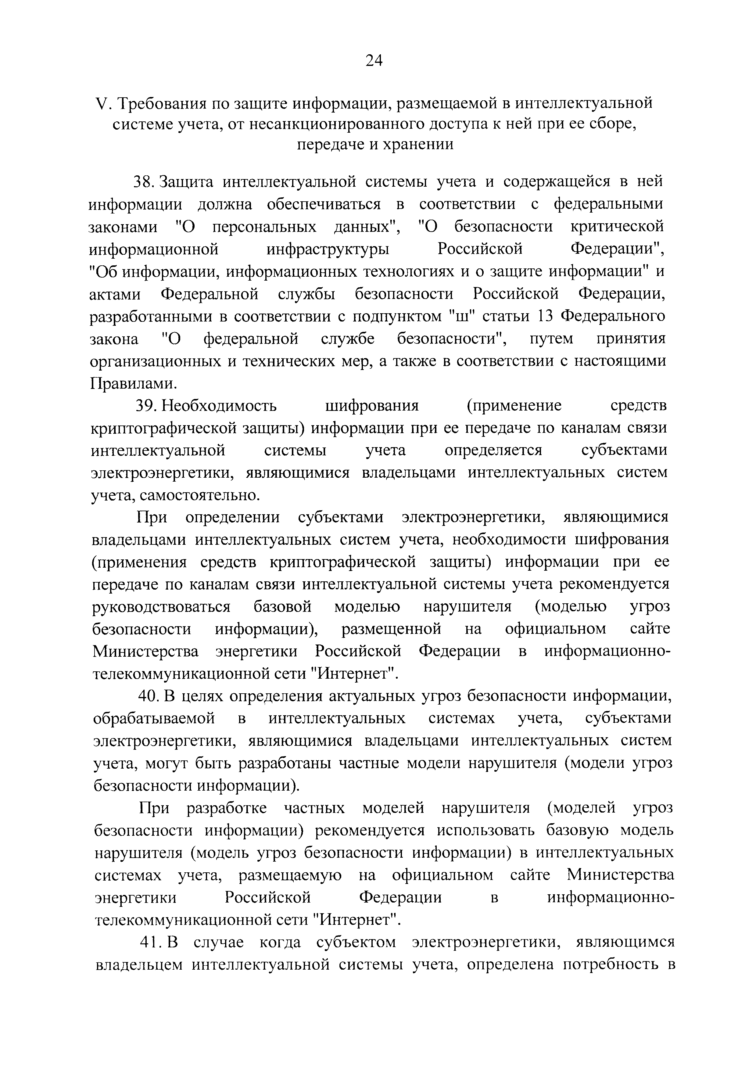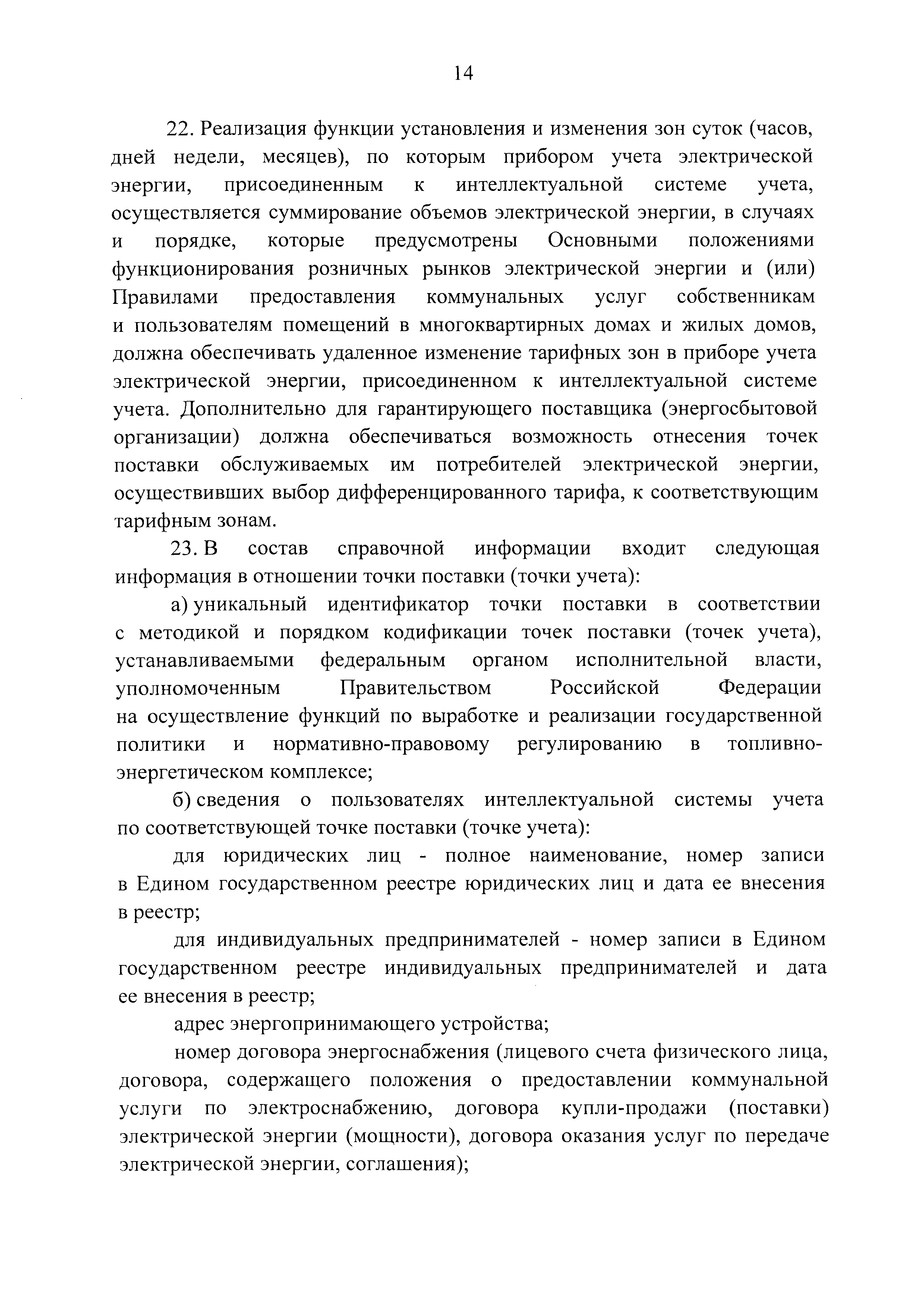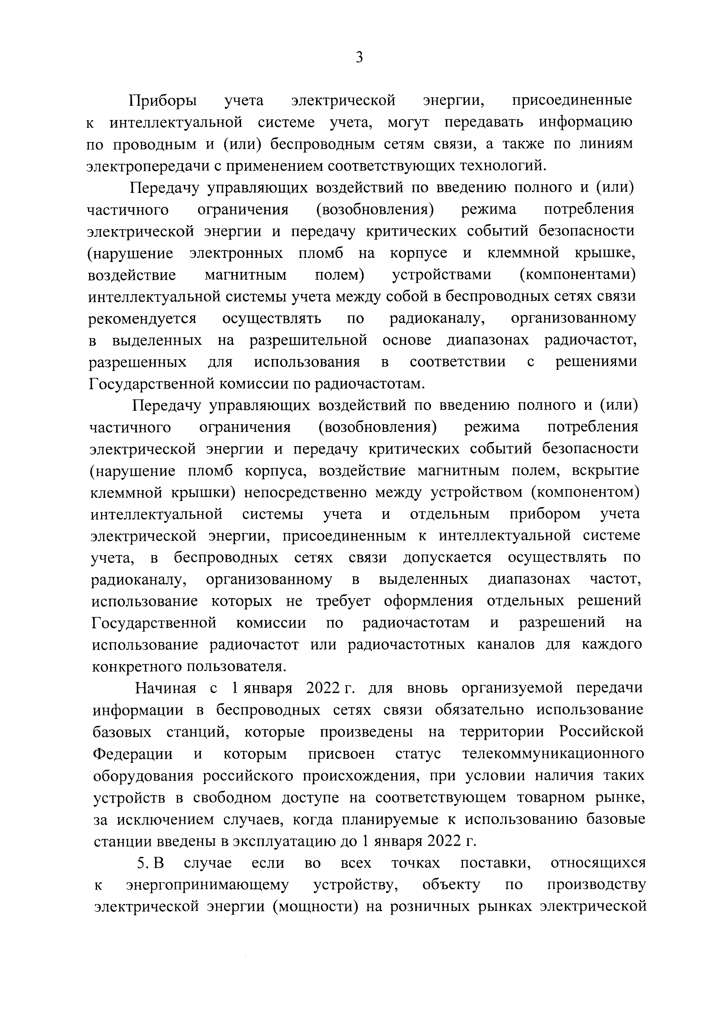 | Оглавление: | I. Общие принципы предоставления минимального набора функций интеллектуальной системы учета электрической энергии (мощности) II. Перечень функций интеллектуальной системы учета и требования к ним III. Перечень функций приборов учета электрической энергии, которые могут быть присоединены к интеллектуальной системе учета, и требования к ним IV. Правила присоединения приборов учета электрической энергии к интеллектуальной системе учета и предоставления доступа к функциям такой системы V. Требования по защите информации, размещаемой в интеллектуальной системе учета, от несанкционированного доступа к ней при ее сборе, передаче и хранении VI. Требования к порядку обмена информацией в рамках функционирования интеллектуальных систем учета, ее форматам и протоколам обмена |