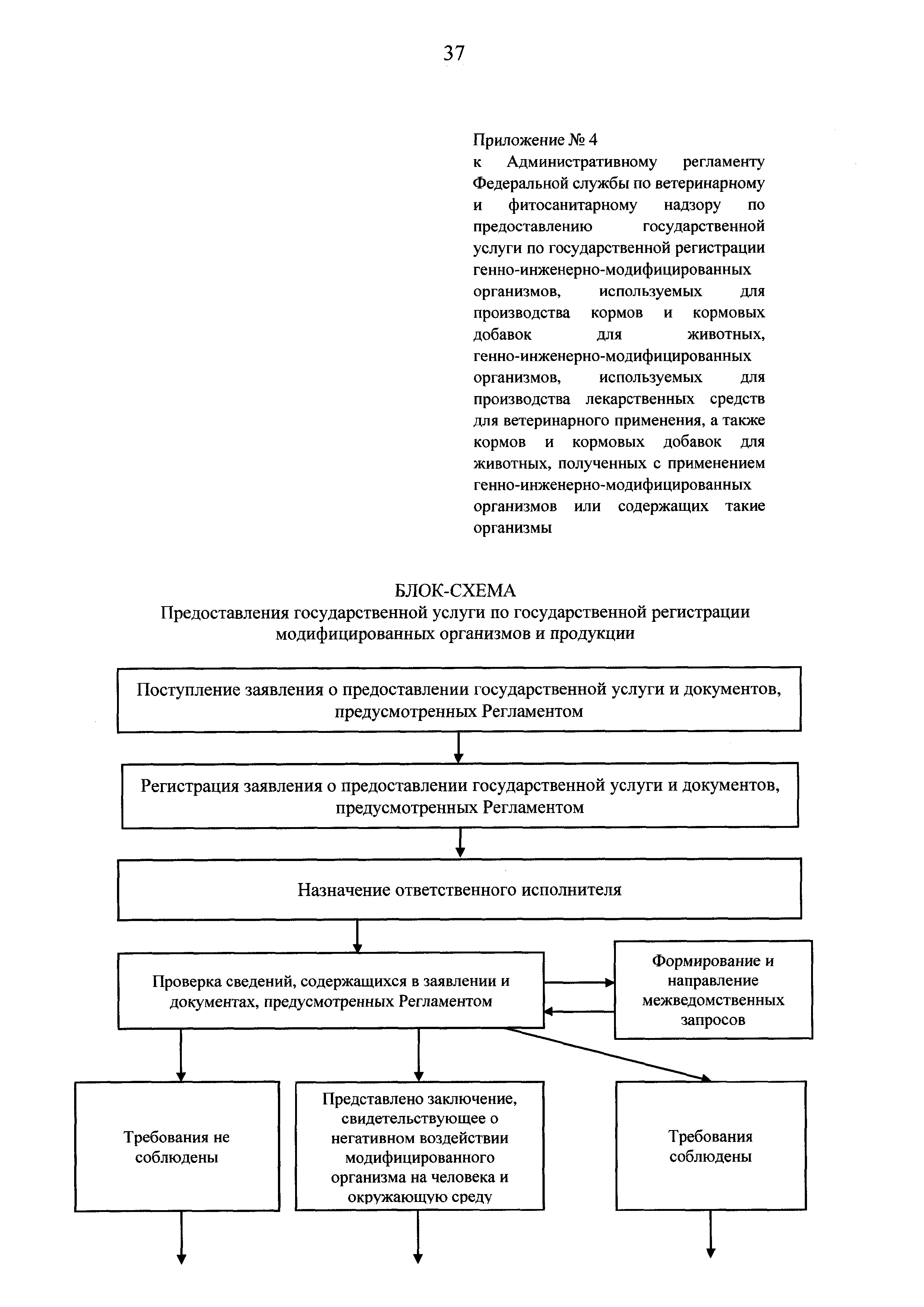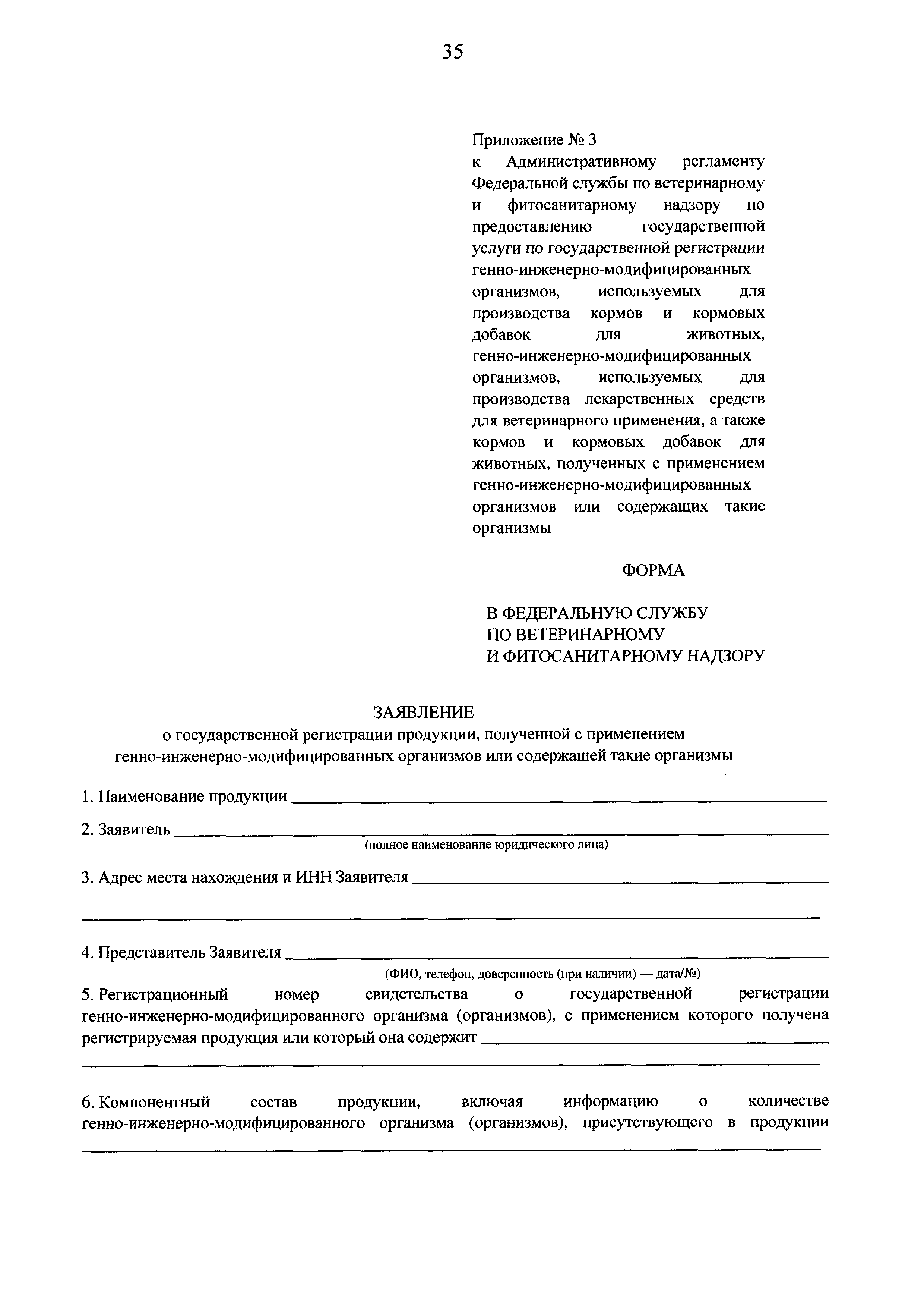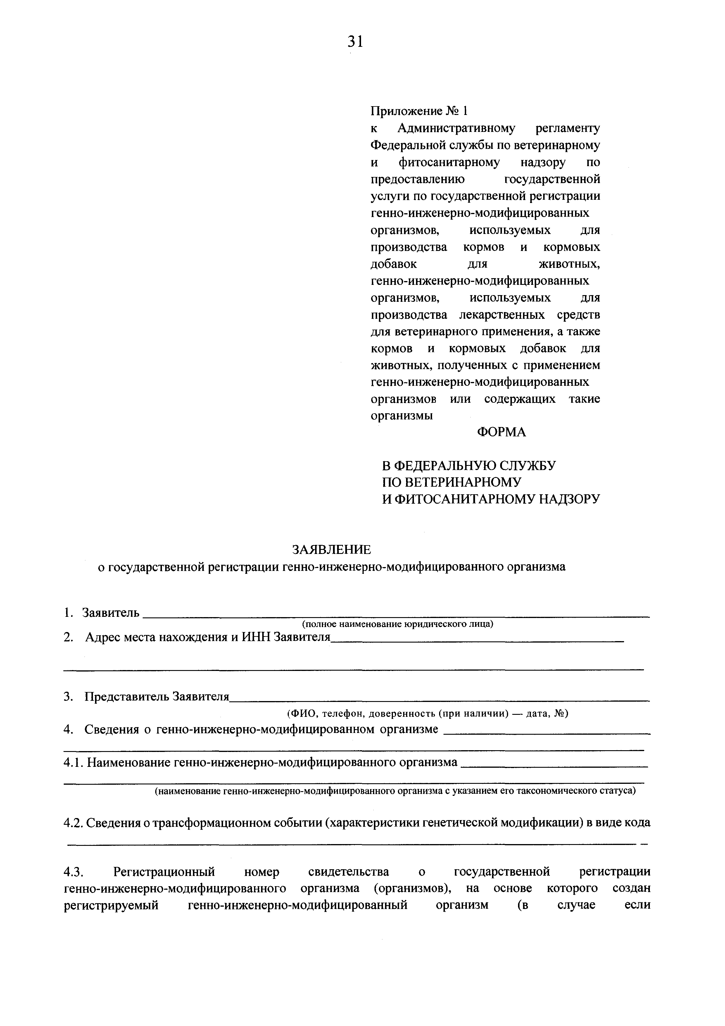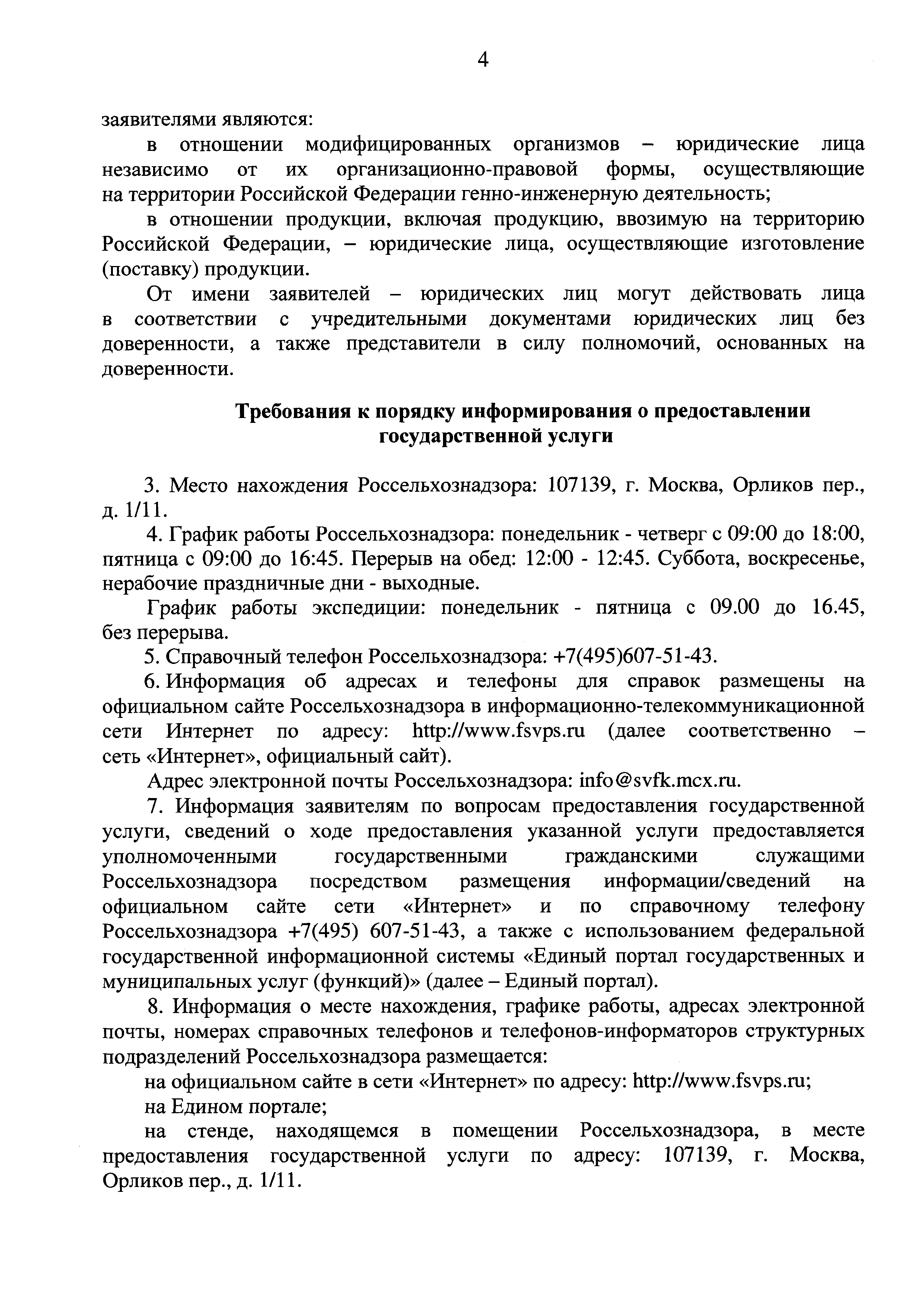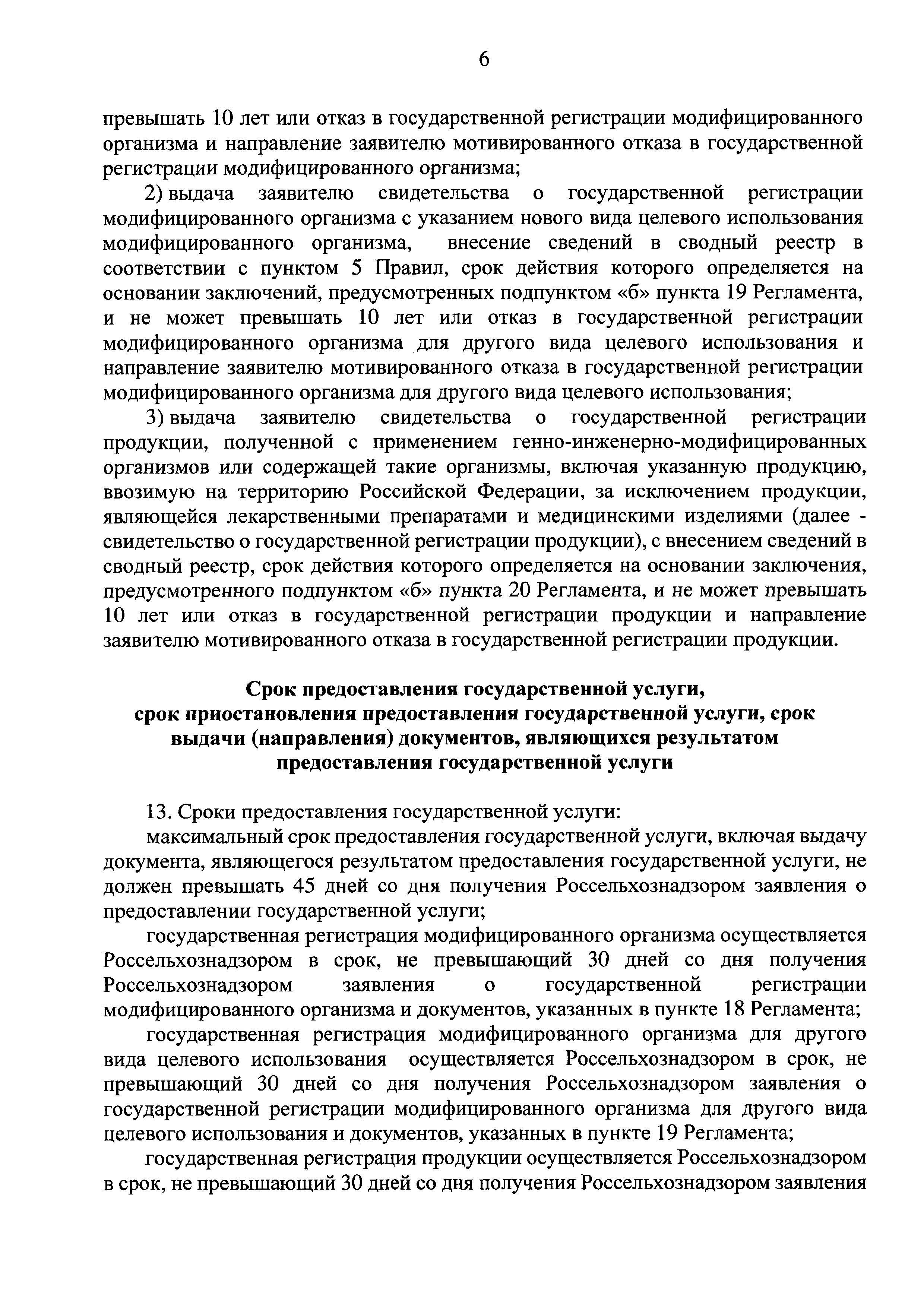 | Оглавление: | I. Общие положения II. Стандарт предоставления государственной услуги III. Состав, последовательность и сроки выполнения административных процедур (действий), требования к порядку их выполнения, в том числе особенности выполнения административных процедур (действий) в электронной форме IV. Формы контроля за исполнением Регламента V. Досудебный (внесудебный) порядок обжалования решений и действий (бездействия) Россельхознадзора, а также его должностных лиц Приложение № 1. Форма заявления о государственной регистрации генно-инженерно-модифицированного организма Приложение № 2. Форма заявления о государственной регистрации генно-инженерно-модифицированного организма, зарегистрированного для определенного вида целевого использования, для другого вида целевого использования Приложение № 3. Форма заявления о государственной регистрации продукции, полученной с применением генно-инженерно-модифицированных организмов или содержащей такие организмы Приложение № 4. Блок-схема предоставления государственной услуги по государственной регистрации модифицированных организмов и продукции |