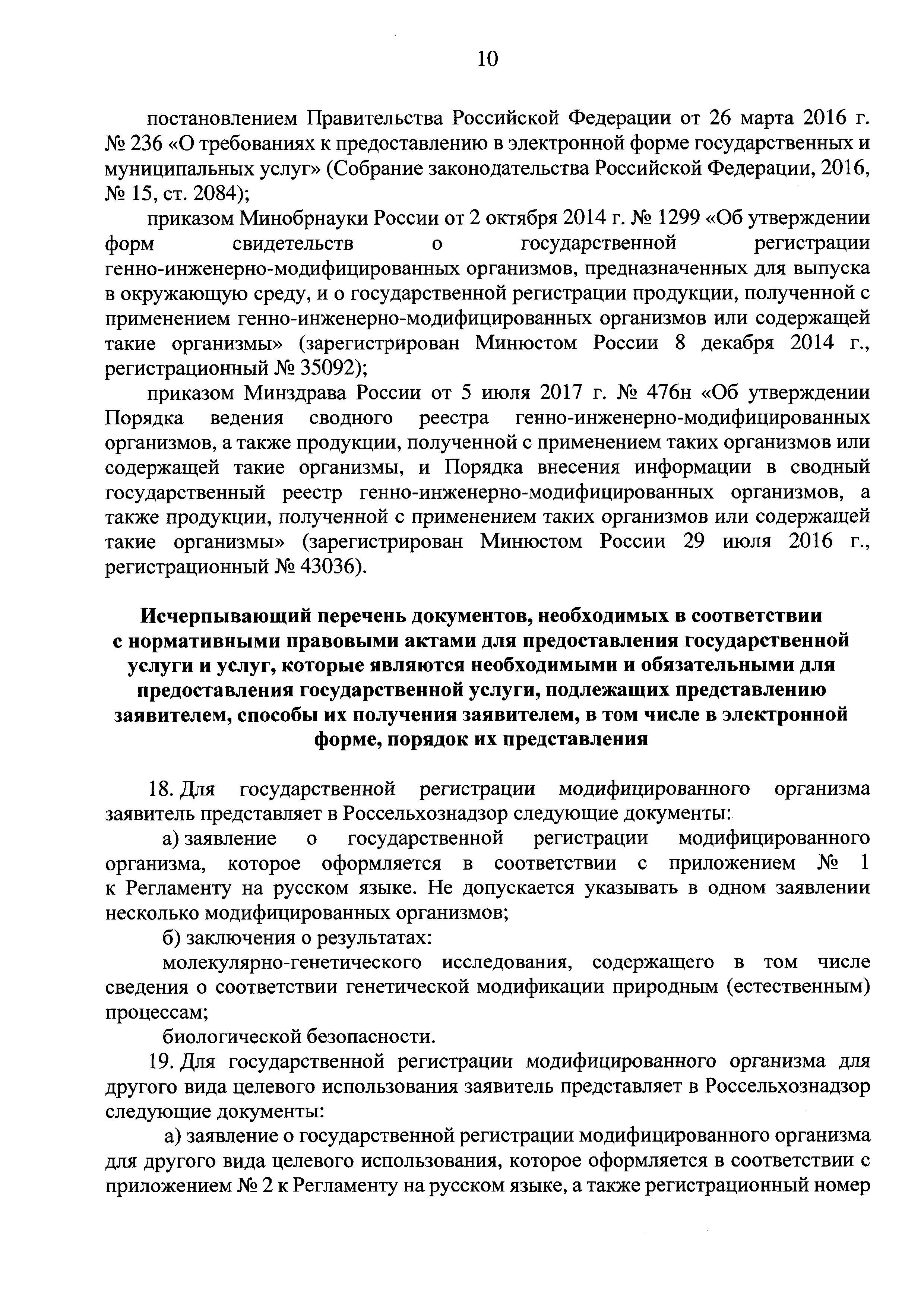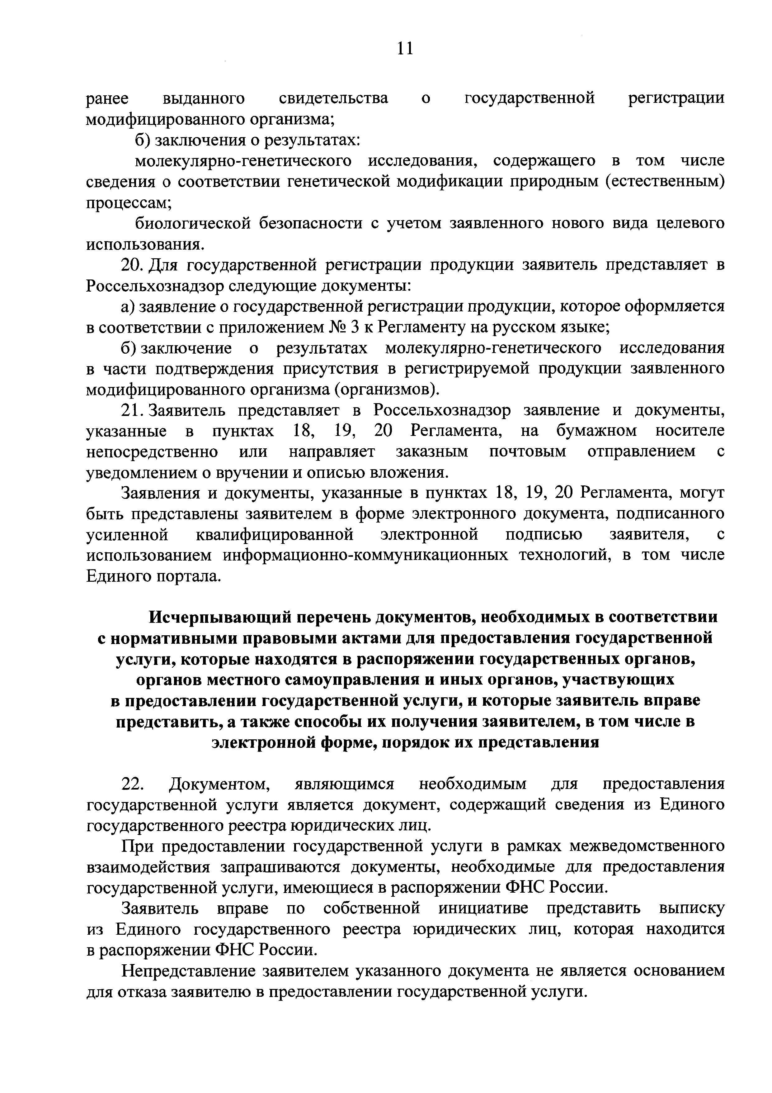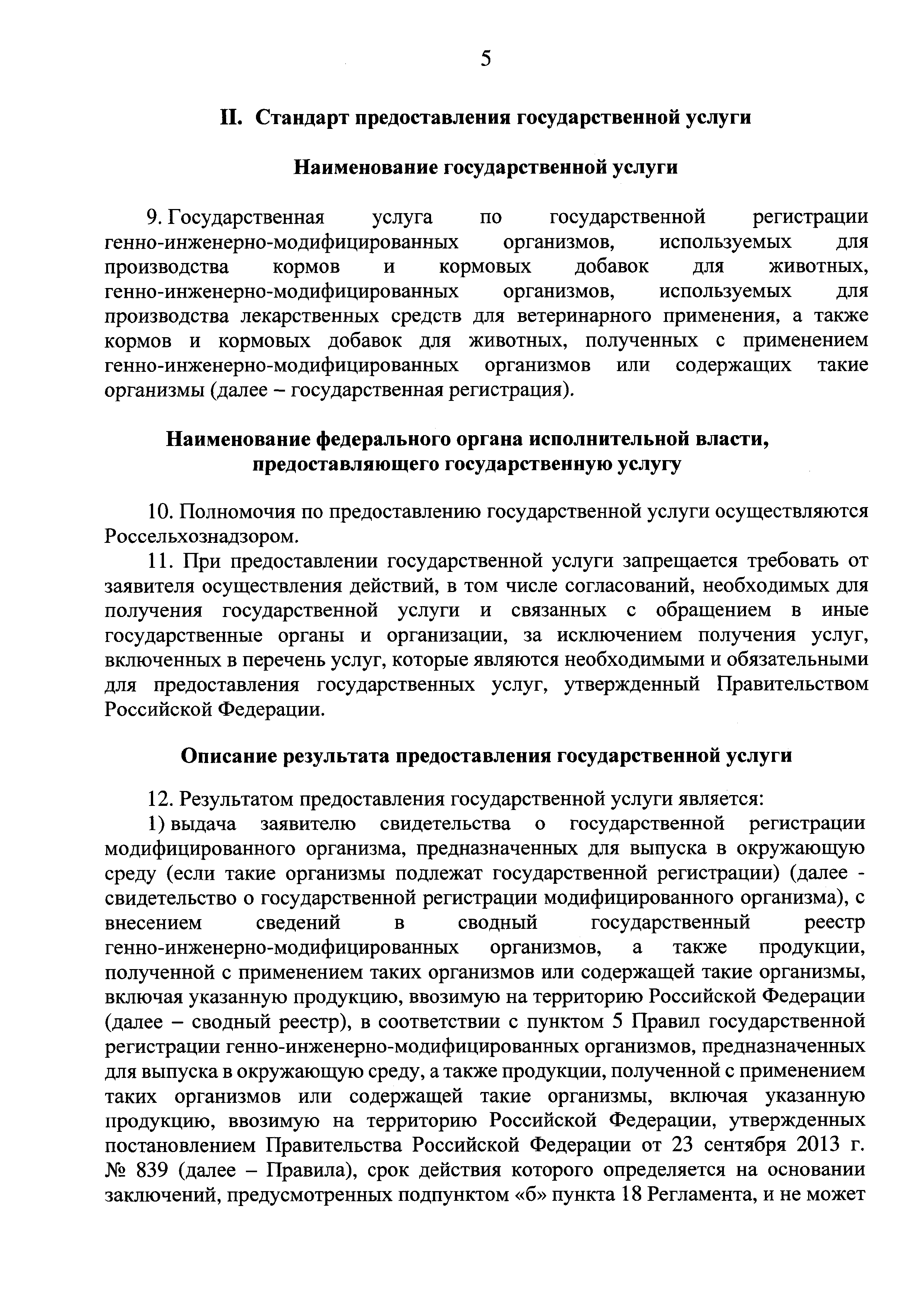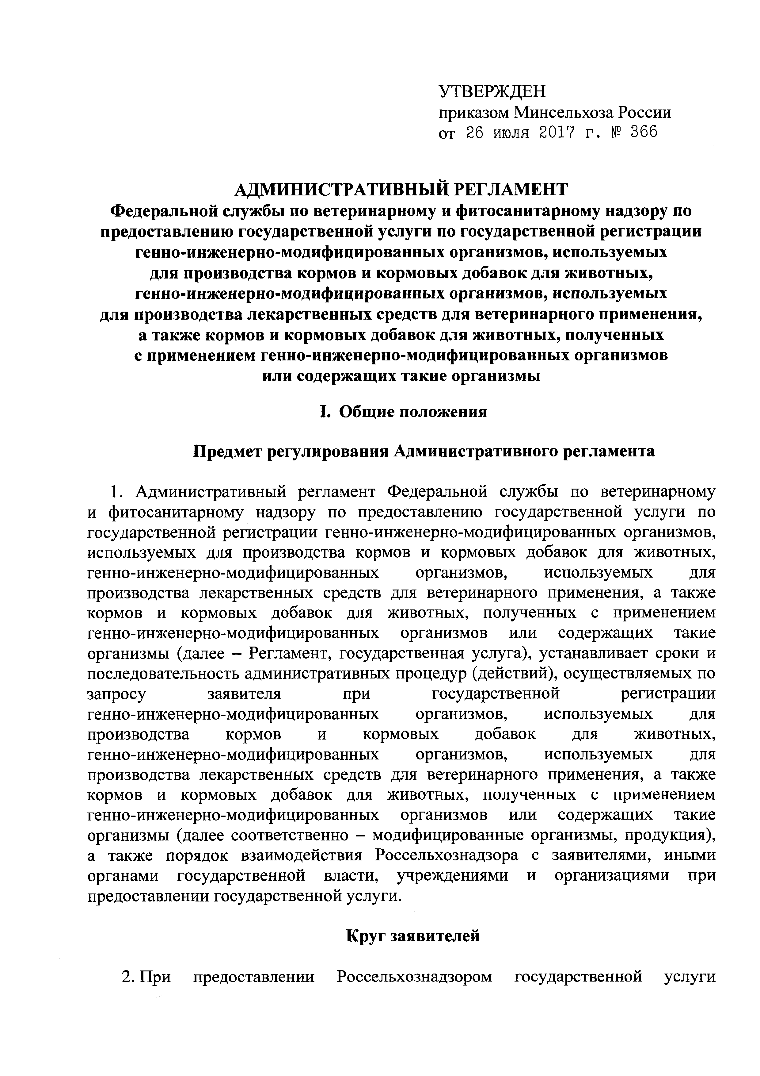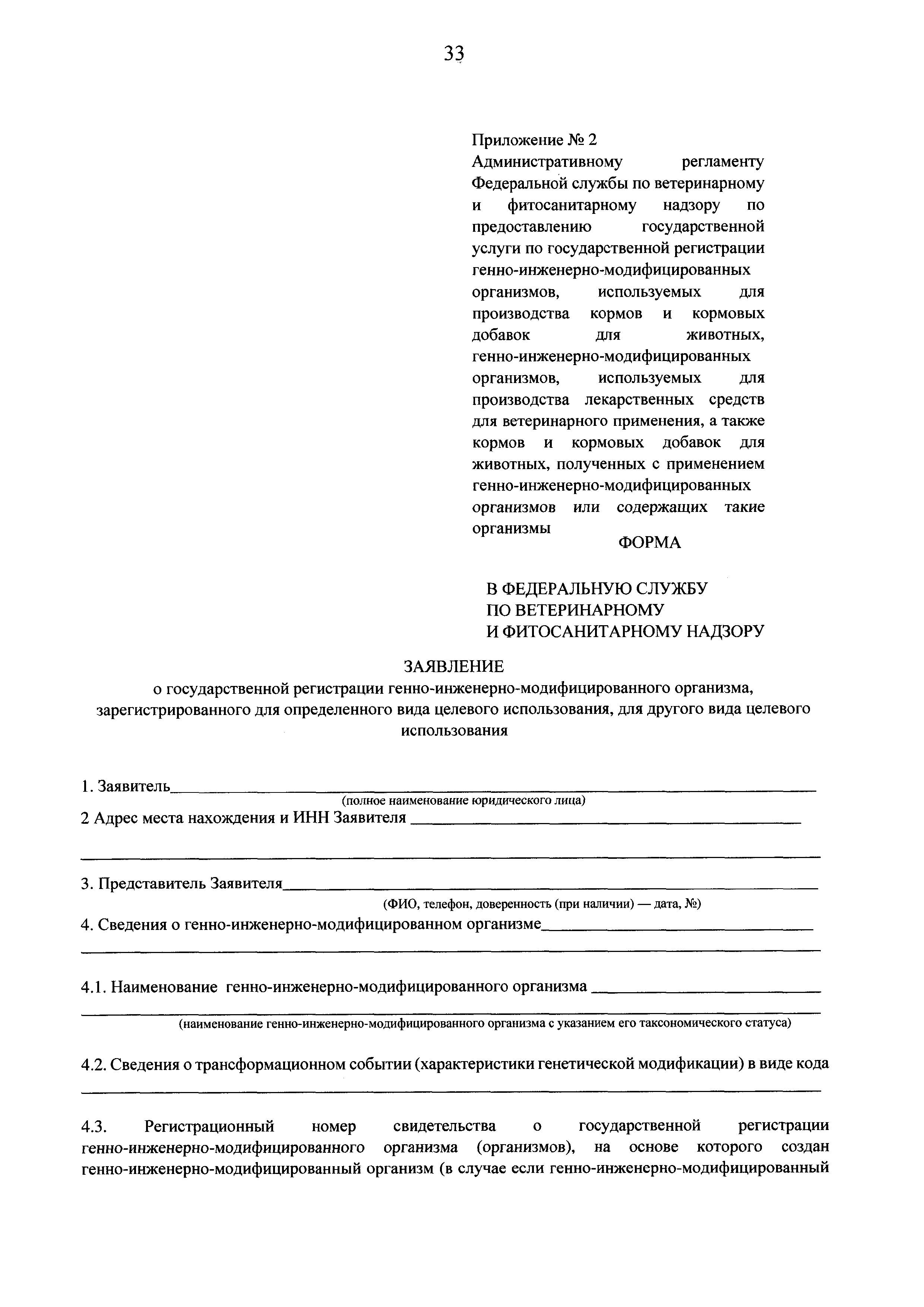 | Оглавление: | I. Общие положения II. Стандарт предоставления государственной услуги III. Состав, последовательность и сроки выполнения административных процедур (действий), требования к порядку их выполнения, в том числе особенности выполнения административных процедур (действий) в электронной форме IV. Формы контроля за исполнением Регламента V. Досудебный (внесудебный) порядок обжалования решений и действий (бездействия) Россельхознадзора, а также его должностных лиц Приложение № 1. Форма заявления о государственной регистрации генно-инженерно-модифицированного организма Приложение № 2. Форма заявления о государственной регистрации генно-инженерно-модифицированного организма, зарегистрированного для определенного вида целевого использования, для другого вида целевого использования Приложение № 3. Форма заявления о государственной регистрации продукции, полученной с применением генно-инженерно-модифицированных организмов или содержащей такие организмы Приложение № 4. Блок-схема предоставления государственной услуги по государственной регистрации модифицированных организмов и продукции |