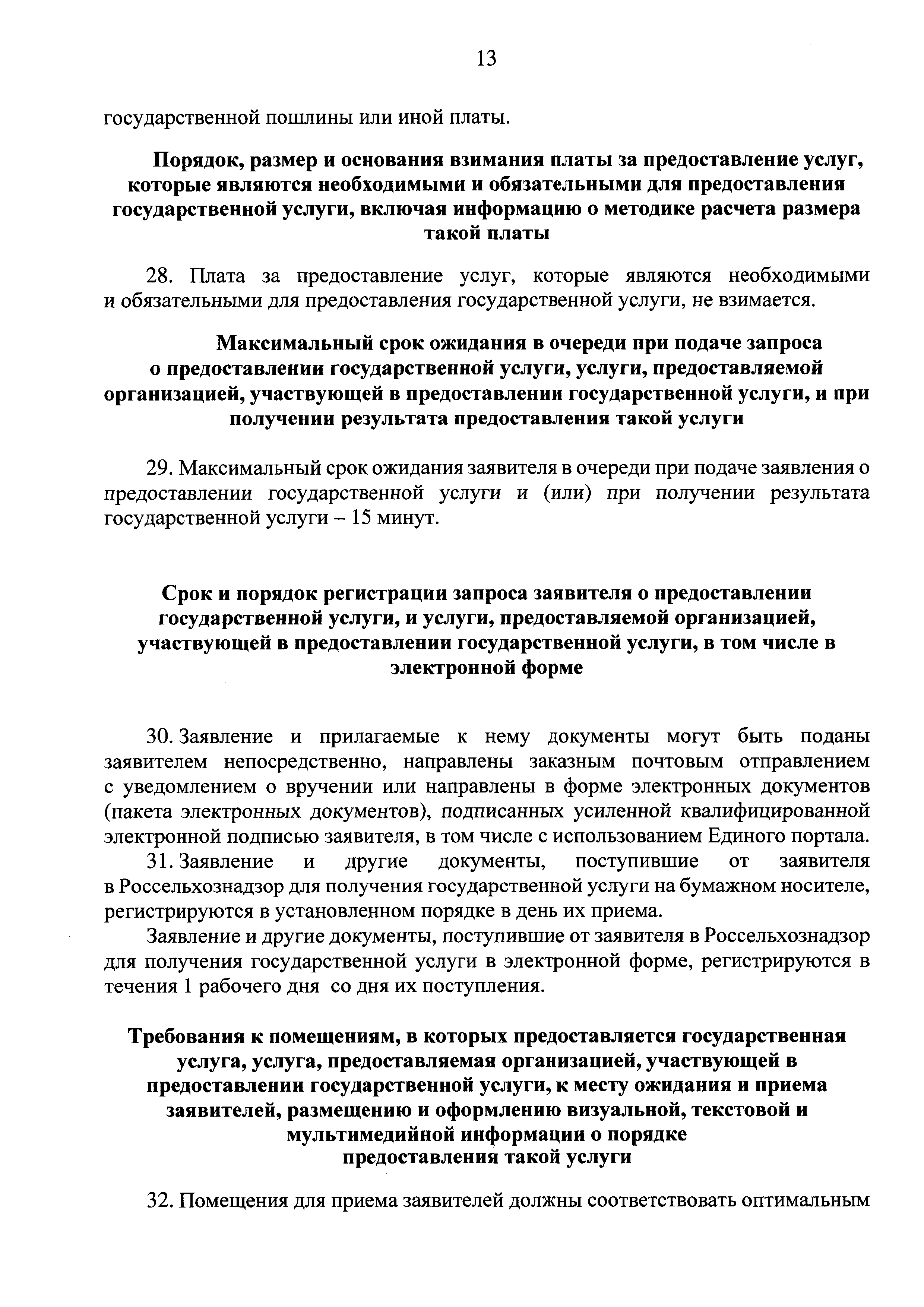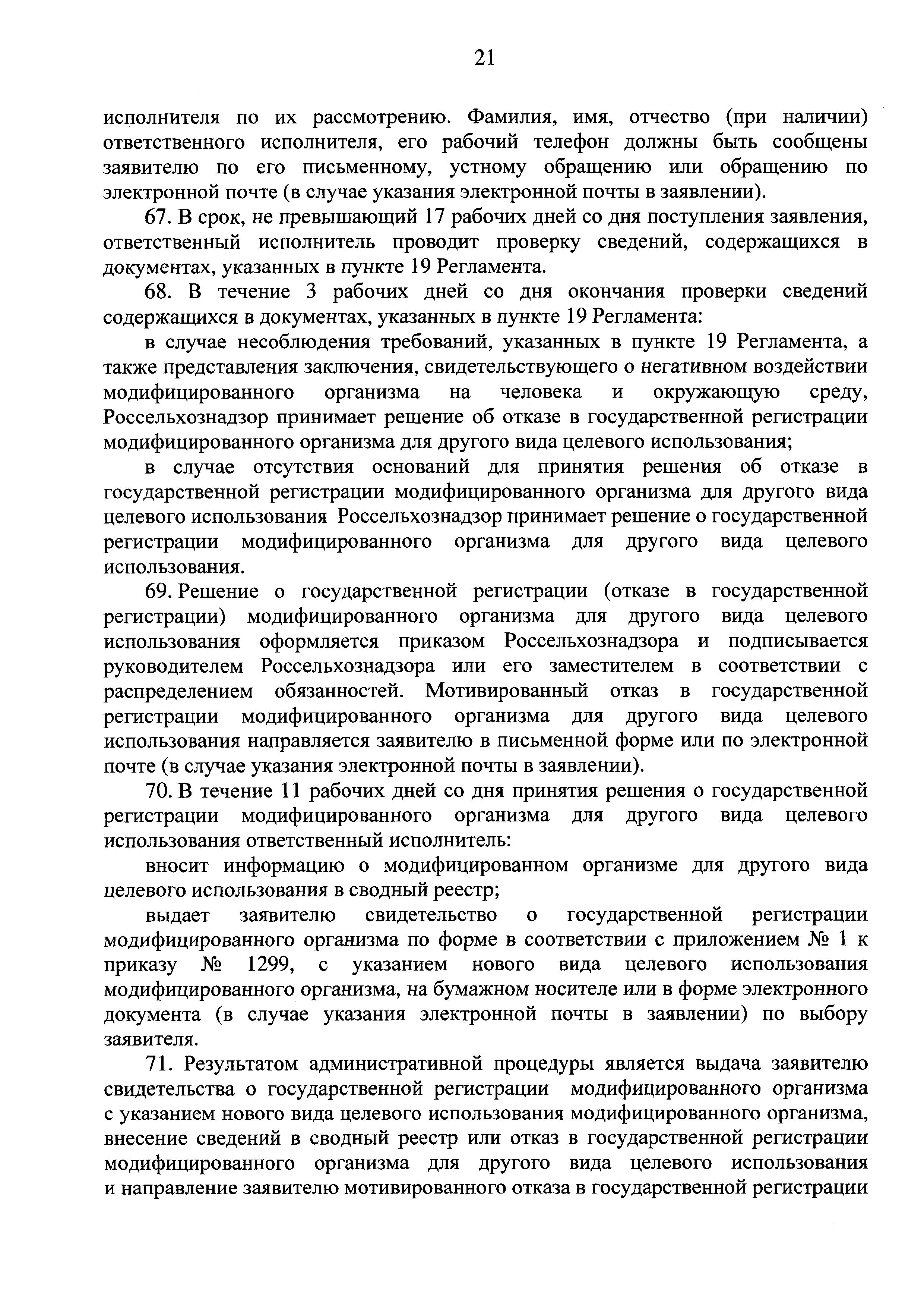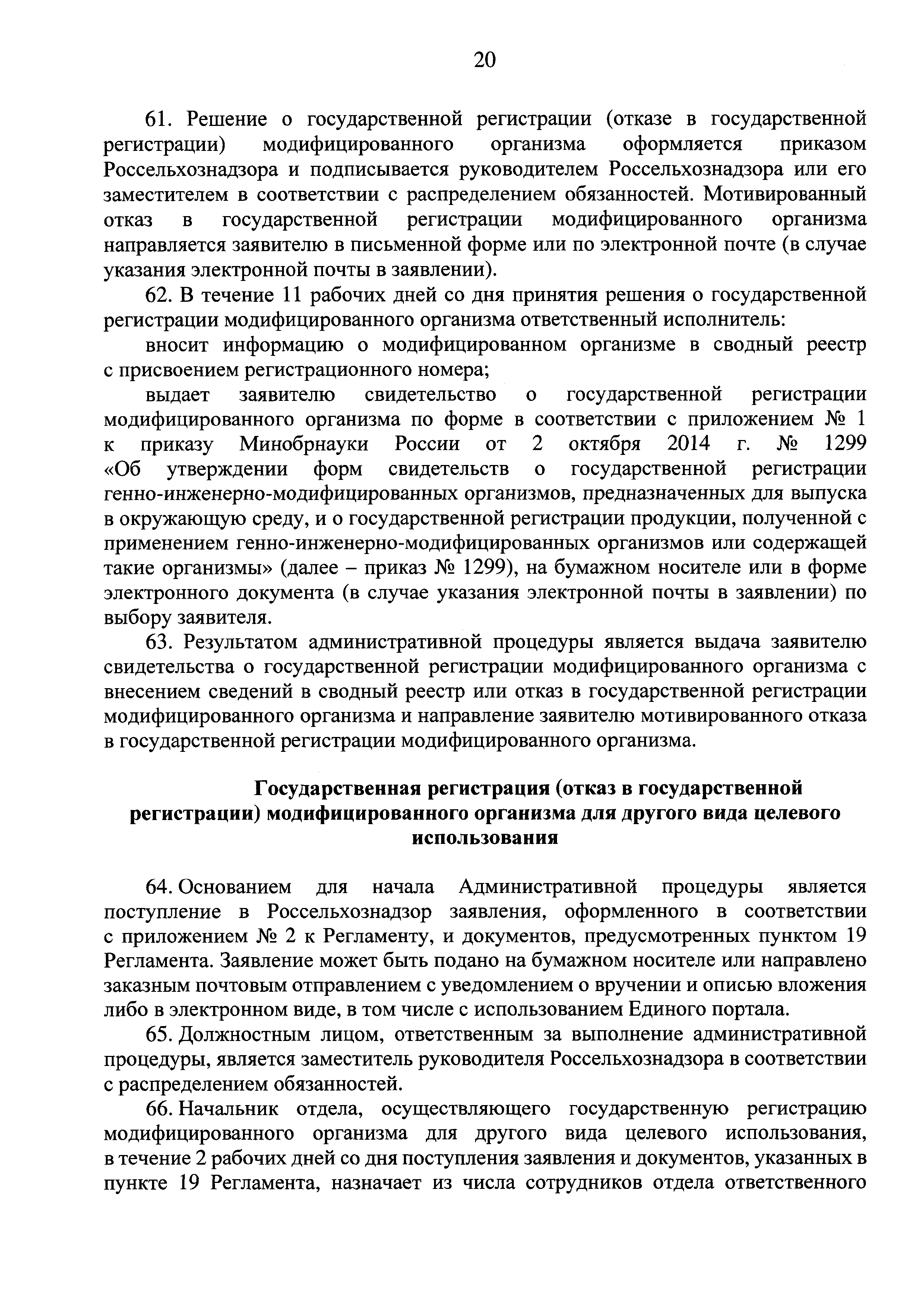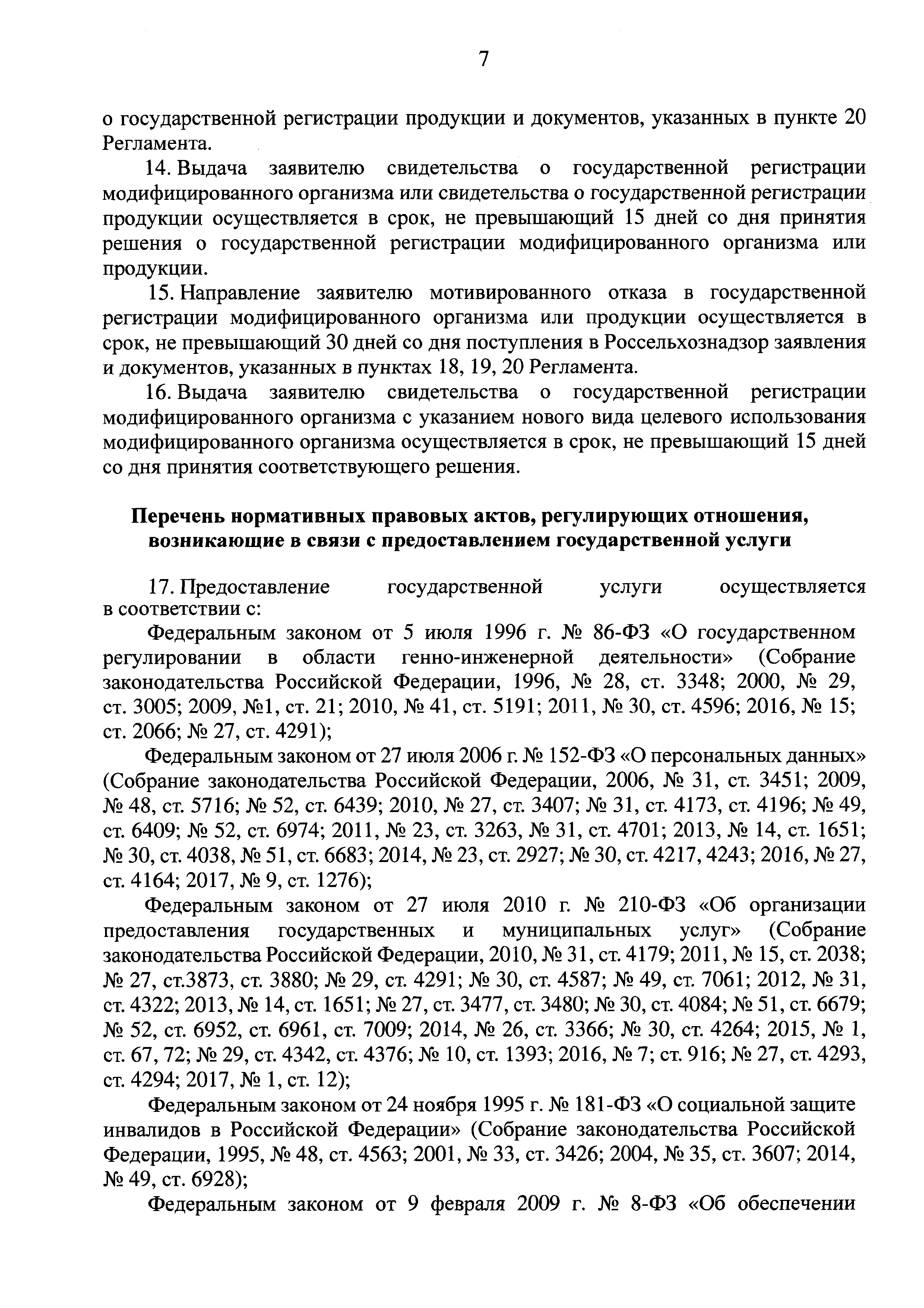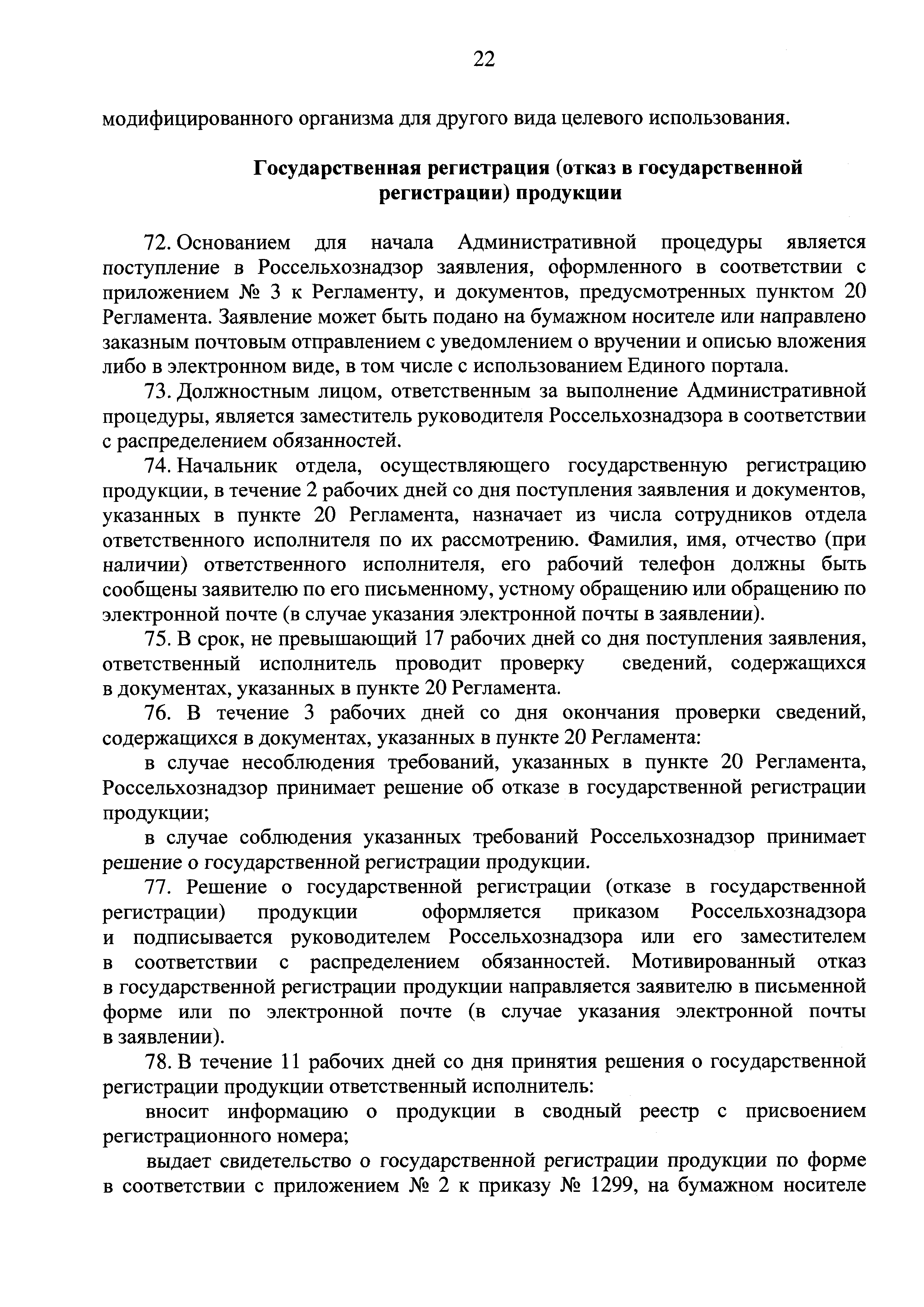 | Оглавление: | I. Общие положения II. Стандарт предоставления государственной услуги III. Состав, последовательность и сроки выполнения административных процедур (действий), требования к порядку их выполнения, в том числе особенности выполнения административных процедур (действий) в электронной форме IV. Формы контроля за исполнением Регламента V. Досудебный (внесудебный) порядок обжалования решений и действий (бездействия) Россельхознадзора, а также его должностных лиц Приложение № 1. Форма заявления о государственной регистрации генно-инженерно-модифицированного организма Приложение № 2. Форма заявления о государственной регистрации генно-инженерно-модифицированного организма, зарегистрированного для определенного вида целевого использования, для другого вида целевого использования Приложение № 3. Форма заявления о государственной регистрации продукции, полученной с применением генно-инженерно-модифицированных организмов или содержащей такие организмы Приложение № 4. Блок-схема предоставления государственной услуги по государственной регистрации модифицированных организмов и продукции |