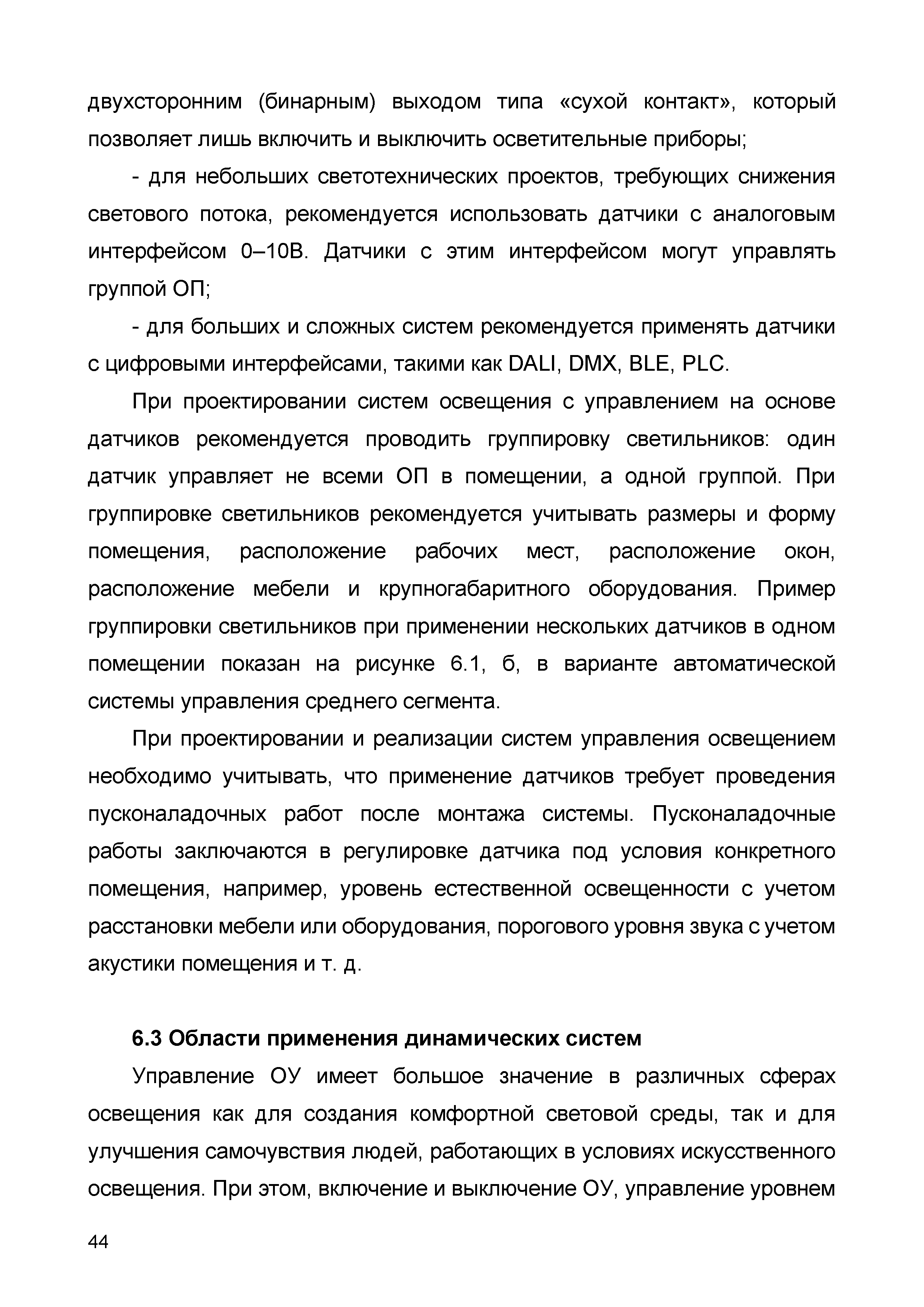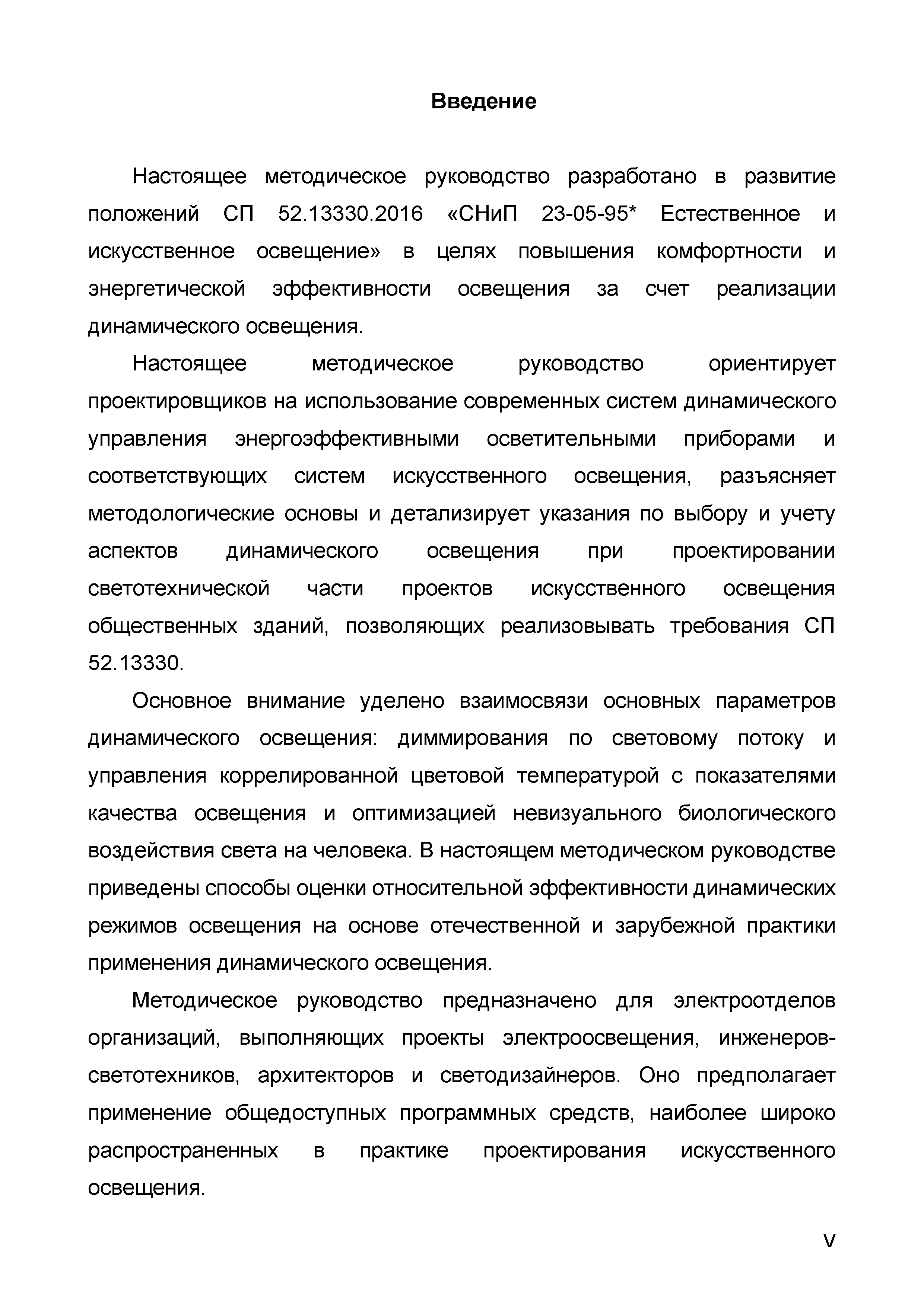 | Область применения: | Методическое руководство распространяется на проектирование искусственного динамического освещения общественных зданий различного назначения. Руководство ориентировано для применения при проектировании осветительных установок динамического освещения на базе светодиодных светильников. Методическое руководство ориентирует проектировщиков на использование современных систем динамического управления энергоэффективными осветительными приборами и соответствующих систем искусственного освещения, разъясняет методологические основы и детализирует указания по выбору и учету аспектов динамического освещения при проектировании светотехнической части проектов искусственного освещения общественных зданий, позволяющих реализовывать требования СП 52.13330.2016. Методическое руководство предназначено для электроотделов организаций, выполняющих проекты электроосвещения, инженеров-светотехников, архитекторов и светодизайнеров. Оно предполагает применение общедоступных программных средств, наиболее широко распространенных в практике проектирования искусственного освещения. |
