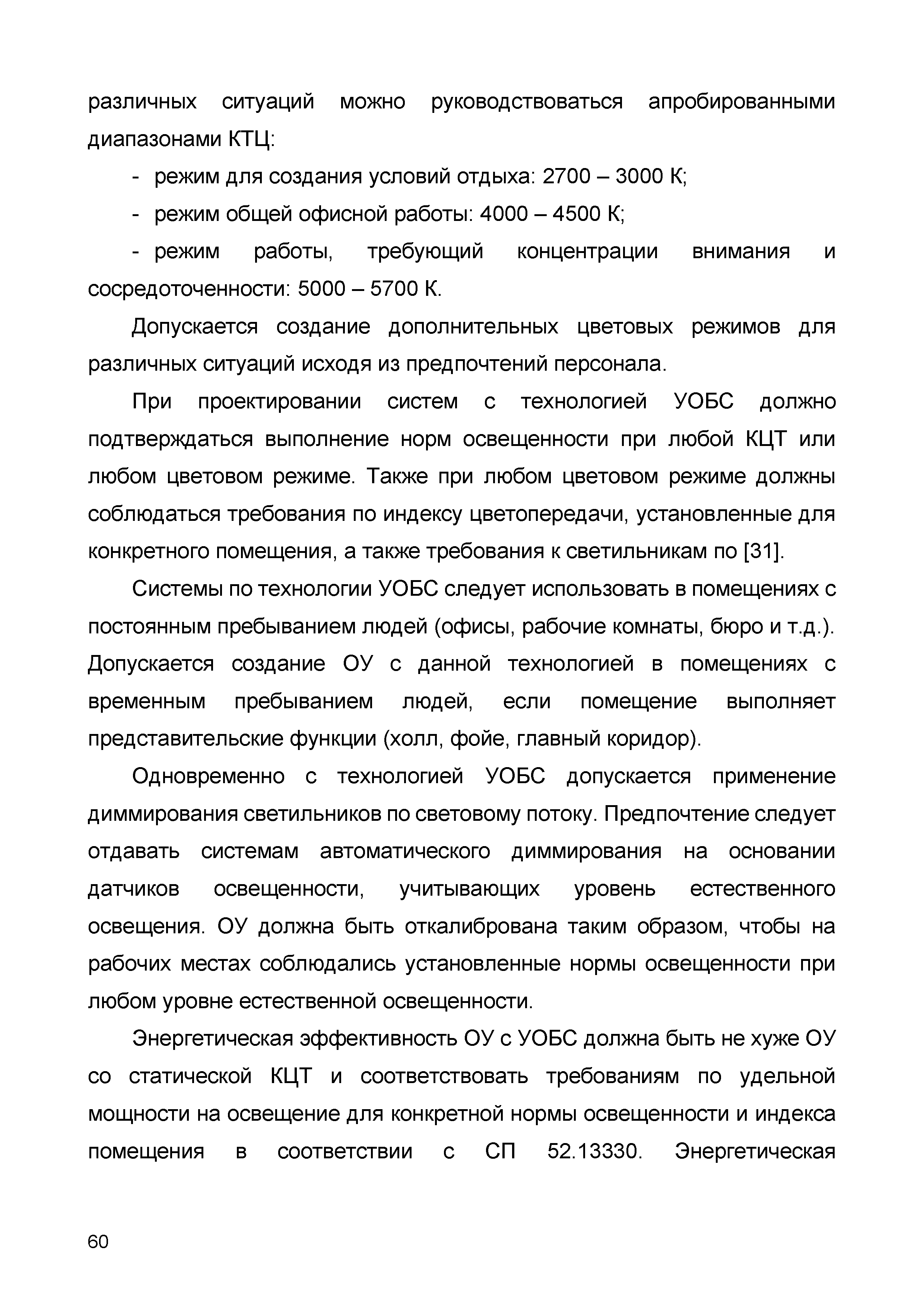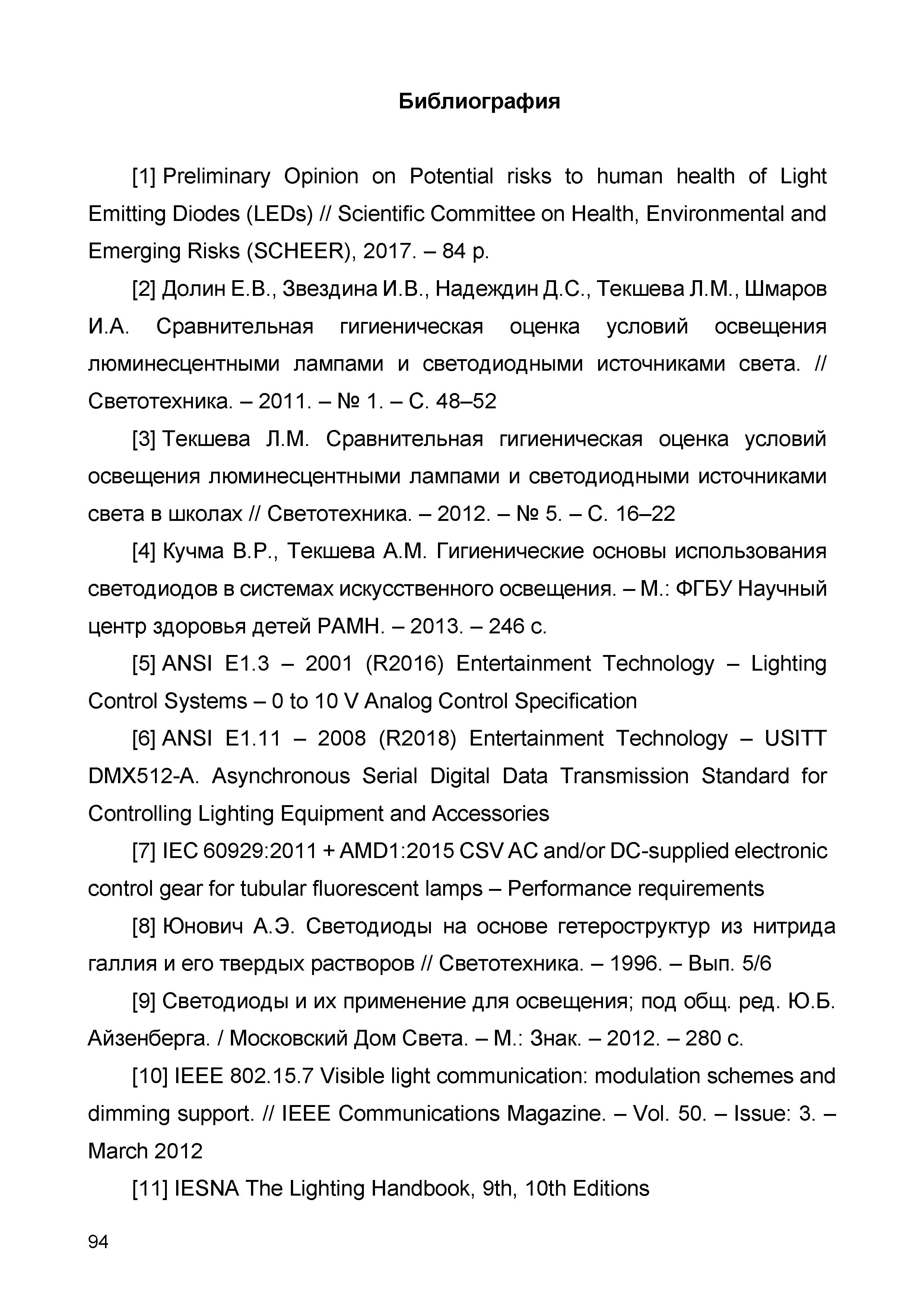 | Оглавление: | 1 Область применения 2 Нормативные ссылки 3 Термины, определения и сокращения 3.1 Термины и определения 3.2 Сокращения 4 Характеристики по спектру и динамическому управлению освещенности 4.1 Управление световым потоком светильника путем диммирования 4.2 Технология получения белого цвета с использованием светодиодных источников света 4.3 Спектральные характеристики светодиодных светильников управляемой цветностью 4.4 Технические характеристики светодиодных светильников управляемой цветностью 5 Методы управления осветительной установкой 5.1 Общие сведения 5.2 Варианты организации управления 5.3 Устройства управления освещением 6 Особенности проектирования динамического освещения освещенности 6.1 Общие сведения 6.2 Применение датчиков в системах освещения 6.3 Области применения динамических систем 6.4 Расчет сцен освещения с диммированием 7 Особенности проектирования динамического освещения по спектру 7.1 Общие сведения 7.2 Управление оттенками белого света 7.3 Световая среда, ориентированная на человека 8 Способы учета спектрального состава искусственного освещения 8.1 Концепция НСL 8.2 Количественная оценка биологического воздействия света по циркадной эффективности 8.3 Критерии невизуального воздействия света при проектировании искусственного освещения WELL стандарт 9 Оценка эффективности динамического освещения 9.1 Функциональное назначение осветительных установок с динамически изменяемыми характеристиками 9.2 Способы оценки эффективности применения динамического освещения для обеспечения требуемых визуальных параметров освещенности 9.3 Способы оценки эффективности применения д инамически изменяемого света в различных областях применения искусственного освещения Библиография |