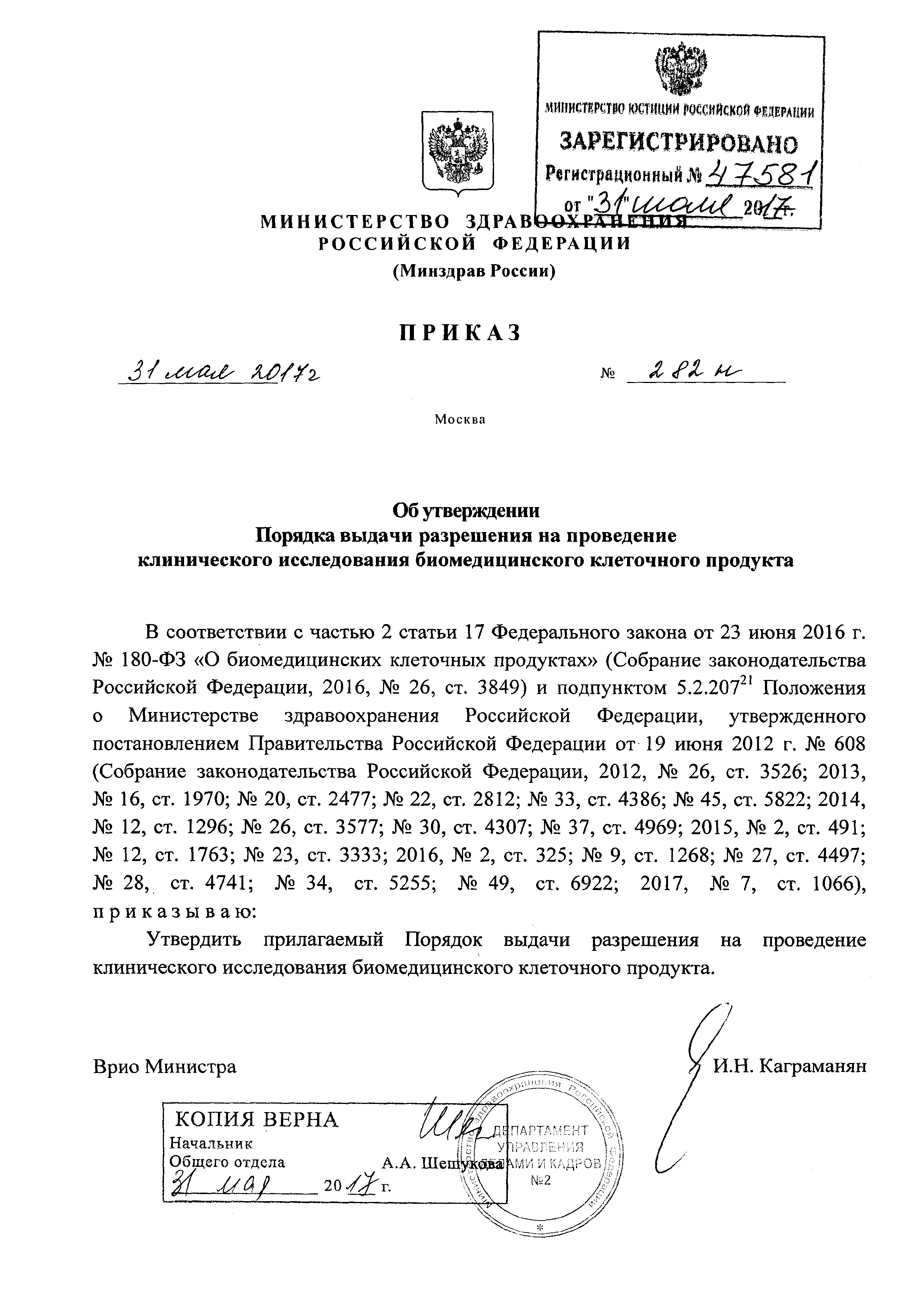 | Утверждён: | 31.05.2017 Министерство здравоохранения Российской Федерации (282н)