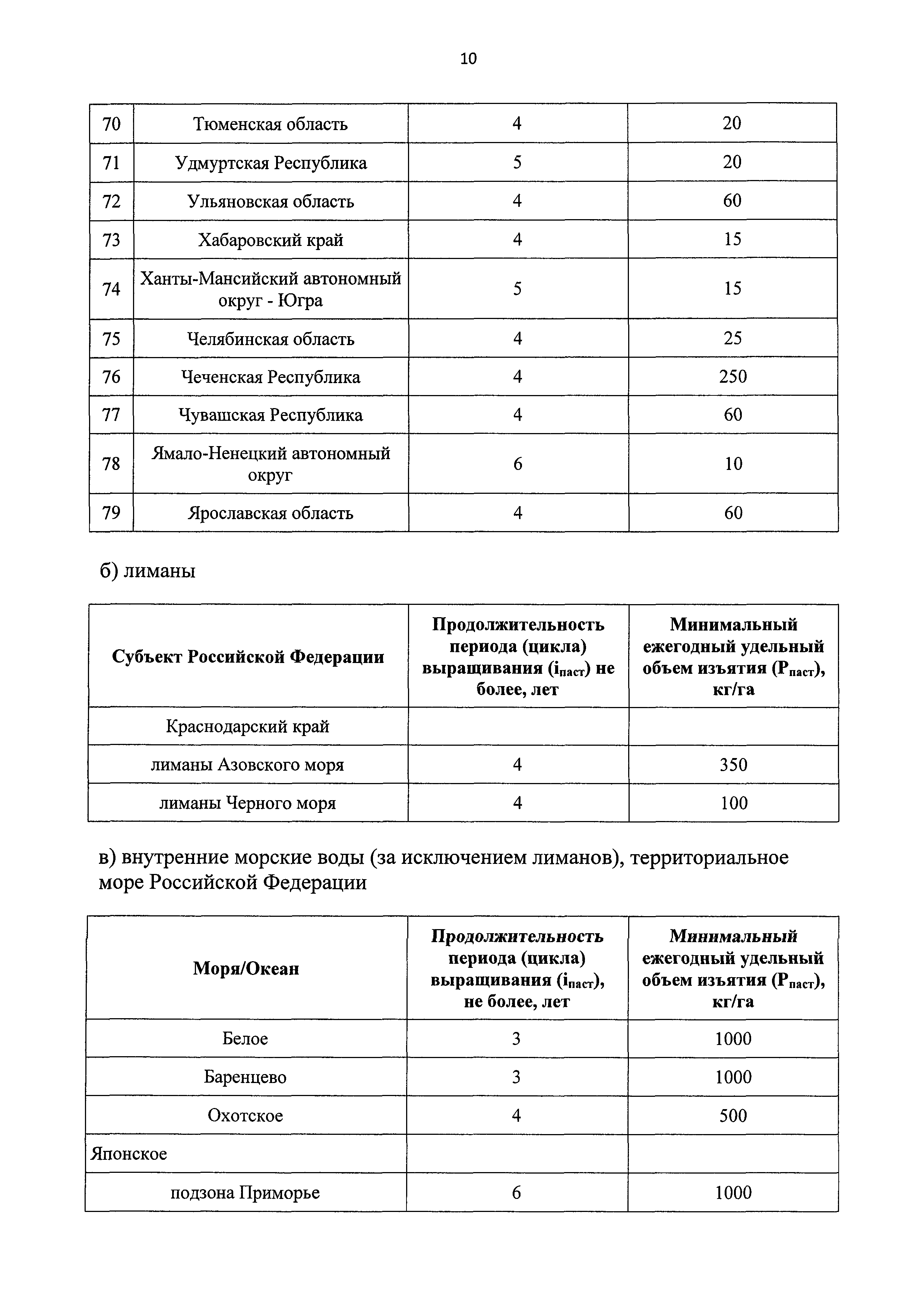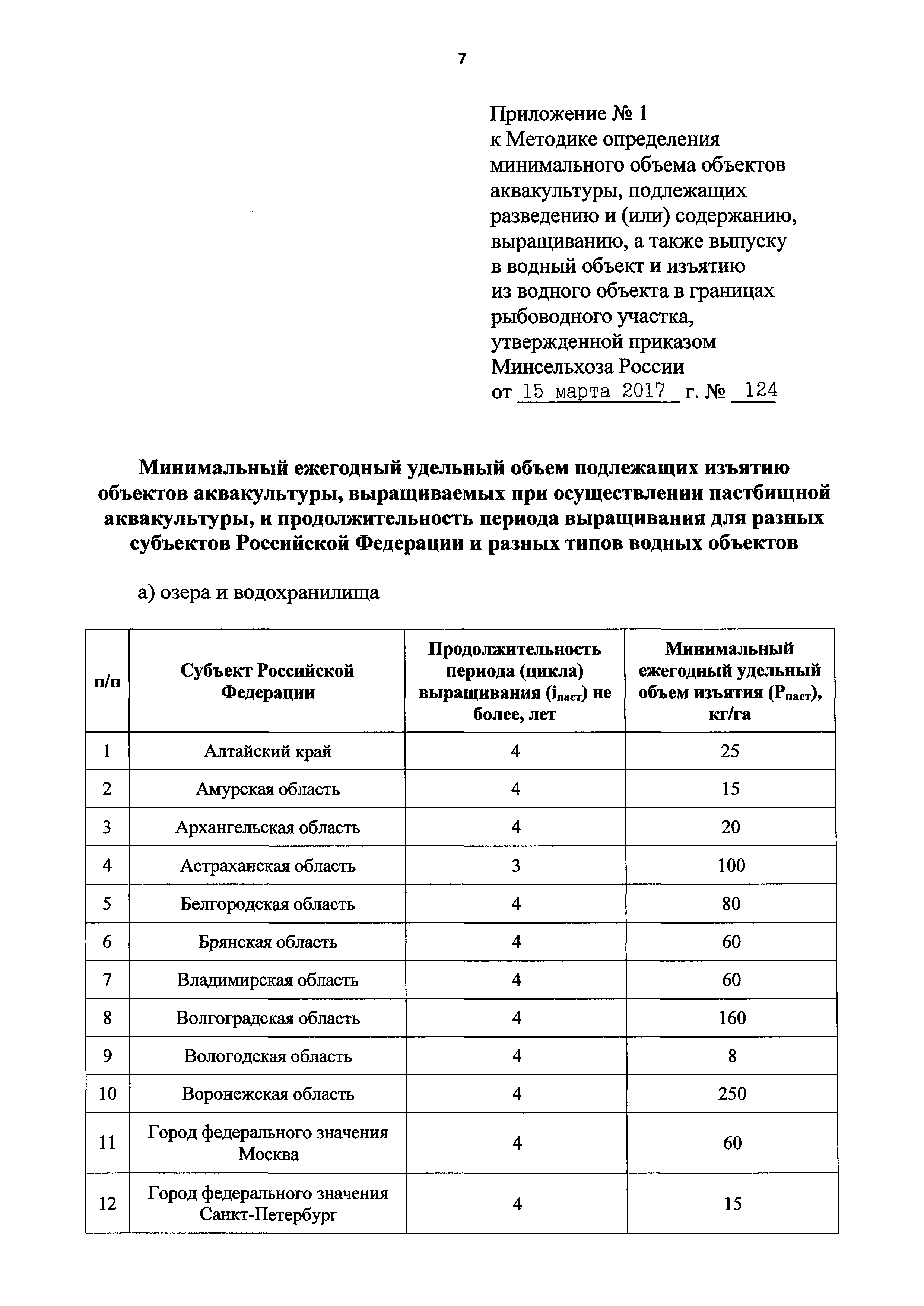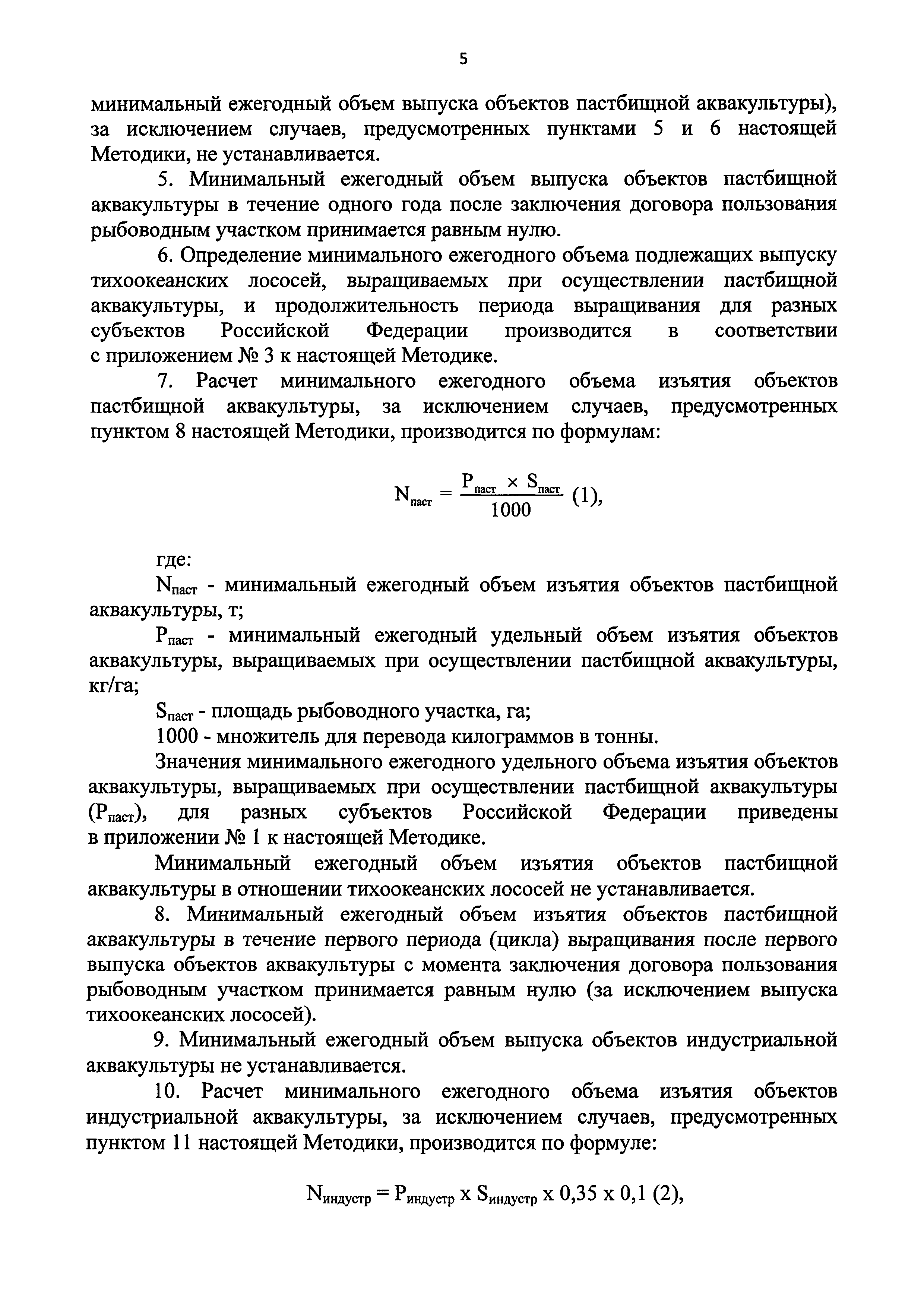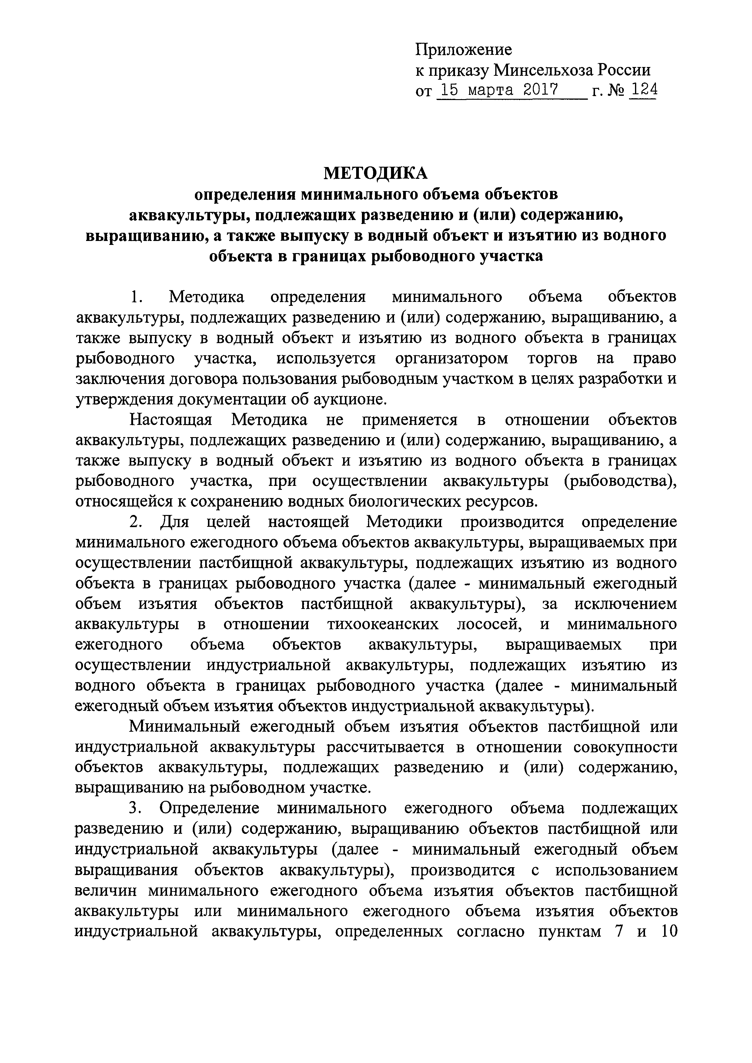 Методика определения минимального объема объектов аквакультуры, подлежащих разведению и (или) содержанию, выращиванию, а также выпуску в водный объект и изъятию из водного объекта в границах рыбоводного участка| Статус: | действует | | Название рус.: | Методика определения минимального объема объектов аквакультуры, подлежащих разведению и (или) содержанию, выращиванию, а также выпуску в водный объект и изъятию из водного объекта в границах рыбоводного участка | | Дата добавления в базу: | 01.01.2021 | | Дата актуализации: | 01.01.2021 | | Область применения: | Методика определения минимального объема объектов аквакультуры, подлежащих разведению и (или) содержанию, выращиванию, а также выпуску в водный объект и изъятию из водного объекта в границах рыбоводного участка, используется организатором торгов на право заключения договора пользования рыбоводным участком в целях разработки и утверждения документации об аукционе | | Оглавление: | Приложение № 1. Минимальный ежегодный удельный объем подлежащих изъятию объектов аквакультуры, выращиваемых при осуществлении пастбищной аквакультуры, и продолжительность периода выращивания для разных субъектов Российской Федерации и разных типов водных объектов Приложение № 2. Минимальный ежегодный удельный объем подлежащих изъятию объектов аквакультуры, выращиваемых при осуществлении индустриальной аквакультуры, и продолжительность периода выращивания указанных объектов аквакультуры для разных субъектов Российской Федерации Приложение № 3. Минимальный ежегодный объем подлежащих выпуску тихоокеанских лососей, выращиваемых при осуществлении пастбищной аквакультуры, и продолжительность периода выращивания для разных субъектов Российской Федерации | | Утверждён: | 15.03.2017 Минсельхоз России (Russian Federation Minselkhoz 124)