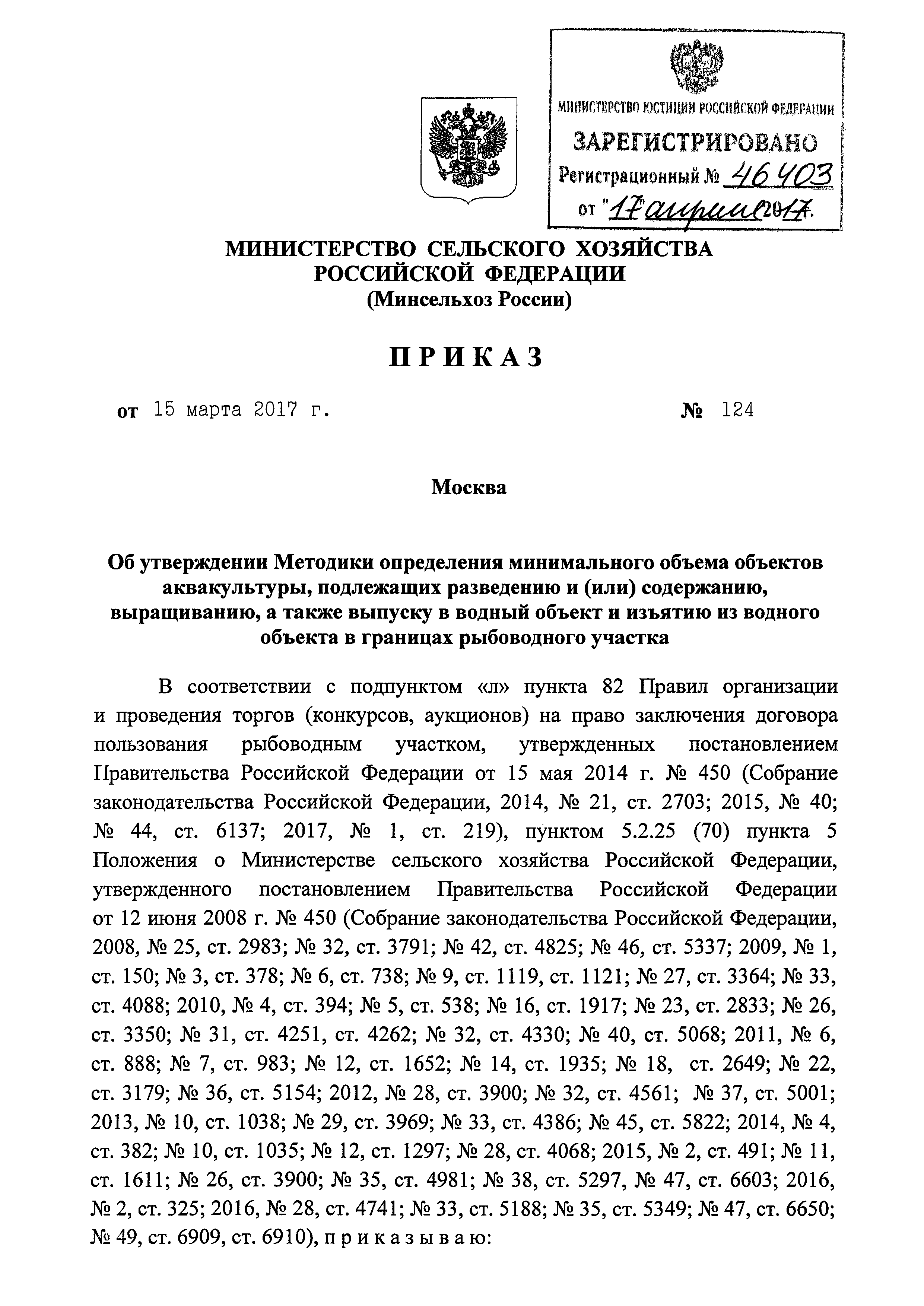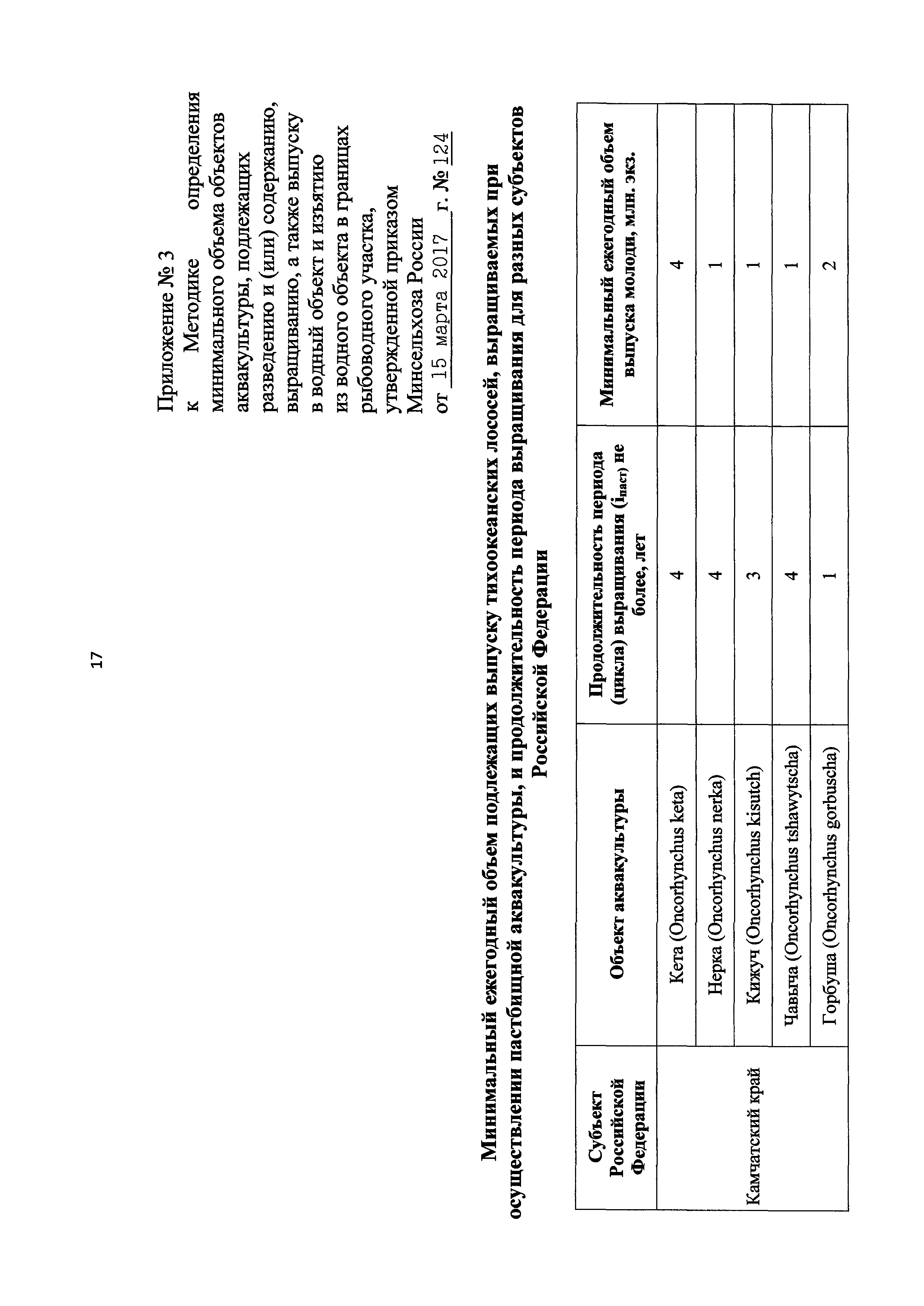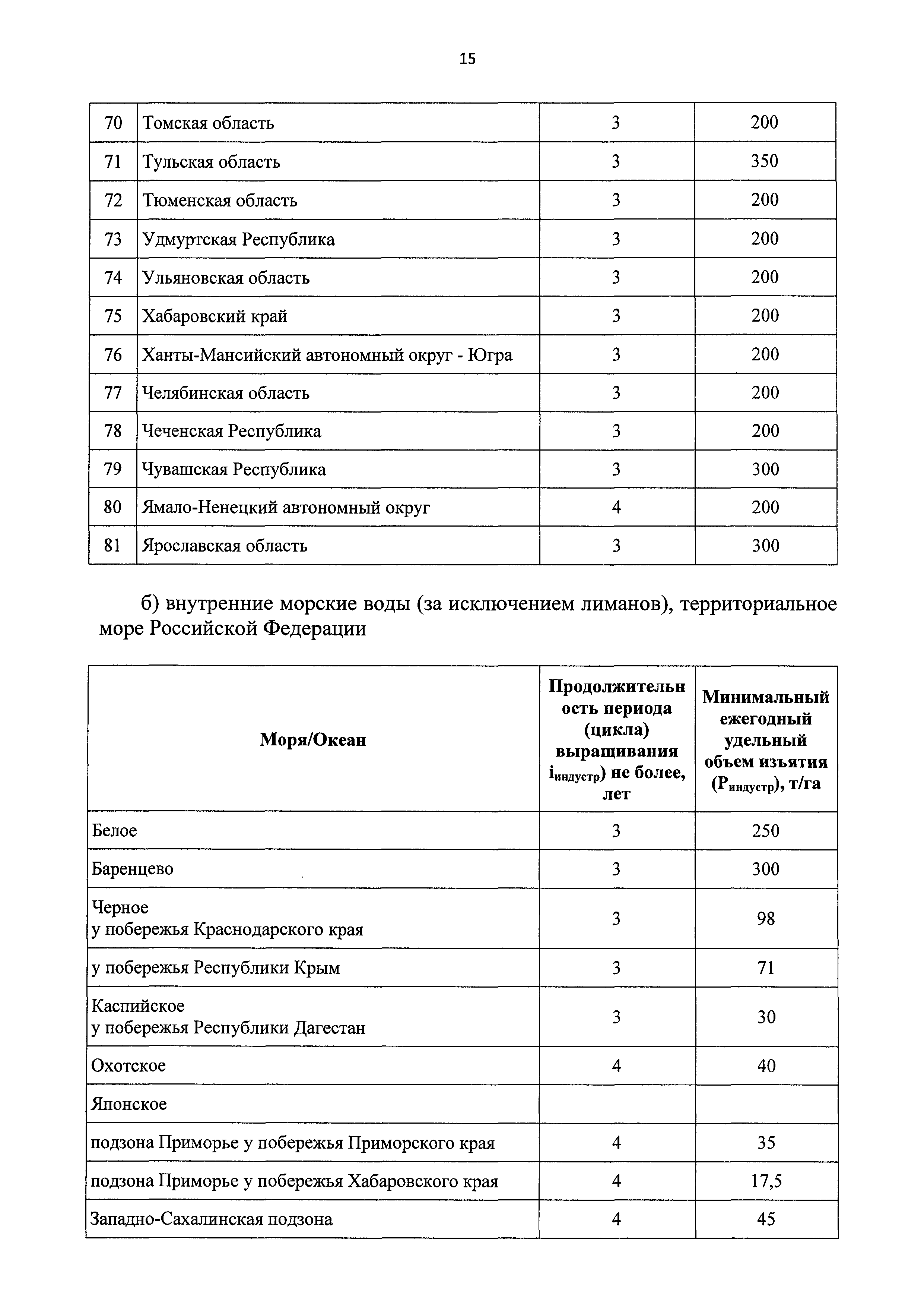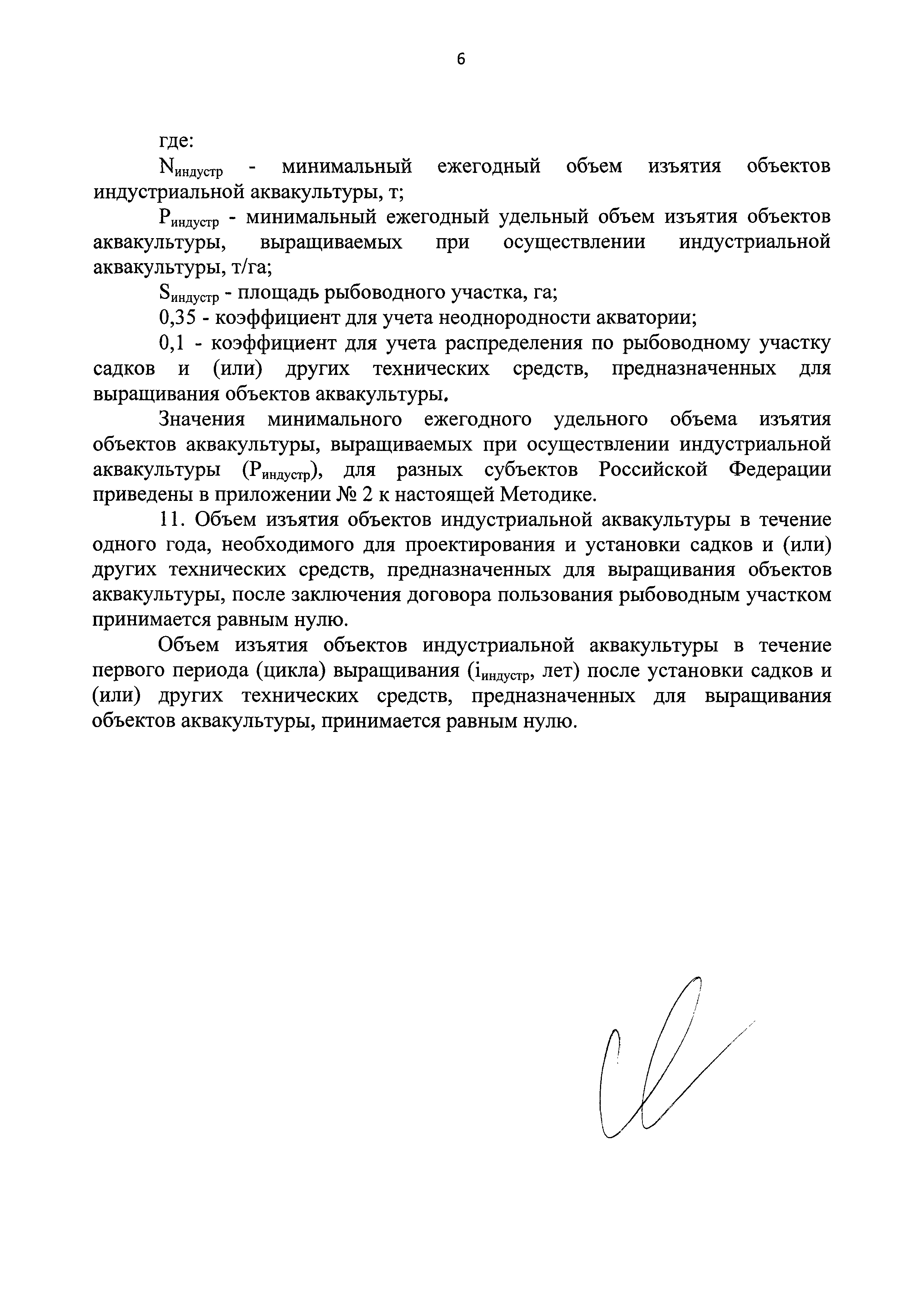 Методика определения минимального объема объектов аквакультуры, подлежащих разведению и (или) содержанию, выращиванию, а также выпуску в водный объект и изъятию из водного объекта в границах рыбоводного участка| Статус: | действует | | Название рус.: | Методика определения минимального объема объектов аквакультуры, подлежащих разведению и (или) содержанию, выращиванию, а также выпуску в водный объект и изъятию из водного объекта в границах рыбоводного участка | | Дата добавления в базу: | 01.01.2021 | | Дата актуализации: | 01.01.2021 | | Область применения: | Методика определения минимального объема объектов аквакультуры, подлежащих разведению и (или) содержанию, выращиванию, а также выпуску в водный объект и изъятию из водного объекта в границах рыбоводного участка, используется организатором торгов на право заключения договора пользования рыбоводным участком в целях разработки и утверждения документации об аукционе | | Оглавление: | Приложение № 1. Минимальный ежегодный удельный объем подлежащих изъятию объектов аквакультуры, выращиваемых при осуществлении пастбищной аквакультуры, и продолжительность периода выращивания для разных субъектов Российской Федерации и разных типов водных объектов Приложение № 2. Минимальный ежегодный удельный объем подлежащих изъятию объектов аквакультуры, выращиваемых при осуществлении индустриальной аквакультуры, и продолжительность периода выращивания указанных объектов аквакультуры для разных субъектов Российской Федерации Приложение № 3. Минимальный ежегодный объем подлежащих выпуску тихоокеанских лососей, выращиваемых при осуществлении пастбищной аквакультуры, и продолжительность периода выращивания для разных субъектов Российской Федерации | | Утверждён: | 15.03.2017 Минсельхоз России (Russian Federation Minselkhoz 124)