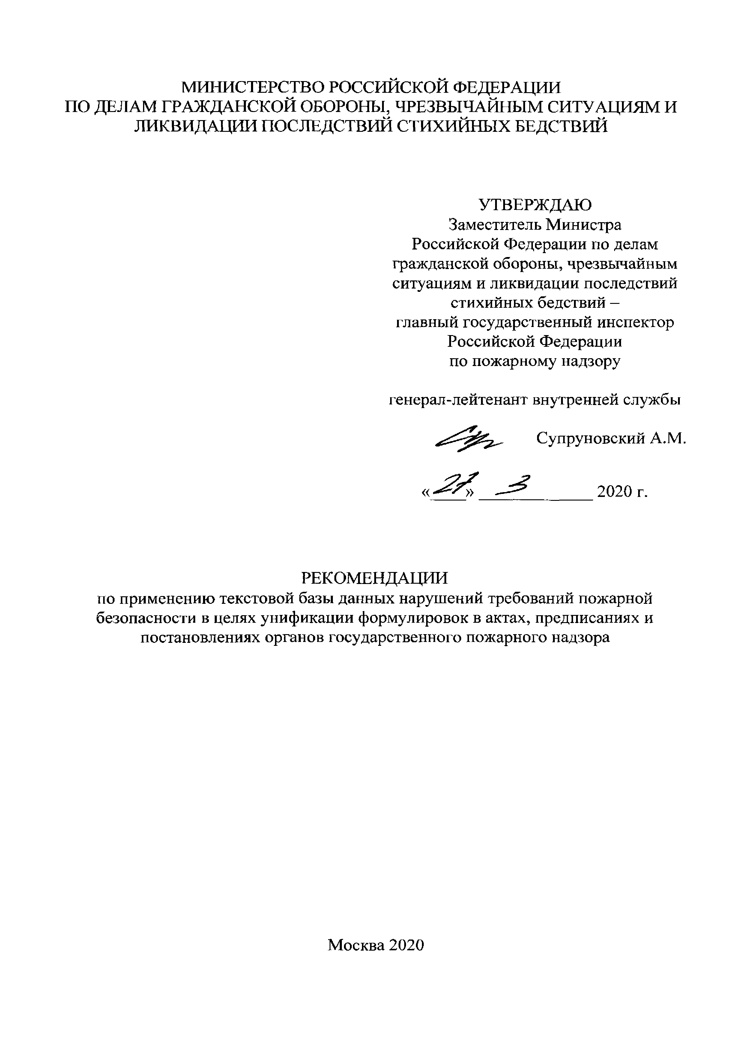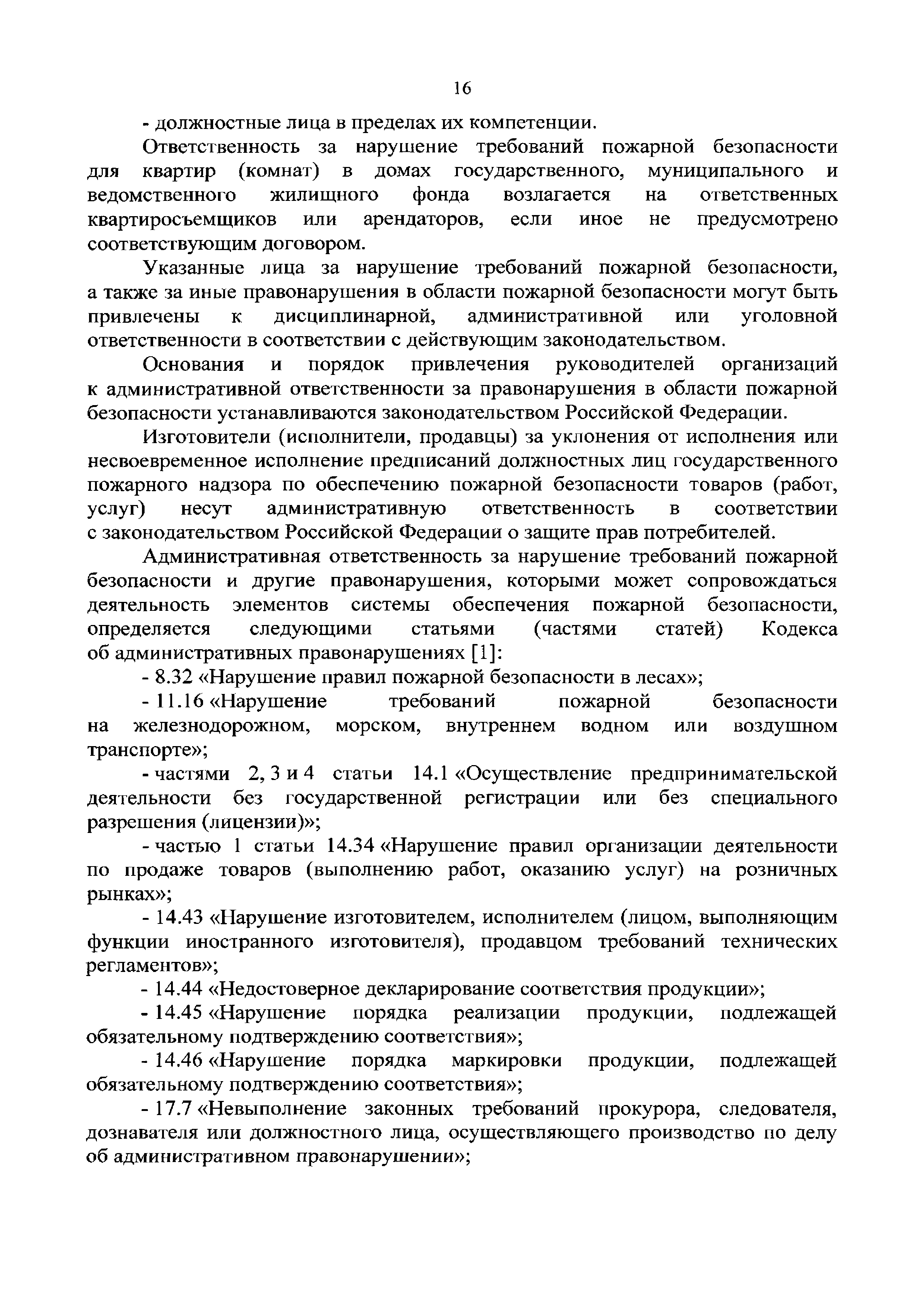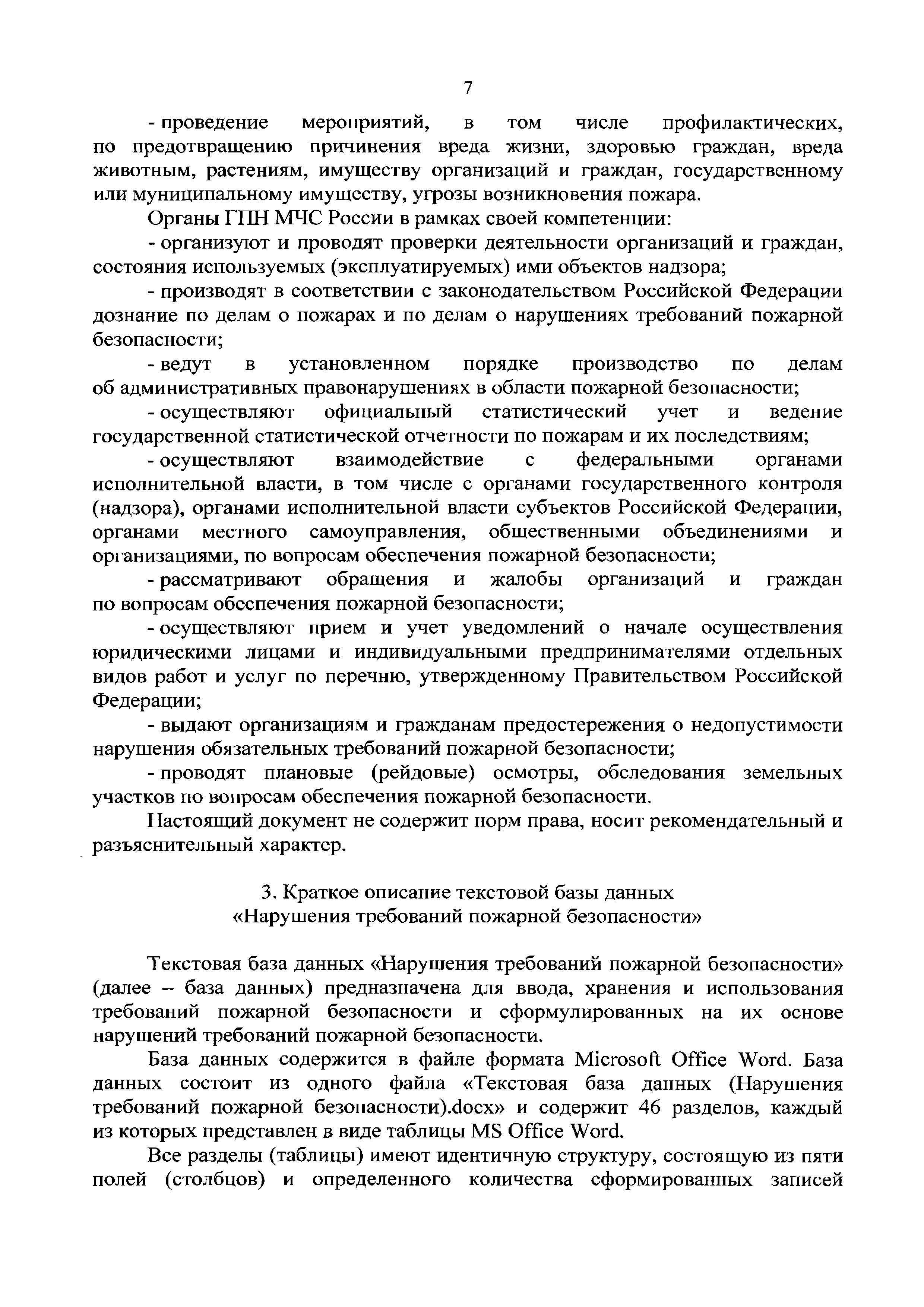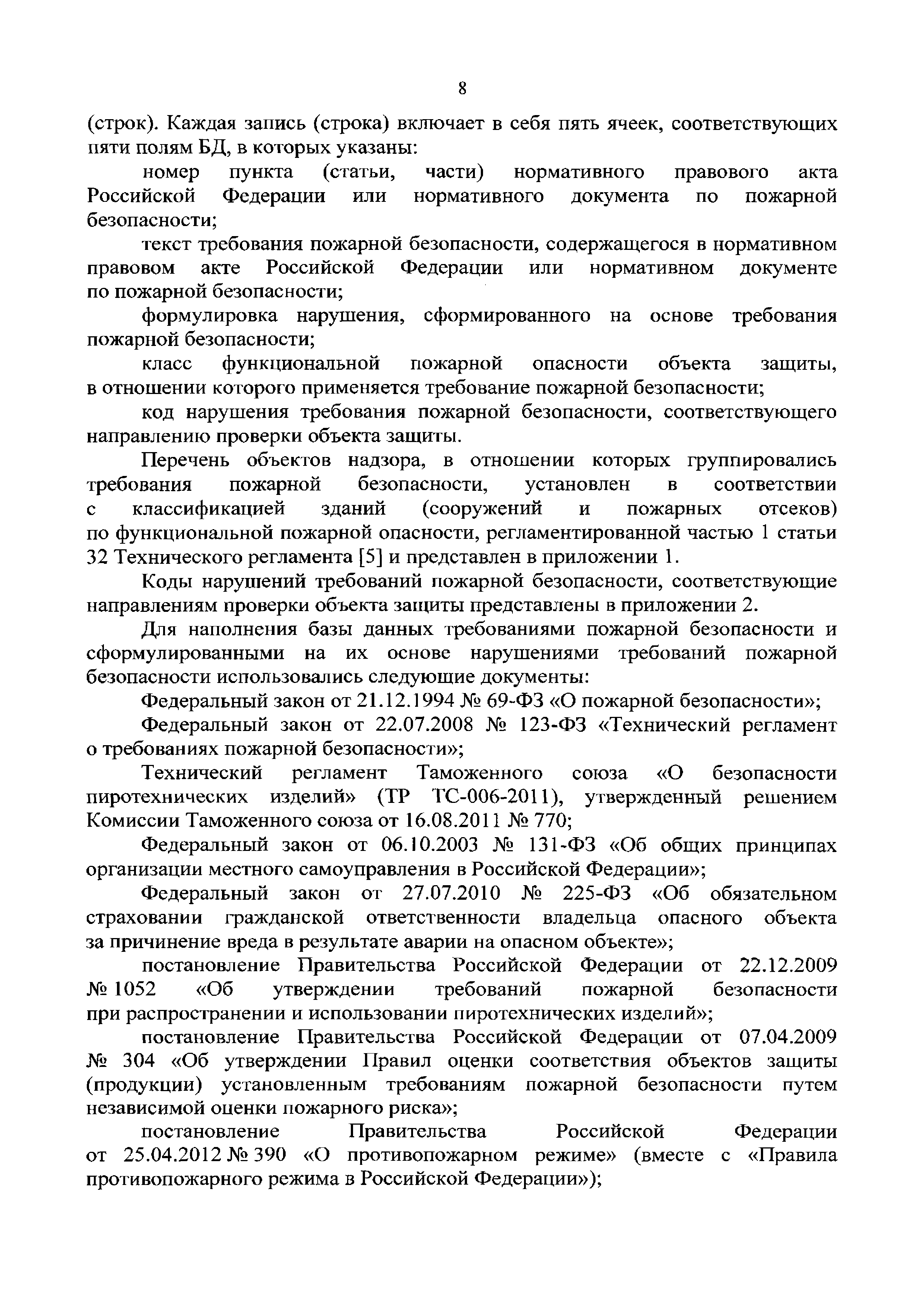 | Оглавление: | Введение 1 Термины и определения 2 Общие положения 3 Краткое описание текстовой базы данных "Нарушения требований пожарной безопасности" 4 Нарушения требований пожарной безопасности, наиболее часто выявляемые при проведении мероприятий по надзору 5 Общие требования к оформлению предписаний, актов и постановлений в части указания в них корректных формулировок выявленных нарушений требований пожарной безопасности и ссылок на нормативные правовые акты, требования которых нарушены 6 Ответственность за нарушения требований пожарной безопасности Список использованных источников Приложение 1. Классификация объектов надзора по функциональной пожарной опасности Приложение 2. Коды нарушений требований пожарной безопасности, соответствующие направлению проверки объекта защиты |