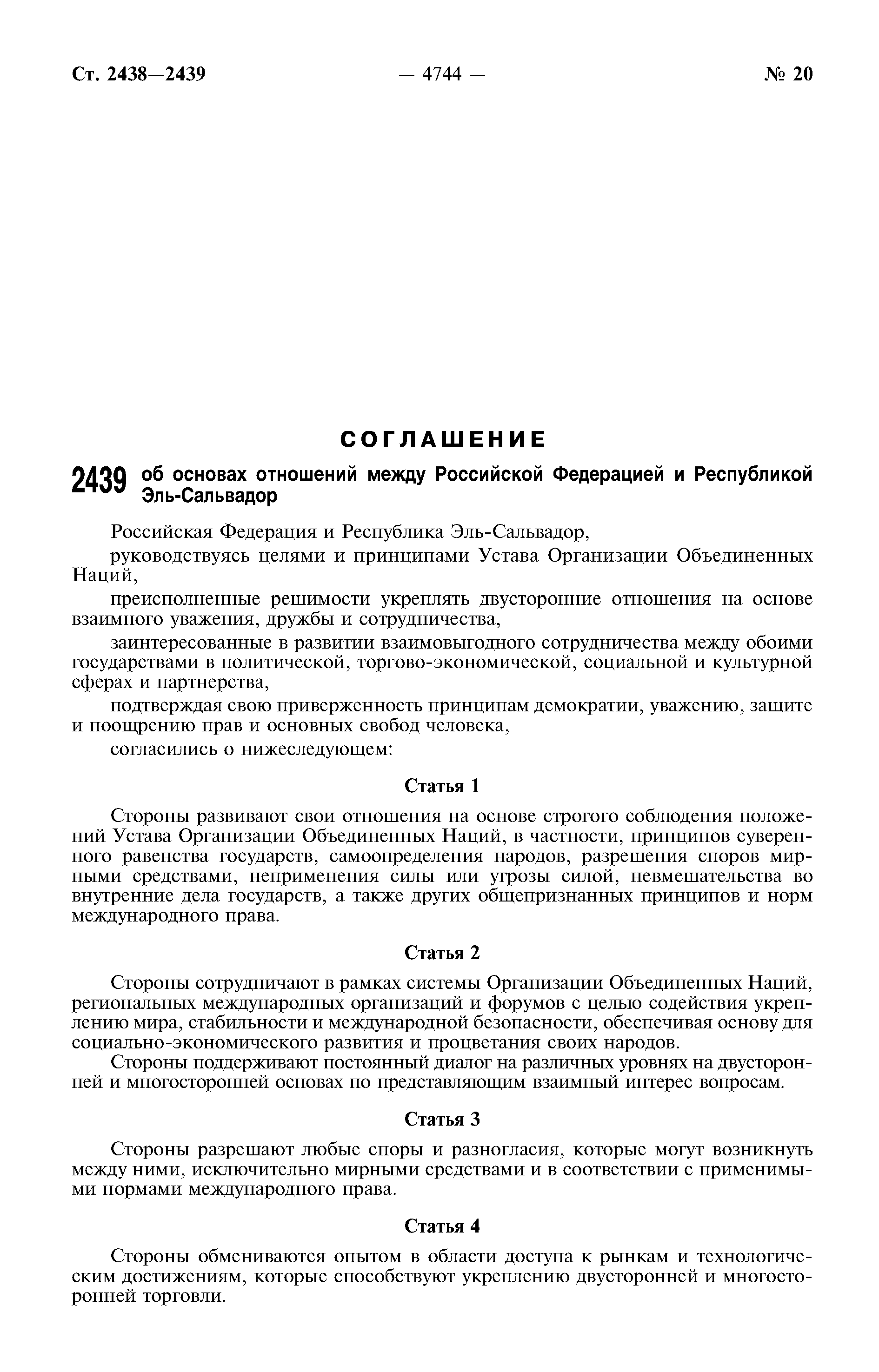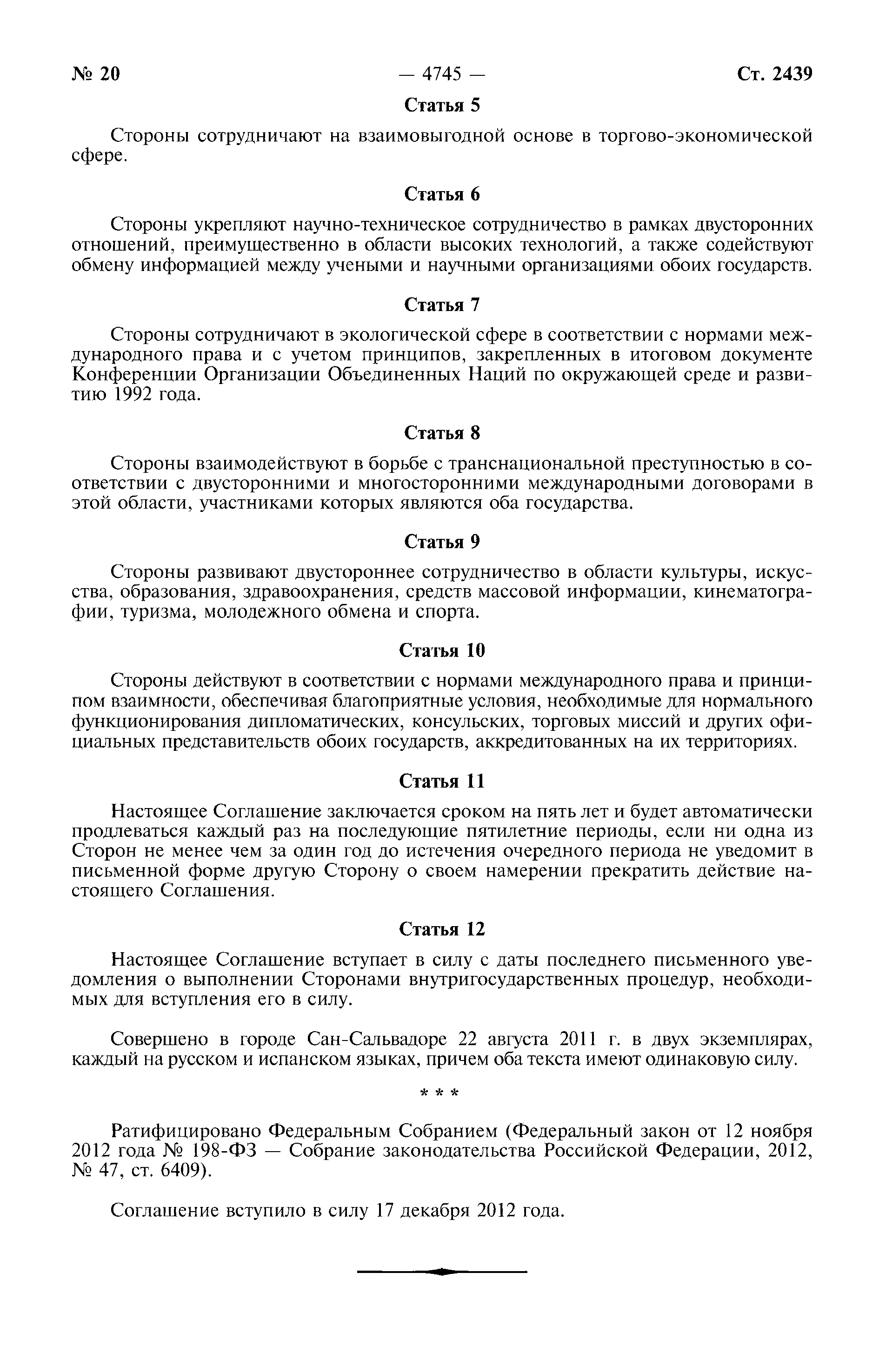 Соглашение об основах отношений между Российской Федерацией и Республикой Эль-Сальвадор| Статус: | действует | | Название рус.: | Соглашение об основах отношений между Российской Федерацией и Республикой Эль-Сальвадор | | Дата добавления в базу: | 01.01.2021 | | Дата актуализации: | 01.01.2021 | | Дата введения: | 17.12.2012 | | Оглавление: | Статья 1 Статья 2 Статья 3 Статья 4 Статья 5 Статья 6 Статья 7 Статья 8 Статья 9 Статья 10 Статья 11 Статья 12 |