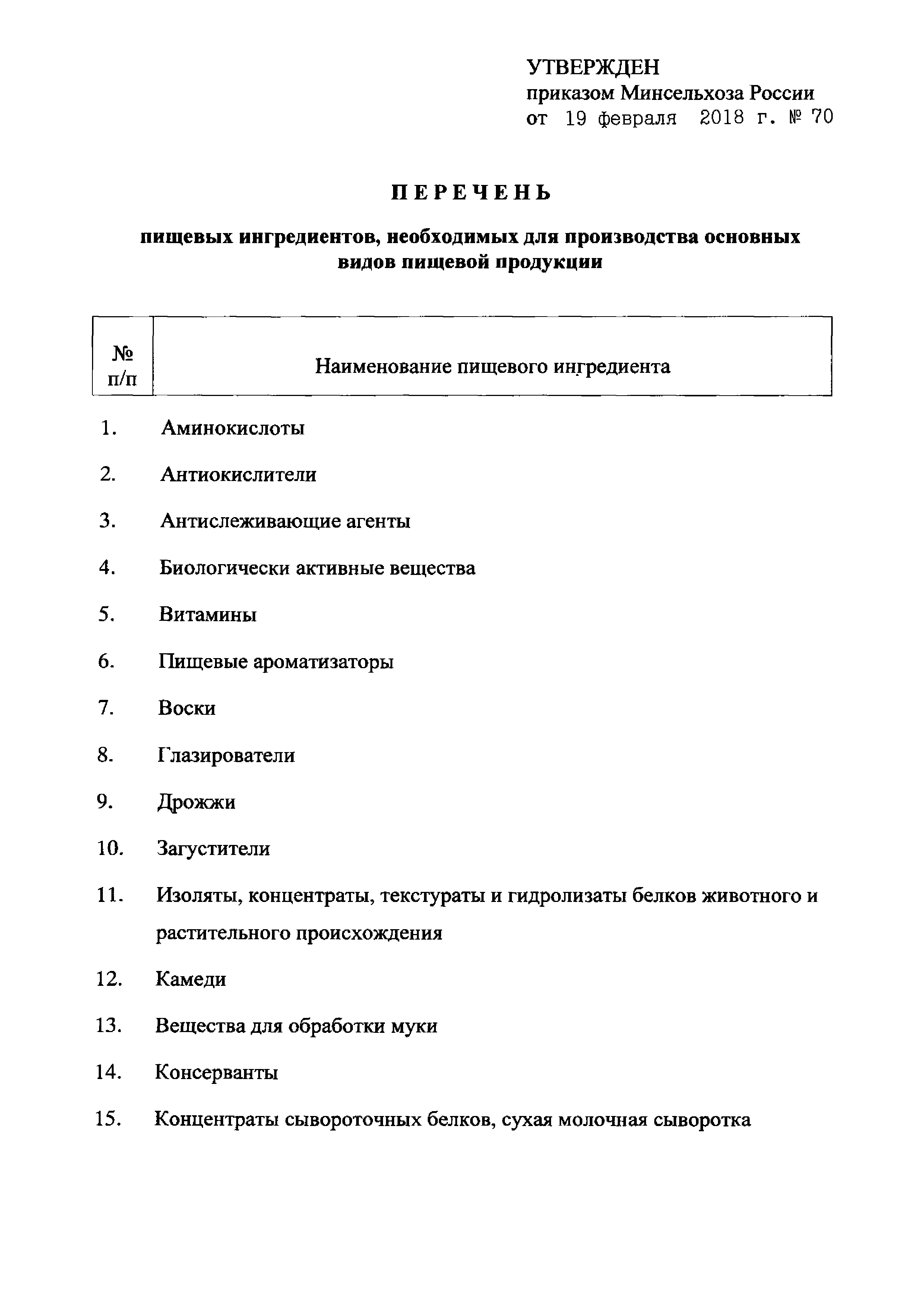 Перечень пищевых ингредиентов, необходимых для производства основных видов пищевой продукции| Статус: | действует | | Название рус.: | Перечень пищевых ингредиентов, необходимых для производства основных видов пищевой продукции | | Дата добавления в базу: | 01.01.2021 | | Дата актуализации: | 01.01.2021 | | Утверждён: | 19.02.2018 Минсельхоз России (Russian Federation Minselkhoz 70)