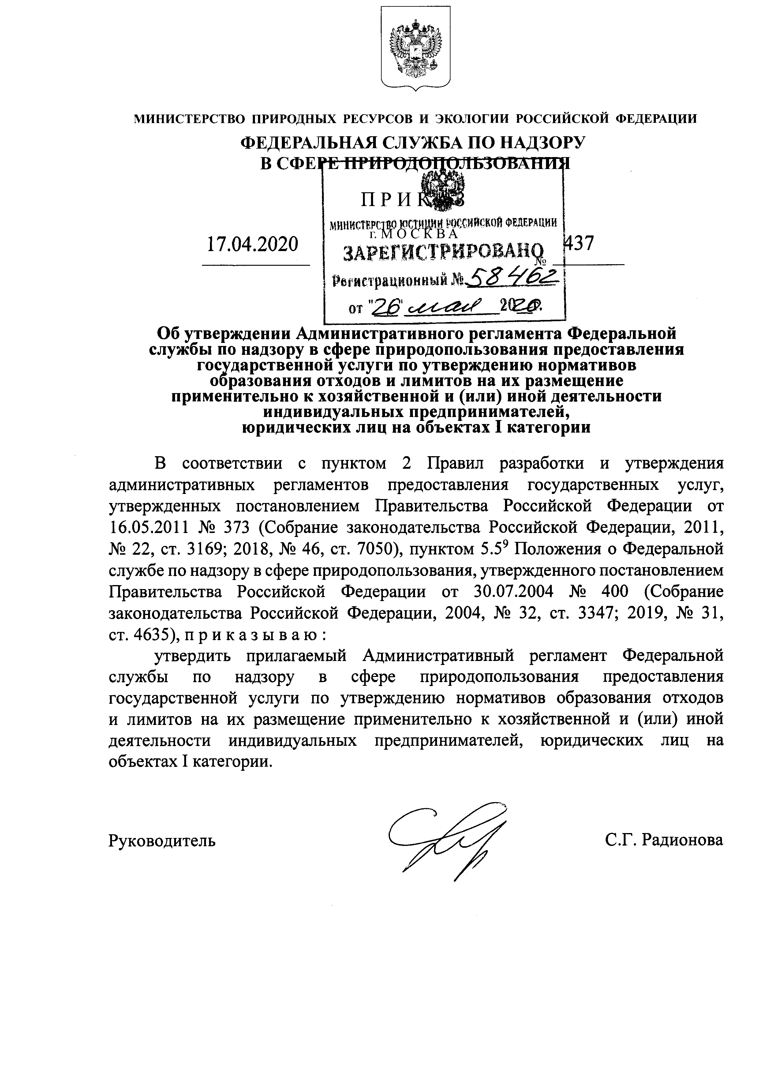 | Утверждён: | 17.04.2020 Федеральная служба по надзору в сфере природопользования (437) |