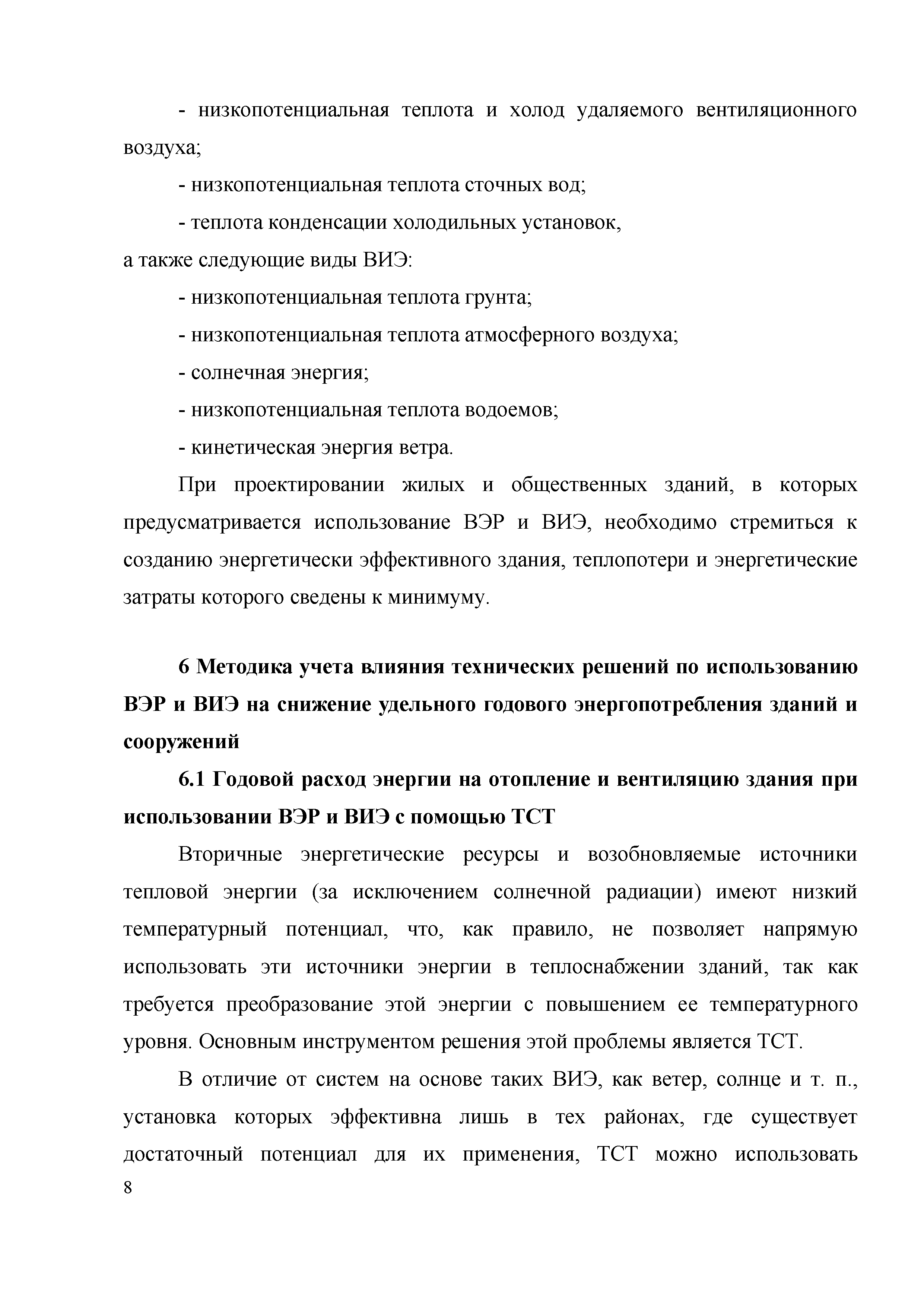 Методические рекомендации по определению влияния использования вторичных энергетических ресурсов и возобновляемых источников энергии на энергопотребление здания| Статус: | действует | | Название рус.: | Методические рекомендации по определению влияния использования вторичных энергетических ресурсов и возобновляемых источников энергии на энергопотребление здания | | Дата добавления в базу: | 01.01.2021 | | Дата актуализации: | 01.01.2021 | | Область применения: | Методические рекомендации следует применять при проектировании жилых и общественных зданий, в которых величины удельного годового расхода энергетических ресурсов частично или полностью обеспечиваются за счет использования ВЭР и ВИЭ, а также в процессе периодического подтверждения величины удельного годового расхода энергетических ресурсов такими зданиями. | | Оглавление: | 1 Область применения 2 Нормативные ссылки 3 Термины и определения 4 Обозначения и сокращения 5 Общие положения 6 Методика учета влияния технических решений по использованию ВЭР и ВИЭ на снижение удельного годового энергопотребления зданий и сооружений 6.1 Годовой расход энергии на отопление и вентиляцию здания при использовании ВЭР и ВИЭ с помощью ТСТ 6.2 Годовой расход энергии на горячее водоснабжение здания при использовании ВЭР и ВИЭ с помощью ТСТ 6.3 Суммарный удельный годовой расход энергетических ресурсов 7 Методика определения класса энергетической эффективности МКД, использующего ВЭР и ВИЭ Приложение А. Пример определения класса энергетической эффективности МКД с использованием ВЭР и ВИЭ Приложение Б. Рекомендации по использованию ВЭР и ВИЭ для снижения удельного годового энергопотребления зданий Приложение В. Районирование территории Российской Федерации в части определения влияния использования ВЭР и ВИЭ на энергопотребление здания Библиография | | Разработан: | ОАО ИНСОЛАР-ИНВЕСТ