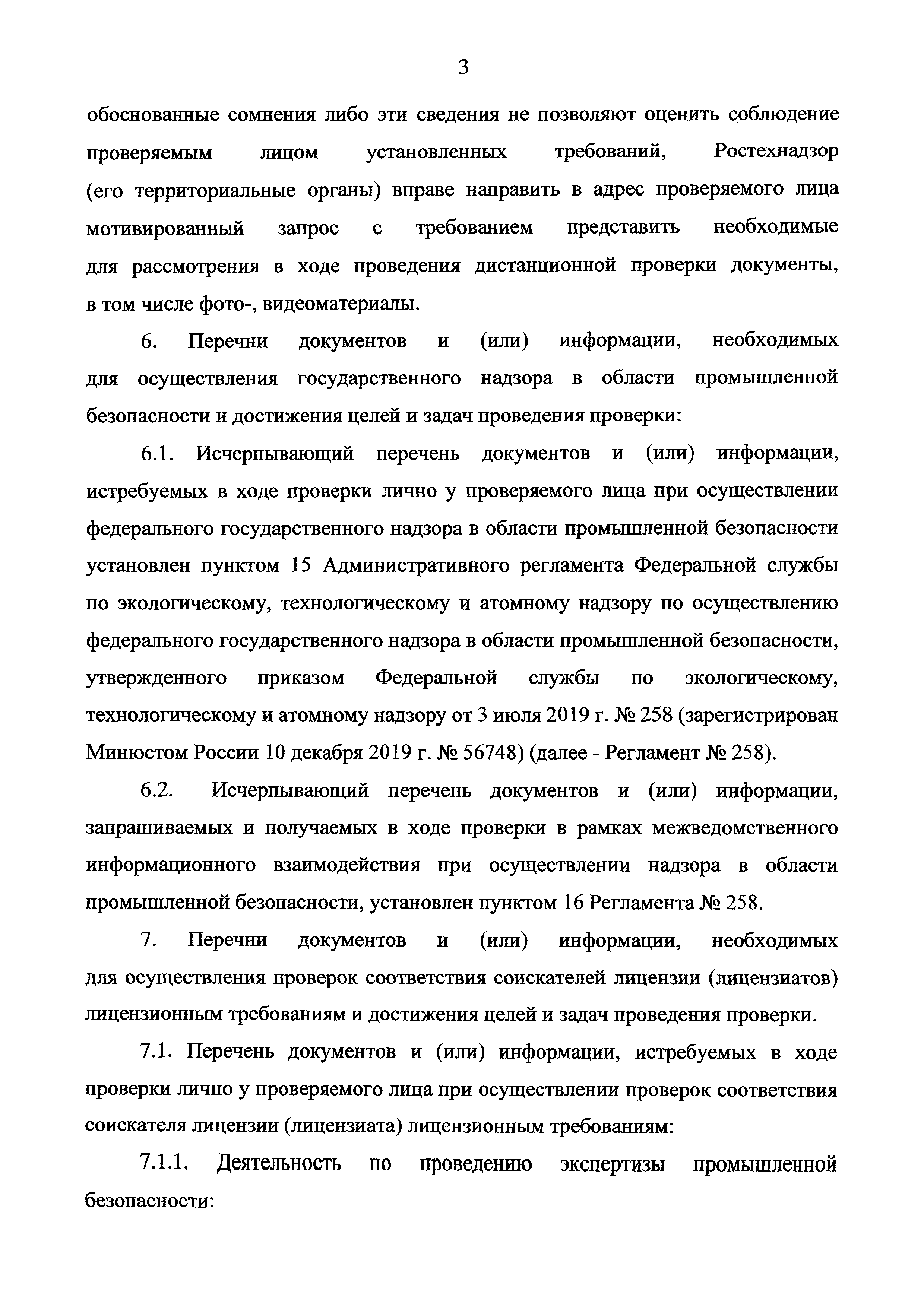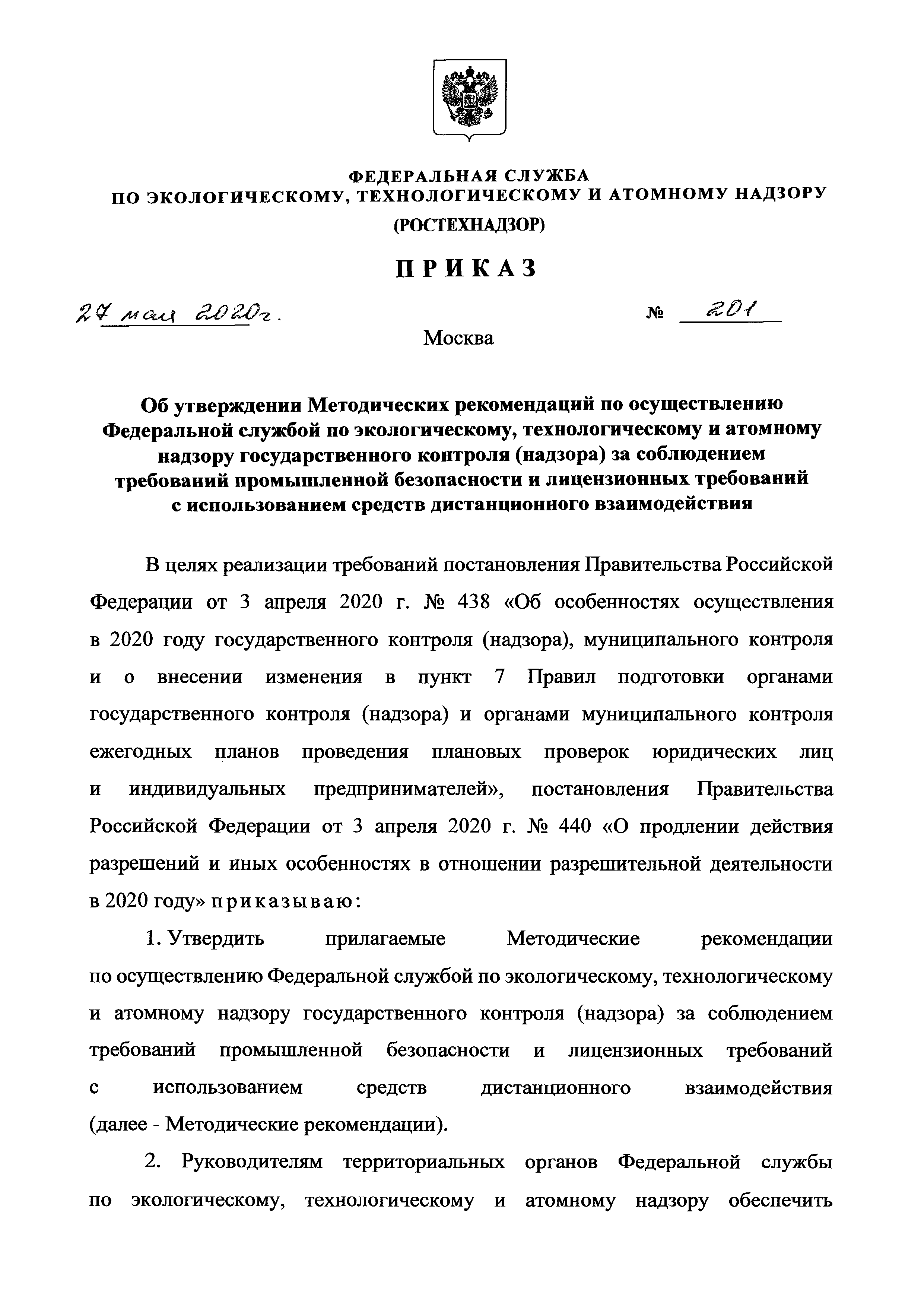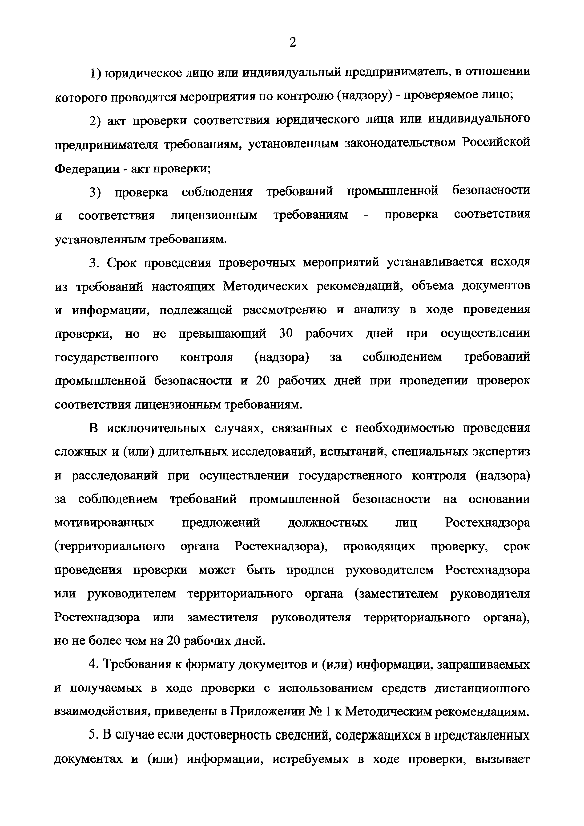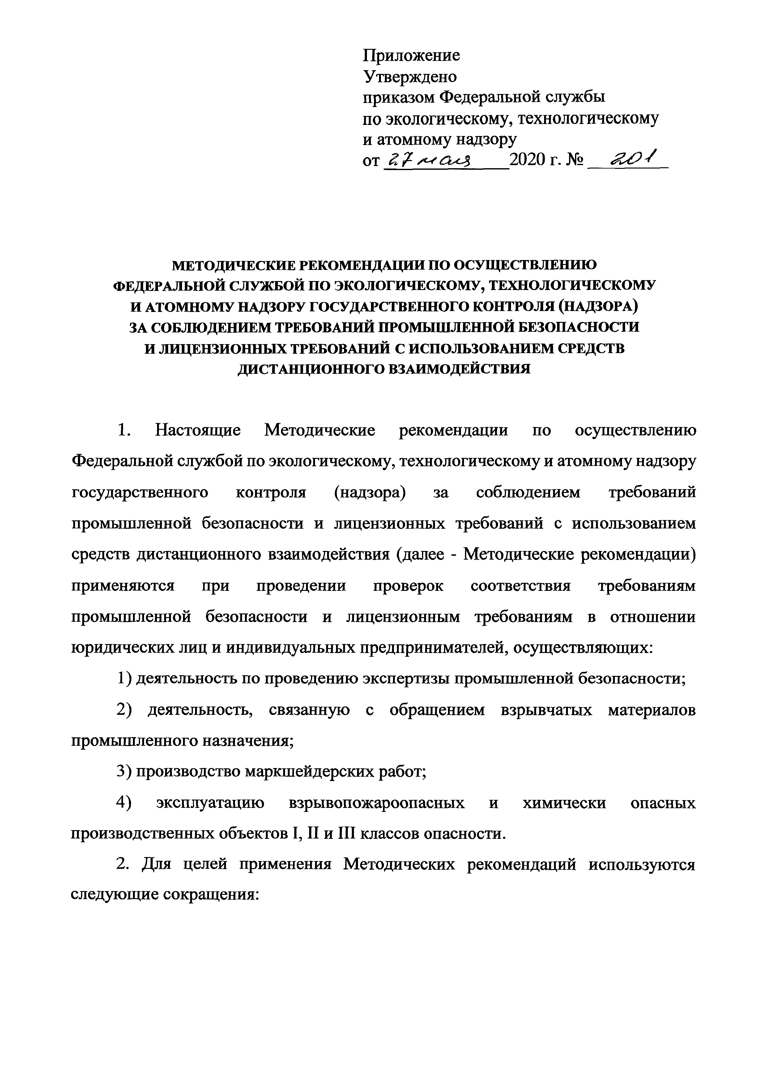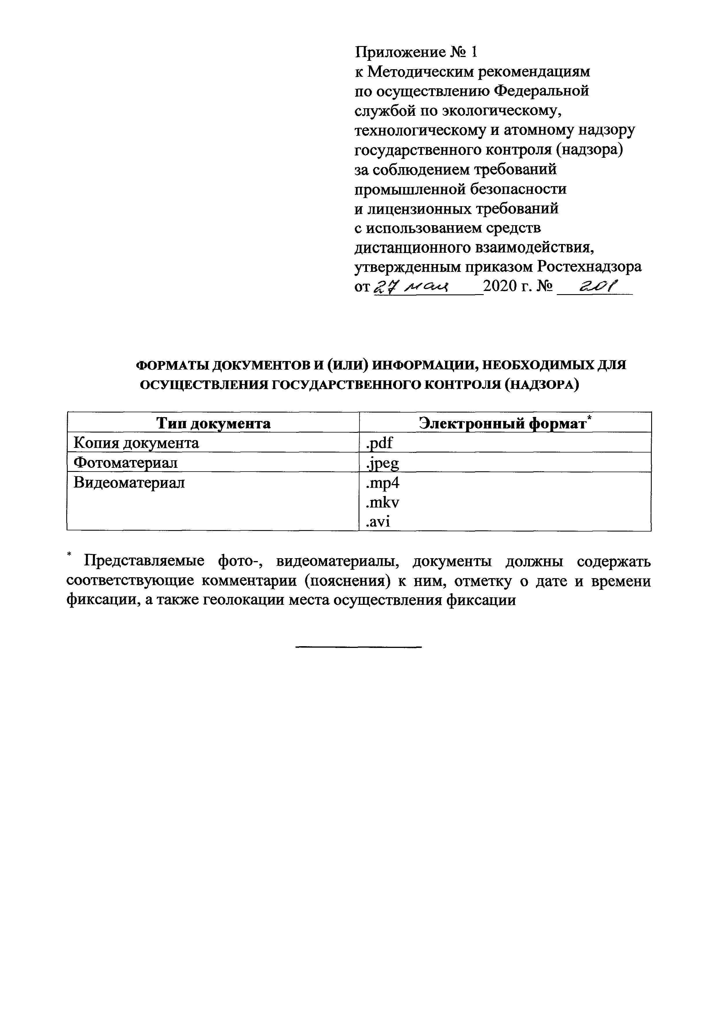 Методические рекомендации по осуществлению Федеральной службой по экологическому, технологическому и атомному надзору государственного контроля (надзора) за соблюдением требований промышленной безопасности и лицензионных требований с использованием средств дистанционного взаимодействия| Статус: | действует | | Название рус.: | Методические рекомендации по осуществлению Федеральной службой по экологическому, технологическому и атомному надзору государственного контроля (надзора) за соблюдением требований промышленной безопасности и лицензионных требований с использованием средств дистанционного взаимодействия | | Дата добавления в базу: | 01.01.2021 | | Дата актуализации: | 01.01.2021 | | Дата введения: | 27.05.2020 | | Дата окончания срока действия: | 31.12.2020 | | Область применения: | Рекомендации применяются при проведении проверок соответствия требованиям промышленной безопасности и лицензионным требованиям в отношении юридических лиц и индивидуальных предпринимателей, осуществляющих: деятельность по проведению экспертизы промышленной безопасности; деятельность, связанную с обращением взрывчатых материалов промышленного назначения; производство маркшейдерских работ; эксплуатацию взрывопожароопасных и химически опасных производственных объектов I, II и III классов опасности. | | Оглавление: | Приложение 1. Форматы документов и (или) информации, необходимых для осуществления государственного контроля (надэорл) | | Утверждён: | 27.05.2020 Ростехнадзор (201) Федеральная служба по экологическому, технологическому и атомному надзору - Управление технического надзора