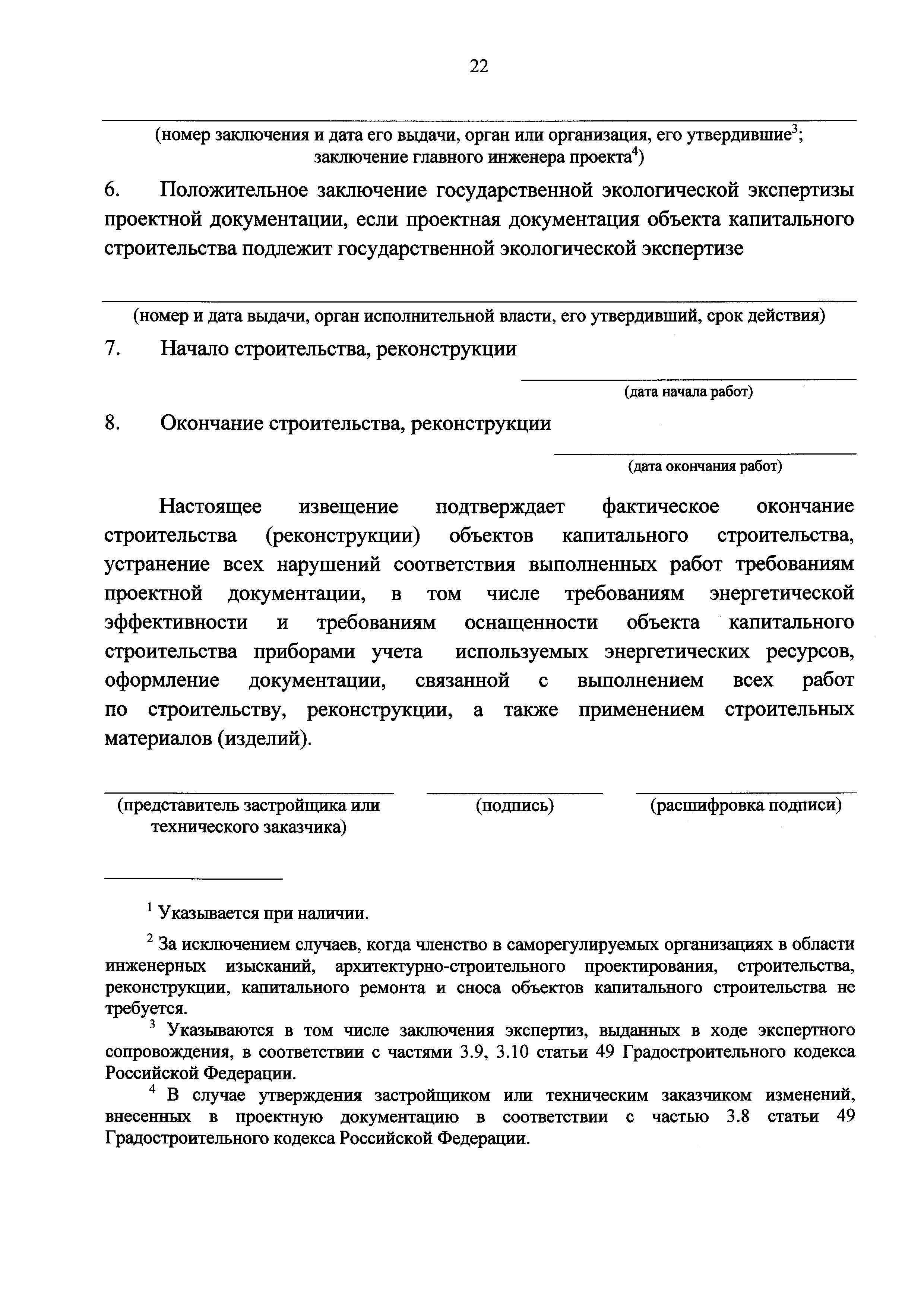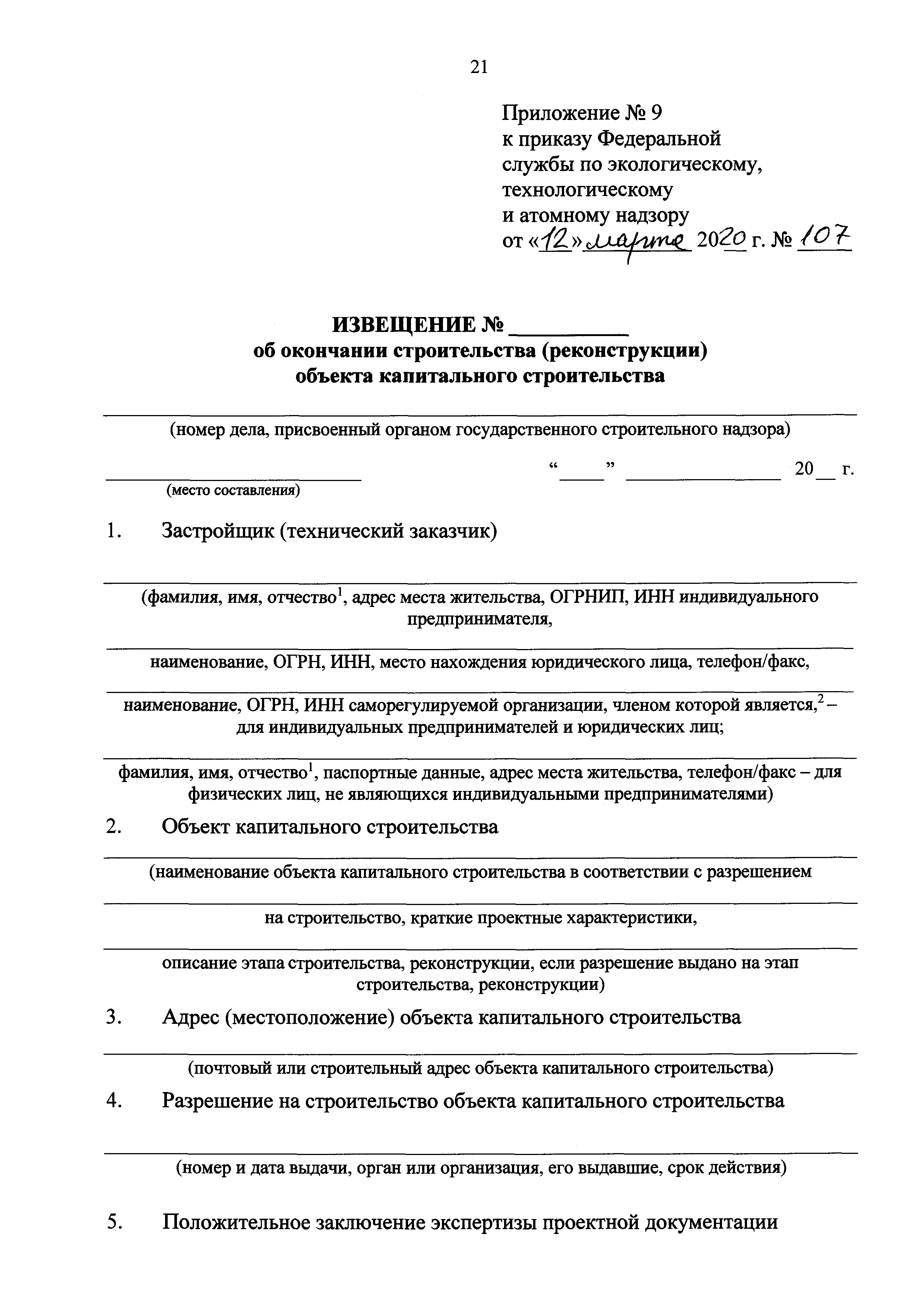 Извещение об окончании строительства (реконструкции) объекта капитального строительства| Статус: | действует | | Название рус.: | Извещение об окончании строительства (реконструкции) объекта капитального строительства | | Дата добавления в базу: | 01.01.2021 | | Дата актуализации: | 01.01.2021 | | Дата введения: | 24.04.2020 | | Утверждён: | 12.03.2020 Федеральная служба по экологическому, технологическому и атомному надзору (107)