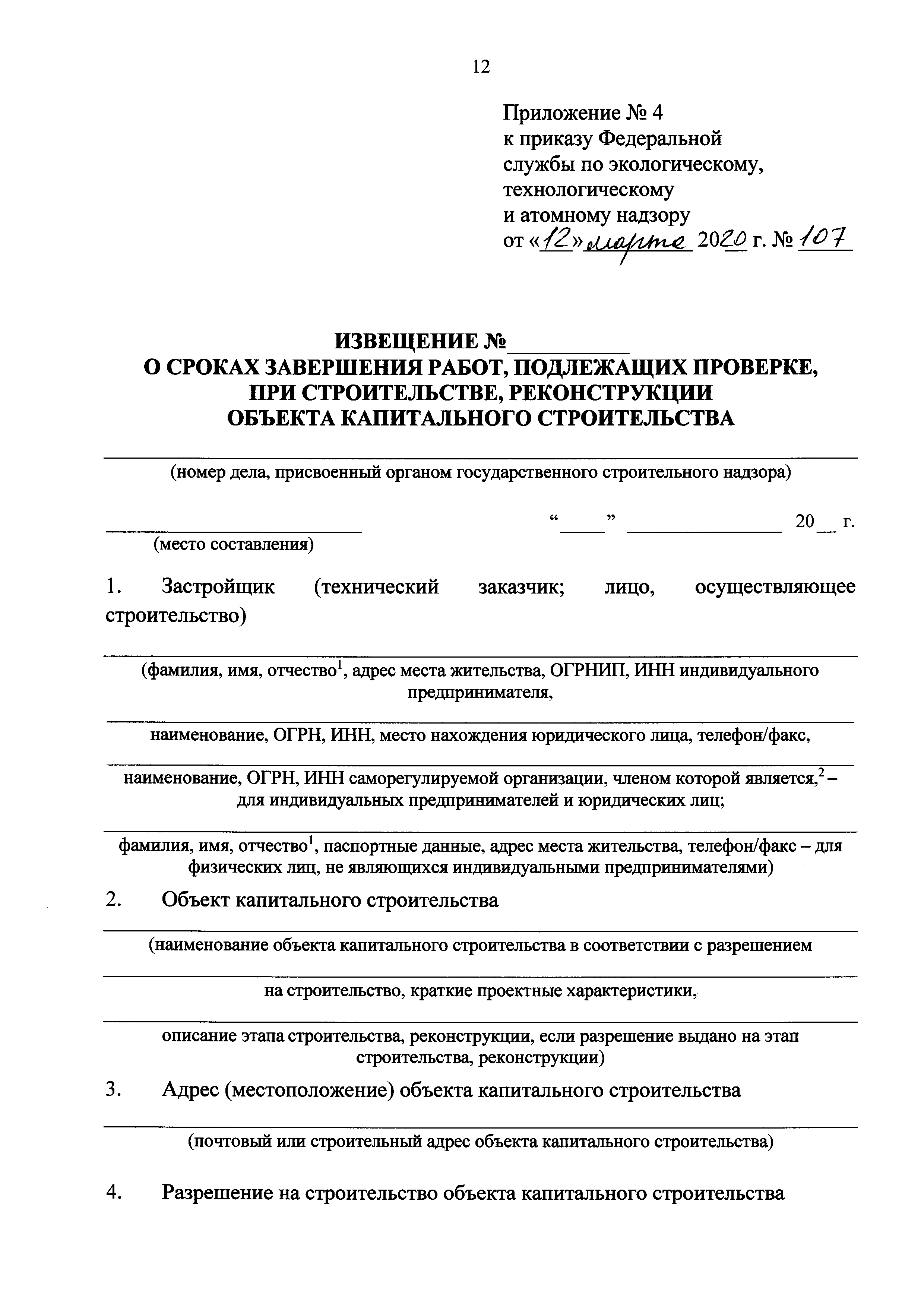 Извещение о сроках завершения работ, подлежащих проверке, при строительстве, реконструкции объекта капитального строительства| Статус: | действует | | Название рус.: | Извещение о сроках завершения работ, подлежащих проверке, при строительстве, реконструкции объекта капитального строительства | | Дата добавления в базу: | 01.01.2021 | | Дата актуализации: | 01.01.2021 | | Дата введения: | 24.04.2020 | | Утверждён: | 12.03.2020 Федеральная служба по экологическому, технологическому и атомному надзору (107)