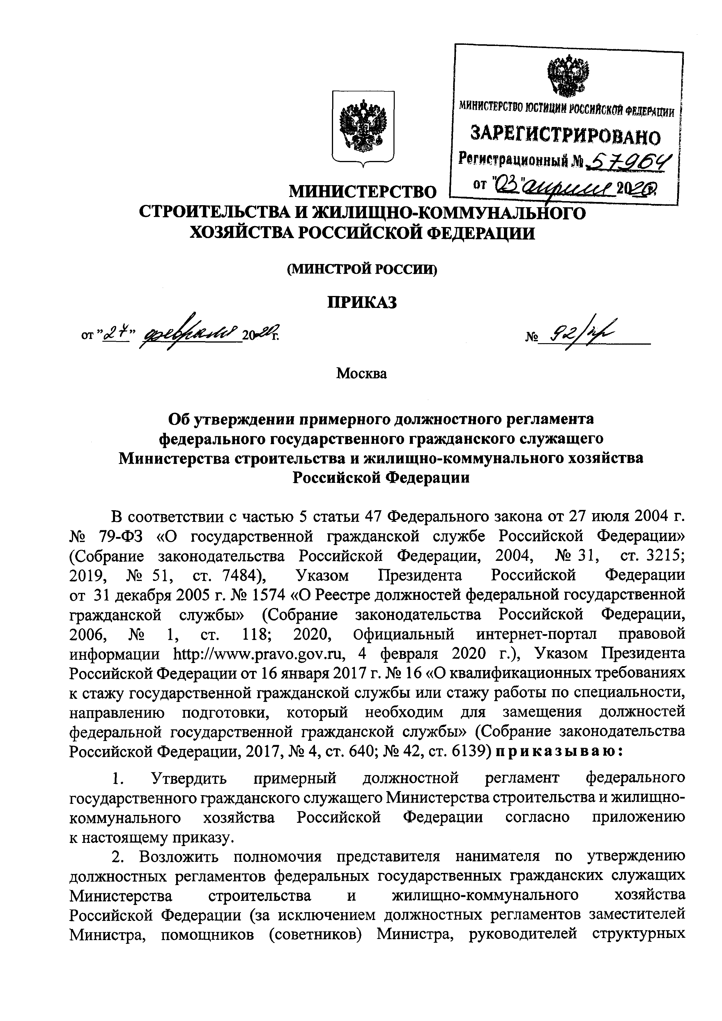 | Название рус.: | Примерный должностной регламент Федерального государственного гражданского служащего Министерства строительства и жилищно-коммунального хозяйства Российской Федерации |