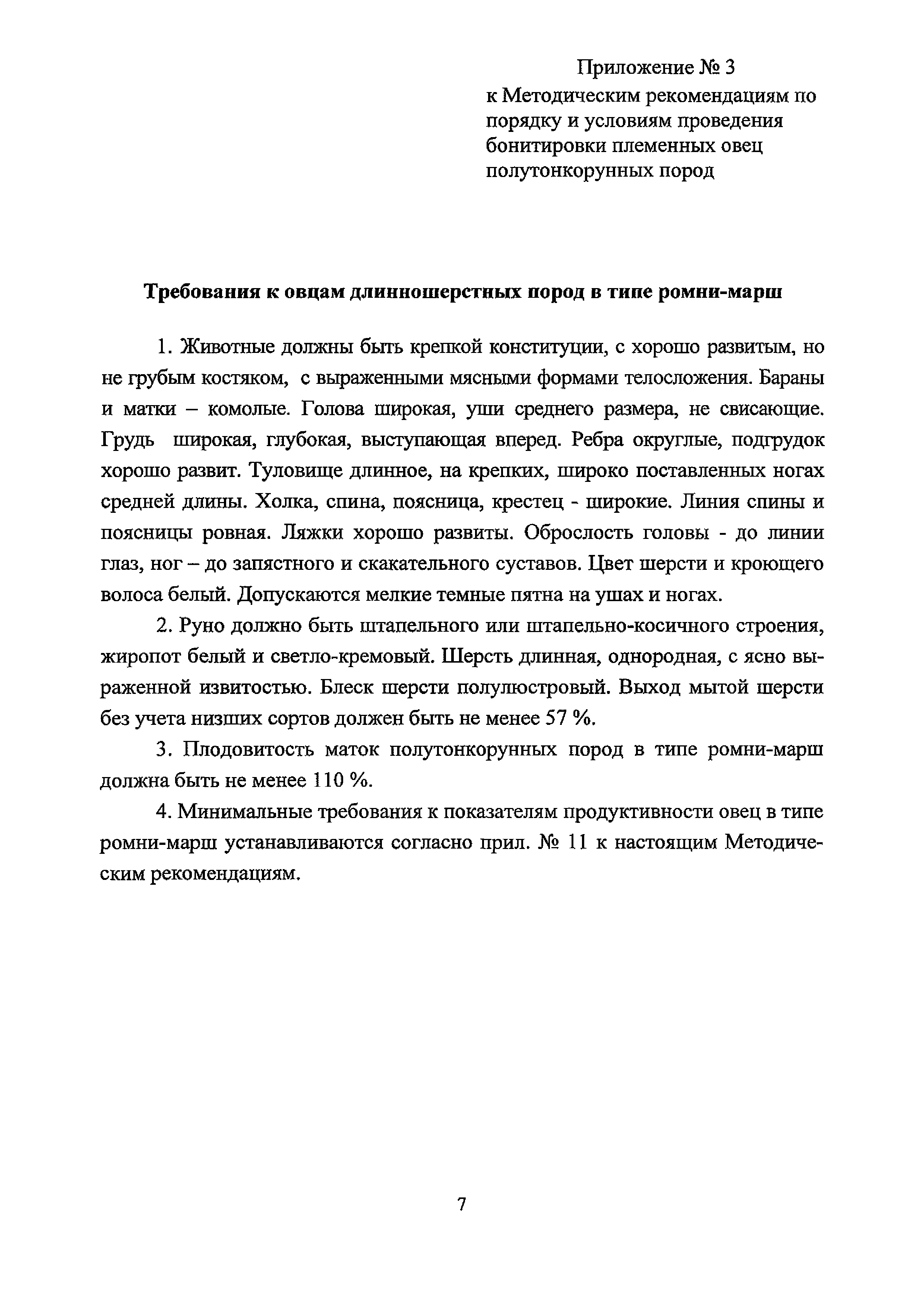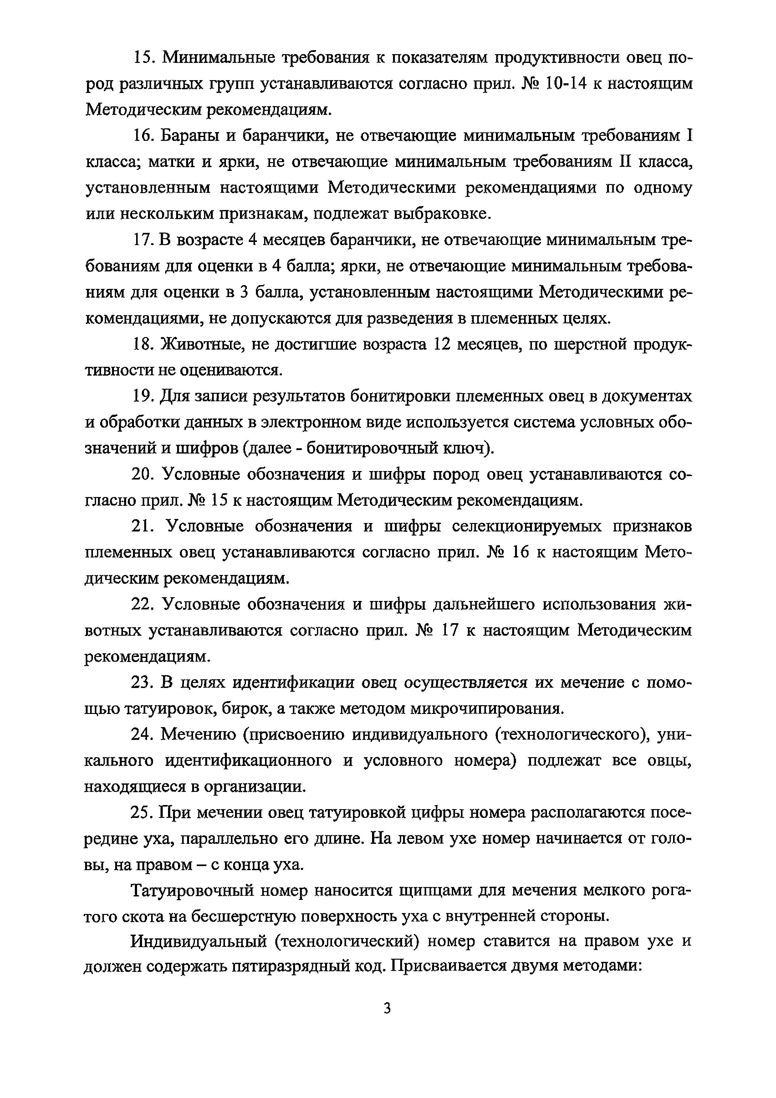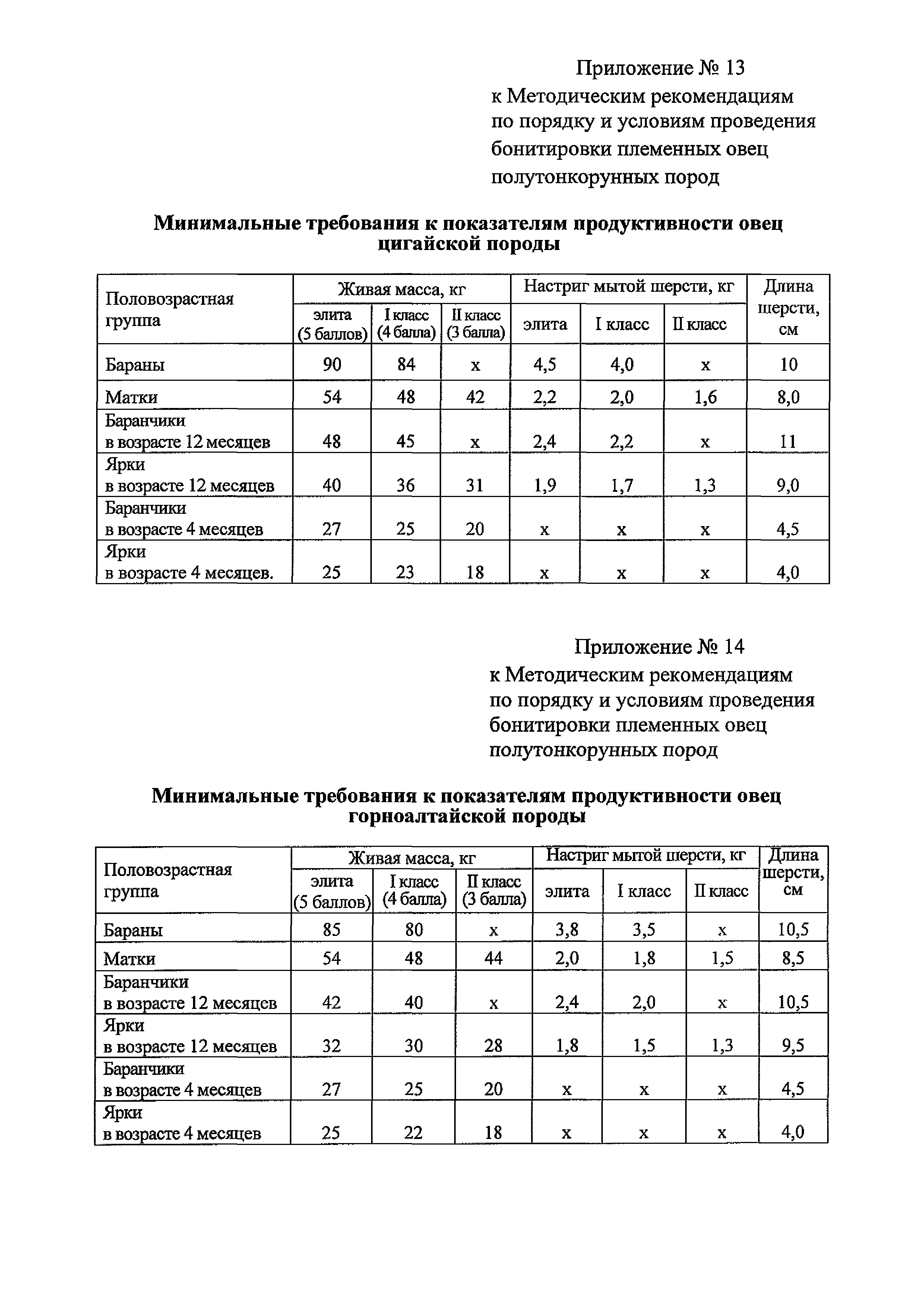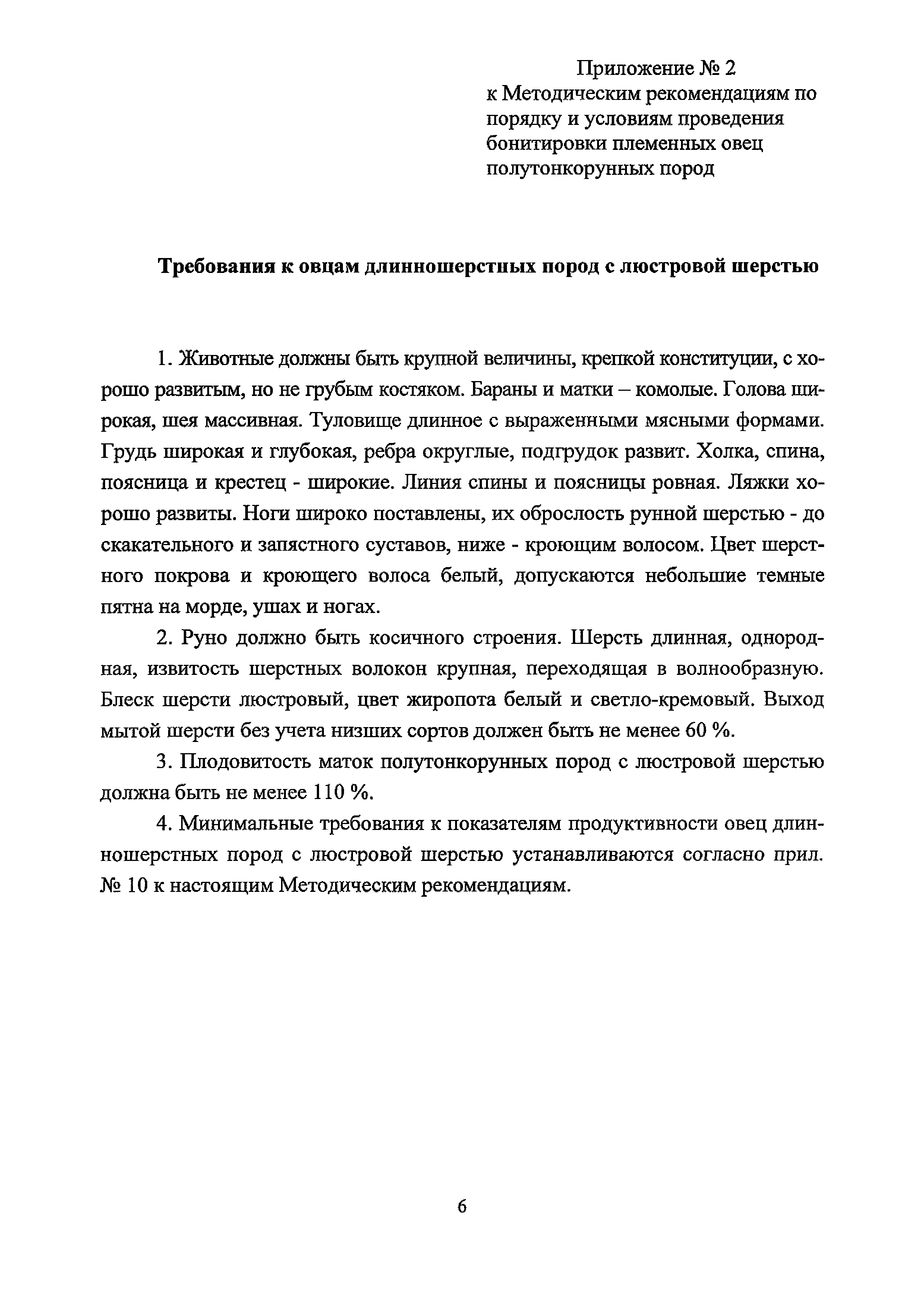 | Оглавление: | Приложение 1. Разделение полутонкорунных овец на группы Приложение 2. Требования к овцам длинношерстных пород с люстровой шерстью Приложение 3. Требования к овцам длинношерстных пород в типе ромни-марш Приложение 4. Требования к овцам длинношерстных пород в типе корридель Приложение 5. Требования к овцам цигайской породы Приложение 6. Требования к овцам горноалтайской породы Приложение 7. Условные обозначения оценки особенностей экстерьера Приложение 8. Шкала оценки качества шерсти Приложение 9. Признаки, оцениваемые при бонитировке овец различных половозрастных групп Приложение 10. Минимальные требования к показателям продуктивности овец длинношерстных пород с люстровой шерстью Приложение 11. Минимальные требования к показателям продуктивности овец пород в типе ромни-марш Приложение 12. Минимальные требования к показателям продуктивности овец пород в типе корридель Приложение 13. Минимальные требования к показателям продуктивности овец цигайской породы Приложение 14. Минимальные требования к показателям продуктивности овец горноалтайской породы Приложение 15. Шкала условных обозначений и шифров пород овец Приложение 16. Условные обозначения и шифры селекционируемых признаков племенных овец Приложение 17. Условные обозначения и шифры дальнейшего использования животных |