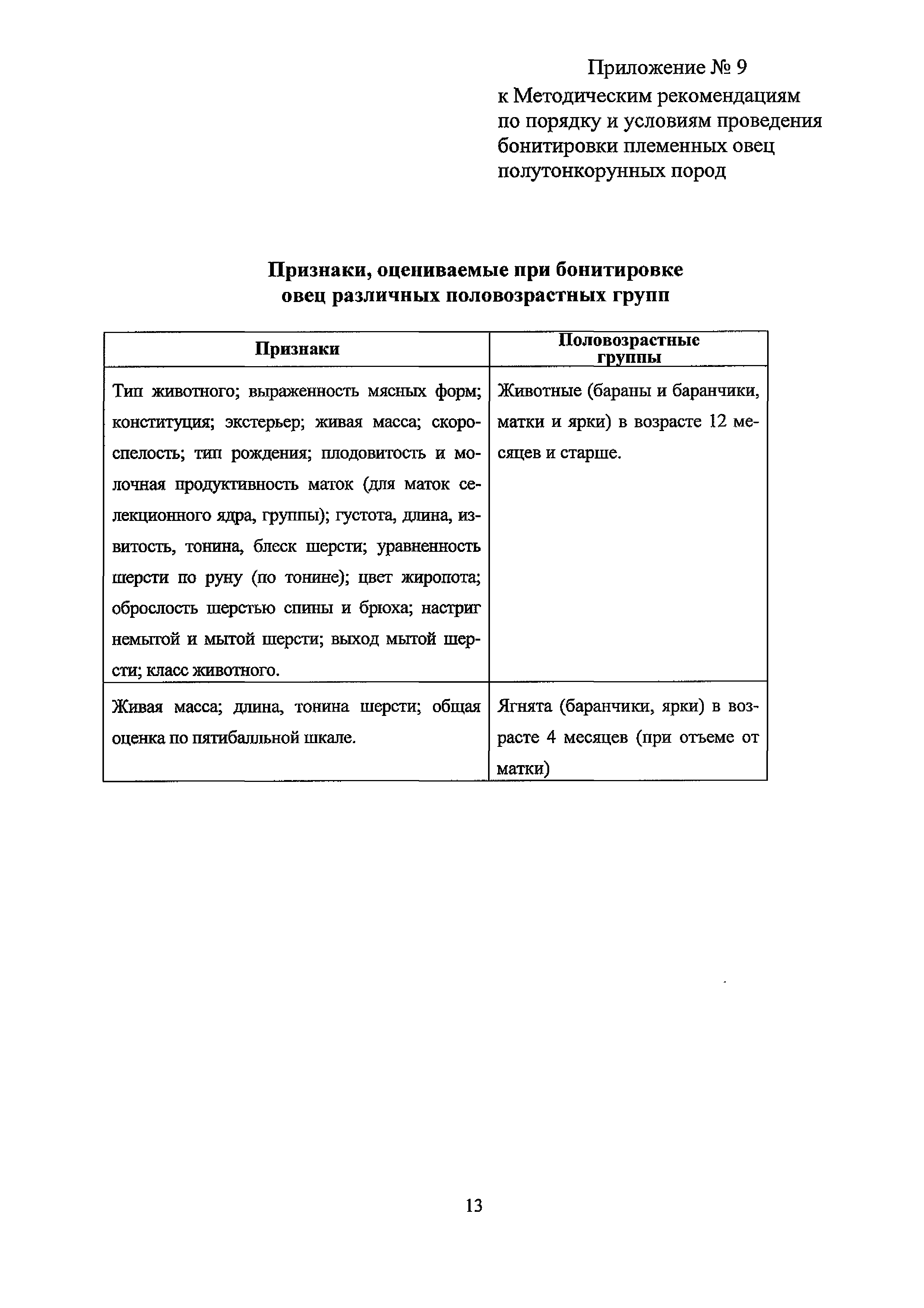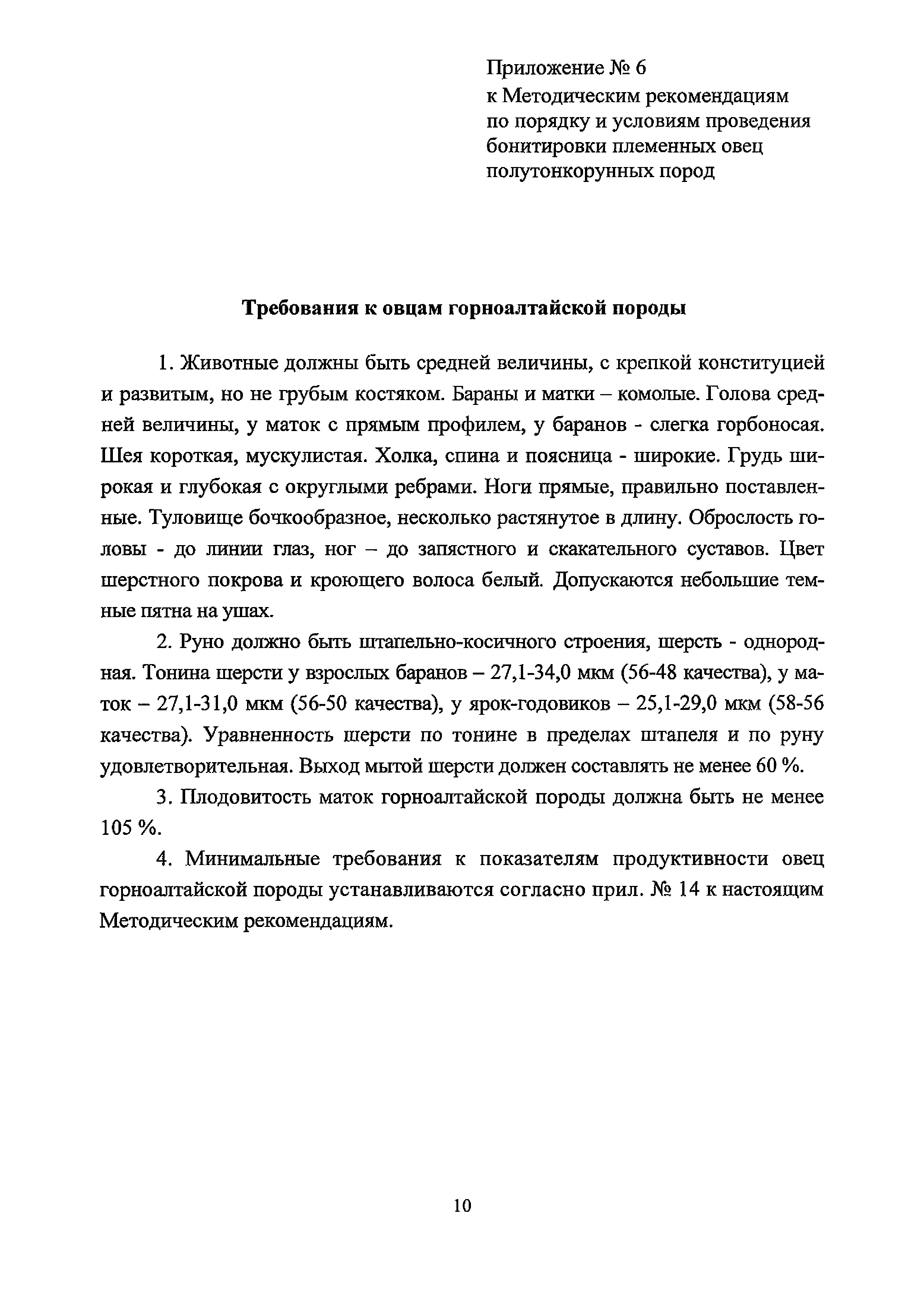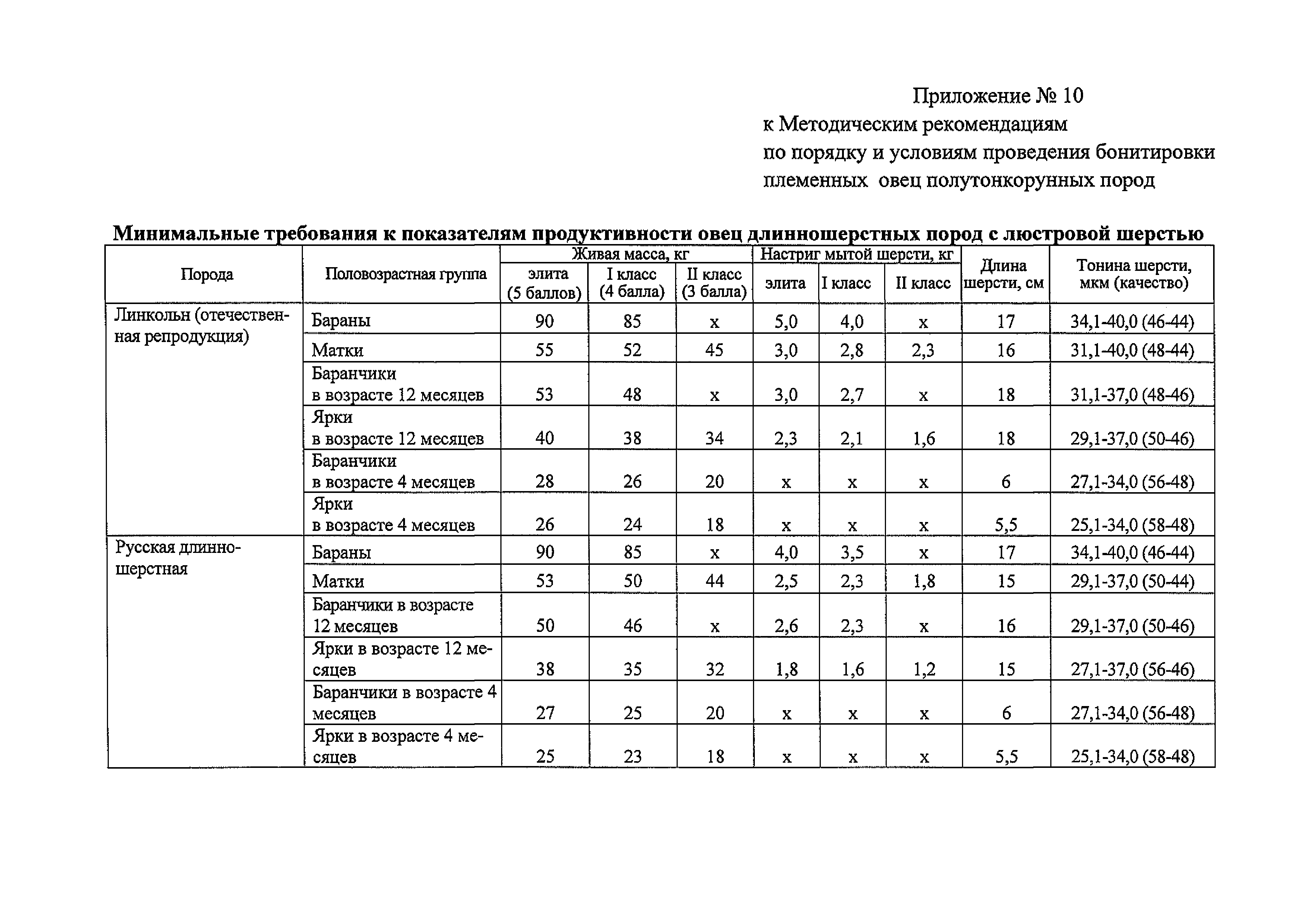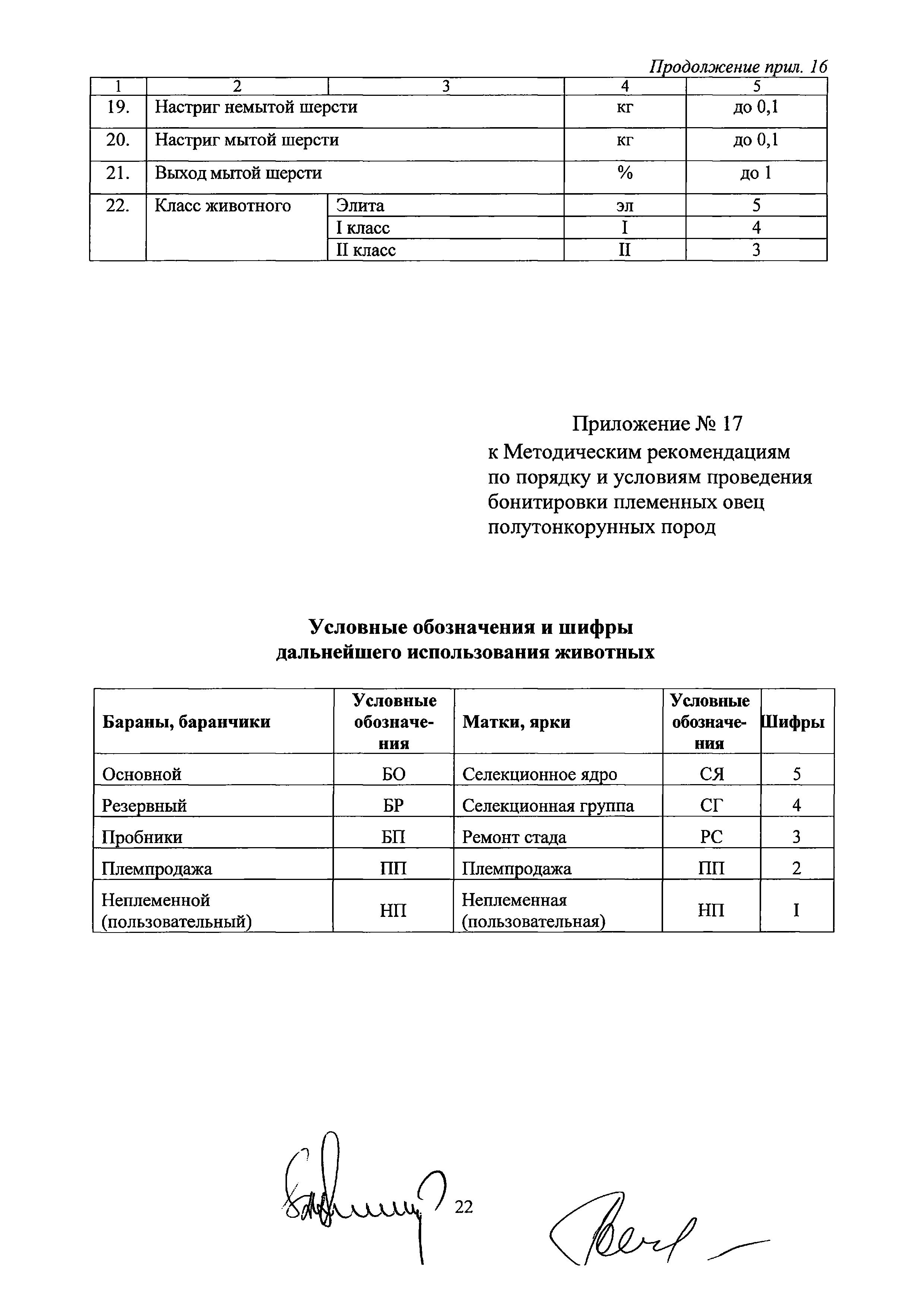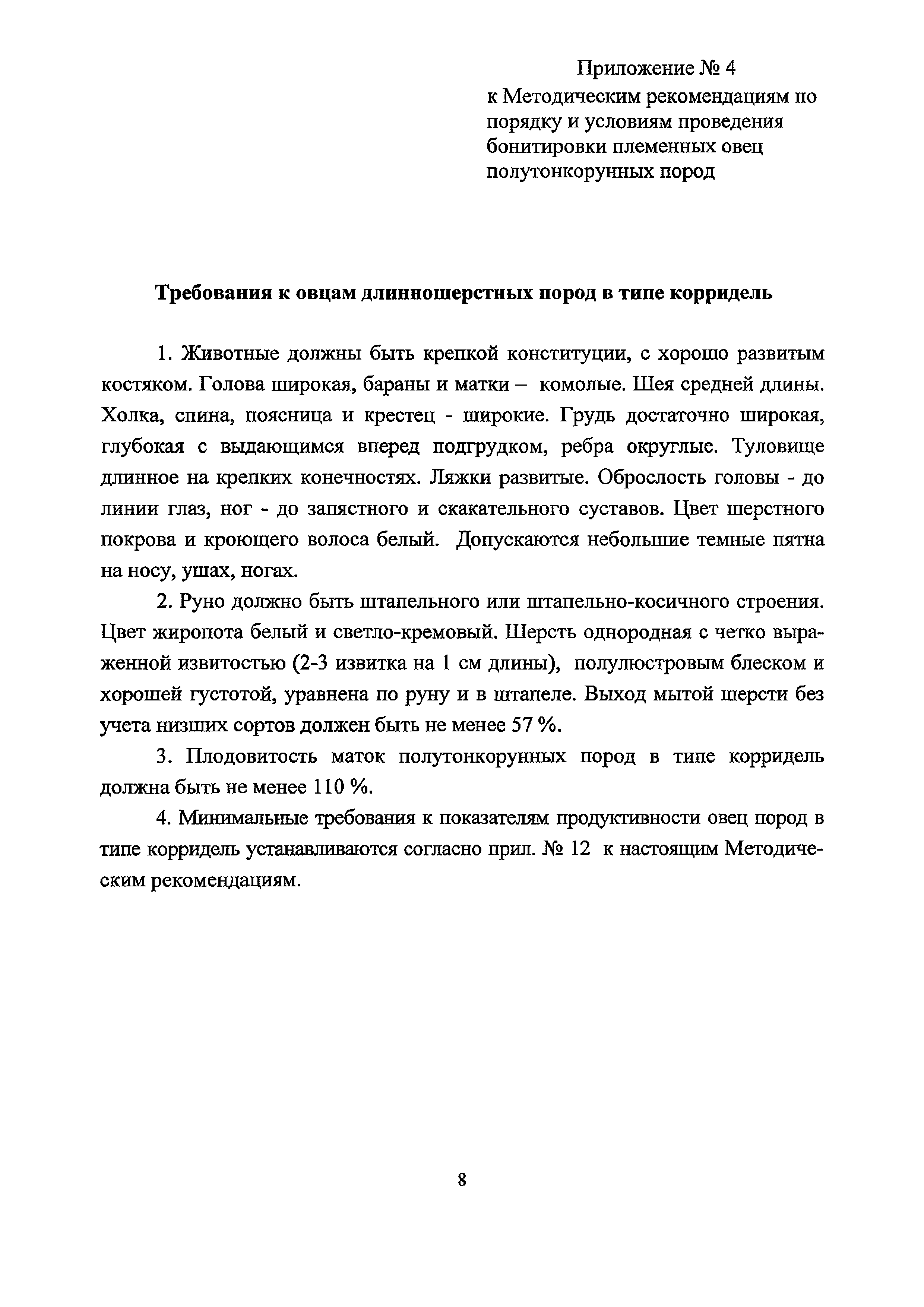 | Оглавление: | Приложение 1. Разделение полутонкорунных овец на группы Приложение 2. Требования к овцам длинношерстных пород с люстровой шерстью Приложение 3. Требования к овцам длинношерстных пород в типе ромни-марш Приложение 4. Требования к овцам длинношерстных пород в типе корридель Приложение 5. Требования к овцам цигайской породы Приложение 6. Требования к овцам горноалтайской породы Приложение 7. Условные обозначения оценки особенностей экстерьера Приложение 8. Шкала оценки качества шерсти Приложение 9. Признаки, оцениваемые при бонитировке овец различных половозрастных групп Приложение 10. Минимальные требования к показателям продуктивности овец длинношерстных пород с люстровой шерстью Приложение 11. Минимальные требования к показателям продуктивности овец пород в типе ромни-марш Приложение 12. Минимальные требования к показателям продуктивности овец пород в типе корридель Приложение 13. Минимальные требования к показателям продуктивности овец цигайской породы Приложение 14. Минимальные требования к показателям продуктивности овец горноалтайской породы Приложение 15. Шкала условных обозначений и шифров пород овец Приложение 16. Условные обозначения и шифры селекционируемых признаков племенных овец Приложение 17. Условные обозначения и шифры дальнейшего использования животных |