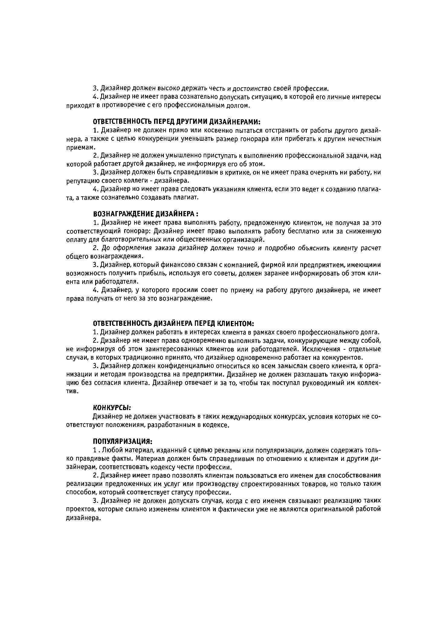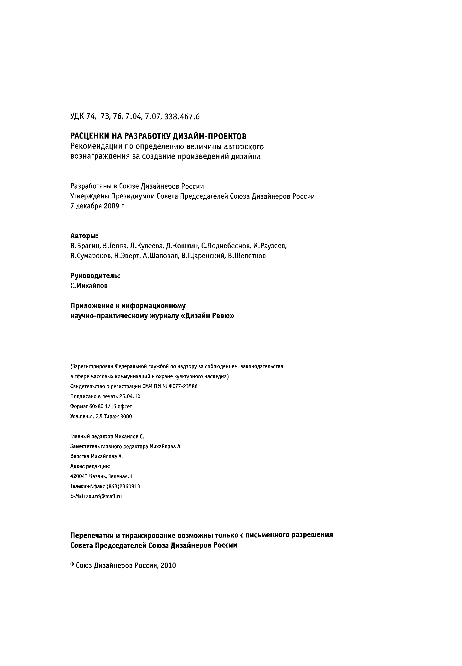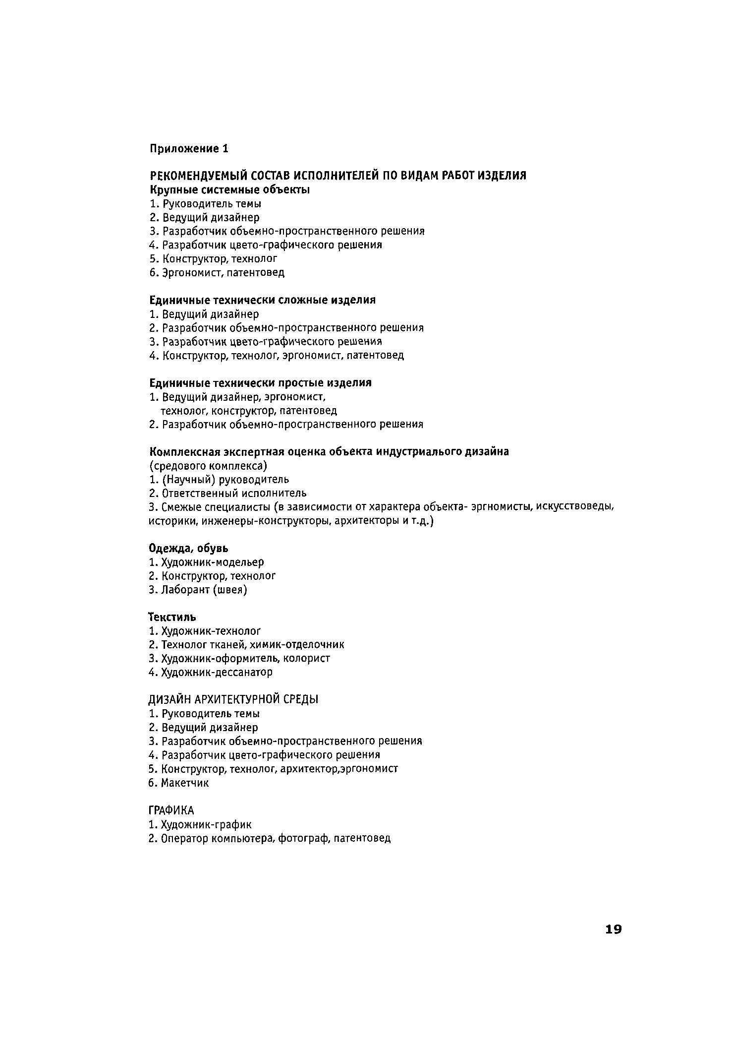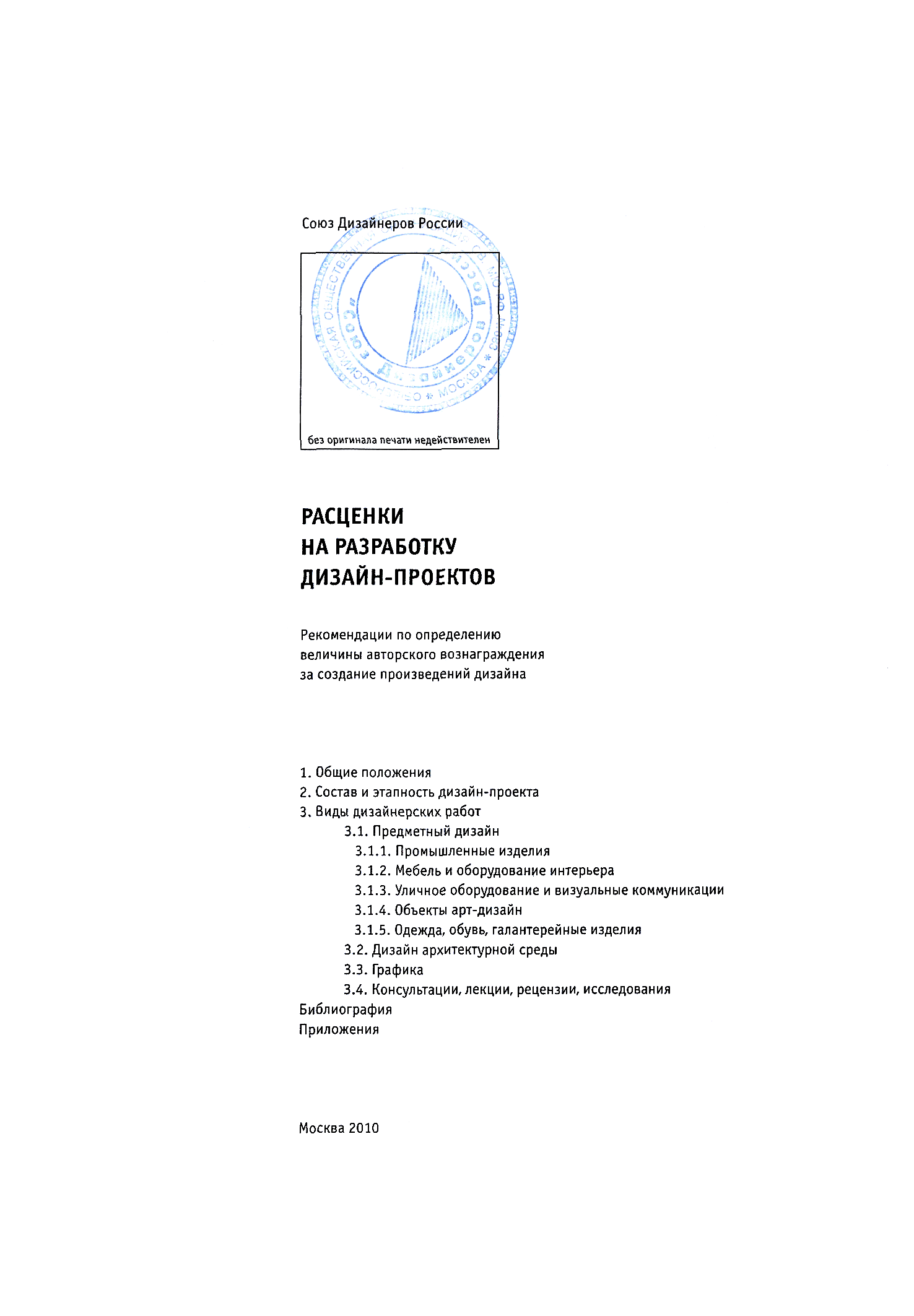 | Оглавление: | 1 Общие положения 2 Состав и этапность дизайн-проекта 3 Виды дизайнерских работ 3.1 Предметный дизайн 3.1.1. Промышленные изделия 3.1.2. Мебель и оборудование интерьера 3.1.3. Уличное оборудование и визуальные коммуникации 3.1.4. Одежда, обувь, галантерейные изделия 3.1.5. Текстиль 3.2 Дизайн архитектурной среды 3.3 Графика, упаковка и веб-дизайн 3.4 Комплексные дизайн-программы 4 Консультации, лекции, рецензии, экспертная и исследовательская деятельность Библиография Приложение 1. Рекомендуемый состав исполнителей по видам работ изделия Приложение 2. Обращение Союза Дизайнеров России Приложение 3. Форма договора по обеспечению авторских прав Приложение 4. Доверенность по обеспечению авторских прав Приложение 5. Сведения об авторе и его творческой деятельности Приложение 6. Закон "Об авторском праве и смежных правах" Российской Федерации (извлечения) Приложение 7. Международный профессиональный кодекс чести дизайнера. Образцовый кодекс поведения для дизайнеров |
