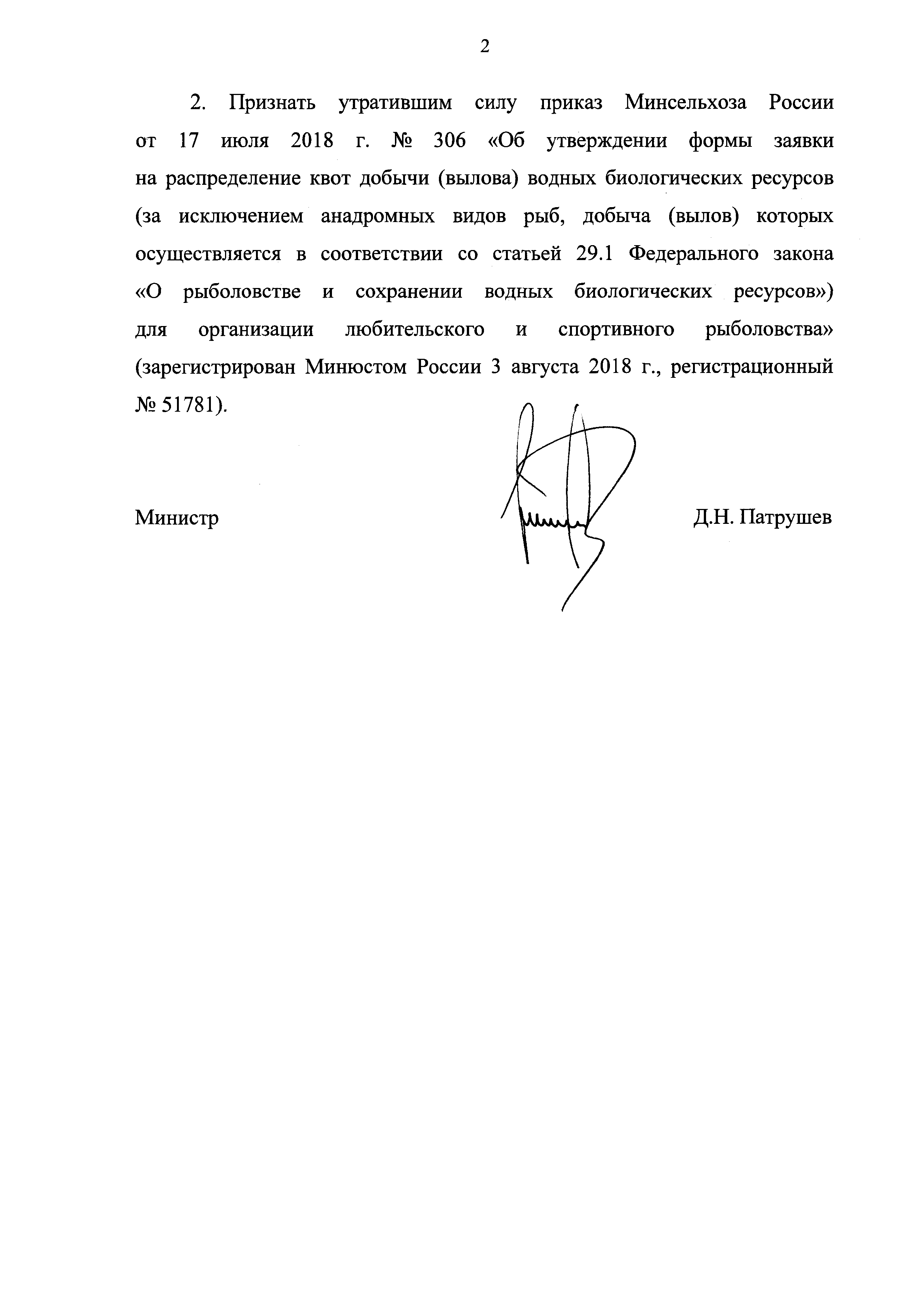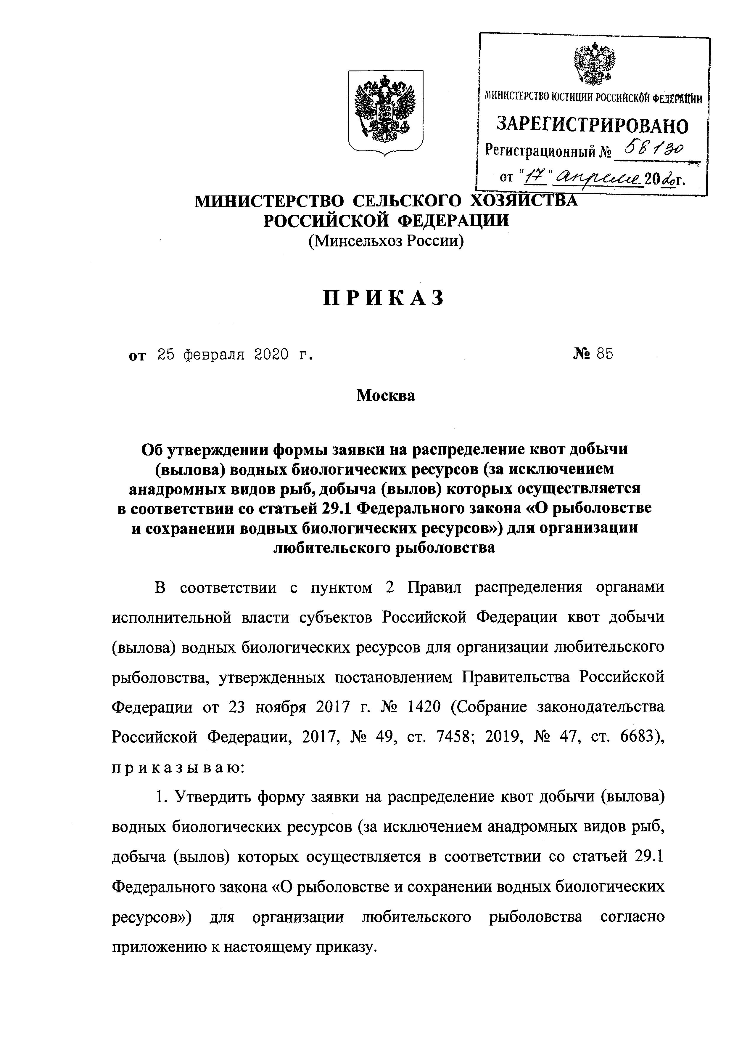 Форма заявки на распределение квот добычи (вылова) водных биологических ресурсов (за исключением анадромных видов рыб, добыча (вылов) которых осуществляется в соответствии со статьей 29.1 Федерального закона "О рыболовстве и сохранении водных биологических ресурсов") для организации любительского рыболовства| Статус: | действует | | Название рус.: | Форма заявки на распределение квот добычи (вылова) водных биологических ресурсов (за исключением анадромных видов рыб, добыча (вылов) которых осуществляется в соответствии со статьей 29.1 Федерального закона "О рыболовстве и сохранении водных биологических ресурсов") для организации любительского рыболовства | | Дата добавления в базу: | 01.01.2021 | | Дата актуализации: | 01.01.2021 | | Дата введения: | 28.04.2020 | | Утверждён: | 25.02.2020 Министерство сельского хозяйства Российской Федерации (85)