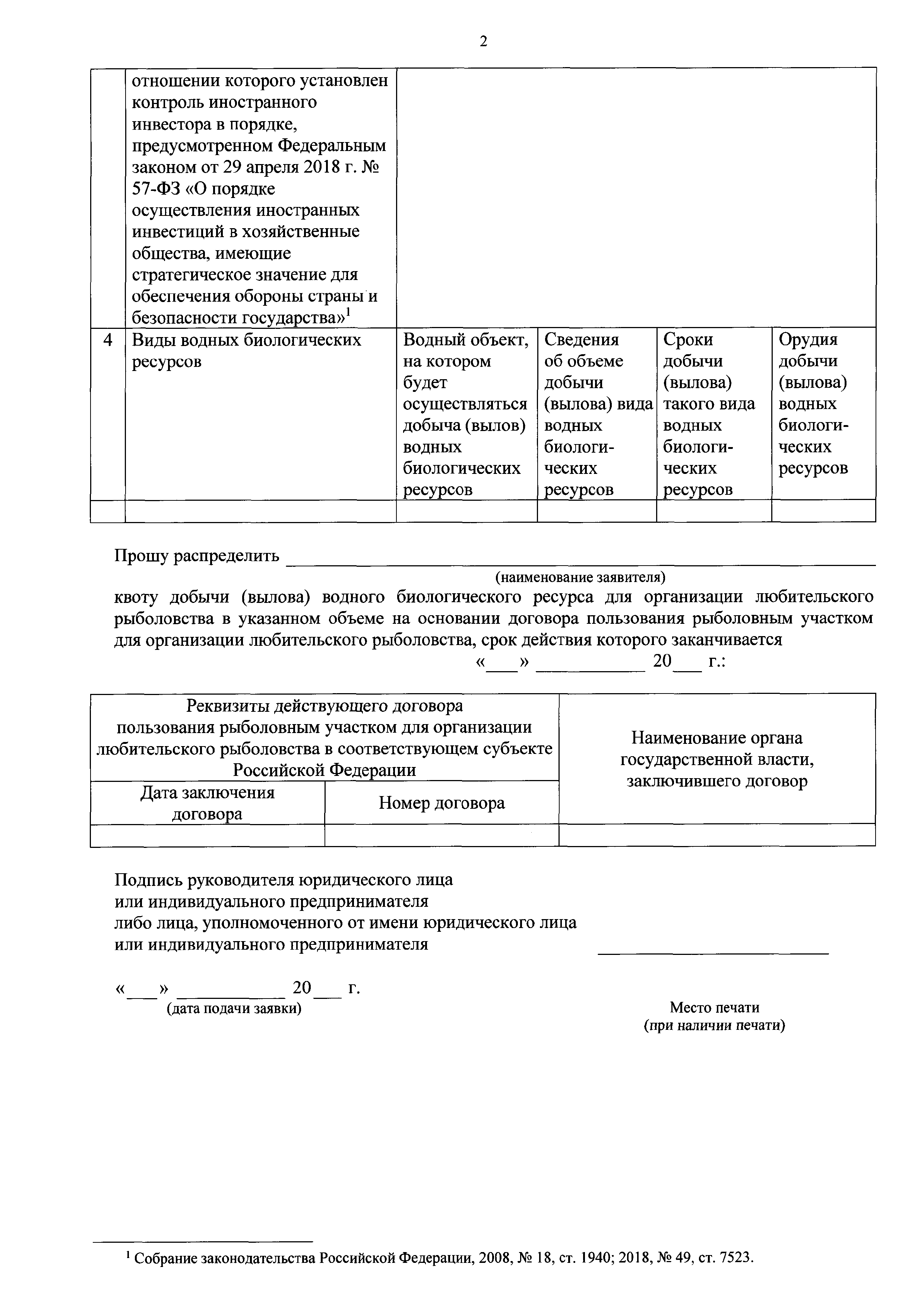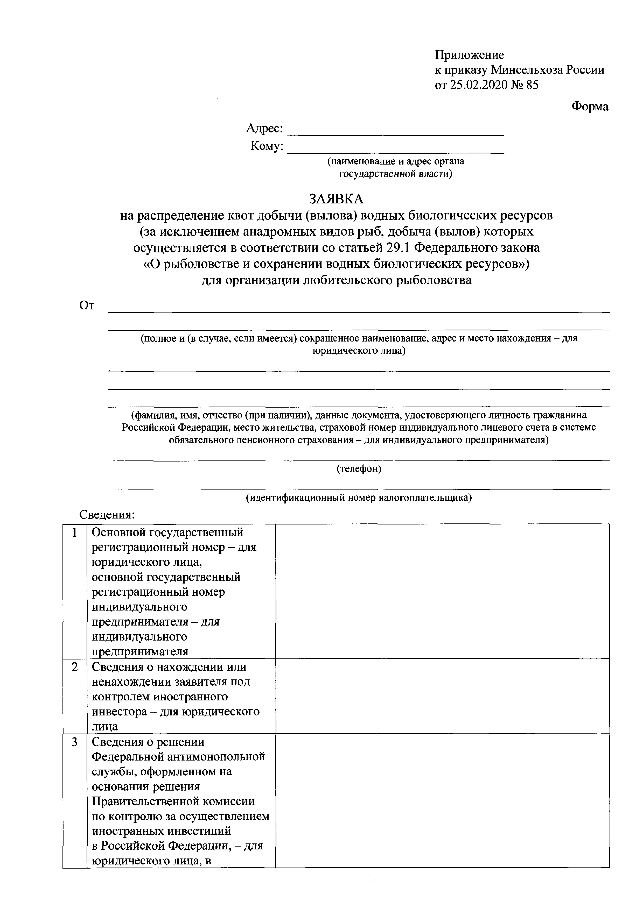 Скачать Форма заявки на распределение квот добычи (вылова) водных биологических ресурсов (за исключением анадромных видов рыб, добыча (вылов) которых осуществляется в соответствии со статьей 29.1 Федерального закона О рыболовстве и сохранении водных биологических ресурсов) для организации любительского рыболовстваДата актуализации: 01.01.2021