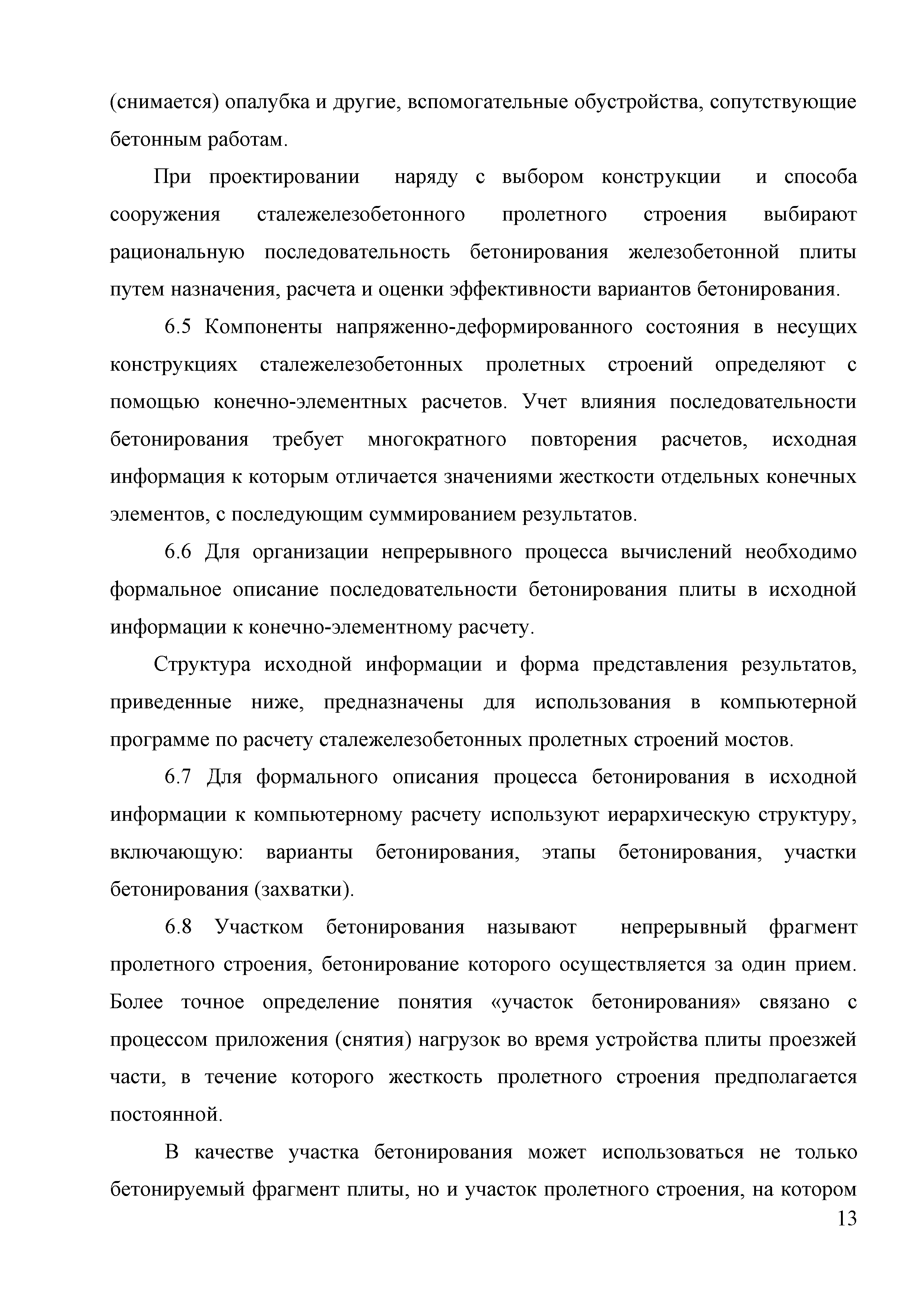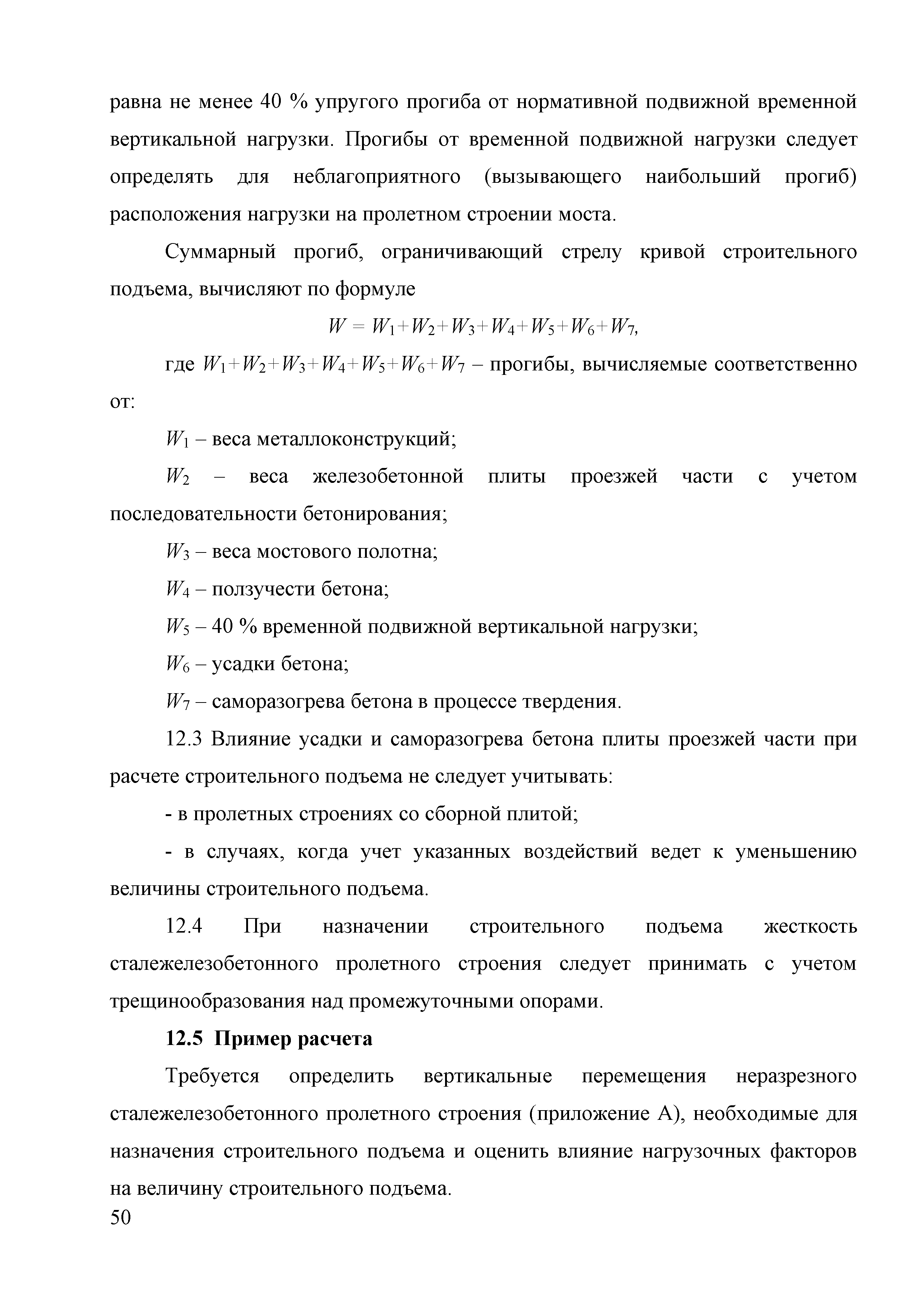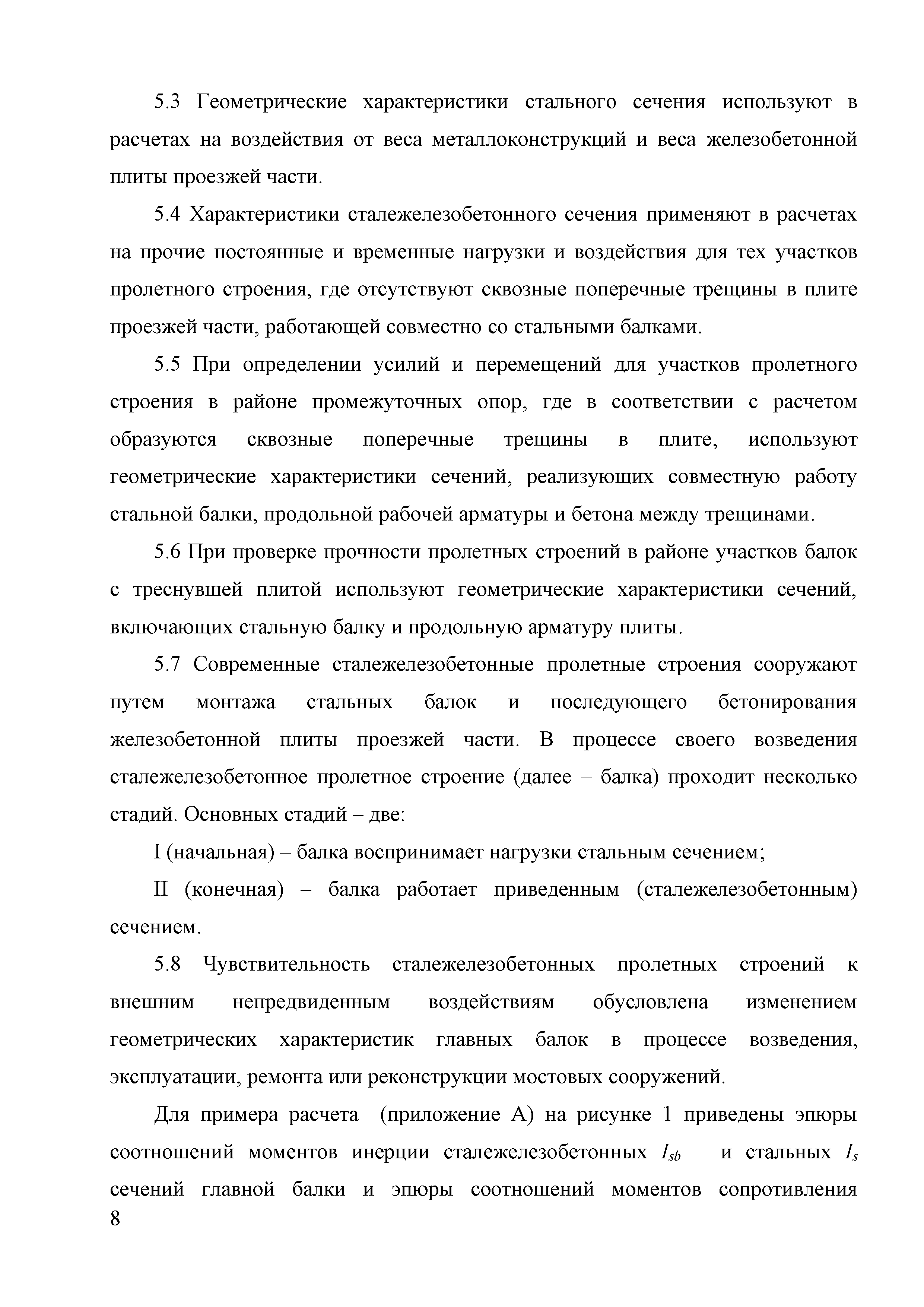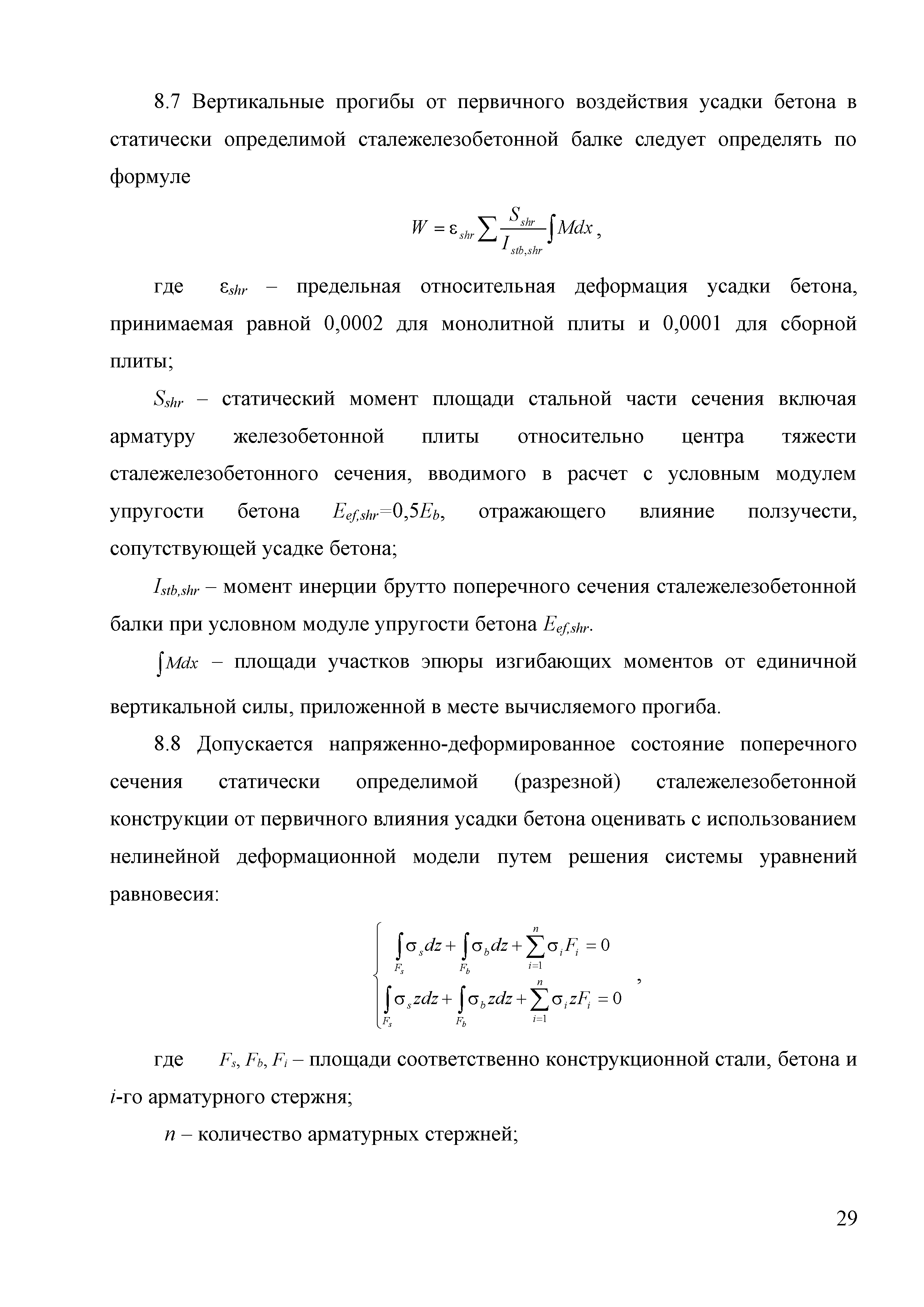 | Оглавление: | 1 Область применения 2 Нормативные ссылки 3 Термины и определения 4 Общие положения 5 Чувствительность сталежелезобетонных пролетных строений к внешним воздействиям 6 Учет последовательности бетонирования (монтажа) плиты проезжей части при определении нагрузочного эффекта 7 Влияние наличия трещин в плите на работу сталежелезобетонных пролетных строений 8 Расчет на воздействие усадки бетона 9 Расчет на воздействие ползучести бетона 10 Саморазогрев бетона в процессе твердения 11 Температурные перепады между стальной и железобетонной частями сечения 12 Определение ординат строительного подъема 13 Расчет на временные подвижные нагрузки Приложение А Краткое описание исходных данных к примерам расчета сталежелезобетонного пролетного строения |