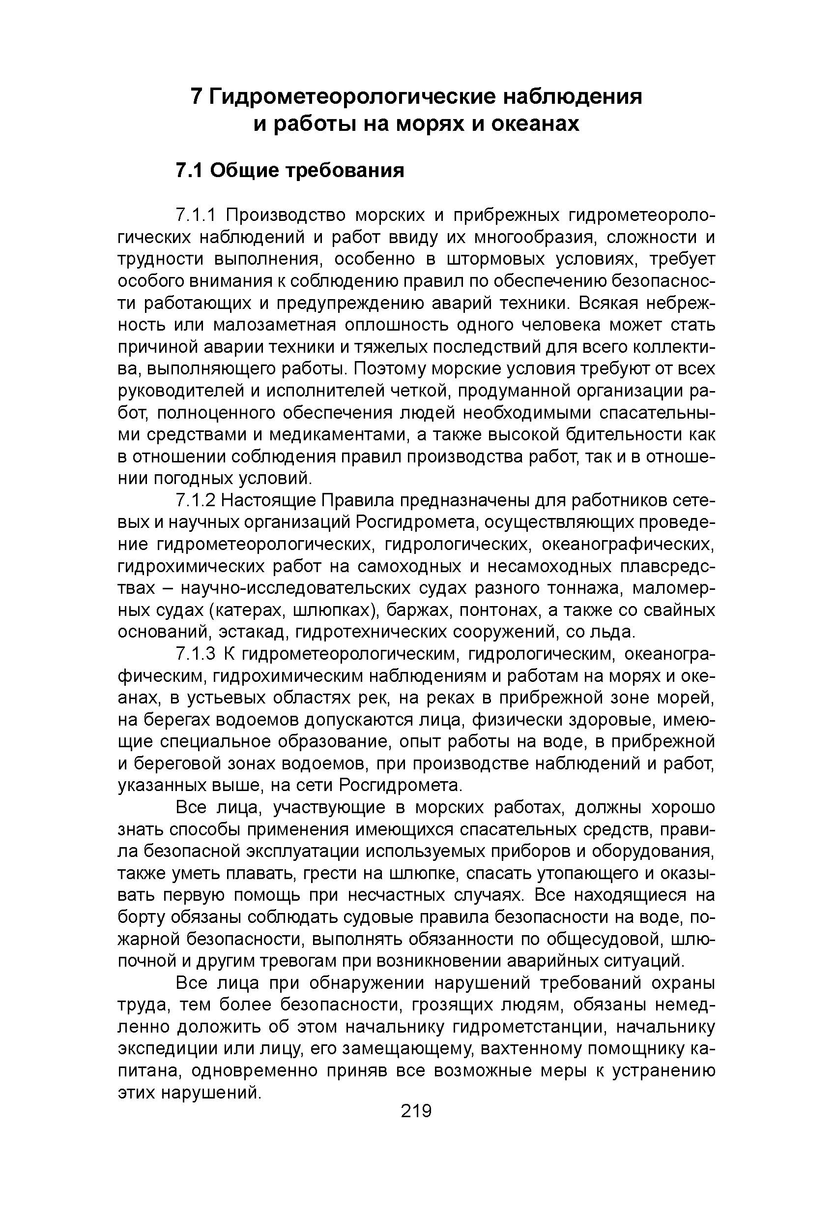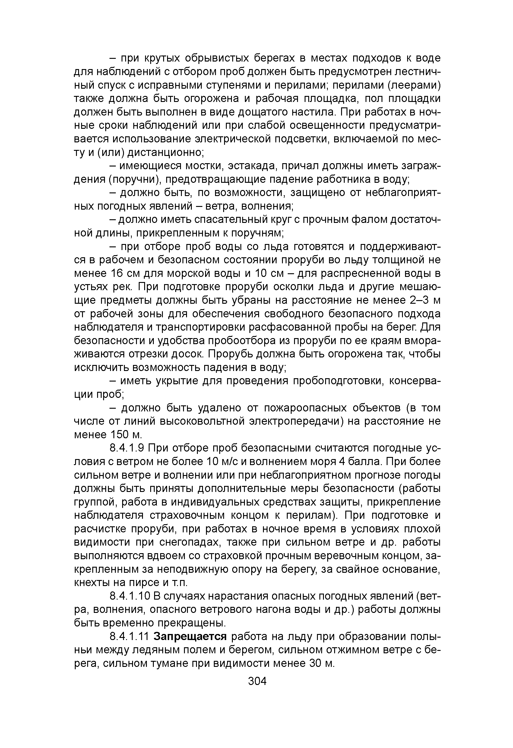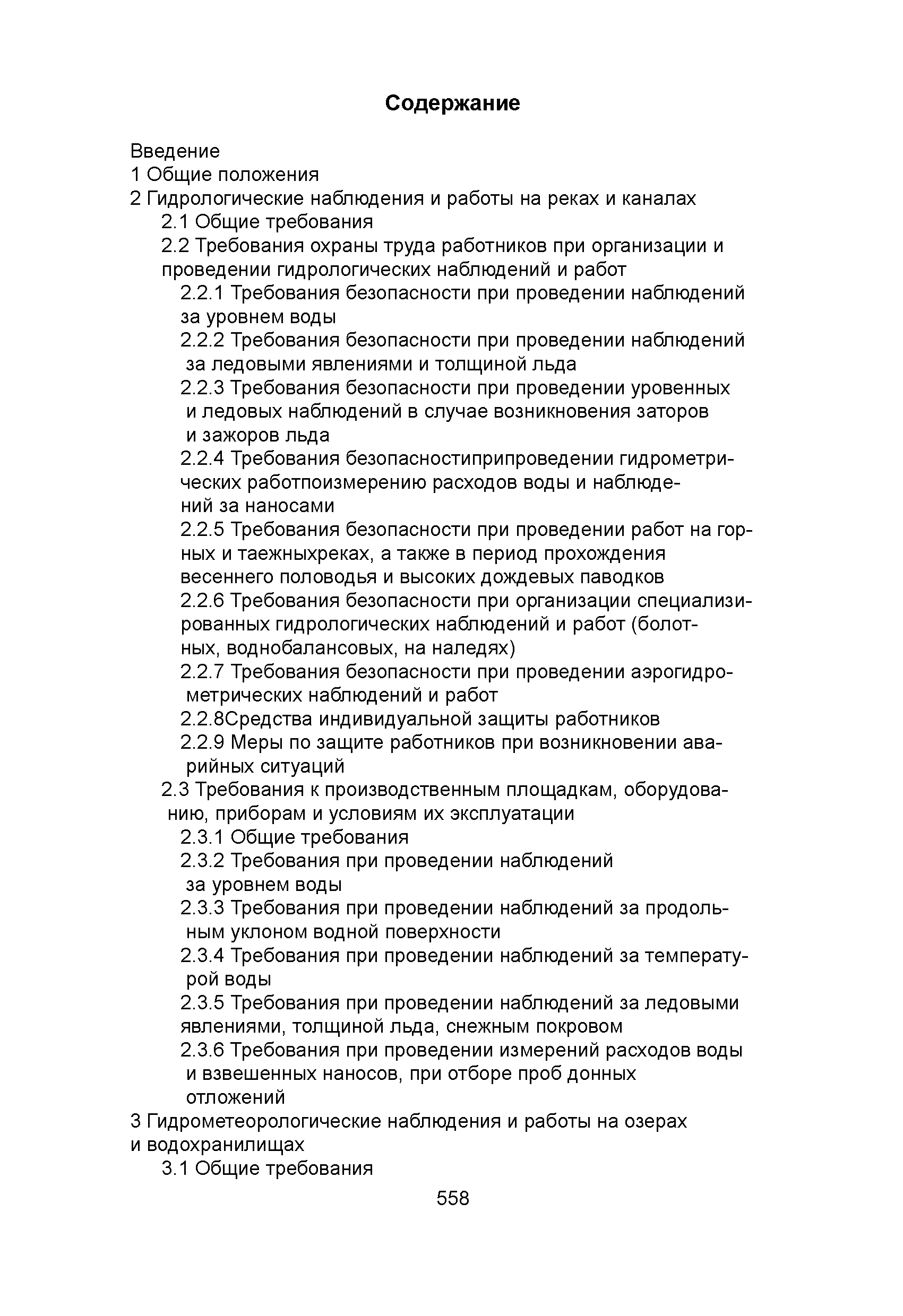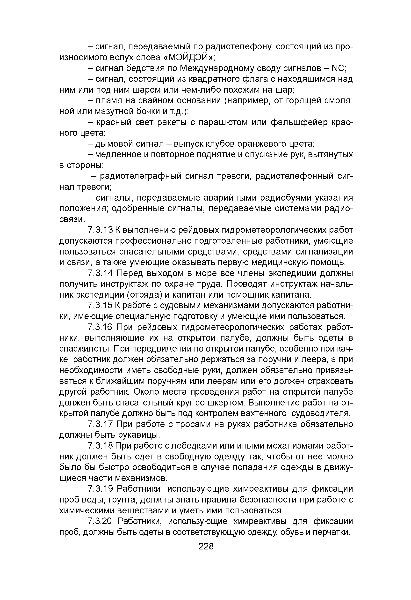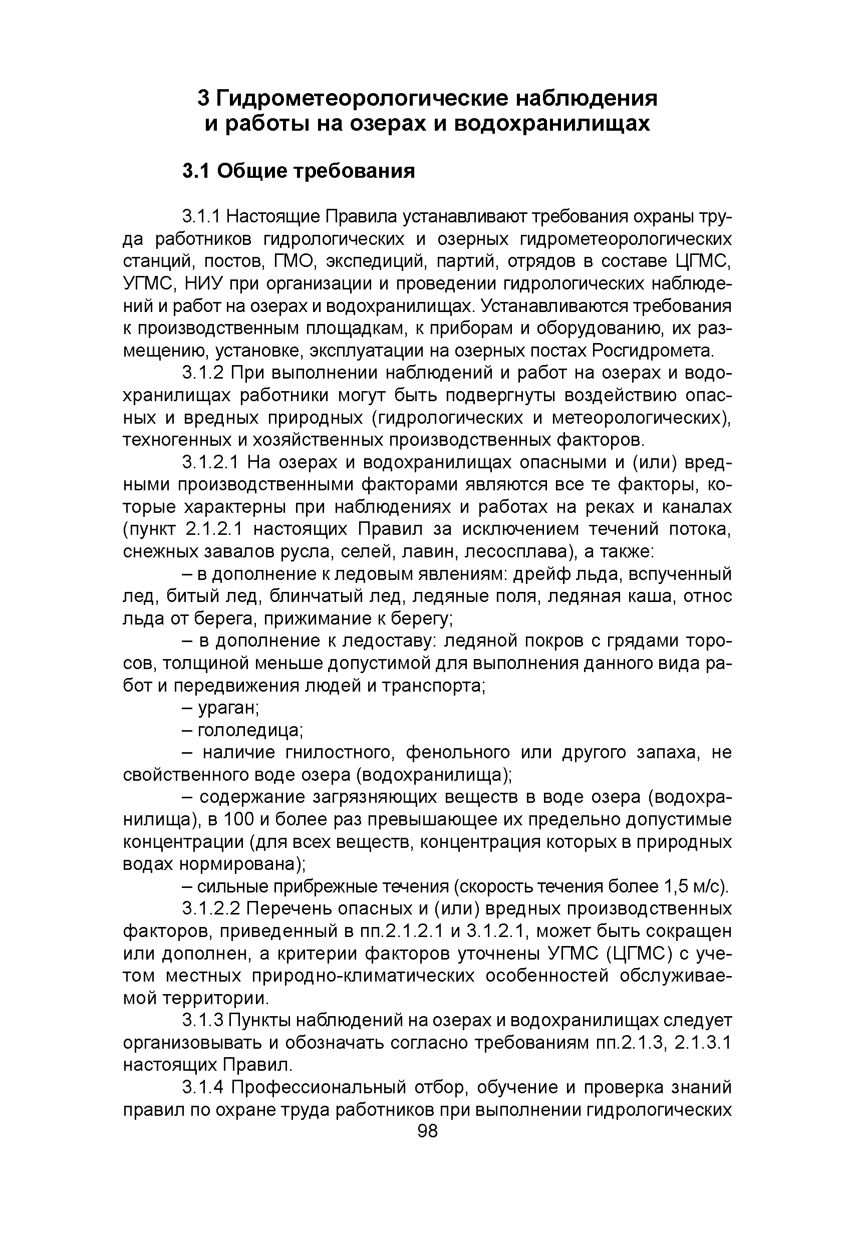 | Оглавление: | Введение 1 Общие положения 2 Гидрологические наблюдения и работы на реках и каналах 2.1 Общие требования 2.2 Требования охраны труда работников при организации и проведении гидрологических наблюдений и работ 2.2.1 Требования безопасности при проведении наблюдений за уровнем воды 2.2.2 Требования безопасности при проведении наблюдений за ледовыми явлениями и толщиной льда 2.2.3 Требования безопасности при проведении уровенных и ледовых наблюдений в случае возникновения заторов и зажоров льда 2.2.4 Требования безопасности при проведении гидрометрических работ по измерению расходов воды и наблюдений за наносами 2.2.5 Требования безопасности при проведении работ на горных и таежных реках, а также в период прохождения весеннего половодья и высоких дождевых паводков 2.2.6 Требования безопасности при организации специализированных гидрологических наблюдений и работ (болотных, воднобалансовых, на наледях) 2.2.7 Требования безопасности при проведении аэрогидрометрических наблюдений и работ 2.2.8 Средства индивидуальной защиты работников 2.2.9 Меры по защите работников при возникновении аварийных ситуаций 2.3 Требования к производственным площадкам, оборудованию, приборам и условиям их эксплуатации 2.3.1 Общие требования 2.3.2 Требования при проведении наблюдений за уровнем воды 2.3.3 Требования при проведении наблюдений за продольным уклоном водной поверхности 2.3.4 Требования при проведении наблюдений за температурой воды 2.3.5 Требования при проведении наблюдений за ледовыми явлениями, толщиной льда, снежным покровом 2.3.6 Требования при проведении измерений расходов воды и взвешенных наносов, при отборе проб донных отложений 3 Гидрометеорологические наблюдения и работы на озерах и водохранилищах 3.1 Общие требования 3.2 Требования охраны труда работников при организации и проведении гидрометеорологических наблюдений и работ 3.2.1 Общие требования 3.2.2 Требования безопасности при проведении гидрометеорологических наблюдений и работ в прибрежной зоне водоемов 3.2.3 Требования безопасности при проведении гидрометеорологических наблюдений и работ на открытой акватории водоемов 3.2.4 Требования безопасности при проведении наблюдений за ледяным покровом 3.2.5 Средства индивидуальной защиты работников 3.2.6 Защита работников при возникновении аварийных ситуаций 3.3 Требования к производственным площадкам 3.3.1 Требования к площадкам для производства гидрометеорологических наблюдений и работ в прибрежной зоне водоемов 3.3.2 Требования к площадкам для гидрометеорологических наблюдений и работ на открытой акватории водоемов 3.3.3 Требования к площадкам для наблюдений за ледяным покровом 3.4 Требования к приборам, оборудованию и условиям их эксплуатации 4 Гидрографические обследования 4.1 Общие требования 4.2 Требования охраны труда работников при организации и проведении гидрографических обследований 4.2.1 Требования безопасности при движении по маршрутам 4.2.2 Требования безопасности при переправах через реки, озера, другие водные преграды и лавины 4.2.3 Требования безопасности при проведении маршрутных снегомерных съемок на равнинной территории 4.2.4 Требования безопасности при применении авиационного транспорта 4.2.5 Средства индивидуальной защиты работников 4.2.6 Защита работников при возникновении аварийных ситуаций 4.3 Требования к пло