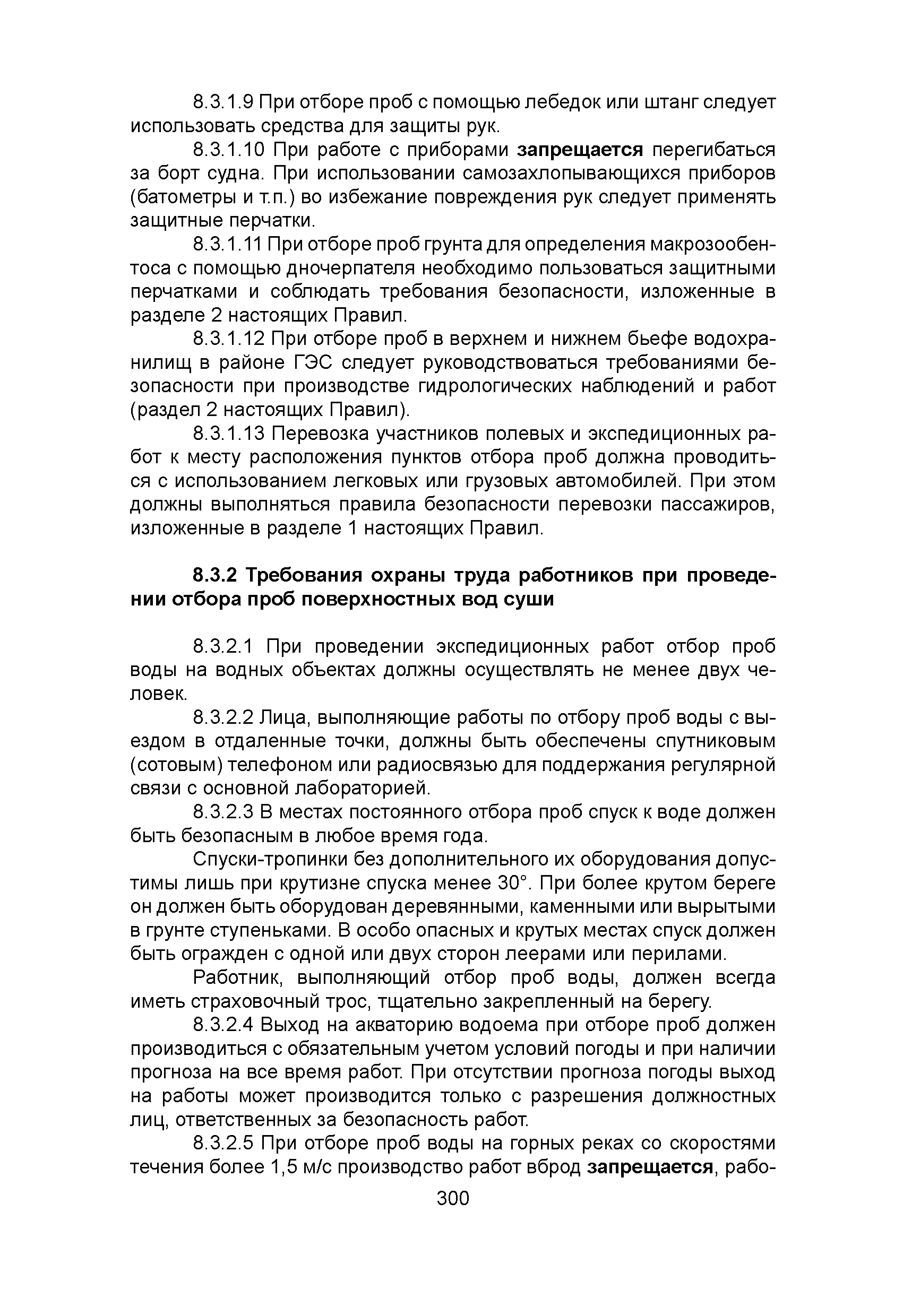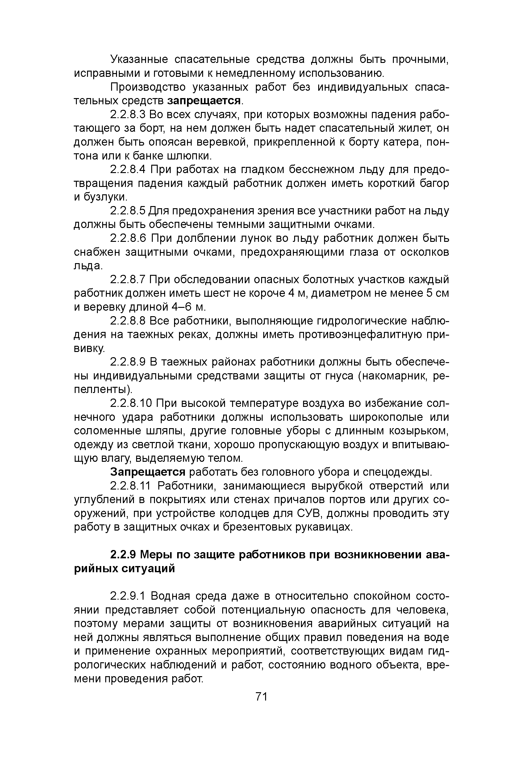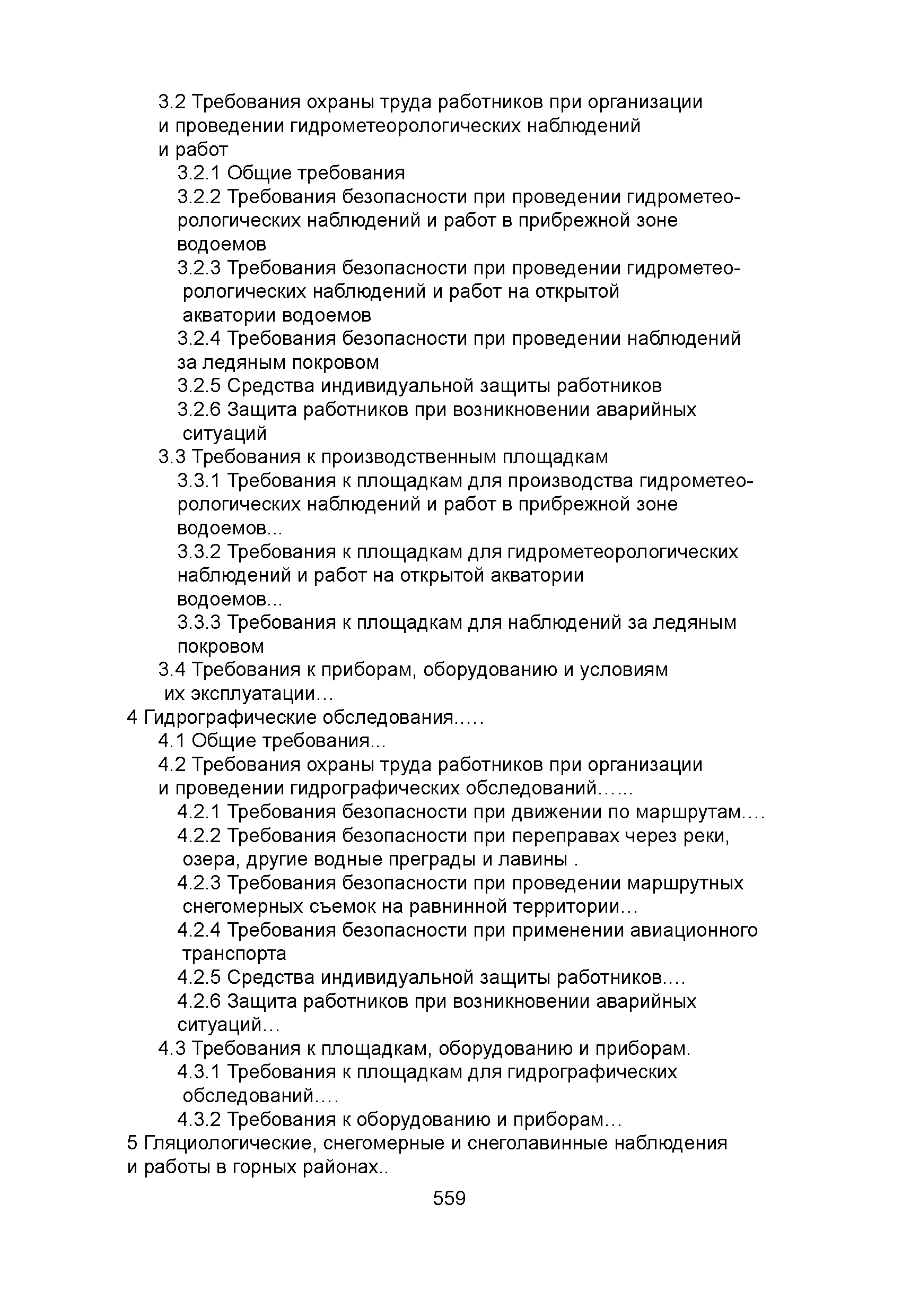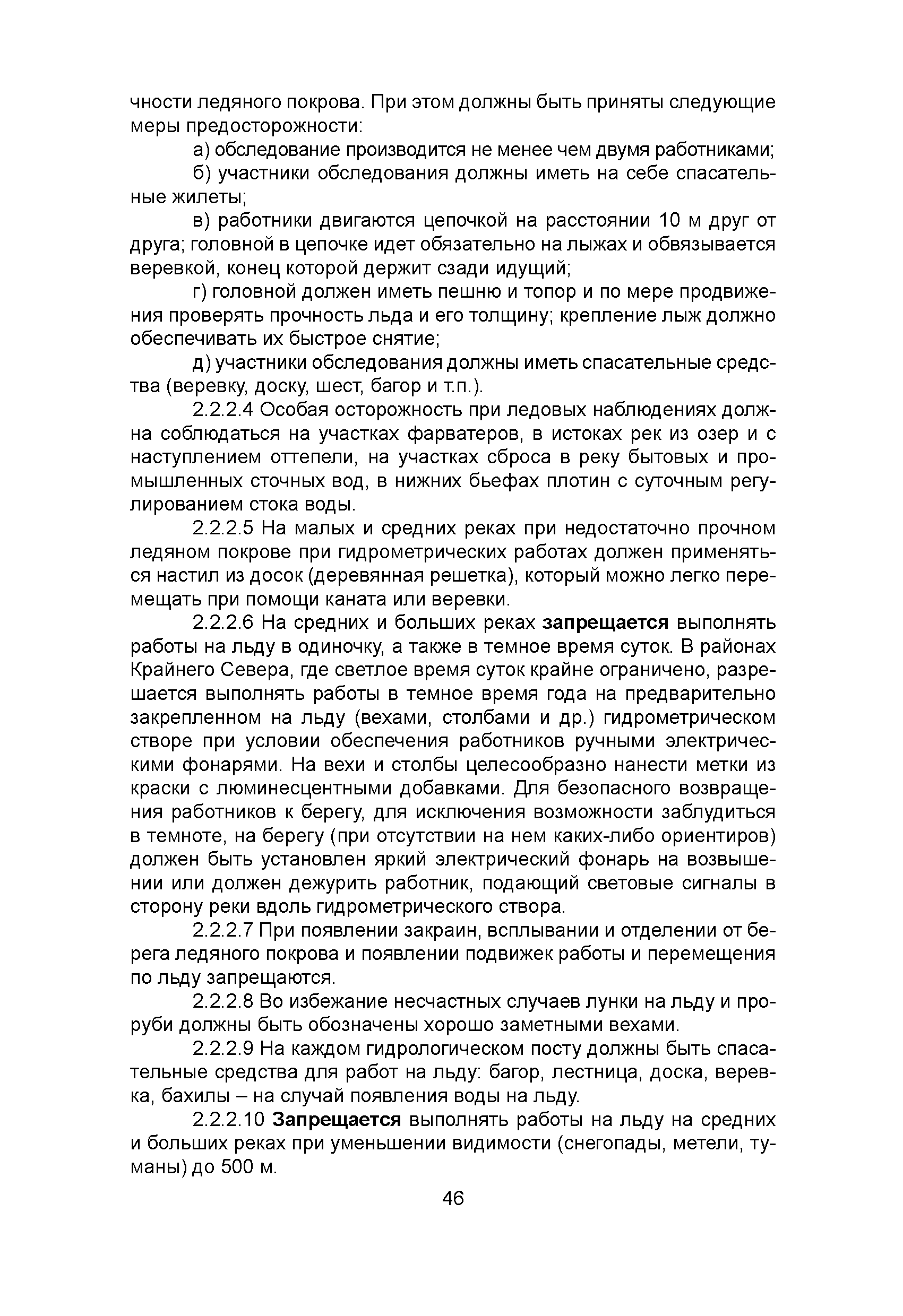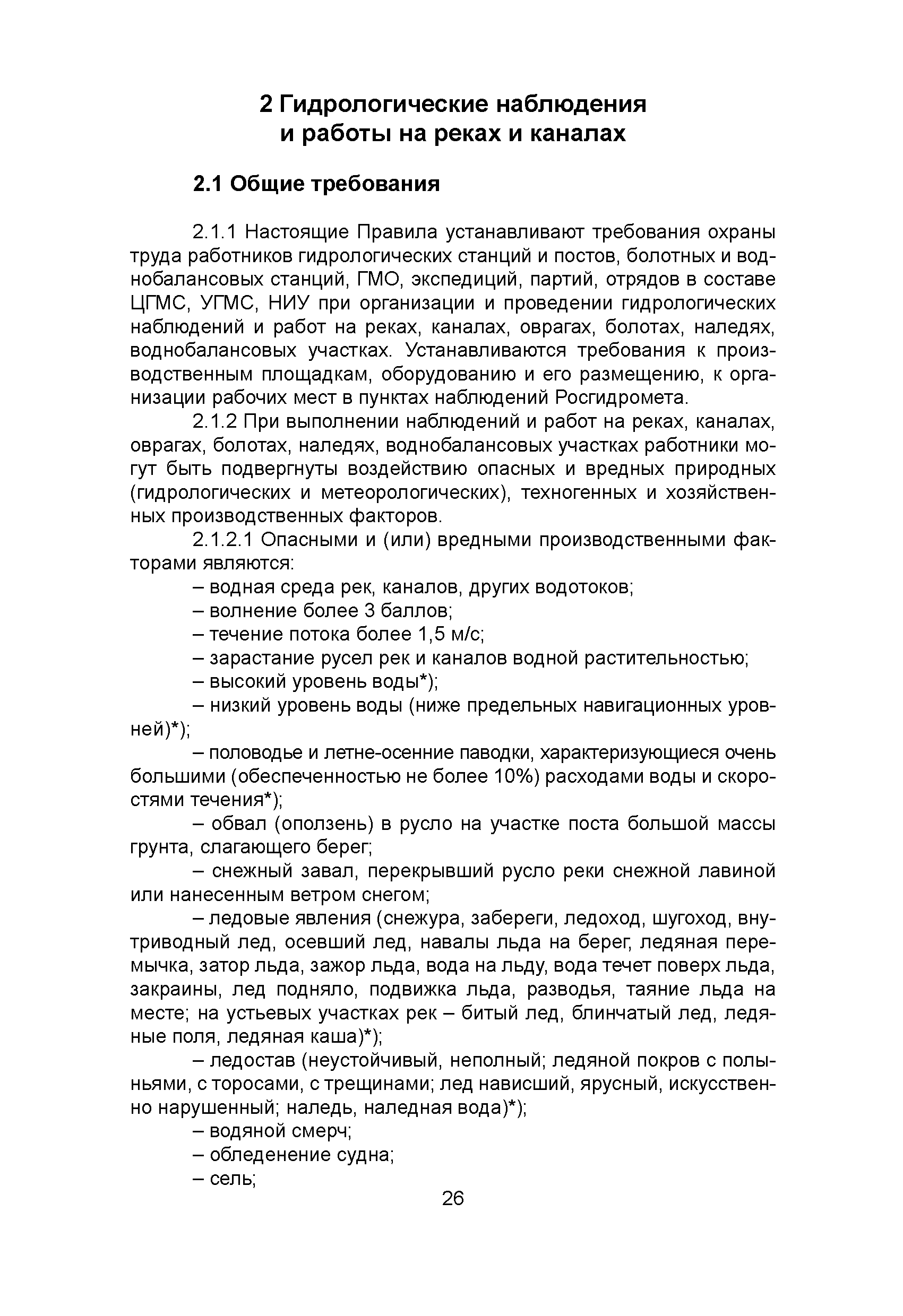 | Оглавление: | Введение 1 Общие положения 2 Гидрологические наблюдения и работы на реках и каналах 2.1 Общие требования 2.2 Требования охраны труда работников при организации и проведении гидрологических наблюдений и работ 2.2.1 Требования безопасности при проведении наблюдений за уровнем воды 2.2.2 Требования безопасности при проведении наблюдений за ледовыми явлениями и толщиной льда 2.2.3 Требования безопасности при проведении уровенных и ледовых наблюдений в случае возникновения заторов и зажоров льда 2.2.4 Требования безопасности при проведении гидрометрических работ по измерению расходов воды и наблюдений за наносами 2.2.5 Требования безопасности при проведении работ на горных и таежных реках, а также в период прохождения весеннего половодья и высоких дождевых паводков 2.2.6 Требования безопасности при организации специализированных гидрологических наблюдений и работ (болотных, воднобалансовых, на наледях) 2.2.7 Требования безопасности при проведении аэрогидрометрических наблюдений и работ 2.2.8 Средства индивидуальной защиты работников 2.2.9 Меры по защите работников при возникновении аварийных ситуаций 2.3 Требования к производственным площадкам, оборудованию, приборам и условиям их эксплуатации 2.3.1 Общие требования 2.3.2 Требования при проведении наблюдений за уровнем воды 2.3.3 Требования при проведении наблюдений за продольным уклоном водной поверхности 2.3.4 Требования при проведении наблюдений за температурой воды 2.3.5 Требования при проведении наблюдений за ледовыми явлениями, толщиной льда, снежным покровом 2.3.6 Требования при проведении измерений расходов воды и взвешенных наносов, при отборе проб донных отложений 3 Гидрометеорологические наблюдения и работы на озерах и водохранилищах 3.1 Общие требования 3.2 Требования охраны труда работников при организации и проведении гидрометеорологических наблюдений и работ 3.2.1 Общие требования 3.2.2 Требования безопасности при проведении гидрометеорологических наблюдений и работ в прибрежной зоне водоемов 3.2.3 Требования безопасности при проведении гидрометеорологических наблюдений и работ на открытой акватории водоемов 3.2.4 Требования безопасности при проведении наблюдений за ледяным покровом 3.2.5 Средства индивидуальной защиты работников 3.2.6 Защита работников при возникновении аварийных ситуаций 3.3 Требования к производственным площадкам 3.3.1 Требования к площадкам для производства гидрометеорологических наблюдений и работ в прибрежной зоне водоемов 3.3.2 Требования к площадкам для гидрометеорологических наблюдений и работ на открытой акватории водоемов 3.3.3 Требования к площадкам для наблюдений за ледяным покровом 3.4 Требования к приборам, оборудованию и условиям их эксплуатации 4 Гидрографические обследования 4.1 Общие требования 4.2 Требования охраны труда работников при организации и проведении гидрографических обследований 4.2.1 Требования безопасности при движении по маршрутам 4.2.2 Требования безопасности при переправах через реки, озера, другие водные преграды и лавины 4.2.3 Требования безопасности при проведении маршрутных снегомерных съемок на равнинной территории 4.2.4 Требования безопасности при применении авиационного транспорта 4.2.5 Средства индивидуальной защиты работников 4.2.6 Защита работников при возникновении аварийных ситуаций 4.3 Требования к пло