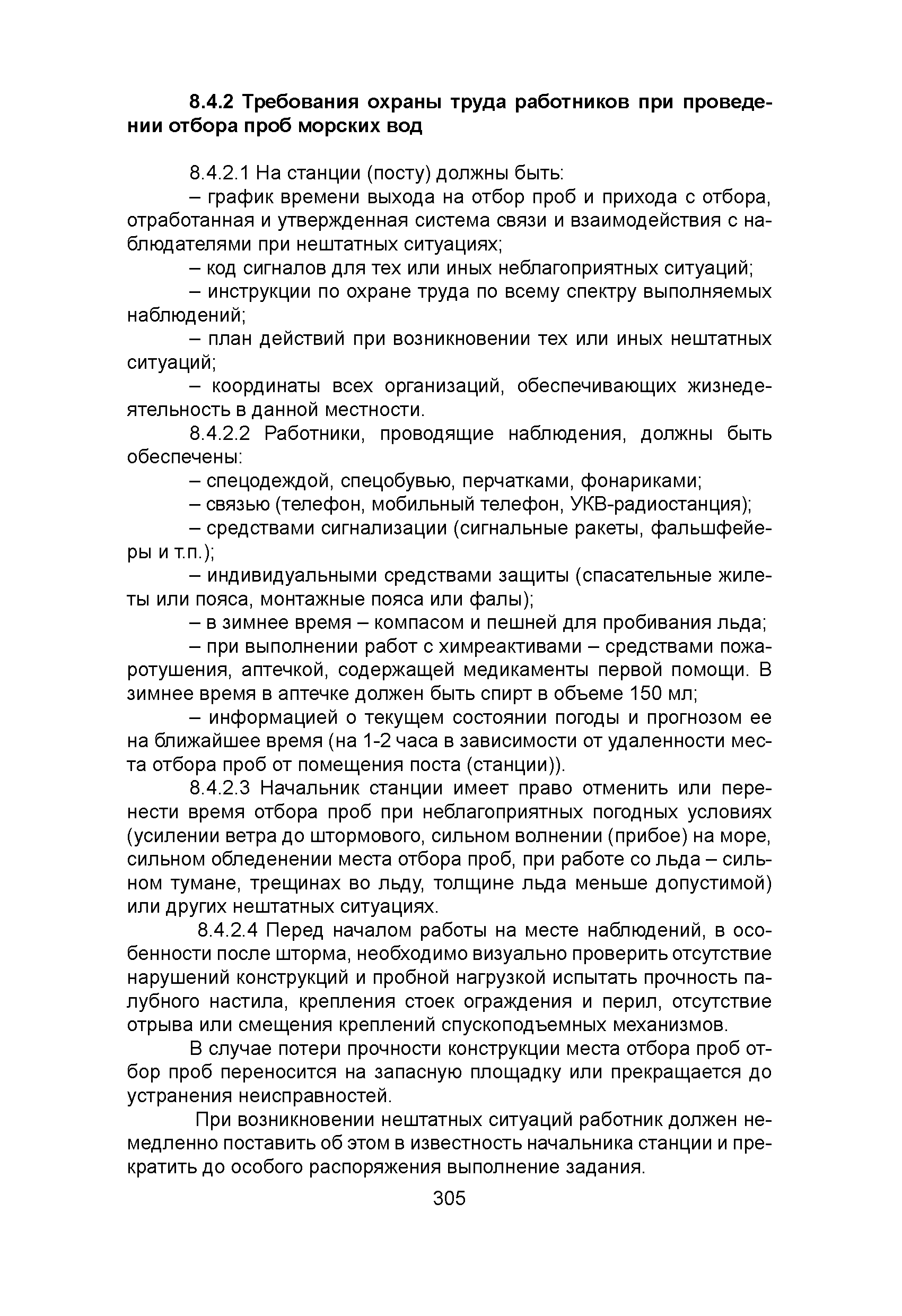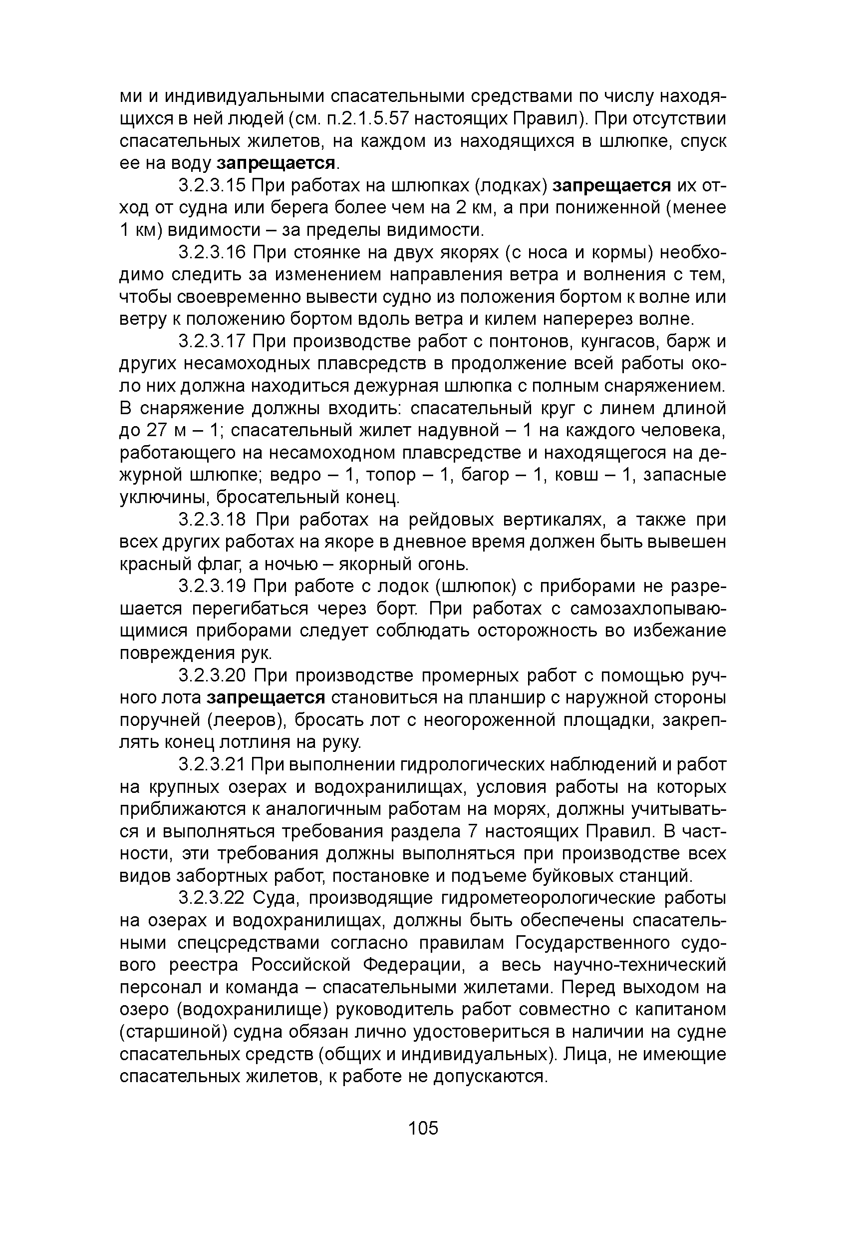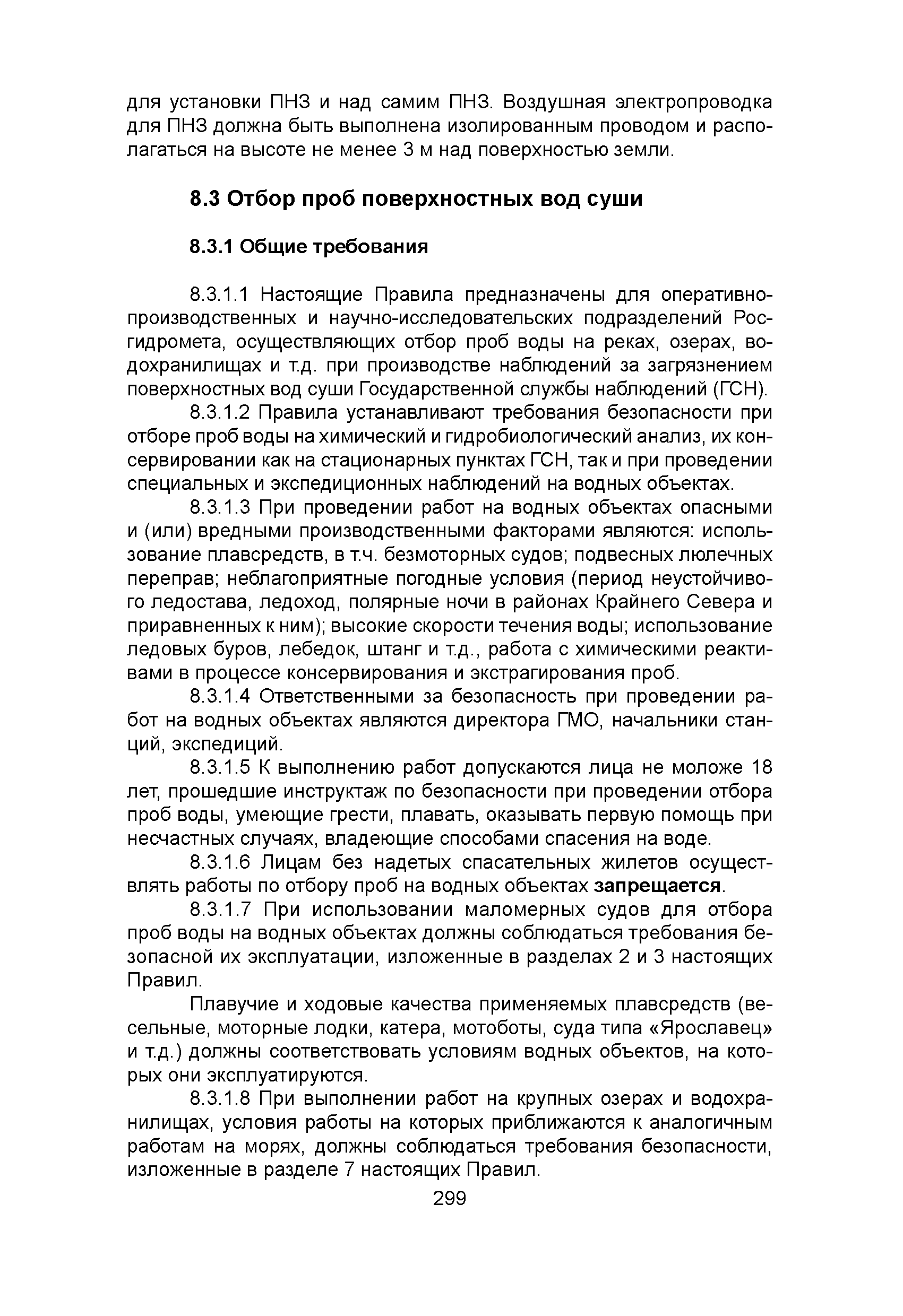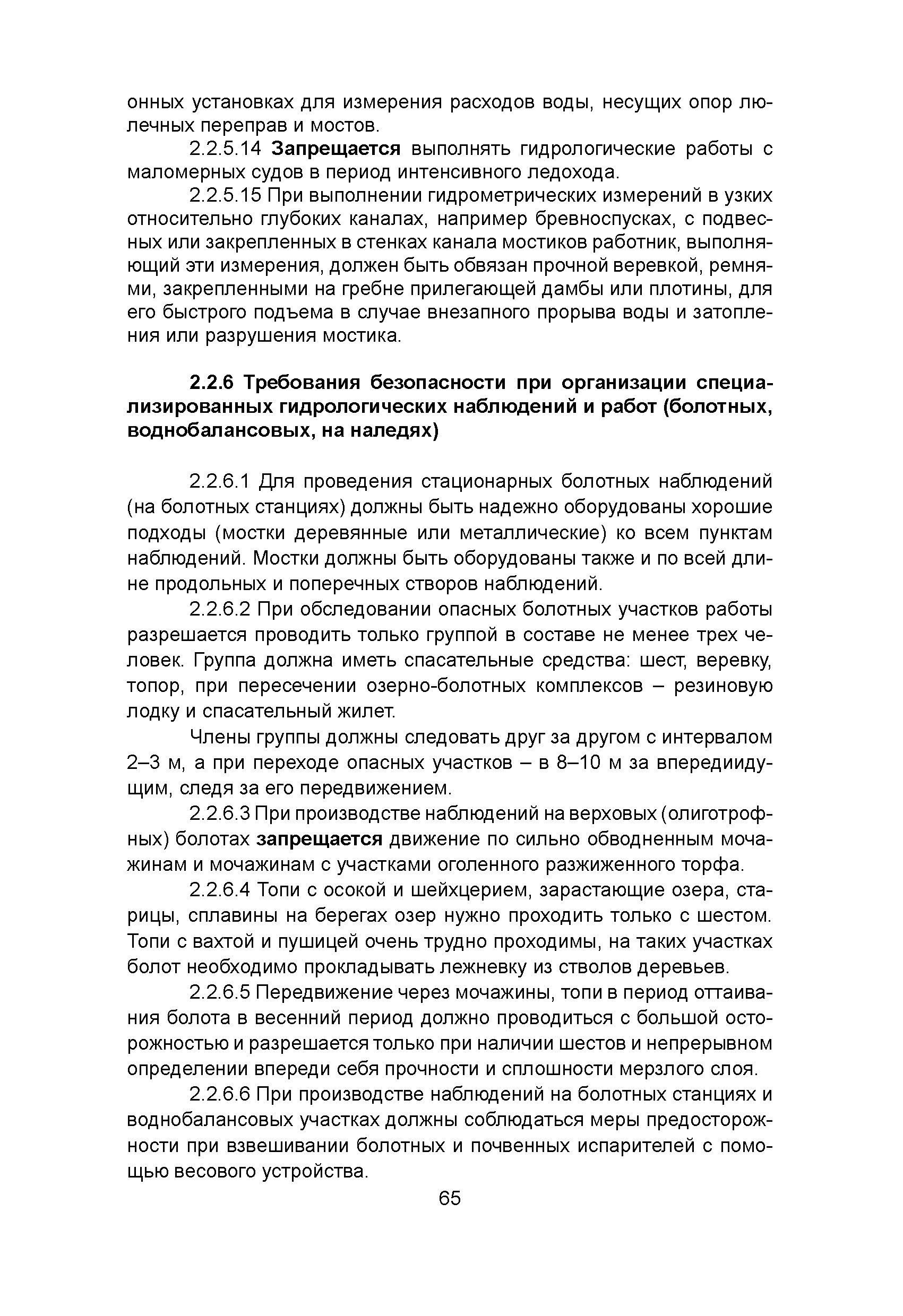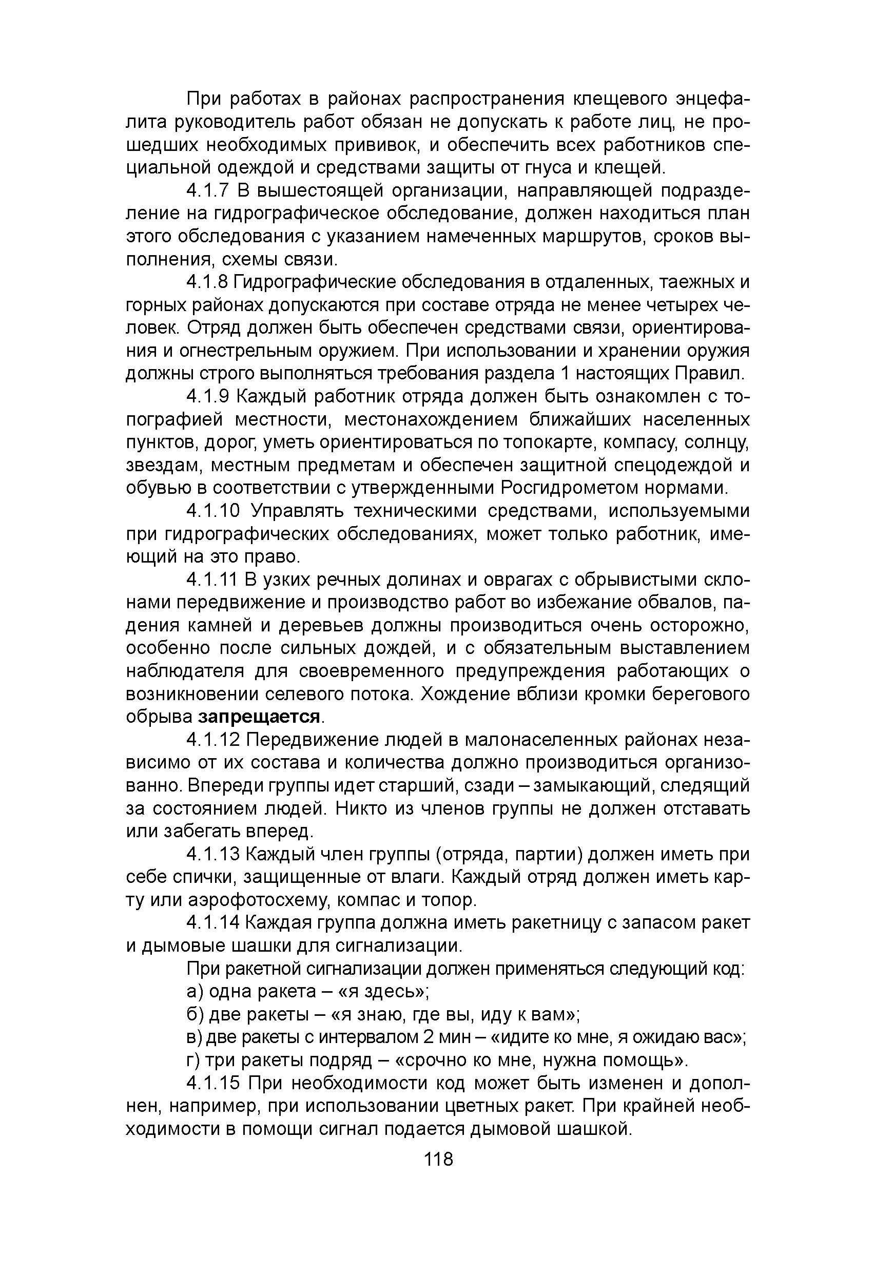 | Оглавление: | Введение 1 Общие положения 2 Гидрологические наблюдения и работы на реках и каналах 2.1 Общие требования 2.2 Требования охраны труда работников при организации и проведении гидрологических наблюдений и работ 2.2.1 Требования безопасности при проведении наблюдений за уровнем воды 2.2.2 Требования безопасности при проведении наблюдений за ледовыми явлениями и толщиной льда 2.2.3 Требования безопасности при проведении уровенных и ледовых наблюдений в случае возникновения заторов и зажоров льда 2.2.4 Требования безопасности при проведении гидрометрических работ по измерению расходов воды и наблюдений за наносами 2.2.5 Требования безопасности при проведении работ на горных и таежных реках, а также в период прохождения весеннего половодья и высоких дождевых паводков 2.2.6 Требования безопасности при организации специализированных гидрологических наблюдений и работ (болотных, воднобалансовых, на наледях) 2.2.7 Требования безопасности при проведении аэрогидрометрических наблюдений и работ 2.2.8 Средства индивидуальной защиты работников 2.2.9 Меры по защите работников при возникновении аварийных ситуаций 2.3 Требования к производственным площадкам, оборудованию, приборам и условиям их эксплуатации 2.3.1 Общие требования 2.3.2 Требования при проведении наблюдений за уровнем воды 2.3.3 Требования при проведении наблюдений за продольным уклоном водной поверхности 2.3.4 Требования при проведении наблюдений за температурой воды 2.3.5 Требования при проведении наблюдений за ледовыми явлениями, толщиной льда, снежным покровом 2.3.6 Требования при проведении измерений расходов воды и взвешенных наносов, при отборе проб донных отложений 3 Гидрометеорологические наблюдения и работы на озерах и водохранилищах 3.1 Общие требования 3.2 Требования охраны труда работников при организации и проведении гидрометеорологических наблюдений и работ 3.2.1 Общие требования 3.2.2 Требования безопасности при проведении гидрометеорологических наблюдений и работ в прибрежной зоне водоемов 3.2.3 Требования безопасности при проведении гидрометеорологических наблюдений и работ на открытой акватории водоемов 3.2.4 Требования безопасности при проведении наблюдений за ледяным покровом 3.2.5 Средства индивидуальной защиты работников 3.2.6 Защита работников при возникновении аварийных ситуаций 3.3 Требования к производственным площадкам 3.3.1 Требования к площадкам для производства гидрометеорологических наблюдений и работ в прибрежной зоне водоемов 3.3.2 Требования к площадкам для гидрометеорологических наблюдений и работ на открытой акватории водоемов 3.3.3 Требования к площадкам для наблюдений за ледяным покровом 3.4 Требования к приборам, оборудованию и условиям их эксплуатации 4 Гидрографические обследования 4.1 Общие требования 4.2 Требования охраны труда работников при организации и проведении гидрографических обследований 4.2.1 Требования безопасности при движении по маршрутам 4.2.2 Требования безопасности при переправах через реки, озера, другие водные преграды и лавины 4.2.3 Требования безопасности при проведении маршрутных снегомерных съемок на равнинной территории 4.2.4 Требования безопасности при применении авиационного транспорта 4.2.5 Средства индивидуальной защиты работников 4.2.6 Защита работников при возникновении аварийных ситуаций 4.3 Требования к пло