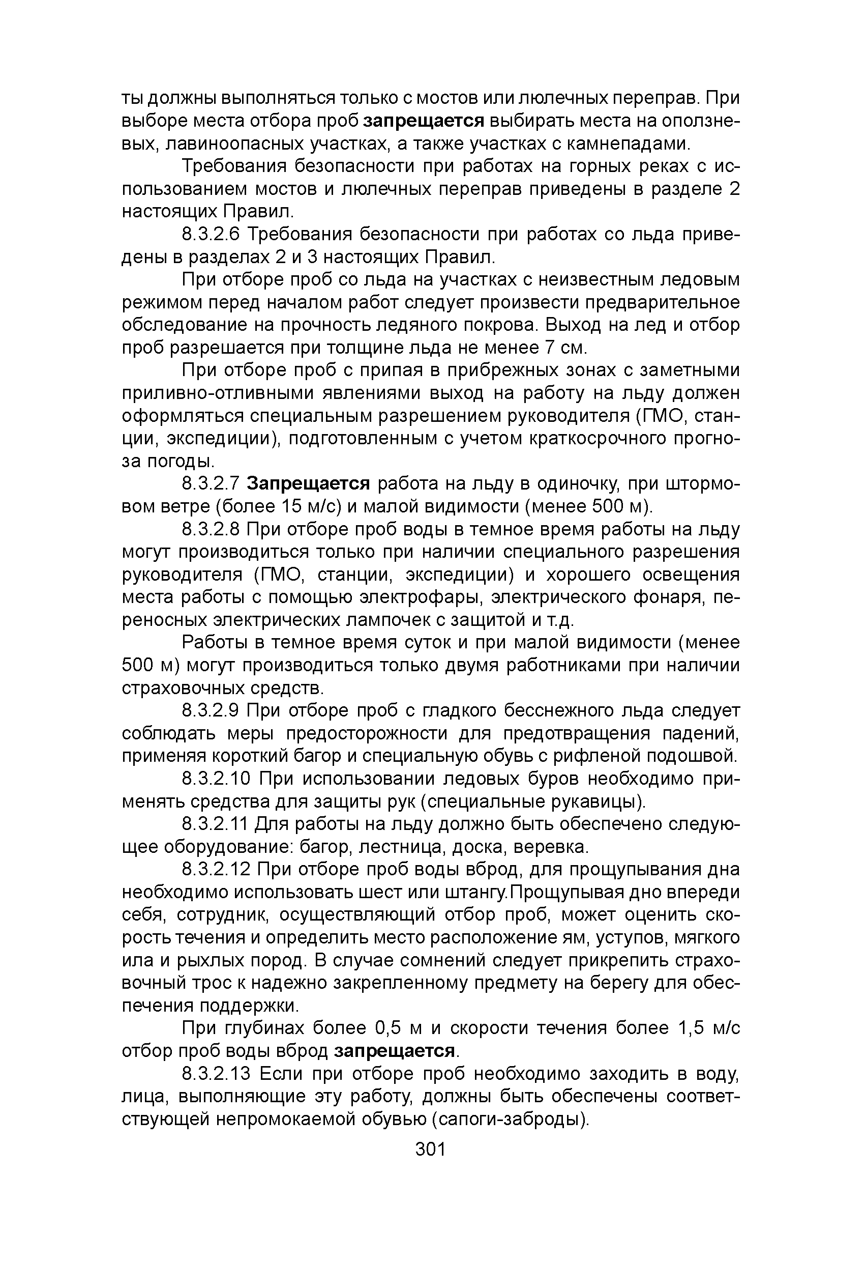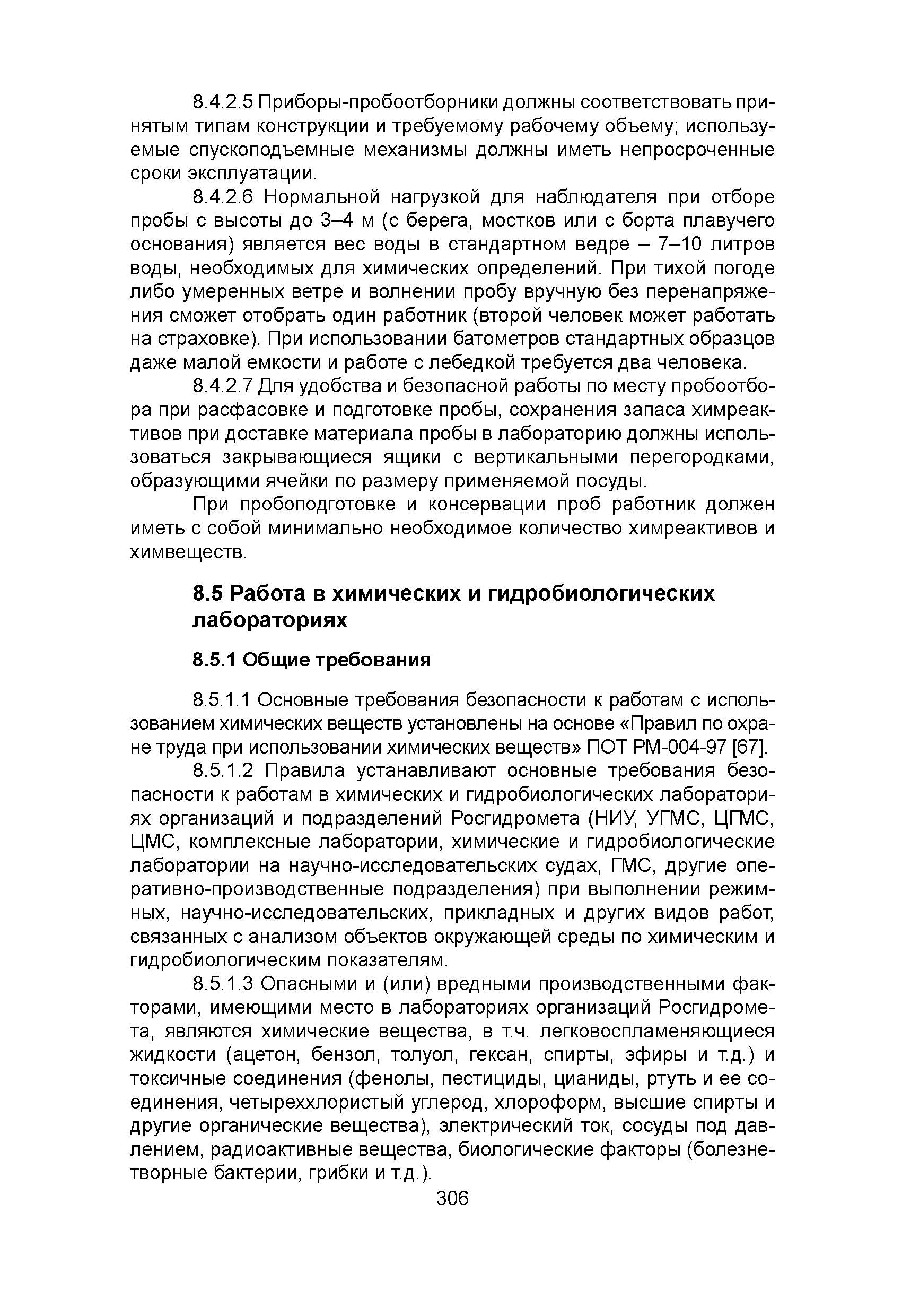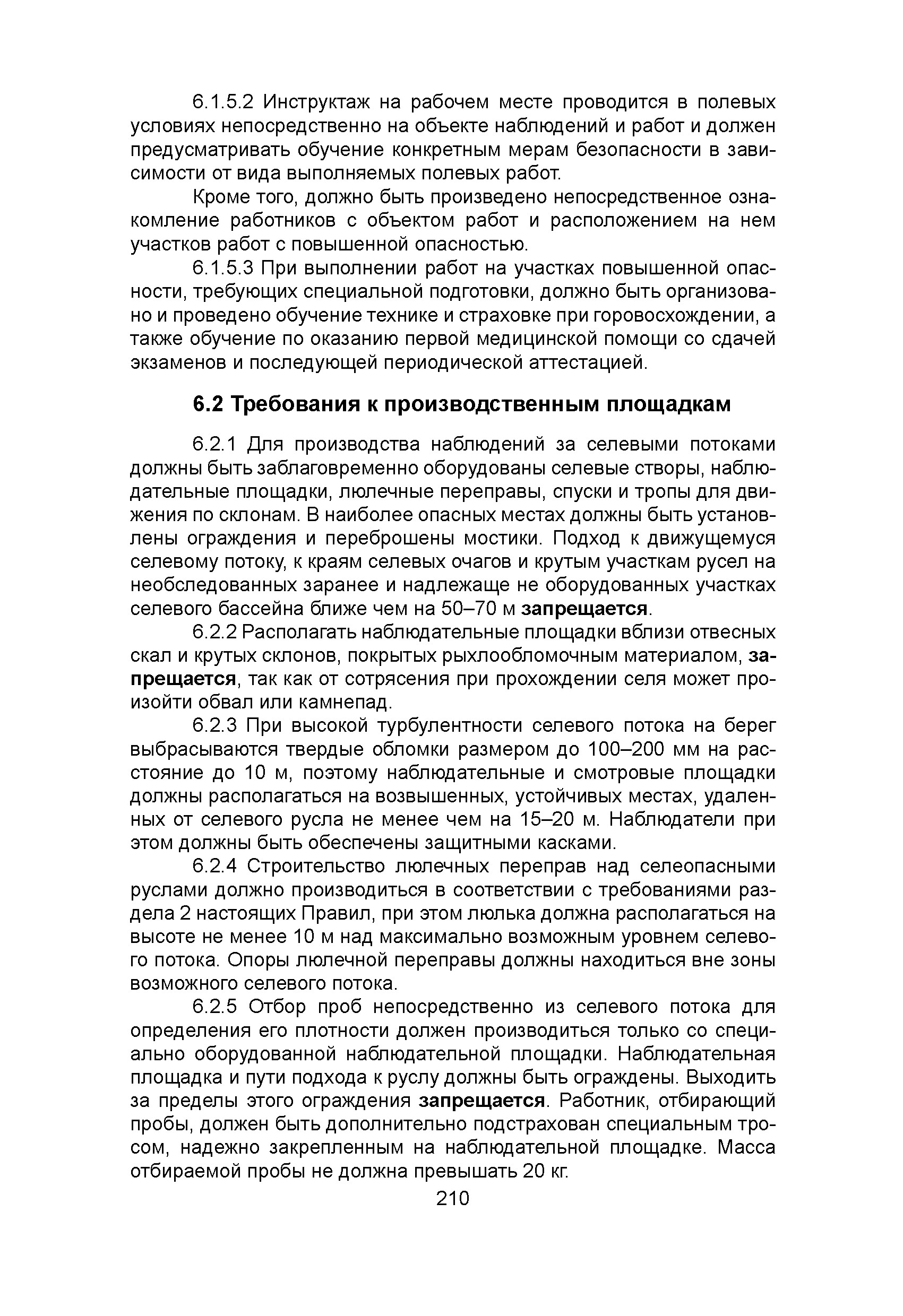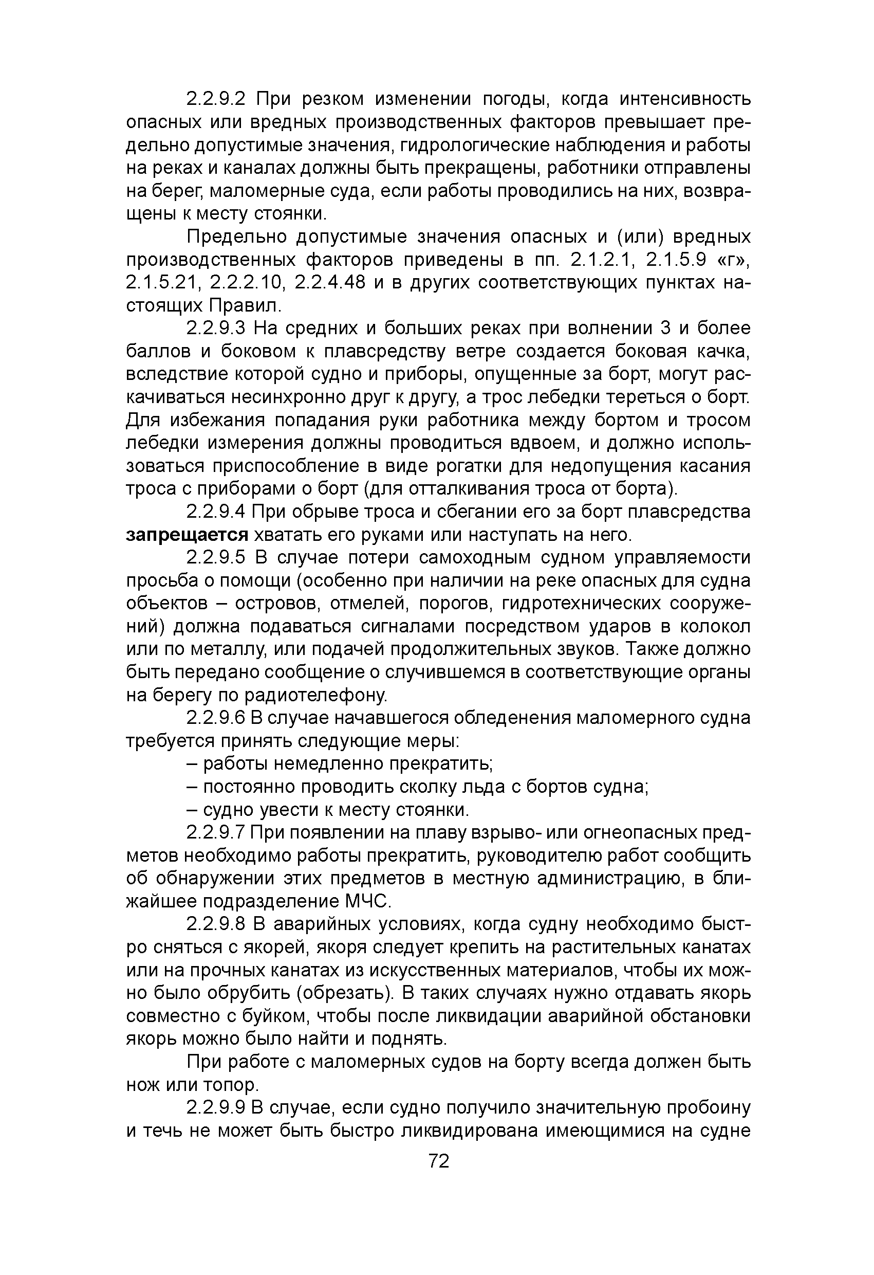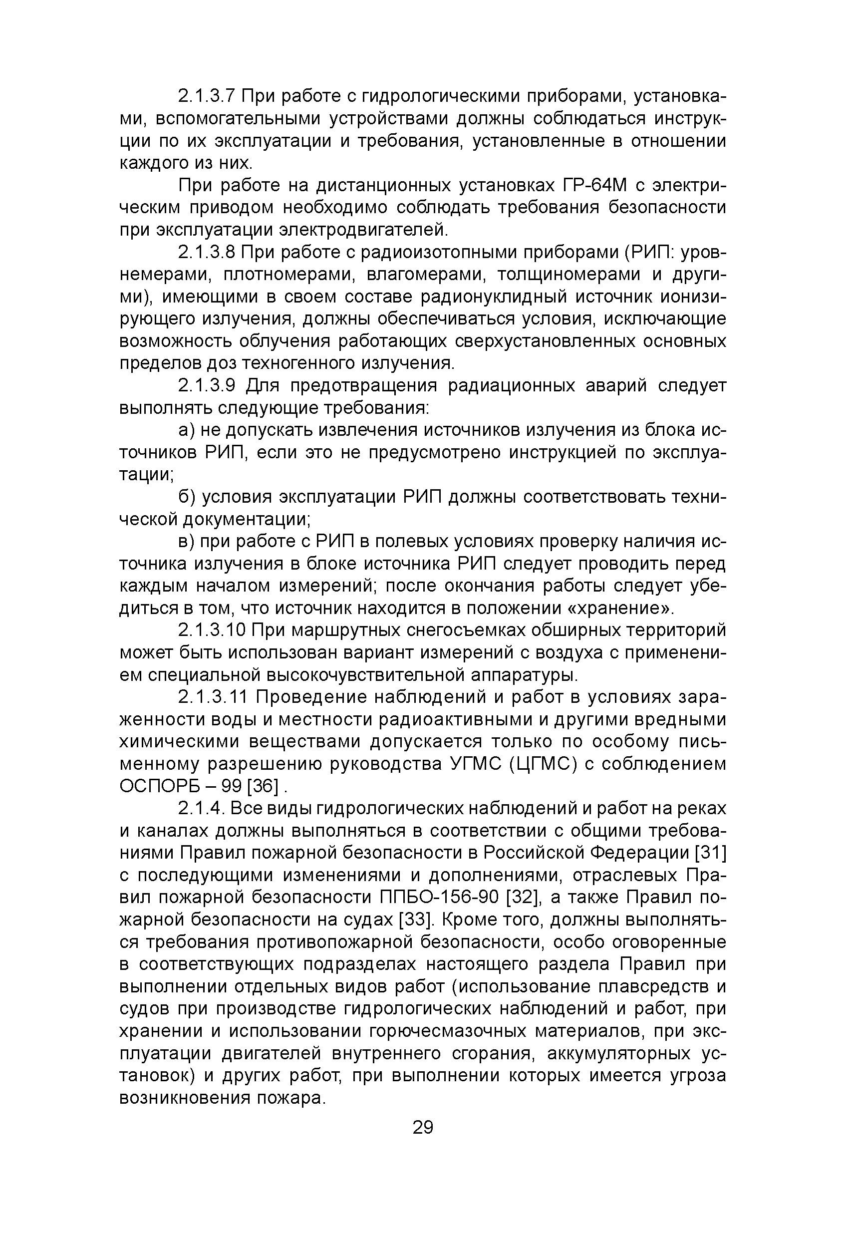 | Оглавление: | Введение 1 Общие положения 2 Гидрологические наблюдения и работы на реках и каналах 2.1 Общие требования 2.2 Требования охраны труда работников при организации и проведении гидрологических наблюдений и работ 2.2.1 Требования безопасности при проведении наблюдений за уровнем воды 2.2.2 Требования безопасности при проведении наблюдений за ледовыми явлениями и толщиной льда 2.2.3 Требования безопасности при проведении уровенных и ледовых наблюдений в случае возникновения заторов и зажоров льда 2.2.4 Требования безопасности при проведении гидрометрических работ по измерению расходов воды и наблюдений за наносами 2.2.5 Требования безопасности при проведении работ на горных и таежных реках, а также в период прохождения весеннего половодья и высоких дождевых паводков 2.2.6 Требования безопасности при организации специализированных гидрологических наблюдений и работ (болотных, воднобалансовых, на наледях) 2.2.7 Требования безопасности при проведении аэрогидрометрических наблюдений и работ 2.2.8 Средства индивидуальной защиты работников 2.2.9 Меры по защите работников при возникновении аварийных ситуаций 2.3 Требования к производственным площадкам, оборудованию, приборам и условиям их эксплуатации 2.3.1 Общие требования 2.3.2 Требования при проведении наблюдений за уровнем воды 2.3.3 Требования при проведении наблюдений за продольным уклоном водной поверхности 2.3.4 Требования при проведении наблюдений за температурой воды 2.3.5 Требования при проведении наблюдений за ледовыми явлениями, толщиной льда, снежным покровом 2.3.6 Требования при проведении измерений расходов воды и взвешенных наносов, при отборе проб донных отложений 3 Гидрометеорологические наблюдения и работы на озерах и водохранилищах 3.1 Общие требования 3.2 Требования охраны труда работников при организации и проведении гидрометеорологических наблюдений и работ 3.2.1 Общие требования 3.2.2 Требования безопасности при проведении гидрометеорологических наблюдений и работ в прибрежной зоне водоемов 3.2.3 Требования безопасности при проведении гидрометеорологических наблюдений и работ на открытой акватории водоемов 3.2.4 Требования безопасности при проведении наблюдений за ледяным покровом 3.2.5 Средства индивидуальной защиты работников 3.2.6 Защита работников при возникновении аварийных ситуаций 3.3 Требования к производственным площадкам 3.3.1 Требования к площадкам для производства гидрометеорологических наблюдений и работ в прибрежной зоне водоемов 3.3.2 Требования к площадкам для гидрометеорологических наблюдений и работ на открытой акватории водоемов 3.3.3 Требования к площадкам для наблюдений за ледяным покровом 3.4 Требования к приборам, оборудованию и условиям их эксплуатации 4 Гидрографические обследования 4.1 Общие требования 4.2 Требования охраны труда работников при организации и проведении гидрографических обследований 4.2.1 Требования безопасности при движении по маршрутам 4.2.2 Требования безопасности при переправах через реки, озера, другие водные преграды и лавины 4.2.3 Требования безопасности при проведении маршрутных снегомерных съемок на равнинной территории 4.2.4 Требования безопасности при применении авиационного транспорта 4.2.5 Средства индивидуальной защиты работников 4.2.6 Защита работников при возникновении аварийных ситуаций 4.3 Требования к пло