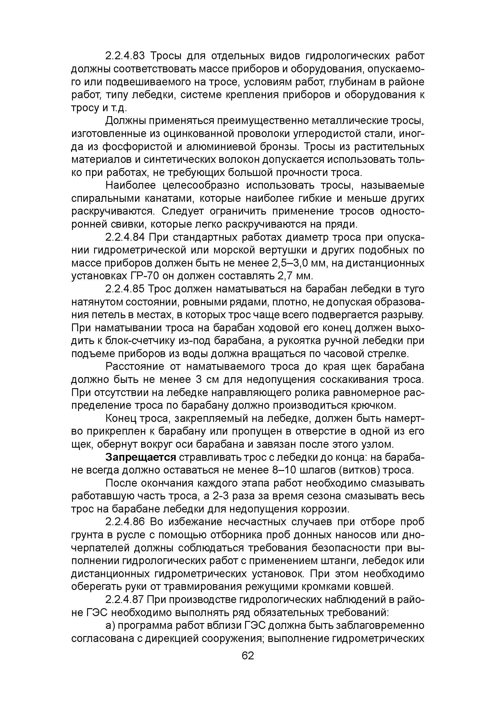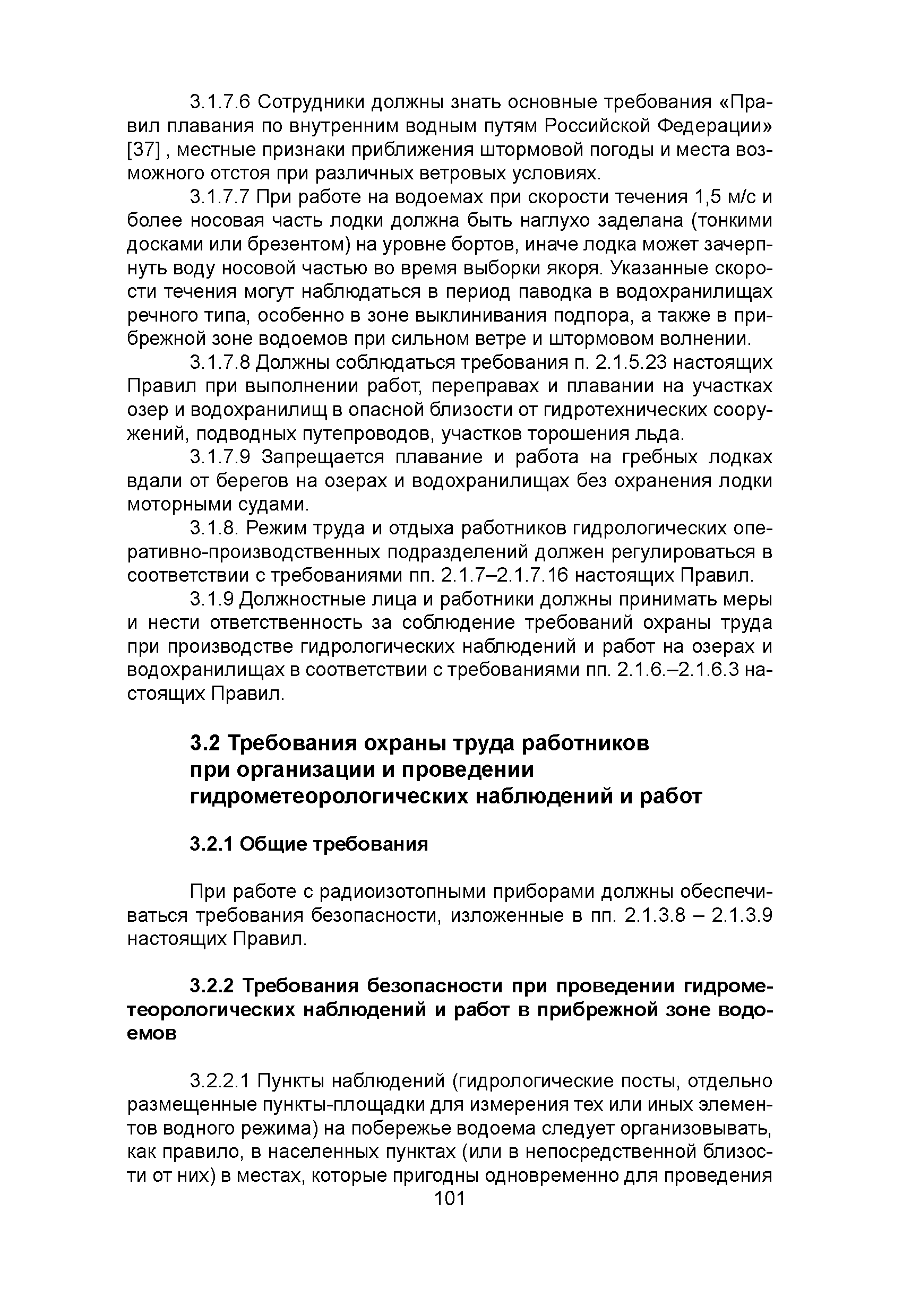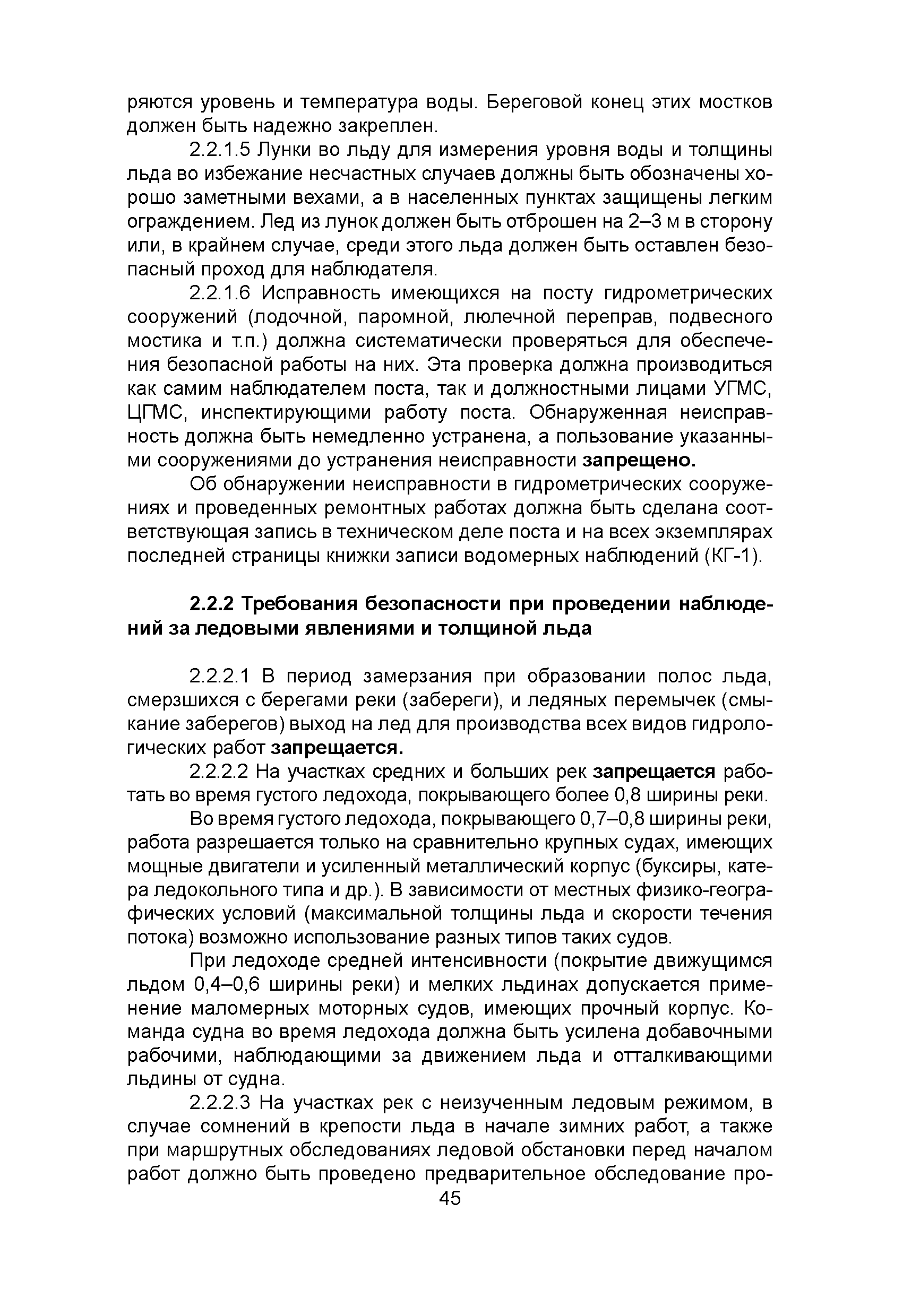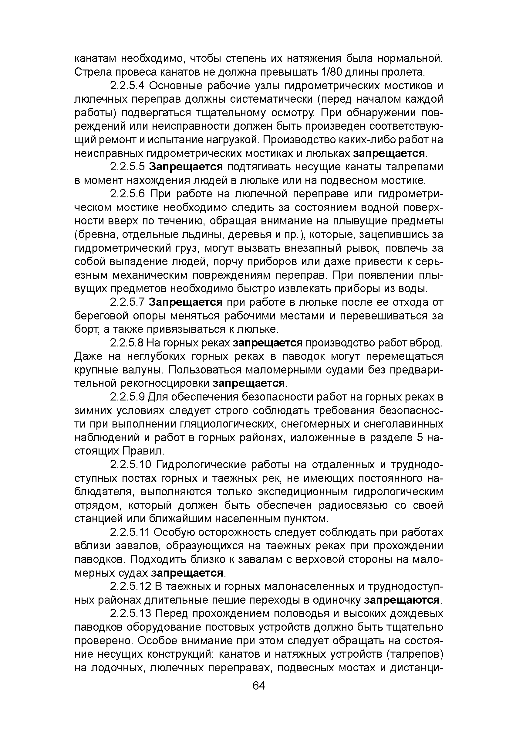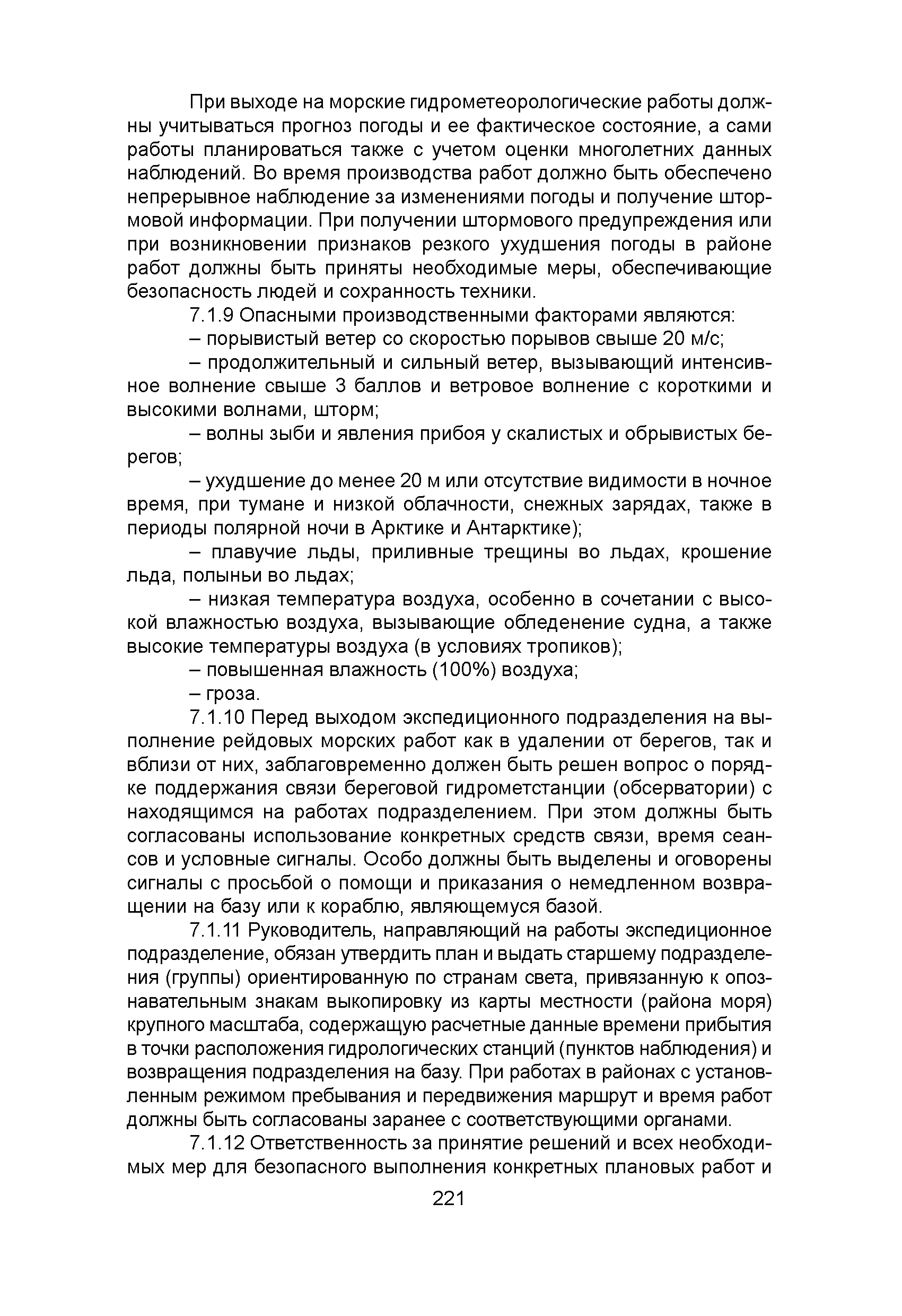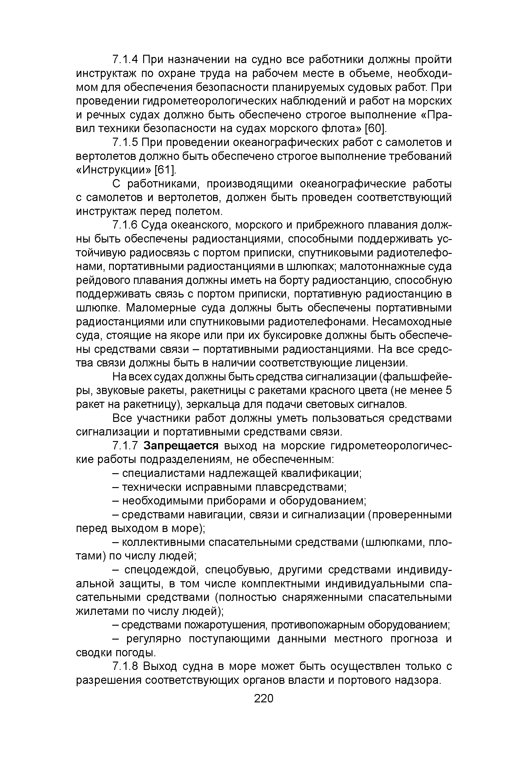 | Оглавление: | Введение 1 Общие положения 2 Гидрологические наблюдения и работы на реках и каналах 2.1 Общие требования 2.2 Требования охраны труда работников при организации и проведении гидрологических наблюдений и работ 2.2.1 Требования безопасности при проведении наблюдений за уровнем воды 2.2.2 Требования безопасности при проведении наблюдений за ледовыми явлениями и толщиной льда 2.2.3 Требования безопасности при проведении уровенных и ледовых наблюдений в случае возникновения заторов и зажоров льда 2.2.4 Требования безопасности при проведении гидрометрических работ по измерению расходов воды и наблюдений за наносами 2.2.5 Требования безопасности при проведении работ на горных и таежных реках, а также в период прохождения весеннего половодья и высоких дождевых паводков 2.2.6 Требования безопасности при организации специализированных гидрологических наблюдений и работ (болотных, воднобалансовых, на наледях) 2.2.7 Требования безопасности при проведении аэрогидрометрических наблюдений и работ 2.2.8 Средства индивидуальной защиты работников 2.2.9 Меры по защите работников при возникновении аварийных ситуаций 2.3 Требования к производственным площадкам, оборудованию, приборам и условиям их эксплуатации 2.3.1 Общие требования 2.3.2 Требования при проведении наблюдений за уровнем воды 2.3.3 Требования при проведении наблюдений за продольным уклоном водной поверхности 2.3.4 Требования при проведении наблюдений за температурой воды 2.3.5 Требования при проведении наблюдений за ледовыми явлениями, толщиной льда, снежным покровом 2.3.6 Требования при проведении измерений расходов воды и взвешенных наносов, при отборе проб донных отложений 3 Гидрометеорологические наблюдения и работы на озерах и водохранилищах 3.1 Общие требования 3.2 Требования охраны труда работников при организации и проведении гидрометеорологических наблюдений и работ 3.2.1 Общие требования 3.2.2 Требования безопасности при проведении гидрометеорологических наблюдений и работ в прибрежной зоне водоемов 3.2.3 Требования безопасности при проведении гидрометеорологических наблюдений и работ на открытой акватории водоемов 3.2.4 Требования безопасности при проведении наблюдений за ледяным покровом 3.2.5 Средства индивидуальной защиты работников 3.2.6 Защита работников при возникновении аварийных ситуаций 3.3 Требования к производственным площадкам 3.3.1 Требования к площадкам для производства гидрометеорологических наблюдений и работ в прибрежной зоне водоемов 3.3.2 Требования к площадкам для гидрометеорологических наблюдений и работ на открытой акватории водоемов 3.3.3 Требования к площадкам для наблюдений за ледяным покровом 3.4 Требования к приборам, оборудованию и условиям их эксплуатации 4 Гидрографические обследования 4.1 Общие требования 4.2 Требования охраны труда работников при организации и проведении гидрографических обследований 4.2.1 Требования безопасности при движении по маршрутам 4.2.2 Требования безопасности при переправах через реки, озера, другие водные преграды и лавины 4.2.3 Требования безопасности при проведении маршрутных снегомерных съемок на равнинной территории 4.2.4 Требования безопасности при применении авиационного транспорта 4.2.5 Средства индивидуальной защиты работников 4.2.6 Защита работников при возникновении аварийных ситуаций 4.3 Требования к пло