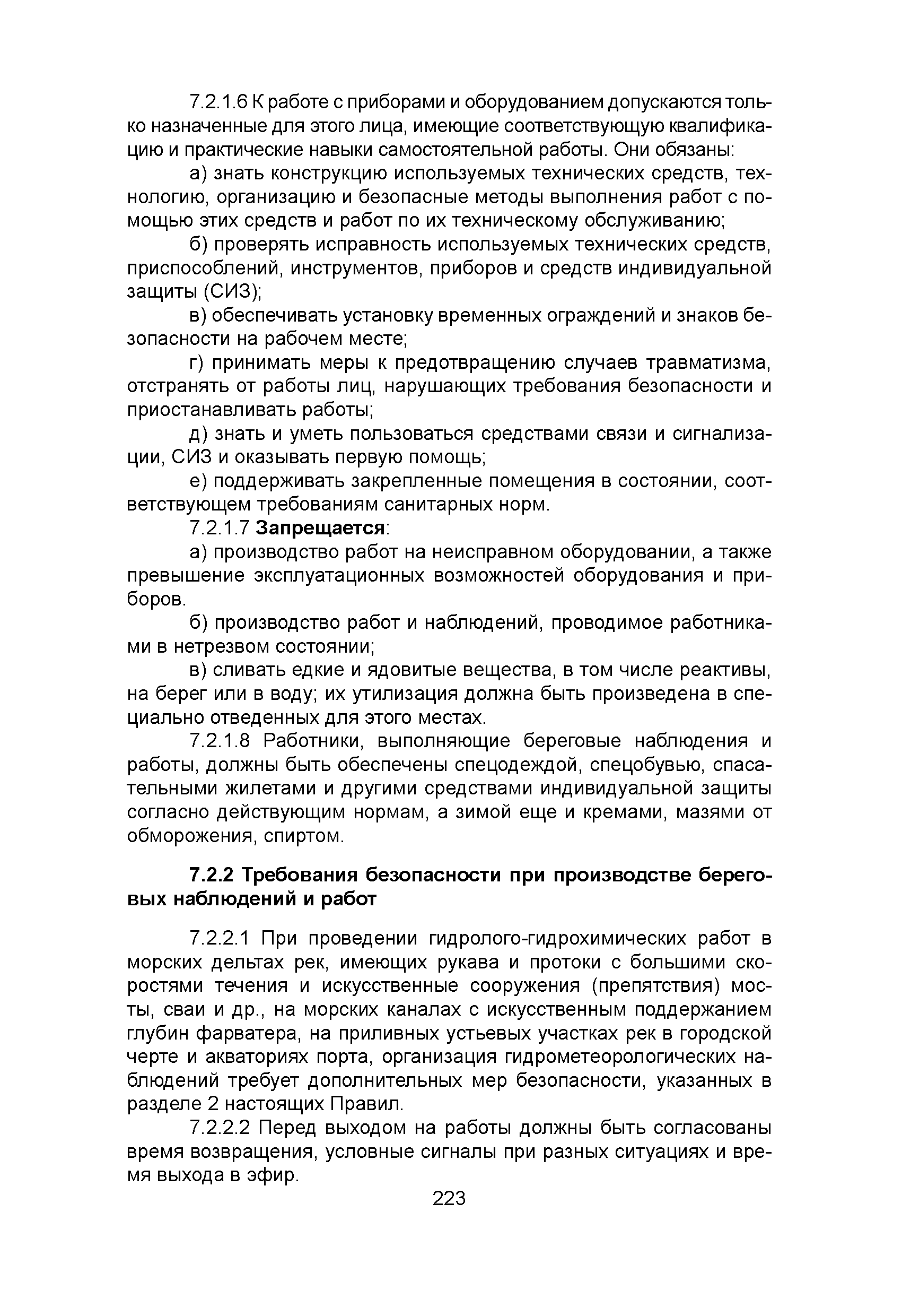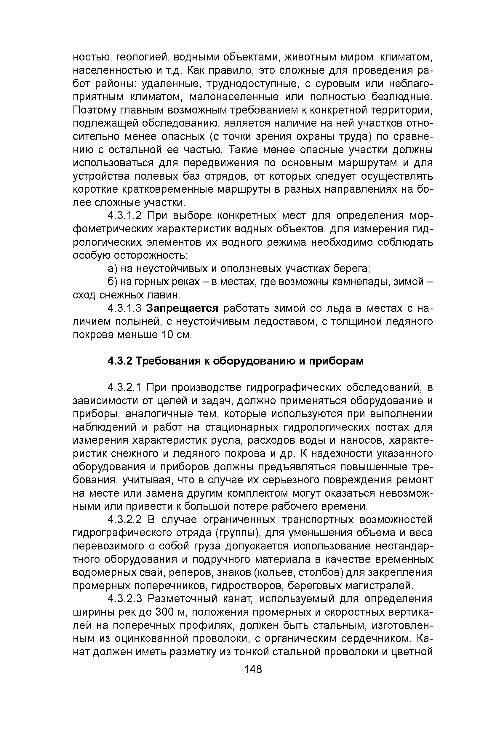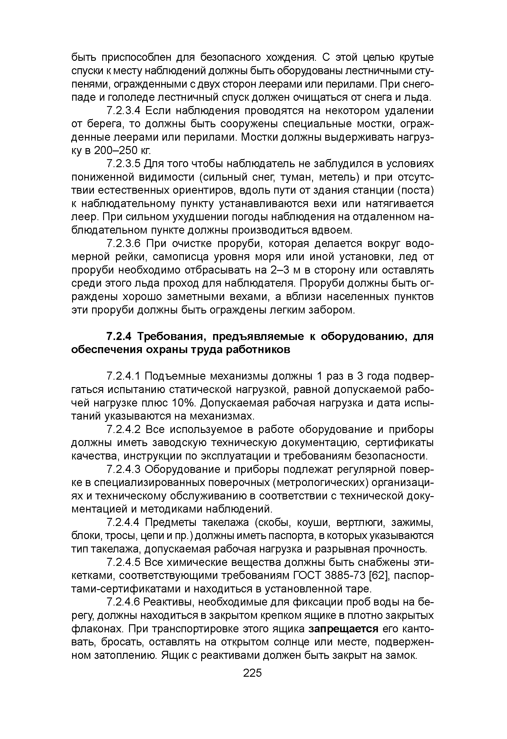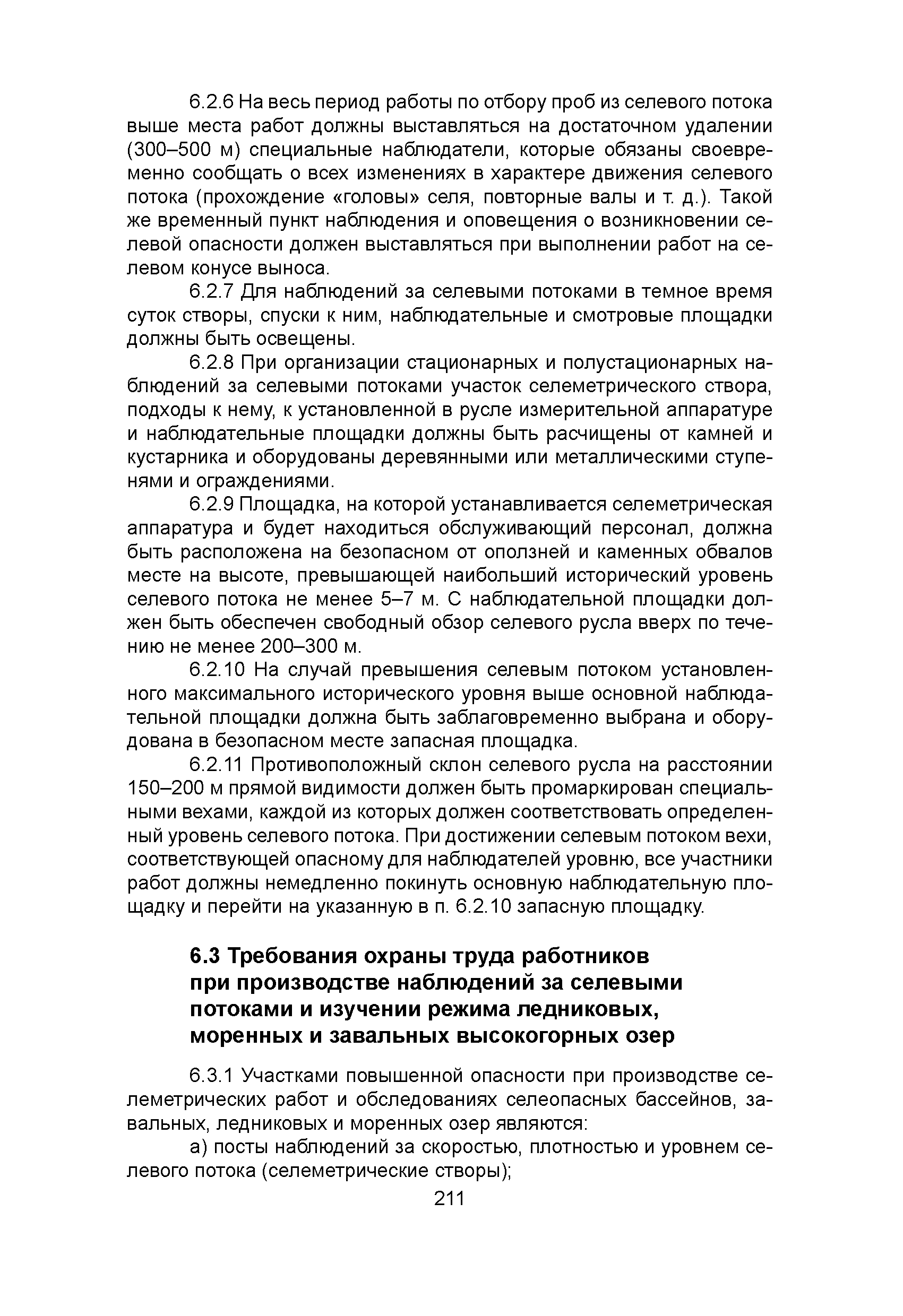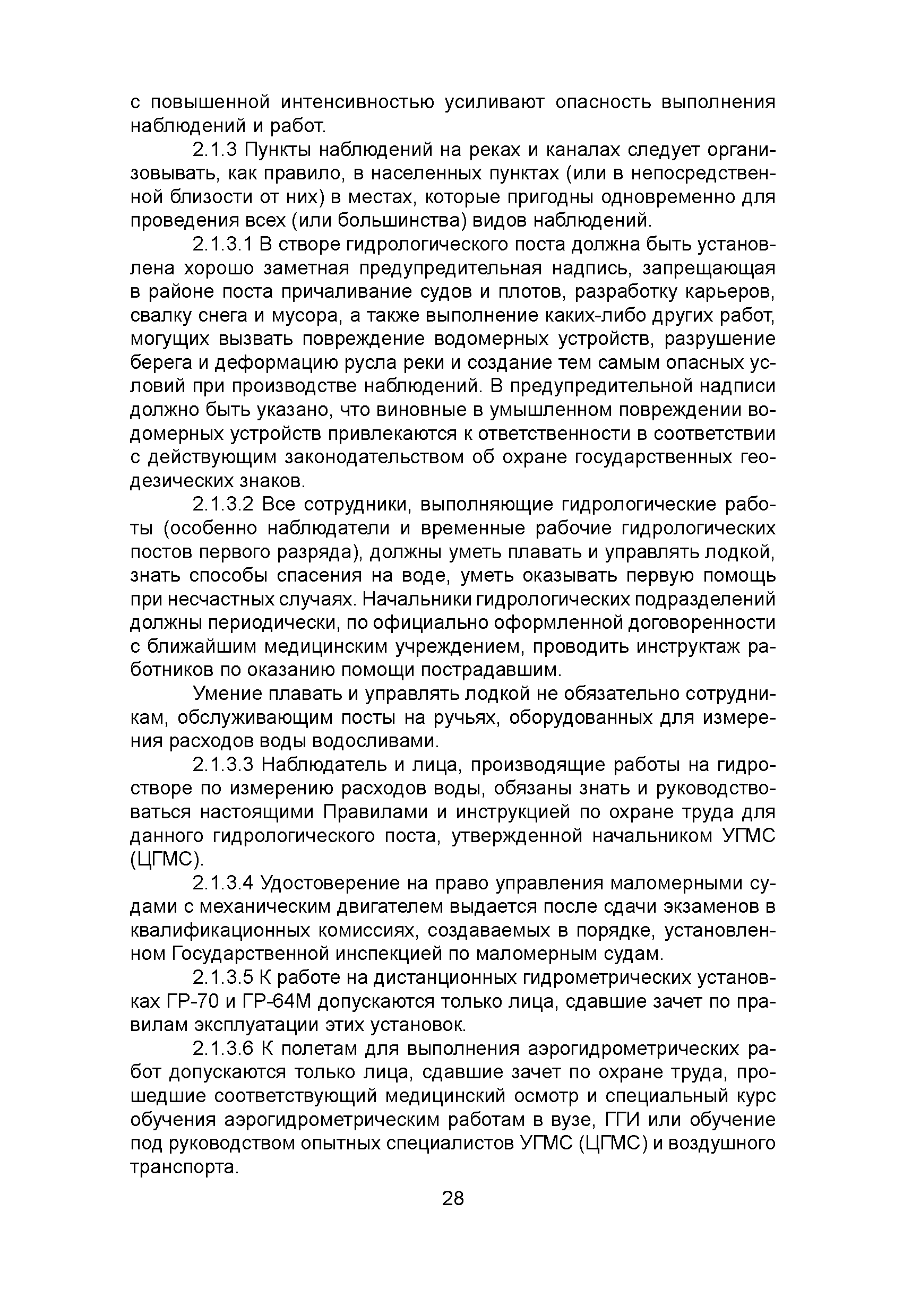 | Оглавление: | Введение 1 Общие положения 2 Гидрологические наблюдения и работы на реках и каналах 2.1 Общие требования 2.2 Требования охраны труда работников при организации и проведении гидрологических наблюдений и работ 2.2.1 Требования безопасности при проведении наблюдений за уровнем воды 2.2.2 Требования безопасности при проведении наблюдений за ледовыми явлениями и толщиной льда 2.2.3 Требования безопасности при проведении уровенных и ледовых наблюдений в случае возникновения заторов и зажоров льда 2.2.4 Требования безопасности при проведении гидрометрических работ по измерению расходов воды и наблюдений за наносами 2.2.5 Требования безопасности при проведении работ на горных и таежных реках, а также в период прохождения весеннего половодья и высоких дождевых паводков 2.2.6 Требования безопасности при организации специализированных гидрологических наблюдений и работ (болотных, воднобалансовых, на наледях) 2.2.7 Требования безопасности при проведении аэрогидрометрических наблюдений и работ 2.2.8 Средства индивидуальной защиты работников 2.2.9 Меры по защите работников при возникновении аварийных ситуаций 2.3 Требования к производственным площадкам, оборудованию, приборам и условиям их эксплуатации 2.3.1 Общие требования 2.3.2 Требования при проведении наблюдений за уровнем воды 2.3.3 Требования при проведении наблюдений за продольным уклоном водной поверхности 2.3.4 Требования при проведении наблюдений за температурой воды 2.3.5 Требования при проведении наблюдений за ледовыми явлениями, толщиной льда, снежным покровом 2.3.6 Требования при проведении измерений расходов воды и взвешенных наносов, при отборе проб донных отложений 3 Гидрометеорологические наблюдения и работы на озерах и водохранилищах 3.1 Общие требования 3.2 Требования охраны труда работников при организации и проведении гидрометеорологических наблюдений и работ 3.2.1 Общие требования 3.2.2 Требования безопасности при проведении гидрометеорологических наблюдений и работ в прибрежной зоне водоемов 3.2.3 Требования безопасности при проведении гидрометеорологических наблюдений и работ на открытой акватории водоемов 3.2.4 Требования безопасности при проведении наблюдений за ледяным покровом 3.2.5 Средства индивидуальной защиты работников 3.2.6 Защита работников при возникновении аварийных ситуаций 3.3 Требования к производственным площадкам 3.3.1 Требования к площадкам для производства гидрометеорологических наблюдений и работ в прибрежной зоне водоемов 3.3.2 Требования к площадкам для гидрометеорологических наблюдений и работ на открытой акватории водоемов 3.3.3 Требования к площадкам для наблюдений за ледяным покровом 3.4 Требования к приборам, оборудованию и условиям их эксплуатации 4 Гидрографические обследования 4.1 Общие требования 4.2 Требования охраны труда работников при организации и проведении гидрографических обследований 4.2.1 Требования безопасности при движении по маршрутам 4.2.2 Требования безопасности при переправах через реки, озера, другие водные преграды и лавины 4.2.3 Требования безопасности при проведении маршрутных снегомерных съемок на равнинной территории 4.2.4 Требования безопасности при применении авиационного транспорта 4.2.5 Средства индивидуальной защиты работников 4.2.6 Защита работников при возникновении аварийных ситуаций 4.3 Требования к пло