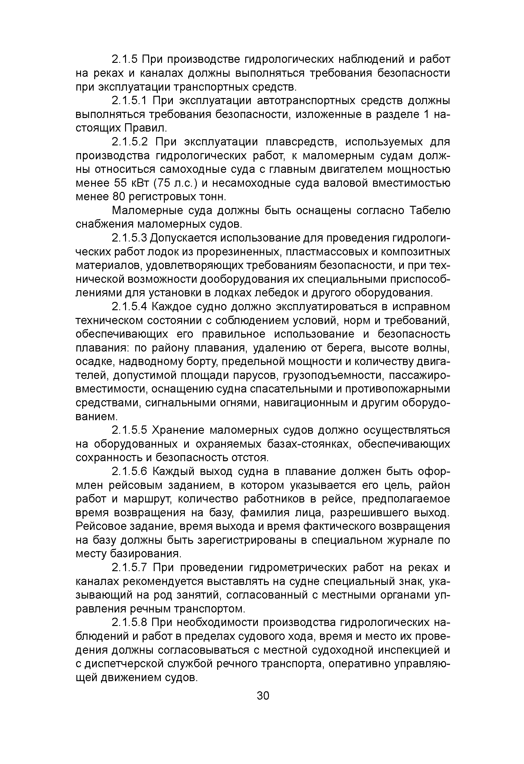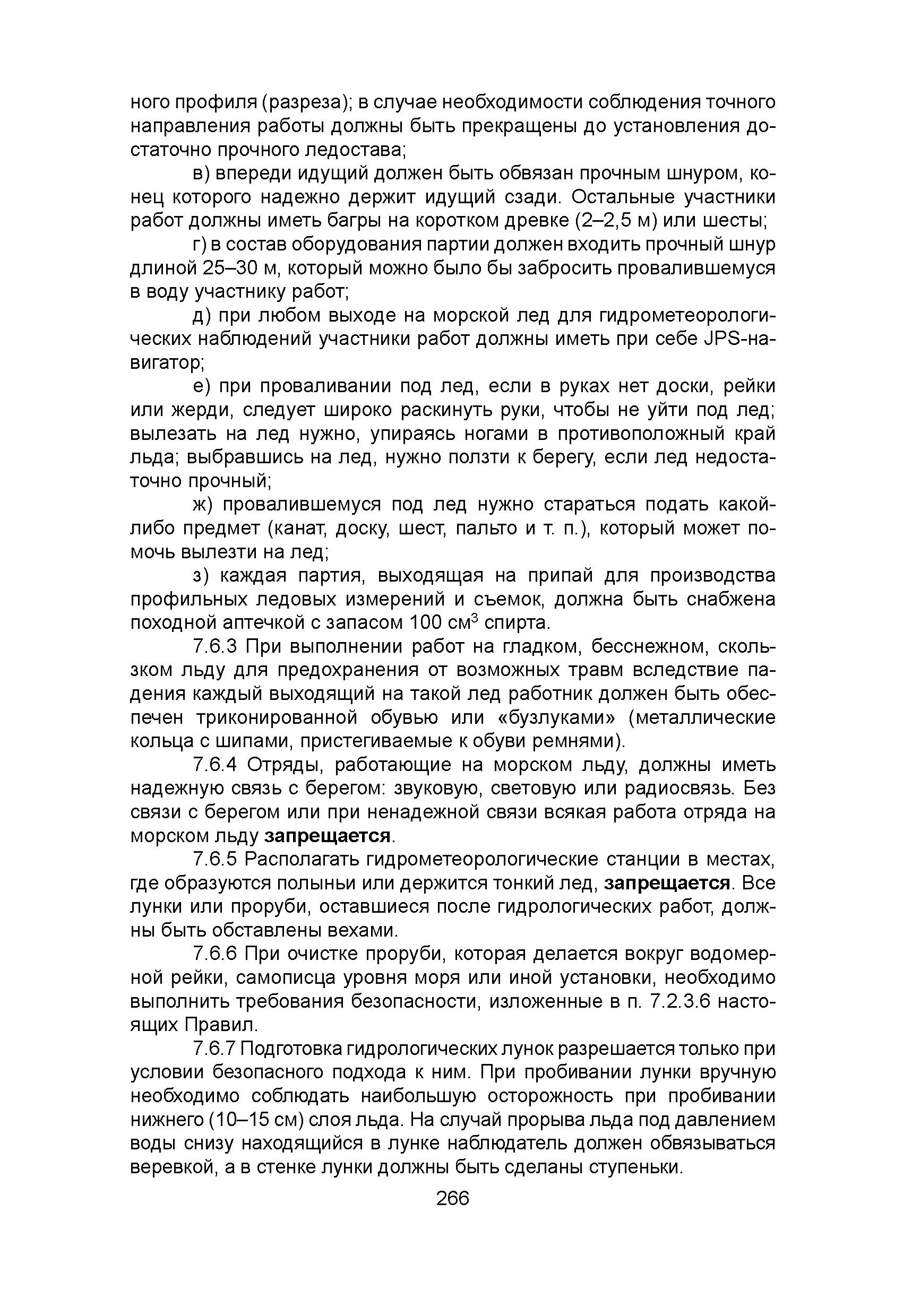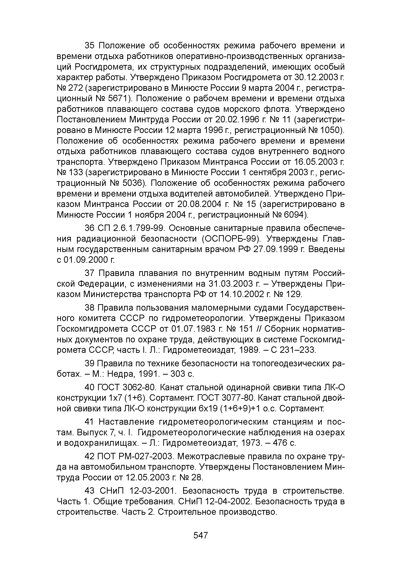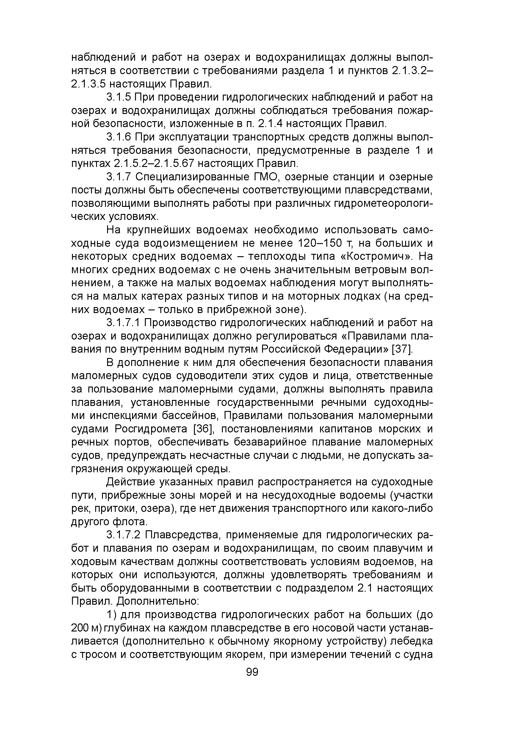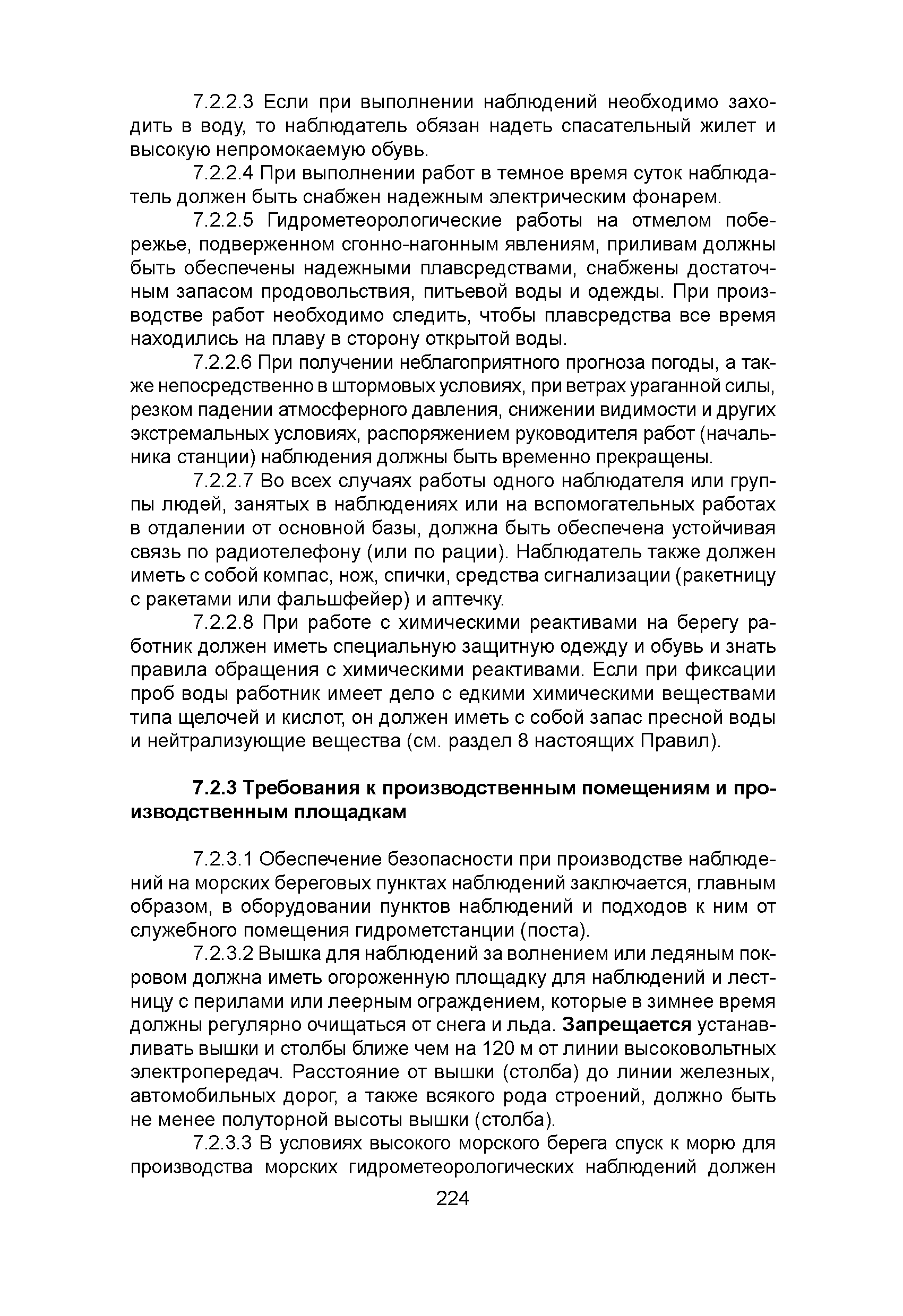 | Оглавление: | Введение 1 Общие положения 2 Гидрологические наблюдения и работы на реках и каналах 2.1 Общие требования 2.2 Требования охраны труда работников при организации и проведении гидрологических наблюдений и работ 2.2.1 Требования безопасности при проведении наблюдений за уровнем воды 2.2.2 Требования безопасности при проведении наблюдений за ледовыми явлениями и толщиной льда 2.2.3 Требования безопасности при проведении уровенных и ледовых наблюдений в случае возникновения заторов и зажоров льда 2.2.4 Требования безопасности при проведении гидрометрических работ по измерению расходов воды и наблюдений за наносами 2.2.5 Требования безопасности при проведении работ на горных и таежных реках, а также в период прохождения весеннего половодья и высоких дождевых паводков 2.2.6 Требования безопасности при организации специализированных гидрологических наблюдений и работ (болотных, воднобалансовых, на наледях) 2.2.7 Требования безопасности при проведении аэрогидрометрических наблюдений и работ 2.2.8 Средства индивидуальной защиты работников 2.2.9 Меры по защите работников при возникновении аварийных ситуаций 2.3 Требования к производственным площадкам, оборудованию, приборам и условиям их эксплуатации 2.3.1 Общие требования 2.3.2 Требования при проведении наблюдений за уровнем воды 2.3.3 Требования при проведении наблюдений за продольным уклоном водной поверхности 2.3.4 Требования при проведении наблюдений за температурой воды 2.3.5 Требования при проведении наблюдений за ледовыми явлениями, толщиной льда, снежным покровом 2.3.6 Требования при проведении измерений расходов воды и взвешенных наносов, при отборе проб донных отложений 3 Гидрометеорологические наблюдения и работы на озерах и водохранилищах 3.1 Общие требования 3.2 Требования охраны труда работников при организации и проведении гидрометеорологических наблюдений и работ 3.2.1 Общие требования 3.2.2 Требования безопасности при проведении гидрометеорологических наблюдений и работ в прибрежной зоне водоемов 3.2.3 Требования безопасности при проведении гидрометеорологических наблюдений и работ на открытой акватории водоемов 3.2.4 Требования безопасности при проведении наблюдений за ледяным покровом 3.2.5 Средства индивидуальной защиты работников 3.2.6 Защита работников при возникновении аварийных ситуаций 3.3 Требования к производственным площадкам 3.3.1 Требования к площадкам для производства гидрометеорологических наблюдений и работ в прибрежной зоне водоемов 3.3.2 Требования к площадкам для гидрометеорологических наблюдений и работ на открытой акватории водоемов 3.3.3 Требования к площадкам для наблюдений за ледяным покровом 3.4 Требования к приборам, оборудованию и условиям их эксплуатации 4 Гидрографические обследования 4.1 Общие требования 4.2 Требования охраны труда работников при организации и проведении гидрографических обследований 4.2.1 Требования безопасности при движении по маршрутам 4.2.2 Требования безопасности при переправах через реки, озера, другие водные преграды и лавины 4.2.3 Требования безопасности при проведении маршрутных снегомерных съемок на равнинной территории 4.2.4 Требования безопасности при применении авиационного транспорта 4.2.5 Средства индивидуальной защиты работников 4.2.6 Защита работников при возникновении аварийных ситуаций 4.3 Требования к пло