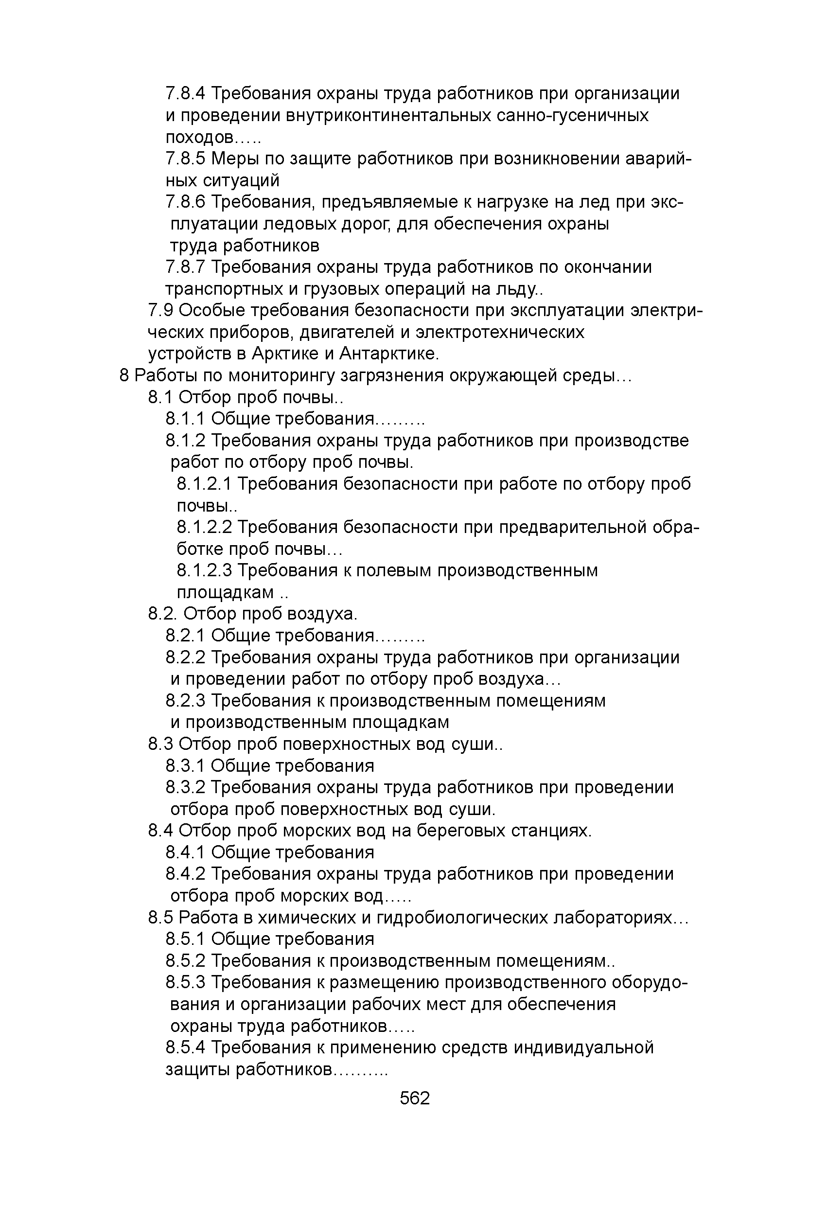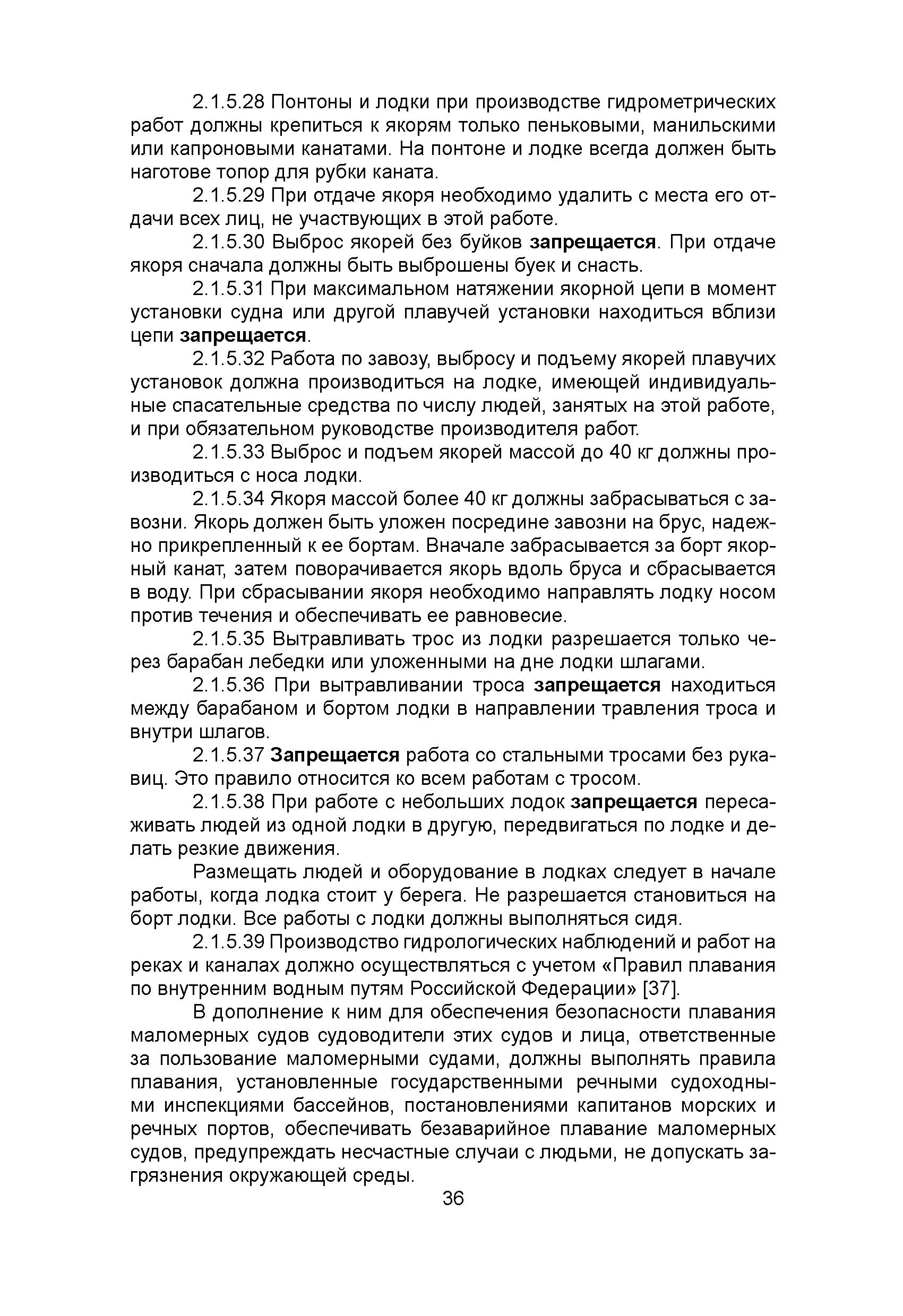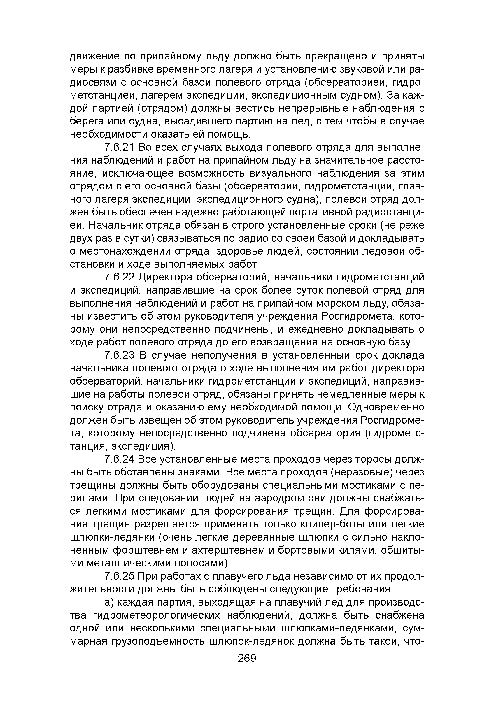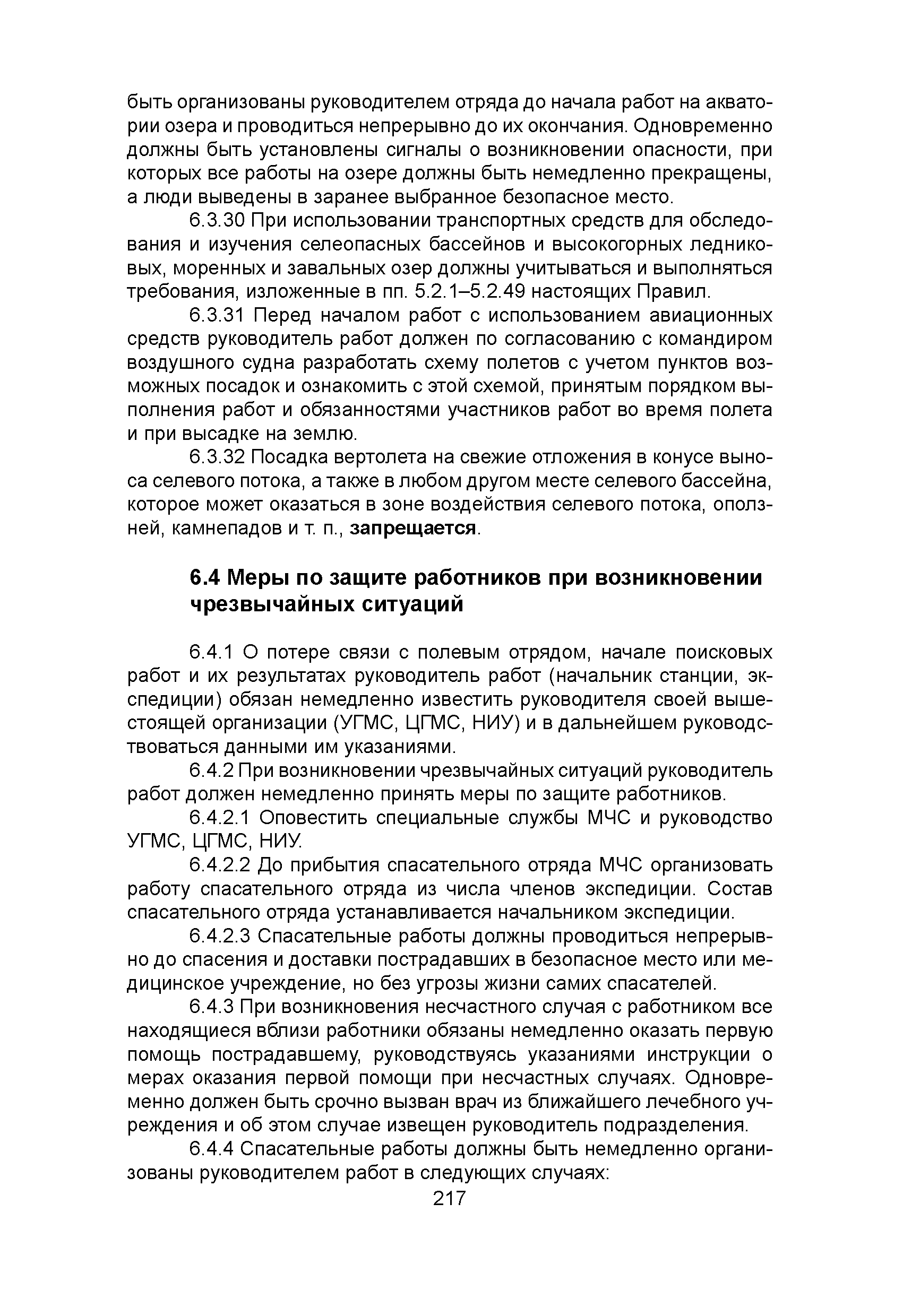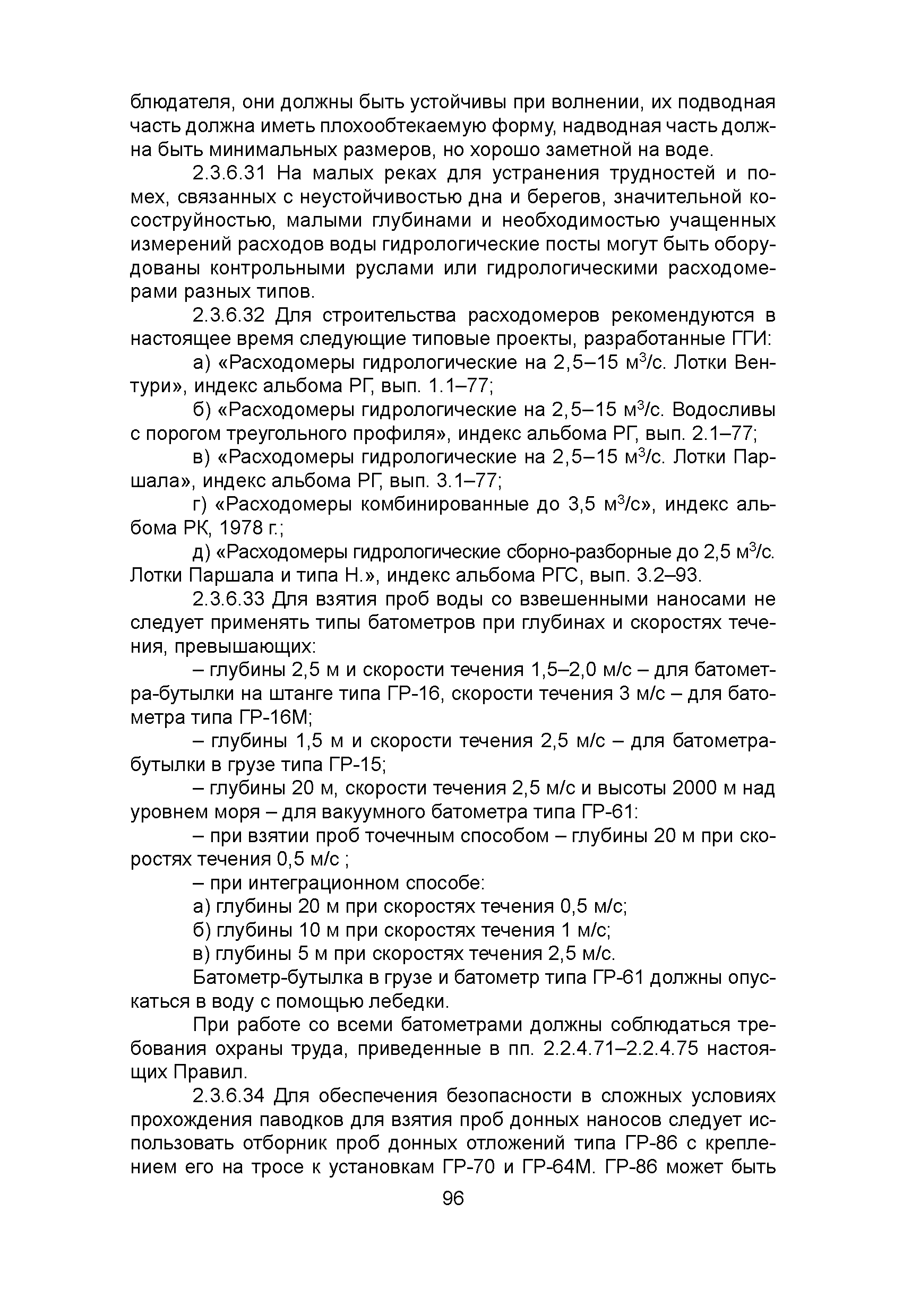 | Оглавление: | Введение 1 Общие положения 2 Гидрологические наблюдения и работы на реках и каналах 2.1 Общие требования 2.2 Требования охраны труда работников при организации и проведении гидрологических наблюдений и работ 2.2.1 Требования безопасности при проведении наблюдений за уровнем воды 2.2.2 Требования безопасности при проведении наблюдений за ледовыми явлениями и толщиной льда 2.2.3 Требования безопасности при проведении уровенных и ледовых наблюдений в случае возникновения заторов и зажоров льда 2.2.4 Требования безопасности при проведении гидрометрических работ по измерению расходов воды и наблюдений за наносами 2.2.5 Требования безопасности при проведении работ на горных и таежных реках, а также в период прохождения весеннего половодья и высоких дождевых паводков 2.2.6 Требования безопасности при организации специализированных гидрологических наблюдений и работ (болотных, воднобалансовых, на наледях) 2.2.7 Требования безопасности при проведении аэрогидрометрических наблюдений и работ 2.2.8 Средства индивидуальной защиты работников 2.2.9 Меры по защите работников при возникновении аварийных ситуаций 2.3 Требования к производственным площадкам, оборудованию, приборам и условиям их эксплуатации 2.3.1 Общие требования 2.3.2 Требования при проведении наблюдений за уровнем воды 2.3.3 Требования при проведении наблюдений за продольным уклоном водной поверхности 2.3.4 Требования при проведении наблюдений за температурой воды 2.3.5 Требования при проведении наблюдений за ледовыми явлениями, толщиной льда, снежным покровом 2.3.6 Требования при проведении измерений расходов воды и взвешенных наносов, при отборе проб донных отложений 3 Гидрометеорологические наблюдения и работы на озерах и водохранилищах 3.1 Общие требования 3.2 Требования охраны труда работников при организации и проведении гидрометеорологических наблюдений и работ 3.2.1 Общие требования 3.2.2 Требования безопасности при проведении гидрометеорологических наблюдений и работ в прибрежной зоне водоемов 3.2.3 Требования безопасности при проведении гидрометеорологических наблюдений и работ на открытой акватории водоемов 3.2.4 Требования безопасности при проведении наблюдений за ледяным покровом 3.2.5 Средства индивидуальной защиты работников 3.2.6 Защита работников при возникновении аварийных ситуаций 3.3 Требования к производственным площадкам 3.3.1 Требования к площадкам для производства гидрометеорологических наблюдений и работ в прибрежной зоне водоемов 3.3.2 Требования к площадкам для гидрометеорологических наблюдений и работ на открытой акватории водоемов 3.3.3 Требования к площадкам для наблюдений за ледяным покровом 3.4 Требования к приборам, оборудованию и условиям их эксплуатации 4 Гидрографические обследования 4.1 Общие требования 4.2 Требования охраны труда работников при организации и проведении гидрографических обследований 4.2.1 Требования безопасности при движении по маршрутам 4.2.2 Требования безопасности при переправах через реки, озера, другие водные преграды и лавины 4.2.3 Требования безопасности при проведении маршрутных снегомерных съемок на равнинной территории 4.2.4 Требования безопасности при применении авиационного транспорта 4.2.5 Средства индивидуальной защиты работников 4.2.6 Защита работников при возникновении аварийных ситуаций 4.3 Требования к пло