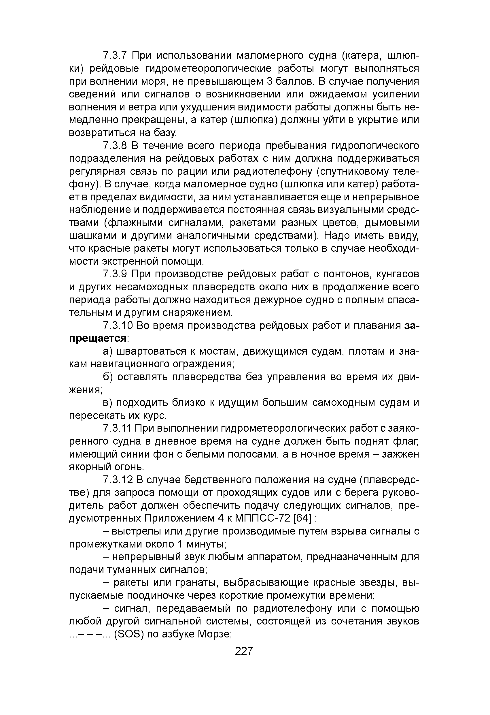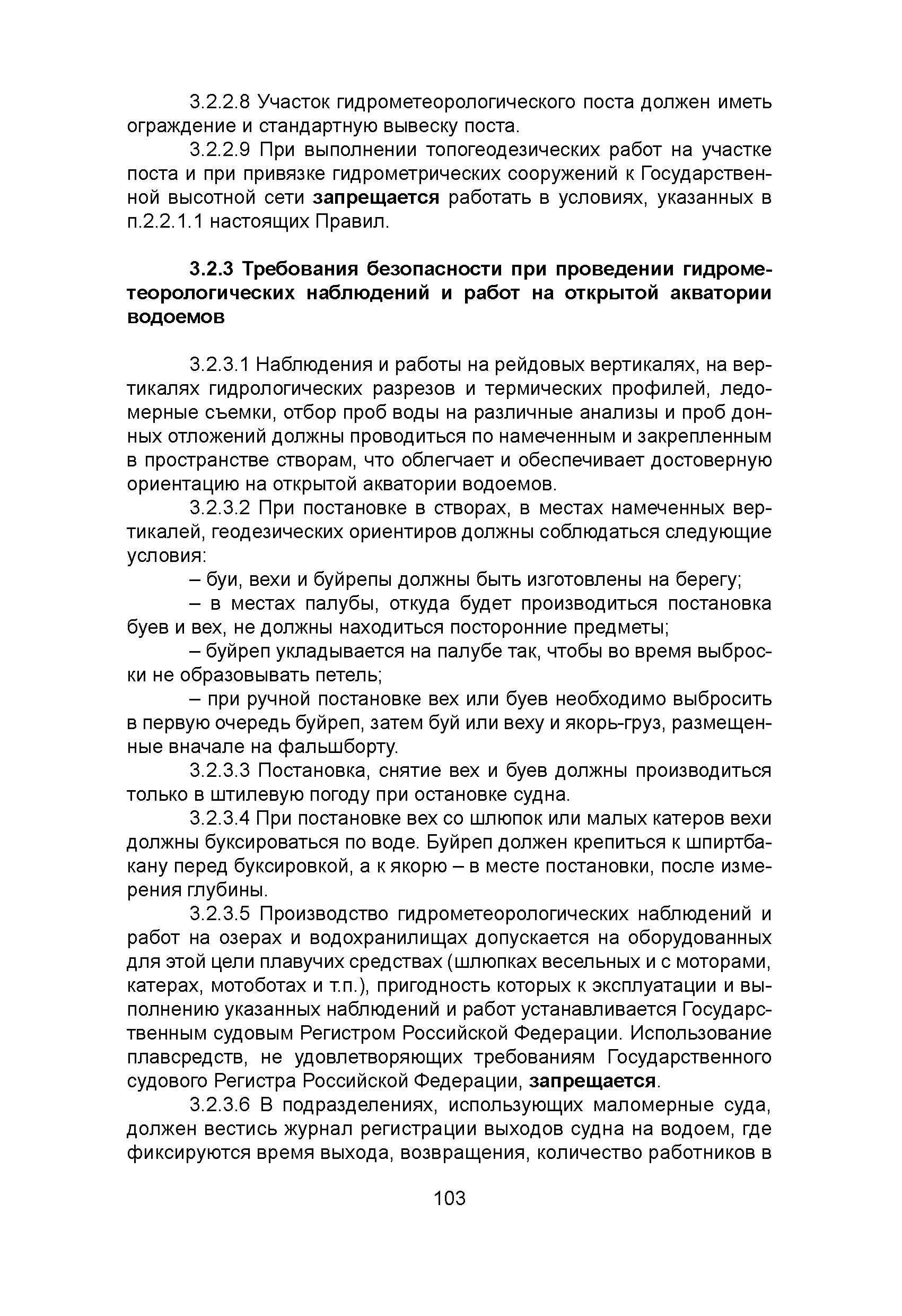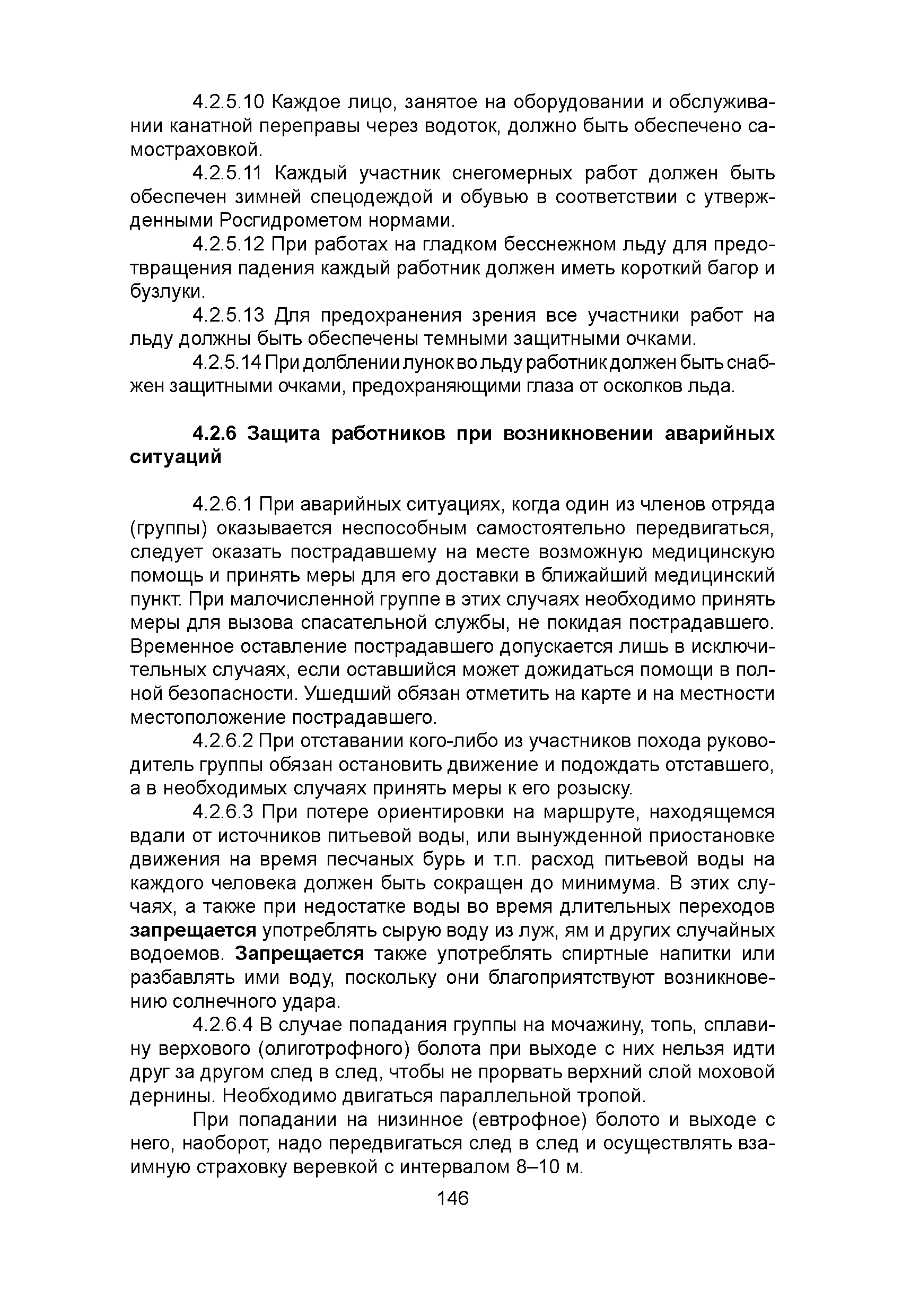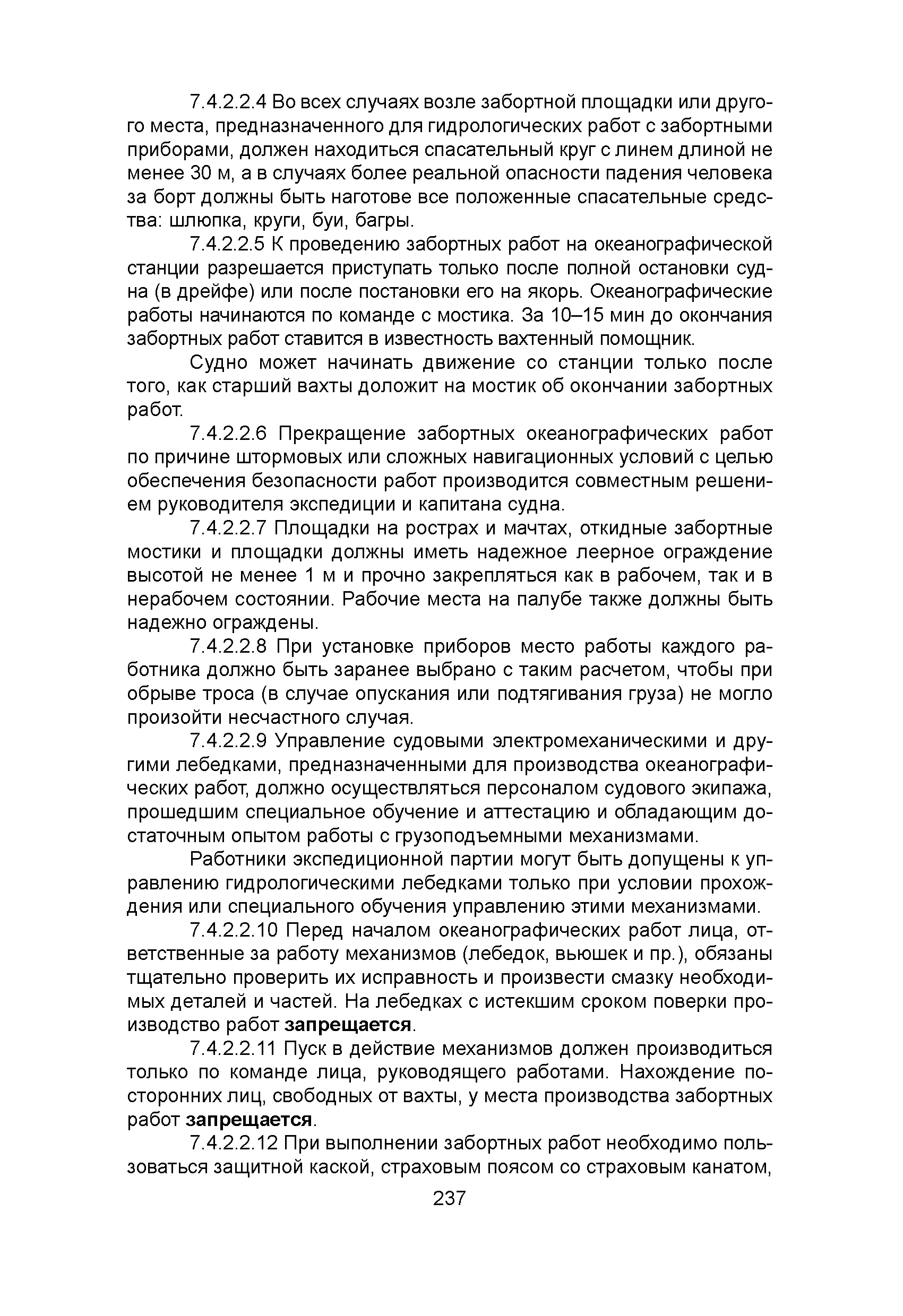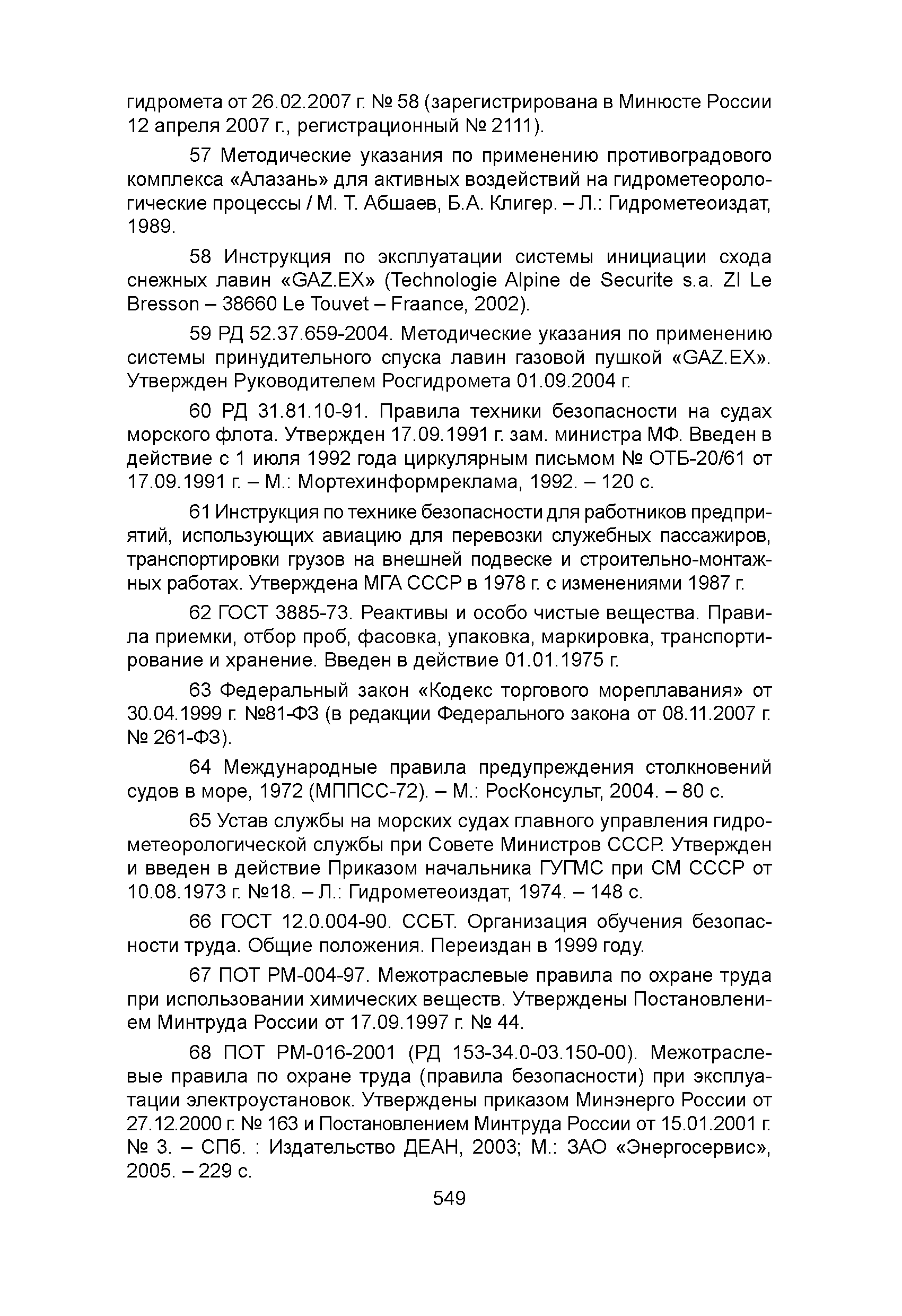 | Оглавление: | Введение 1 Общие положения 2 Гидрологические наблюдения и работы на реках и каналах 2.1 Общие требования 2.2 Требования охраны труда работников при организации и проведении гидрологических наблюдений и работ 2.2.1 Требования безопасности при проведении наблюдений за уровнем воды 2.2.2 Требования безопасности при проведении наблюдений за ледовыми явлениями и толщиной льда 2.2.3 Требования безопасности при проведении уровенных и ледовых наблюдений в случае возникновения заторов и зажоров льда 2.2.4 Требования безопасности при проведении гидрометрических работ по измерению расходов воды и наблюдений за наносами 2.2.5 Требования безопасности при проведении работ на горных и таежных реках, а также в период прохождения весеннего половодья и высоких дождевых паводков 2.2.6 Требования безопасности при организации специализированных гидрологических наблюдений и работ (болотных, воднобалансовых, на наледях) 2.2.7 Требования безопасности при проведении аэрогидрометрических наблюдений и работ 2.2.8 Средства индивидуальной защиты работников 2.2.9 Меры по защите работников при возникновении аварийных ситуаций 2.3 Требования к производственным площадкам, оборудованию, приборам и условиям их эксплуатации 2.3.1 Общие требования 2.3.2 Требования при проведении наблюдений за уровнем воды 2.3.3 Требования при проведении наблюдений за продольным уклоном водной поверхности 2.3.4 Требования при проведении наблюдений за температурой воды 2.3.5 Требования при проведении наблюдений за ледовыми явлениями, толщиной льда, снежным покровом 2.3.6 Требования при проведении измерений расходов воды и взвешенных наносов, при отборе проб донных отложений 3 Гидрометеорологические наблюдения и работы на озерах и водохранилищах 3.1 Общие требования 3.2 Требования охраны труда работников при организации и проведении гидрометеорологических наблюдений и работ 3.2.1 Общие требования 3.2.2 Требования безопасности при проведении гидрометеорологических наблюдений и работ в прибрежной зоне водоемов 3.2.3 Требования безопасности при проведении гидрометеорологических наблюдений и работ на открытой акватории водоемов 3.2.4 Требования безопасности при проведении наблюдений за ледяным покровом 3.2.5 Средства индивидуальной защиты работников 3.2.6 Защита работников при возникновении аварийных ситуаций 3.3 Требования к производственным площадкам 3.3.1 Требования к площадкам для производства гидрометеорологических наблюдений и работ в прибрежной зоне водоемов 3.3.2 Требования к площадкам для гидрометеорологических наблюдений и работ на открытой акватории водоемов 3.3.3 Требования к площадкам для наблюдений за ледяным покровом 3.4 Требования к приборам, оборудованию и условиям их эксплуатации 4 Гидрографические обследования 4.1 Общие требования 4.2 Требования охраны труда работников при организации и проведении гидрографических обследований 4.2.1 Требования безопасности при движении по маршрутам 4.2.2 Требования безопасности при переправах через реки, озера, другие водные преграды и лавины 4.2.3 Требования безопасности при проведении маршрутных снегомерных съемок на равнинной территории 4.2.4 Требования безопасности при применении авиационного транспорта 4.2.5 Средства индивидуальной защиты работников 4.2.6 Защита работников при возникновении аварийных ситуаций 4.3 Требования к пло