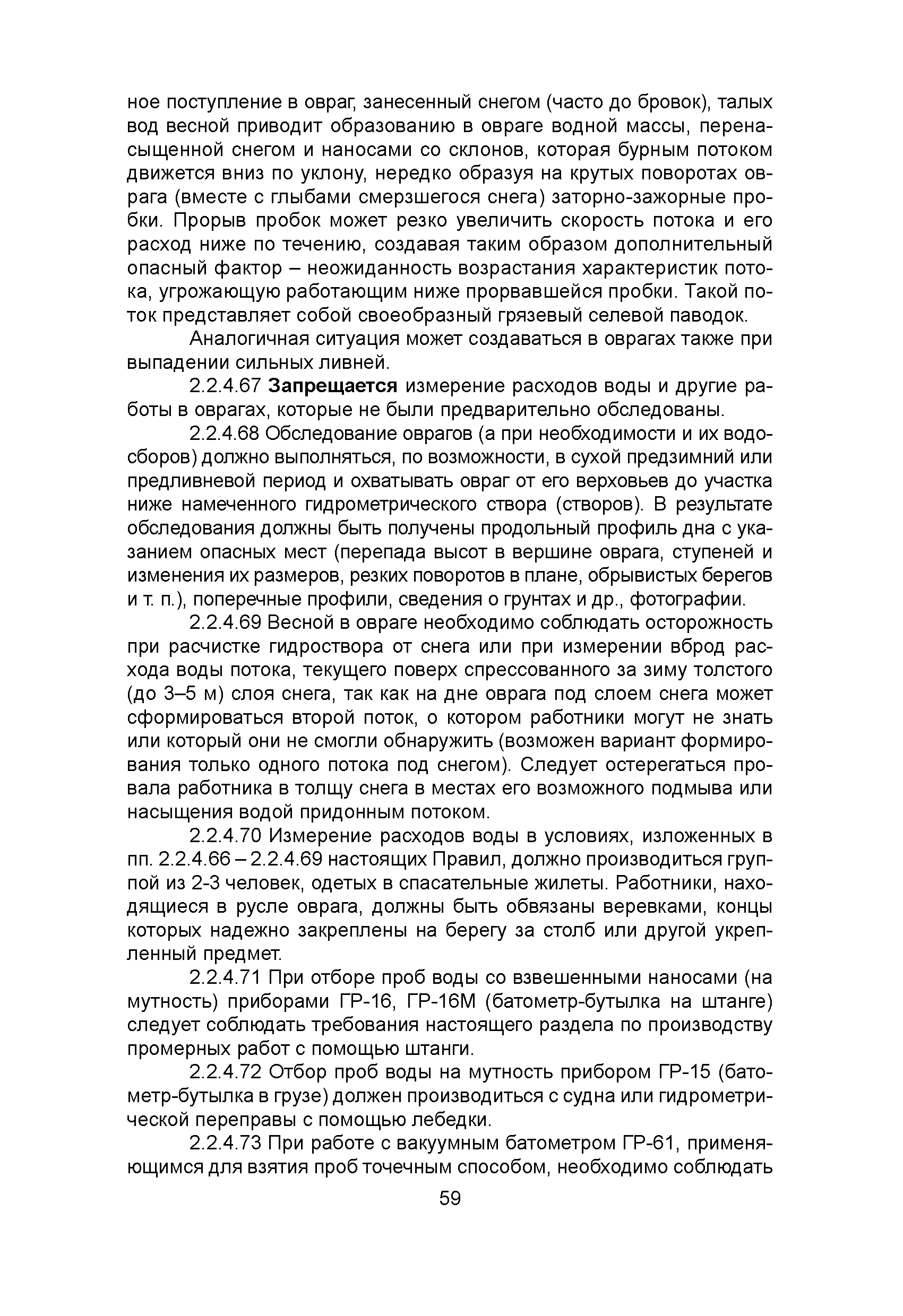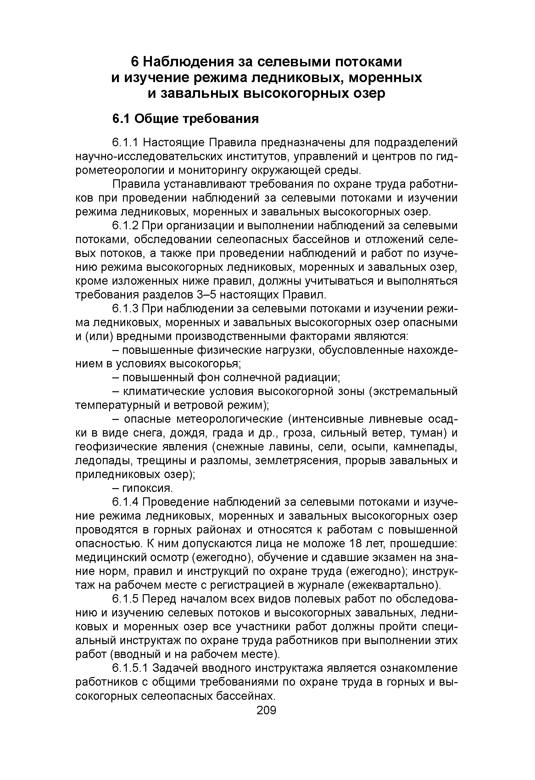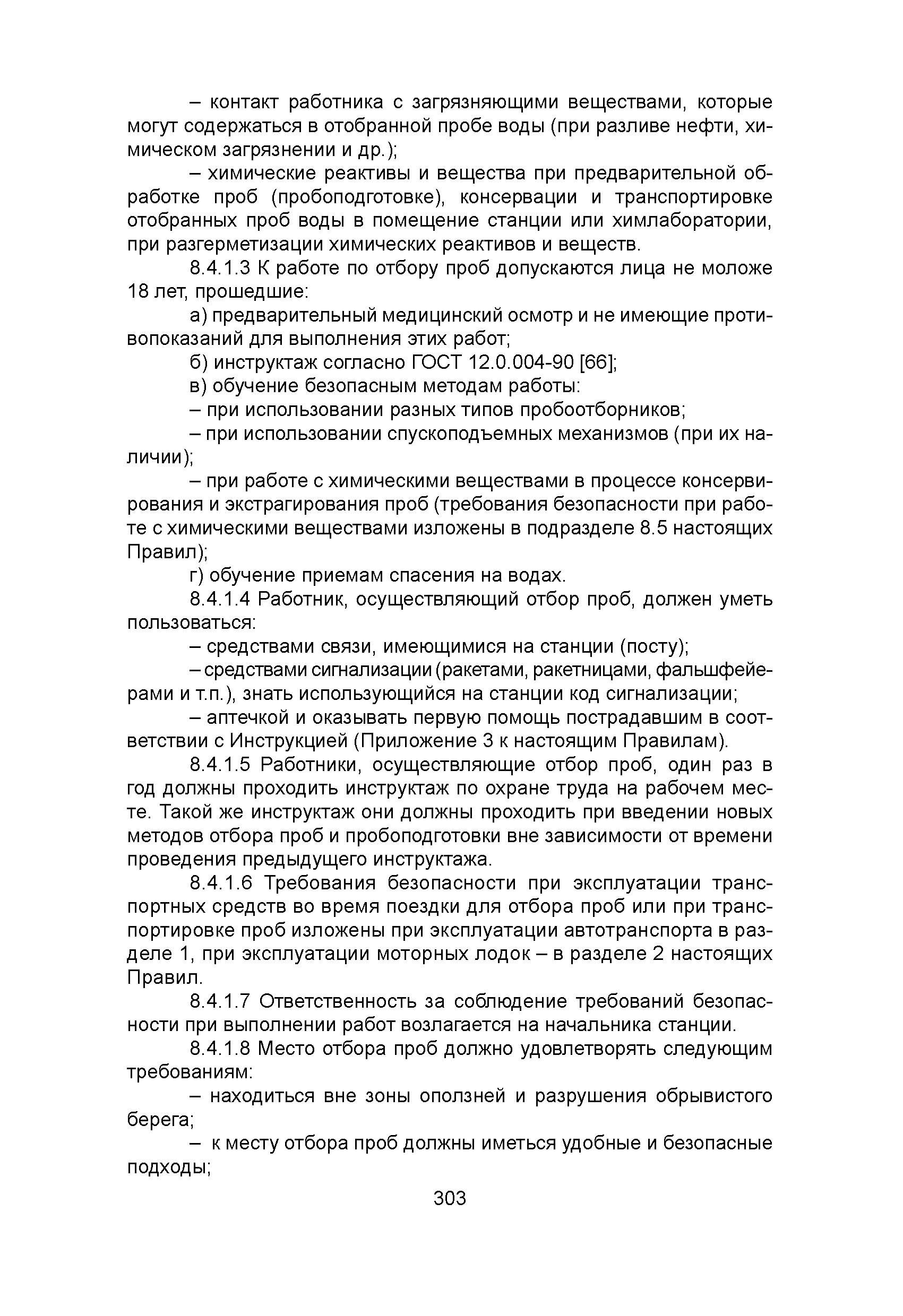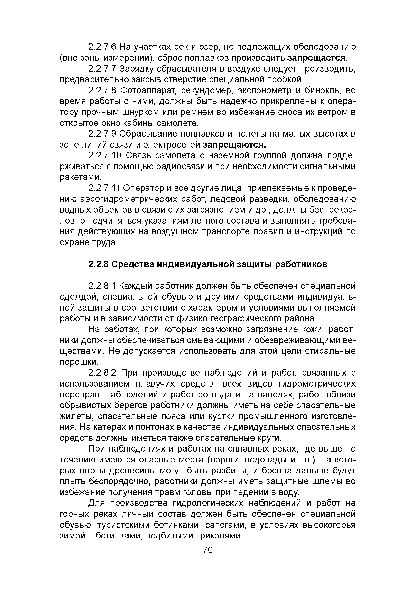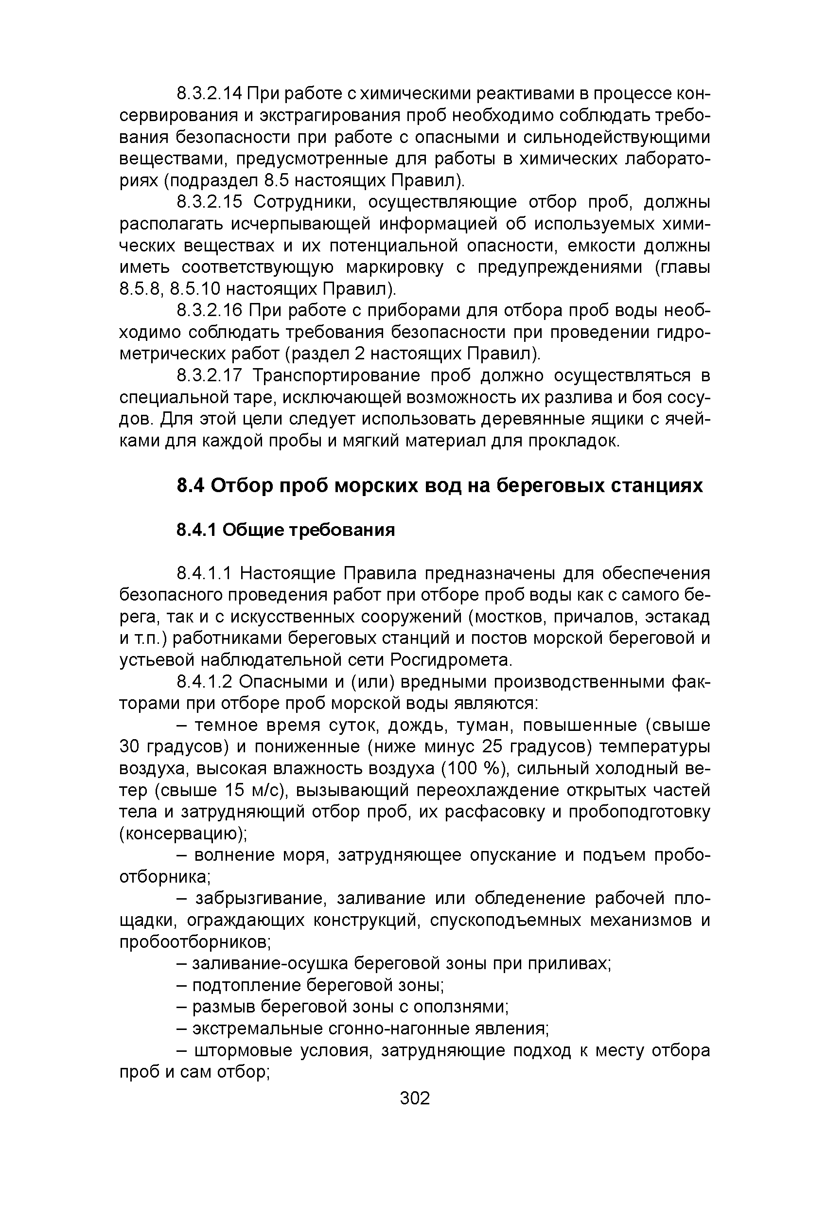 | Оглавление: | Введение 1 Общие положения 2 Гидрологические наблюдения и работы на реках и каналах 2.1 Общие требования 2.2 Требования охраны труда работников при организации и проведении гидрологических наблюдений и работ 2.2.1 Требования безопасности при проведении наблюдений за уровнем воды 2.2.2 Требования безопасности при проведении наблюдений за ледовыми явлениями и толщиной льда 2.2.3 Требования безопасности при проведении уровенных и ледовых наблюдений в случае возникновения заторов и зажоров льда 2.2.4 Требования безопасности при проведении гидрометрических работ по измерению расходов воды и наблюдений за наносами 2.2.5 Требования безопасности при проведении работ на горных и таежных реках, а также в период прохождения весеннего половодья и высоких дождевых паводков 2.2.6 Требования безопасности при организации специализированных гидрологических наблюдений и работ (болотных, воднобалансовых, на наледях) 2.2.7 Требования безопасности при проведении аэрогидрометрических наблюдений и работ 2.2.8 Средства индивидуальной защиты работников 2.2.9 Меры по защите работников при возникновении аварийных ситуаций 2.3 Требования к производственным площадкам, оборудованию, приборам и условиям их эксплуатации 2.3.1 Общие требования 2.3.2 Требования при проведении наблюдений за уровнем воды 2.3.3 Требования при проведении наблюдений за продольным уклоном водной поверхности 2.3.4 Требования при проведении наблюдений за температурой воды 2.3.5 Требования при проведении наблюдений за ледовыми явлениями, толщиной льда, снежным покровом 2.3.6 Требования при проведении измерений расходов воды и взвешенных наносов, при отборе проб донных отложений 3 Гидрометеорологические наблюдения и работы на озерах и водохранилищах 3.1 Общие требования 3.2 Требования охраны труда работников при организации и проведении гидрометеорологических наблюдений и работ 3.2.1 Общие требования 3.2.2 Требования безопасности при проведении гидрометеорологических наблюдений и работ в прибрежной зоне водоемов 3.2.3 Требования безопасности при проведении гидрометеорологических наблюдений и работ на открытой акватории водоемов 3.2.4 Требования безопасности при проведении наблюдений за ледяным покровом 3.2.5 Средства индивидуальной защиты работников 3.2.6 Защита работников при возникновении аварийных ситуаций 3.3 Требования к производственным площадкам 3.3.1 Требования к площадкам для производства гидрометеорологических наблюдений и работ в прибрежной зоне водоемов 3.3.2 Требования к площадкам для гидрометеорологических наблюдений и работ на открытой акватории водоемов 3.3.3 Требования к площадкам для наблюдений за ледяным покровом 3.4 Требования к приборам, оборудованию и условиям их эксплуатации 4 Гидрографические обследования 4.1 Общие требования 4.2 Требования охраны труда работников при организации и проведении гидрографических обследований 4.2.1 Требования безопасности при движении по маршрутам 4.2.2 Требования безопасности при переправах через реки, озера, другие водные преграды и лавины 4.2.3 Требования безопасности при проведении маршрутных снегомерных съемок на равнинной территории 4.2.4 Требования безопасности при применении авиационного транспорта 4.2.5 Средства индивидуальной защиты работников 4.2.6 Защита работников при возникновении аварийных ситуаций 4.3 Требования к пло