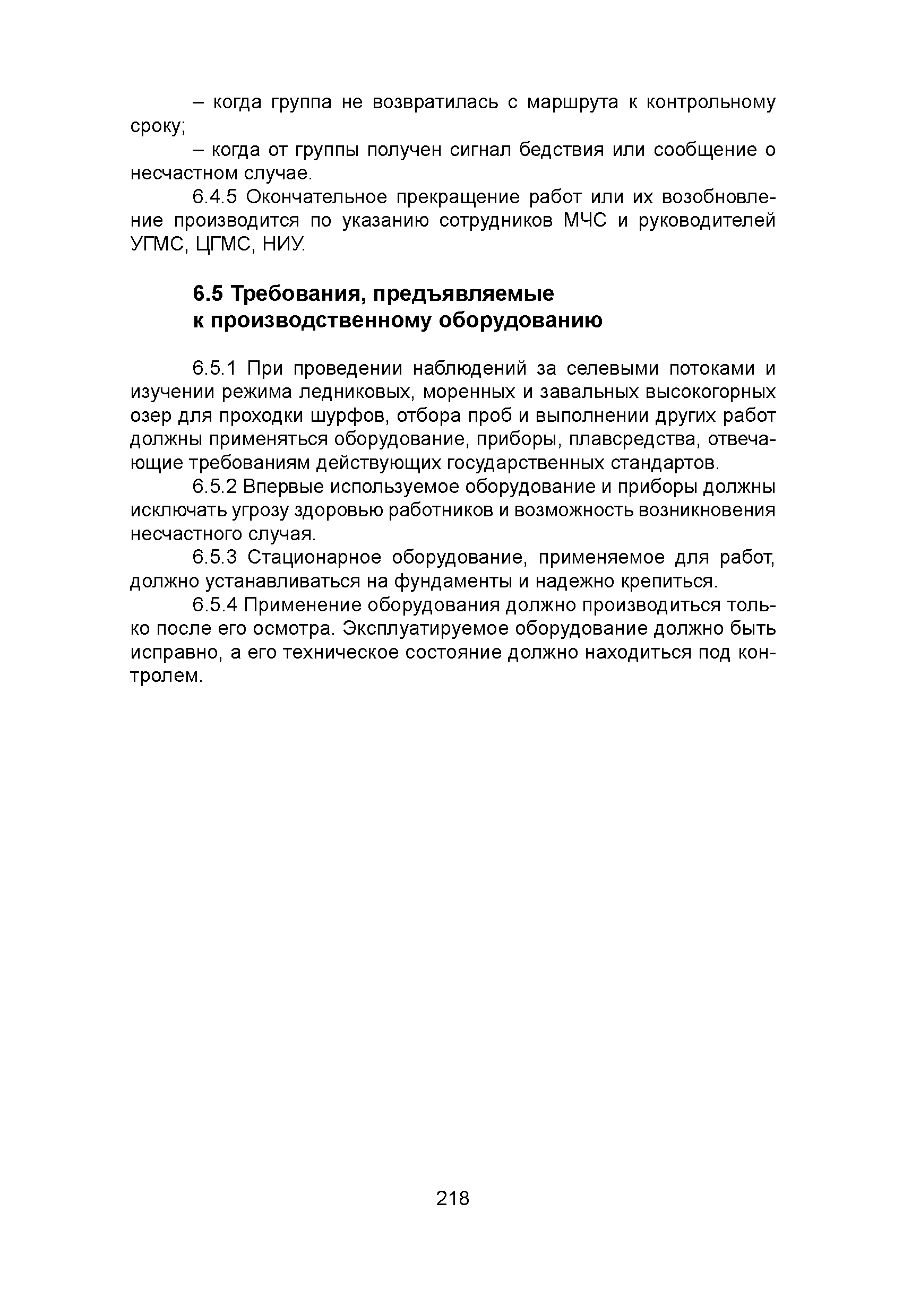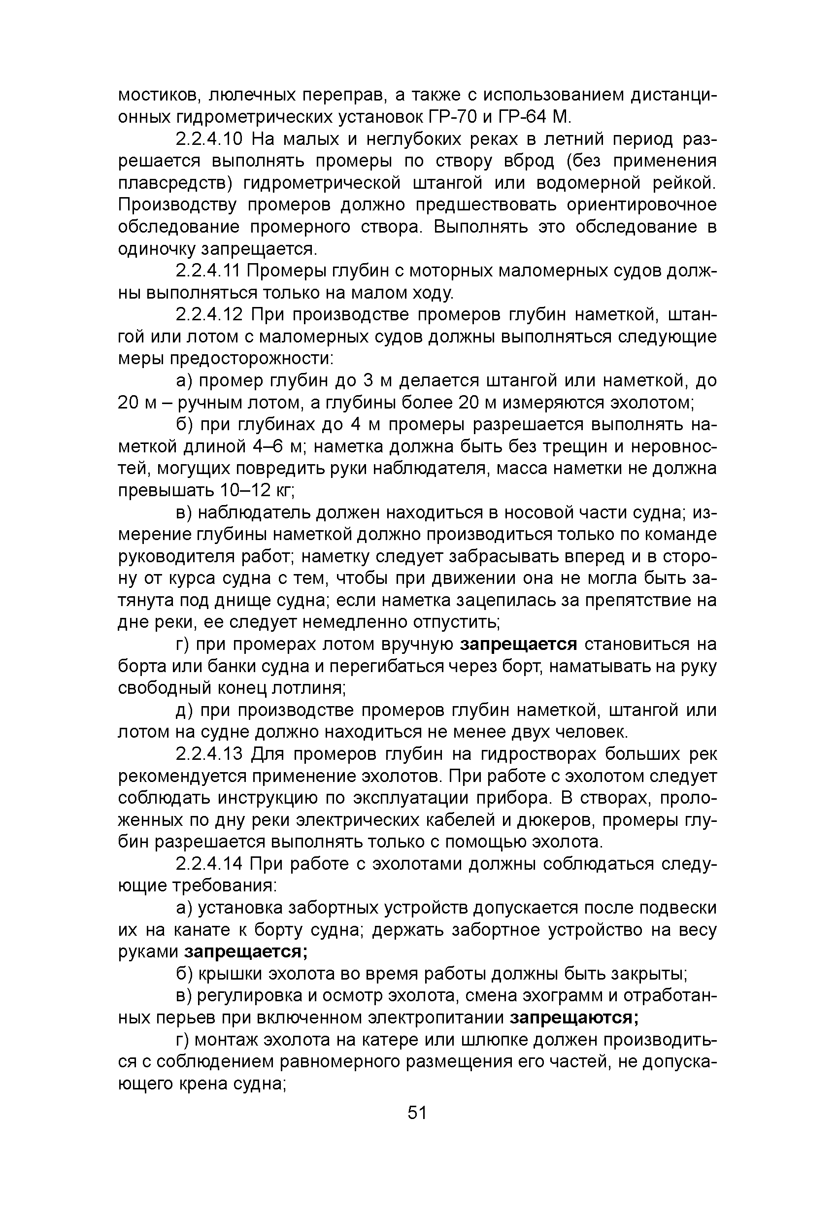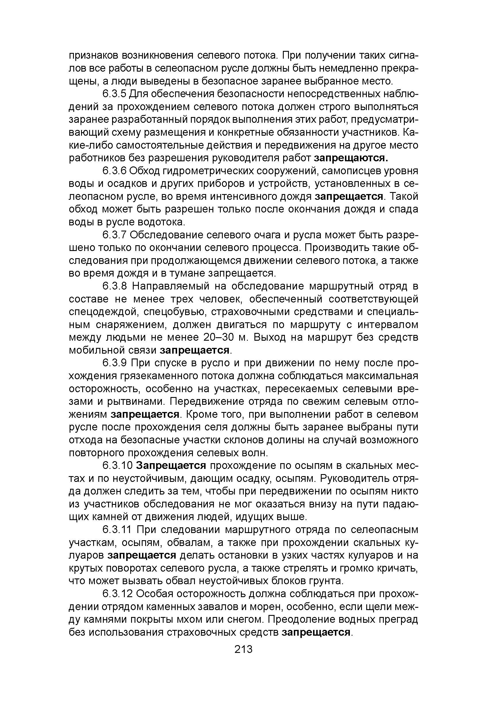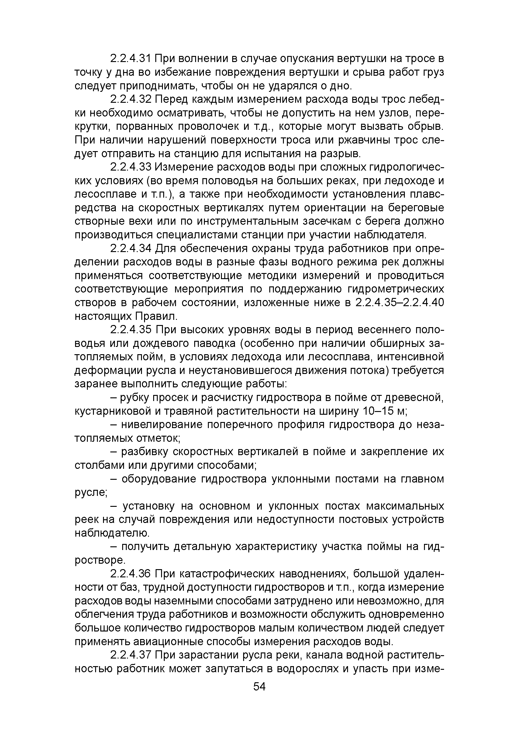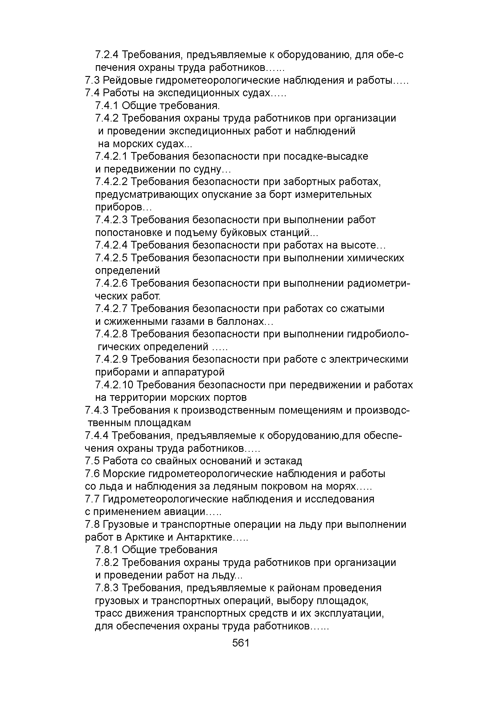 | Оглавление: | Введение 1 Общие положения 2 Гидрологические наблюдения и работы на реках и каналах 2.1 Общие требования 2.2 Требования охраны труда работников при организации и проведении гидрологических наблюдений и работ 2.2.1 Требования безопасности при проведении наблюдений за уровнем воды 2.2.2 Требования безопасности при проведении наблюдений за ледовыми явлениями и толщиной льда 2.2.3 Требования безопасности при проведении уровенных и ледовых наблюдений в случае возникновения заторов и зажоров льда 2.2.4 Требования безопасности при проведении гидрометрических работ по измерению расходов воды и наблюдений за наносами 2.2.5 Требования безопасности при проведении работ на горных и таежных реках, а также в период прохождения весеннего половодья и высоких дождевых паводков 2.2.6 Требования безопасности при организации специализированных гидрологических наблюдений и работ (болотных, воднобалансовых, на наледях) 2.2.7 Требования безопасности при проведении аэрогидрометрических наблюдений и работ 2.2.8 Средства индивидуальной защиты работников 2.2.9 Меры по защите работников при возникновении аварийных ситуаций 2.3 Требования к производственным площадкам, оборудованию, приборам и условиям их эксплуатации 2.3.1 Общие требования 2.3.2 Требования при проведении наблюдений за уровнем воды 2.3.3 Требования при проведении наблюдений за продольным уклоном водной поверхности 2.3.4 Требования при проведении наблюдений за температурой воды 2.3.5 Требования при проведении наблюдений за ледовыми явлениями, толщиной льда, снежным покровом 2.3.6 Требования при проведении измерений расходов воды и взвешенных наносов, при отборе проб донных отложений 3 Гидрометеорологические наблюдения и работы на озерах и водохранилищах 3.1 Общие требования 3.2 Требования охраны труда работников при организации и проведении гидрометеорологических наблюдений и работ 3.2.1 Общие требования 3.2.2 Требования безопасности при проведении гидрометеорологических наблюдений и работ в прибрежной зоне водоемов 3.2.3 Требования безопасности при проведении гидрометеорологических наблюдений и работ на открытой акватории водоемов 3.2.4 Требования безопасности при проведении наблюдений за ледяным покровом 3.2.5 Средства индивидуальной защиты работников 3.2.6 Защита работников при возникновении аварийных ситуаций 3.3 Требования к производственным площадкам 3.3.1 Требования к площадкам для производства гидрометеорологических наблюдений и работ в прибрежной зоне водоемов 3.3.2 Требования к площадкам для гидрометеорологических наблюдений и работ на открытой акватории водоемов 3.3.3 Требования к площадкам для наблюдений за ледяным покровом 3.4 Требования к приборам, оборудованию и условиям их эксплуатации 4 Гидрографические обследования 4.1 Общие требования 4.2 Требования охраны труда работников при организации и проведении гидрографических обследований 4.2.1 Требования безопасности при движении по маршрутам 4.2.2 Требования безопасности при переправах через реки, озера, другие водные преграды и лавины 4.2.3 Требования безопасности при проведении маршрутных снегомерных съемок на равнинной территории 4.2.4 Требования безопасности при применении авиационного транспорта 4.2.5 Средства индивидуальной защиты работников 4.2.6 Защита работников при возникновении аварийных ситуаций 4.3 Требования к пло