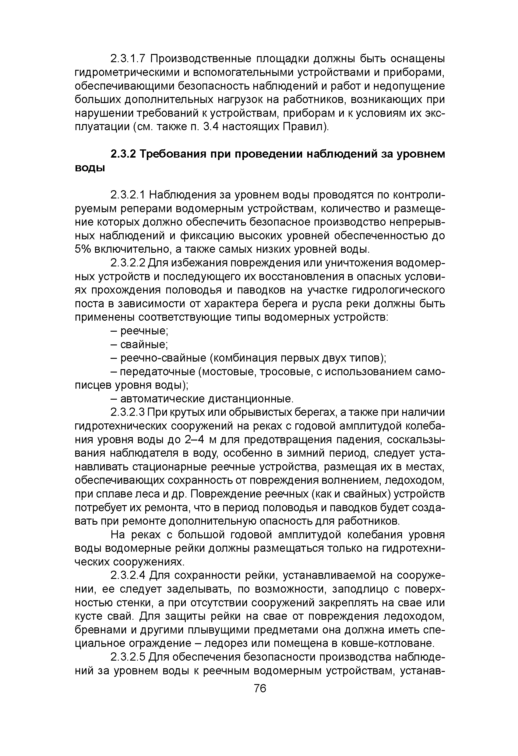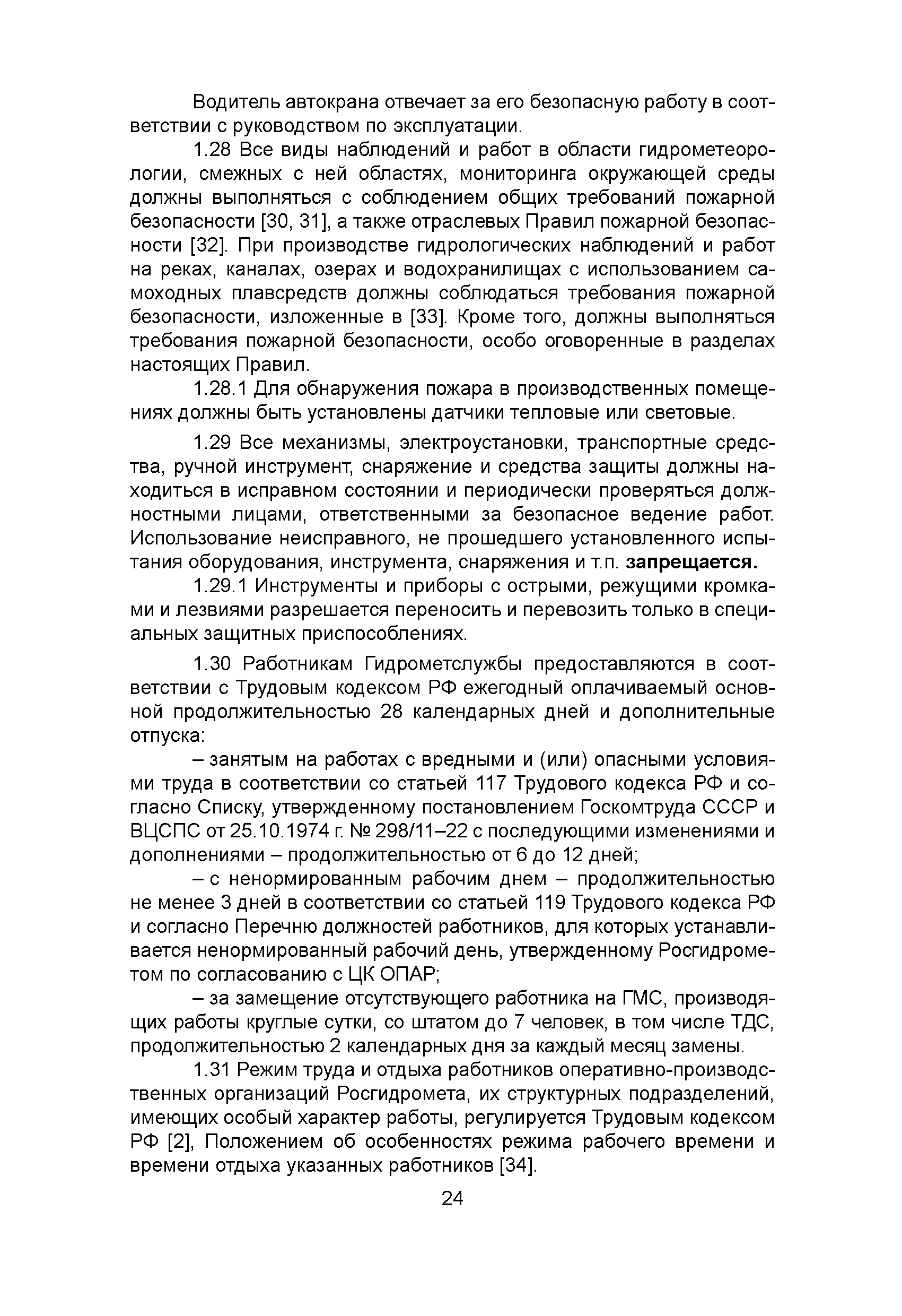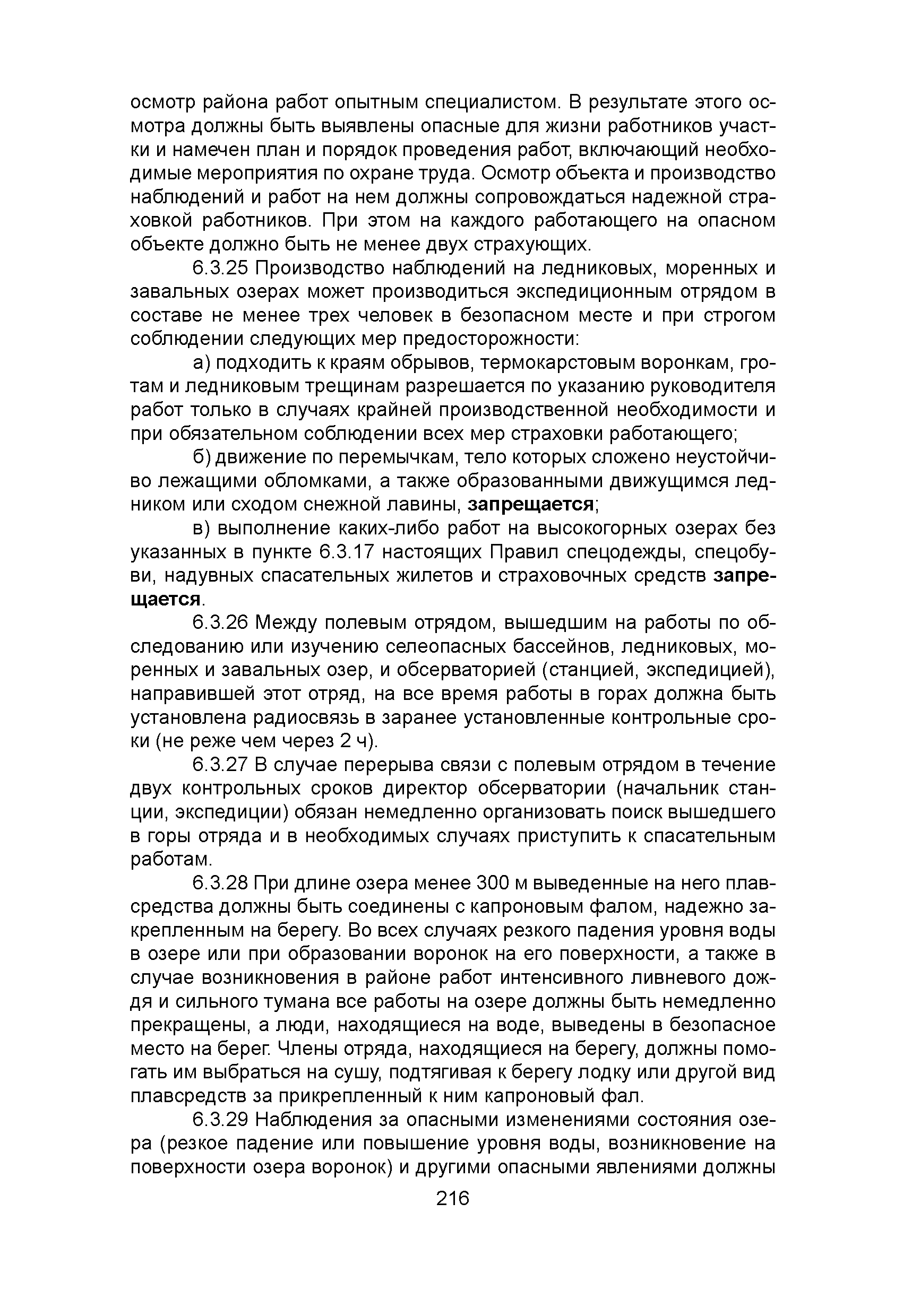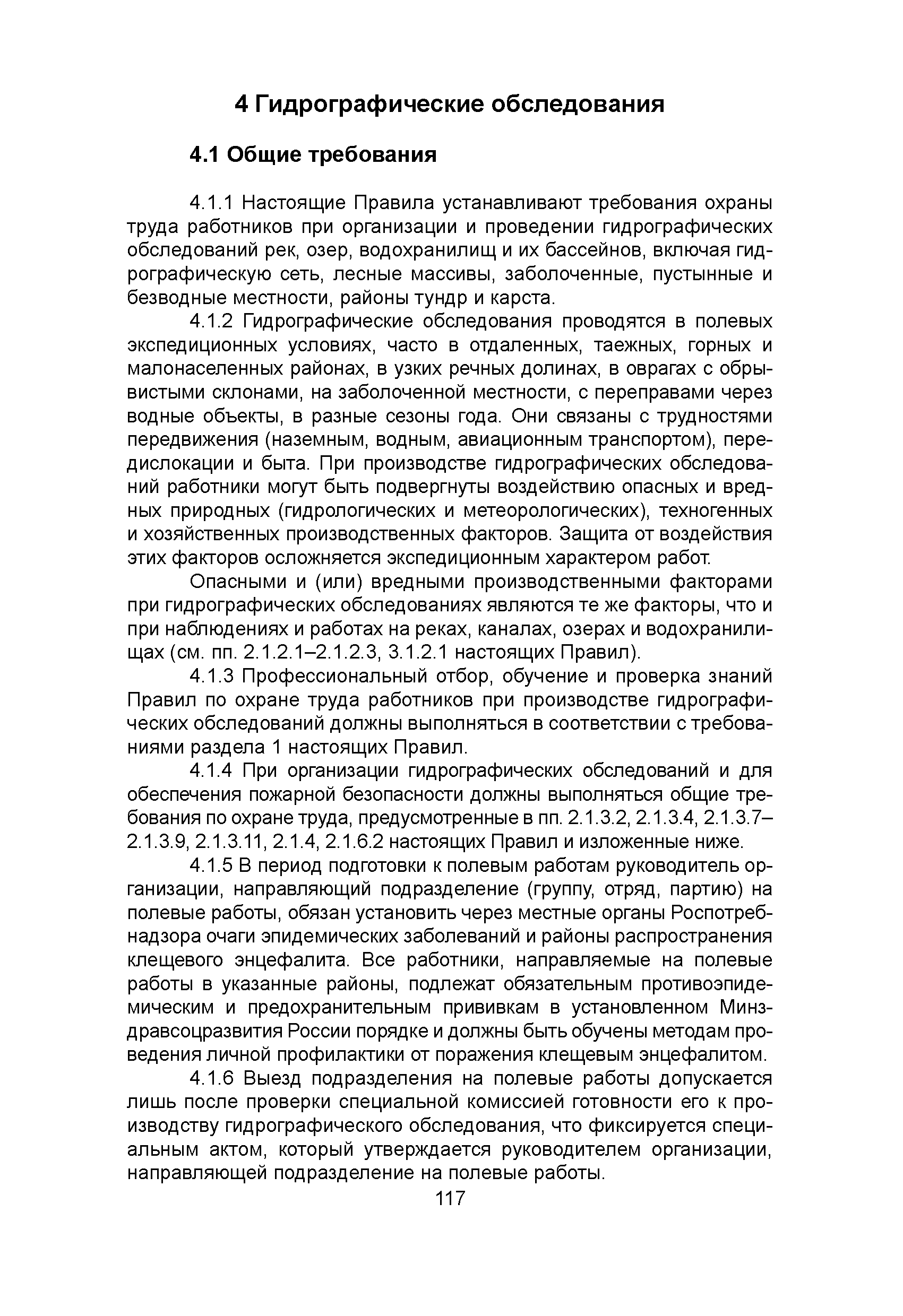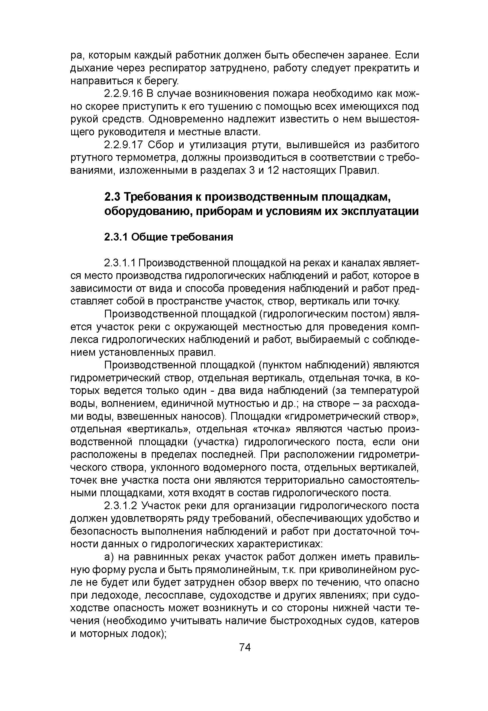 | Оглавление: | Введение 1 Общие положения 2 Гидрологические наблюдения и работы на реках и каналах 2.1 Общие требования 2.2 Требования охраны труда работников при организации и проведении гидрологических наблюдений и работ 2.2.1 Требования безопасности при проведении наблюдений за уровнем воды 2.2.2 Требования безопасности при проведении наблюдений за ледовыми явлениями и толщиной льда 2.2.3 Требования безопасности при проведении уровенных и ледовых наблюдений в случае возникновения заторов и зажоров льда 2.2.4 Требования безопасности при проведении гидрометрических работ по измерению расходов воды и наблюдений за наносами 2.2.5 Требования безопасности при проведении работ на горных и таежных реках, а также в период прохождения весеннего половодья и высоких дождевых паводков 2.2.6 Требования безопасности при организации специализированных гидрологических наблюдений и работ (болотных, воднобалансовых, на наледях) 2.2.7 Требования безопасности при проведении аэрогидрометрических наблюдений и работ 2.2.8 Средства индивидуальной защиты работников 2.2.9 Меры по защите работников при возникновении аварийных ситуаций 2.3 Требования к производственным площадкам, оборудованию, приборам и условиям их эксплуатации 2.3.1 Общие требования 2.3.2 Требования при проведении наблюдений за уровнем воды 2.3.3 Требования при проведении наблюдений за продольным уклоном водной поверхности 2.3.4 Требования при проведении наблюдений за температурой воды 2.3.5 Требования при проведении наблюдений за ледовыми явлениями, толщиной льда, снежным покровом 2.3.6 Требования при проведении измерений расходов воды и взвешенных наносов, при отборе проб донных отложений 3 Гидрометеорологические наблюдения и работы на озерах и водохранилищах 3.1 Общие требования 3.2 Требования охраны труда работников при организации и проведении гидрометеорологических наблюдений и работ 3.2.1 Общие требования 3.2.2 Требования безопасности при проведении гидрометеорологических наблюдений и работ в прибрежной зоне водоемов 3.2.3 Требования безопасности при проведении гидрометеорологических наблюдений и работ на открытой акватории водоемов 3.2.4 Требования безопасности при проведении наблюдений за ледяным покровом 3.2.5 Средства индивидуальной защиты работников 3.2.6 Защита работников при возникновении аварийных ситуаций 3.3 Требования к производственным площадкам 3.3.1 Требования к площадкам для производства гидрометеорологических наблюдений и работ в прибрежной зоне водоемов 3.3.2 Требования к площадкам для гидрометеорологических наблюдений и работ на открытой акватории водоемов 3.3.3 Требования к площадкам для наблюдений за ледяным покровом 3.4 Требования к приборам, оборудованию и условиям их эксплуатации 4 Гидрографические обследования 4.1 Общие требования 4.2 Требования охраны труда работников при организации и проведении гидрографических обследований 4.2.1 Требования безопасности при движении по маршрутам 4.2.2 Требования безопасности при переправах через реки, озера, другие водные преграды и лавины 4.2.3 Требования безопасности при проведении маршрутных снегомерных съемок на равнинной территории 4.2.4 Требования безопасности при применении авиационного транспорта 4.2.5 Средства индивидуальной защиты работников 4.2.6 Защита работников при возникновении аварийных ситуаций 4.3 Требования к пло